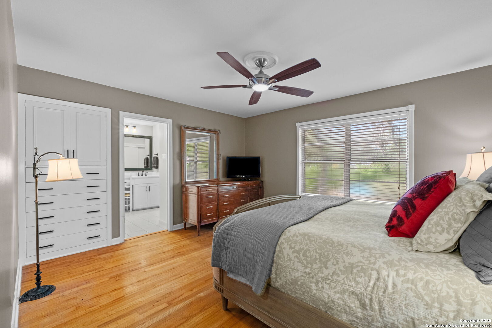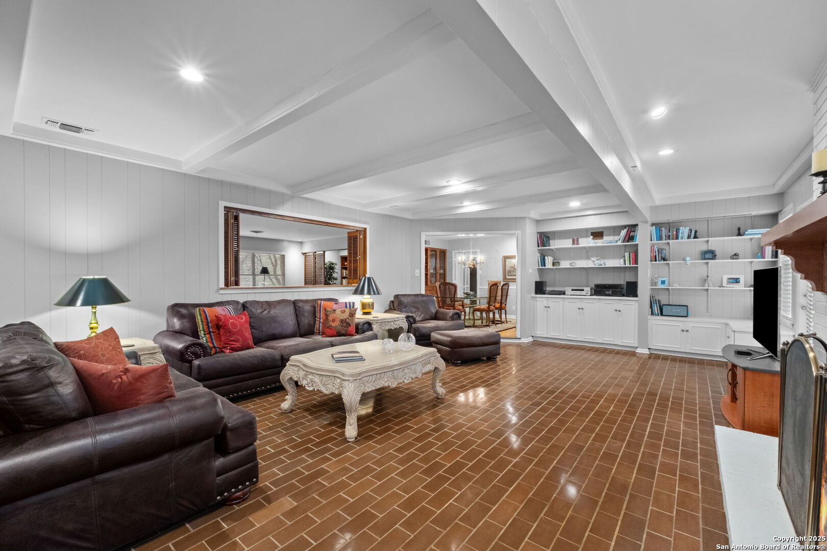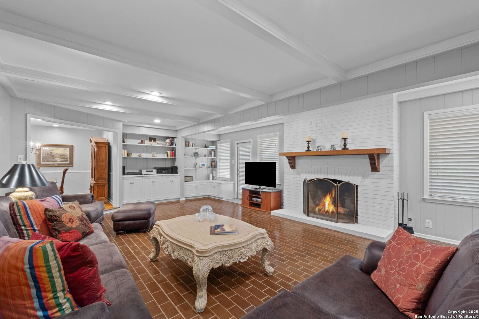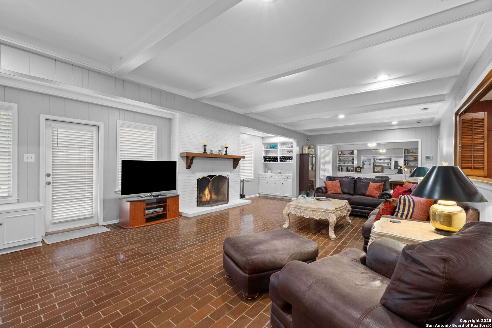 Discover this Mid-Century Modern gem nestled on more than an acre in the serene, secluded enclave of Forest Oaks Estates. This thoughtfully updated single-story home offers 3 bedrooms, 2.5 baths, a generous study, and expansive living and dining areas designed with both comfort and entertaining in mind. The study offers access to the half bath and could become a 4th bedroom. The heart of the home is a chef's kitchen outfitted for culinary enthusiasts, while the open-concept living spaces impress with beamed ceilings, two fireplaces, custom built-in cabinetry, and a stylish serving bar-ideal for gatherings large or small. Walls of windows invite in natural light and offer beautiful views of the lush, oak-studded grounds. Unwind in the tranquil primary suite featuring an updated bath and generous walk-in closets. Step outside to enjoy a spectacular backyard with a sparkling pool, sprawling flagstone patio, and the shade of 100+ majestic oak trees-creating a private, resort-like setting. Located just minutes from Loop 410, Hwy 281, The Pearl, and San Antonio International Airport, with convenient access to Salado Creek Greenway and St. Mary's Hall. Nearby Alamo Heights ISD offers limited tuition opportunities, subject to availability. Opportunities to own in this beautiful neighborhood are few and far between-don't miss your chance to make this peaceful retreat your forever home.