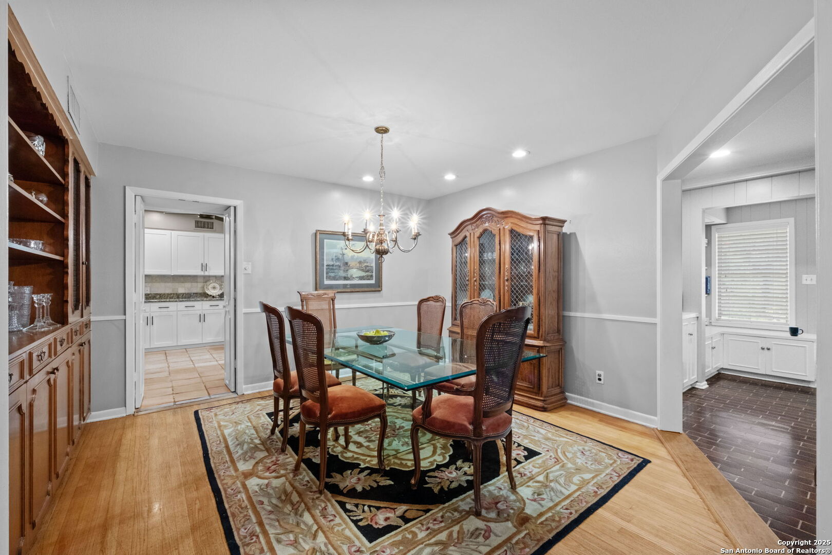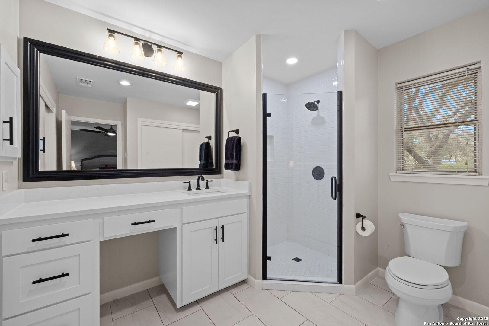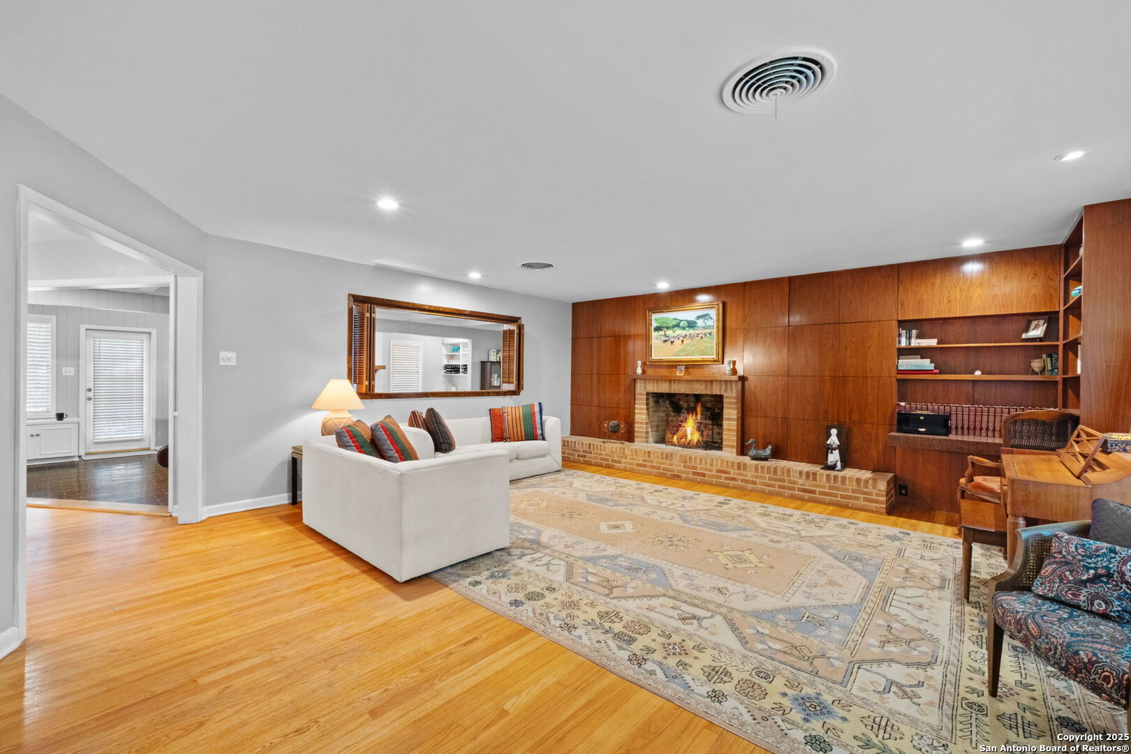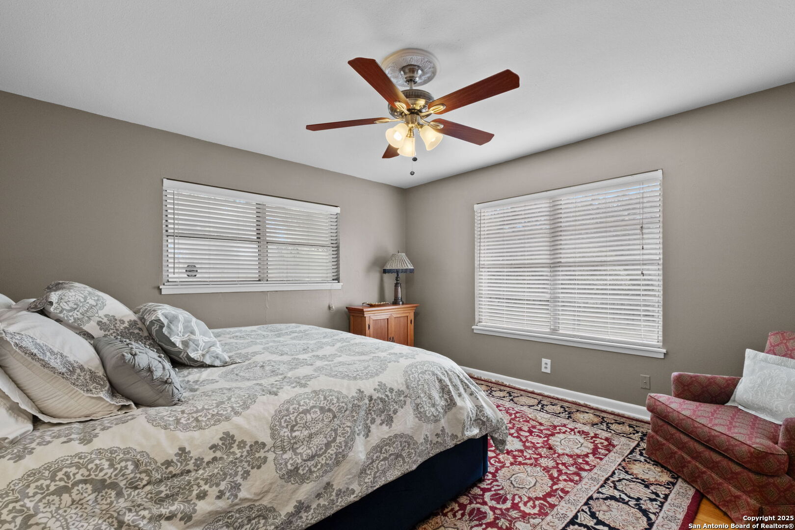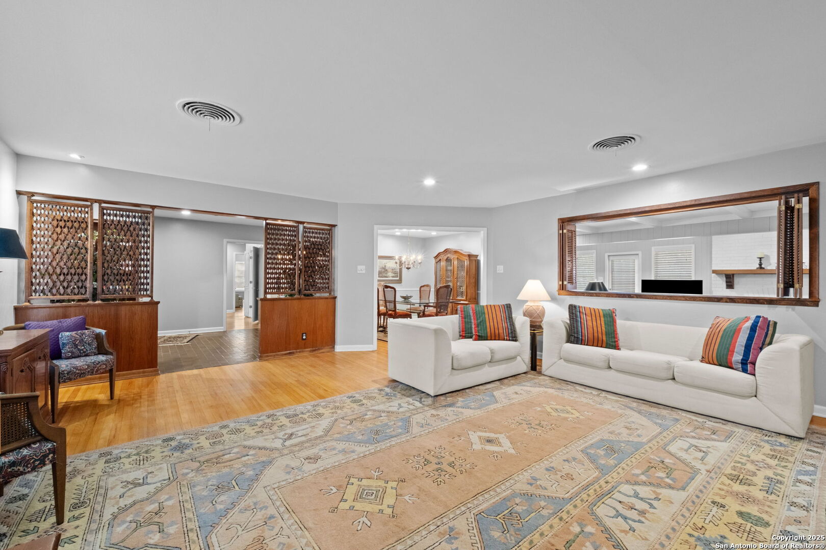 Discover this Mid-Century Modern gem nestled on more than an acre in the serene, secluded enclave of Forest Oaks Estates. This thoughtfully updated single-story home offers 3 bedrooms, 2.5 baths, a generous study, and expansive living and dining areas designed with both comfort and entertaining in mind. The study offers access to the half bath and could become a 4th bedroom. The heart of the home is a chef's kitchen outfitted for culinary enthusiasts, while the open-concept living spaces impress with beamed ceilings, two fireplaces, custom built-in cabinetry, and a stylish serving bar-ideal for gatherings large or small. Walls of windows invite in natural light and offer beautiful views of the lush, oak-studded grounds. Unwind in the tranquil primary suite featuring an updated bath and generous walk-in closets. Step outside to enjoy a spectacular backyard with a sparkling pool, sprawling flagstone patio, and the shade of 100+ majestic oak trees-creating a private, resort-like setting. Located just minutes from Loop 410, Hwy 281, The Pearl, and San Antonio International Airport, with convenient access to Salado Creek Greenway and St. Mary's Hall. Nearby Alamo Heights ISD offers limited tuition opportunities, subject to availability. Opportunities to own in this beautiful neighborhood are few and far between-don't miss your chance to make this peaceful retreat your forever home.