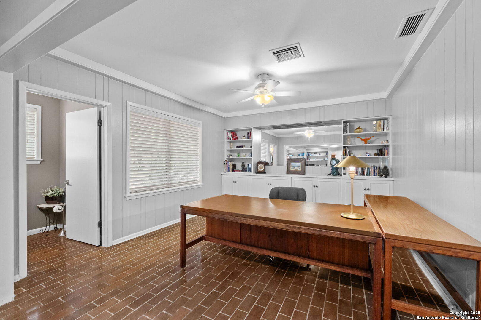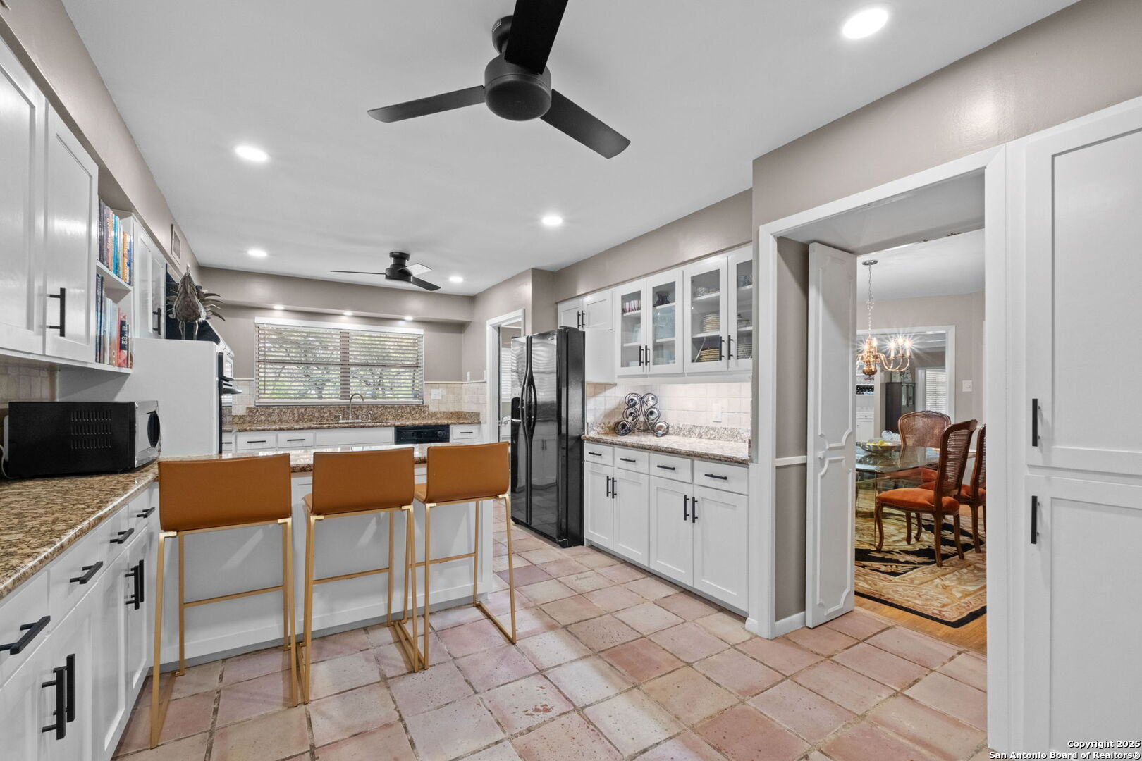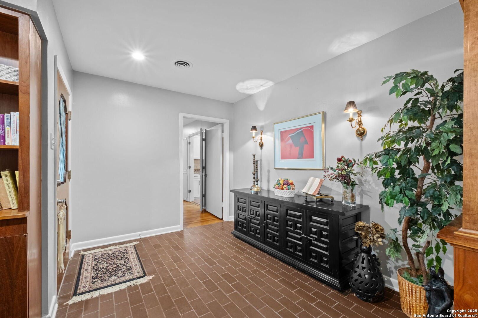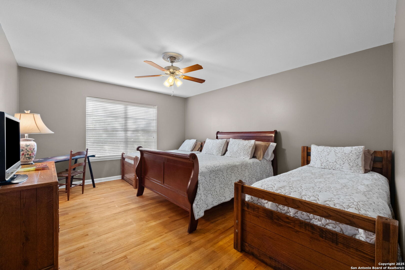 Discover this Mid-Century Modern gem nestled on more than an acre in the serene, secluded enclave of Forest Oaks Estates. This thoughtfully updated single-story home offers 3 bedrooms, 2.5 baths, a generous study, and expansive living and dining areas designed with both comfort and entertaining in mind. The study offers access to the half bath and could become a 4th bedroom. The heart of the home is a chef's kitchen outfitted for culinary enthusiasts, while the open-concept living spaces impress with beamed ceilings, two fireplaces, custom built-in cabinetry, and a stylish serving bar-ideal for gatherings large or small. Walls of windows invite in natural light and offer beautiful views of the lush, oak-studded grounds. Unwind in the tranquil primary suite featuring an updated bath and generous walk-in closets. Step outside to enjoy a spectacular backyard with a sparkling pool, sprawling flagstone patio, and the shade of 100+ majestic oak trees-creating a private, resort-like setting. Located just minutes from Loop 410, Hwy 281, The Pearl, and San Antonio International Airport, with convenient access to Salado Creek Greenway and St. Mary's Hall. Nearby Alamo Heights ISD offers limited tuition opportunities, subject to availability. Opportunities to own in this beautiful neighborhood are few and far between-don't miss your chance to make this peaceful retreat your forever home.