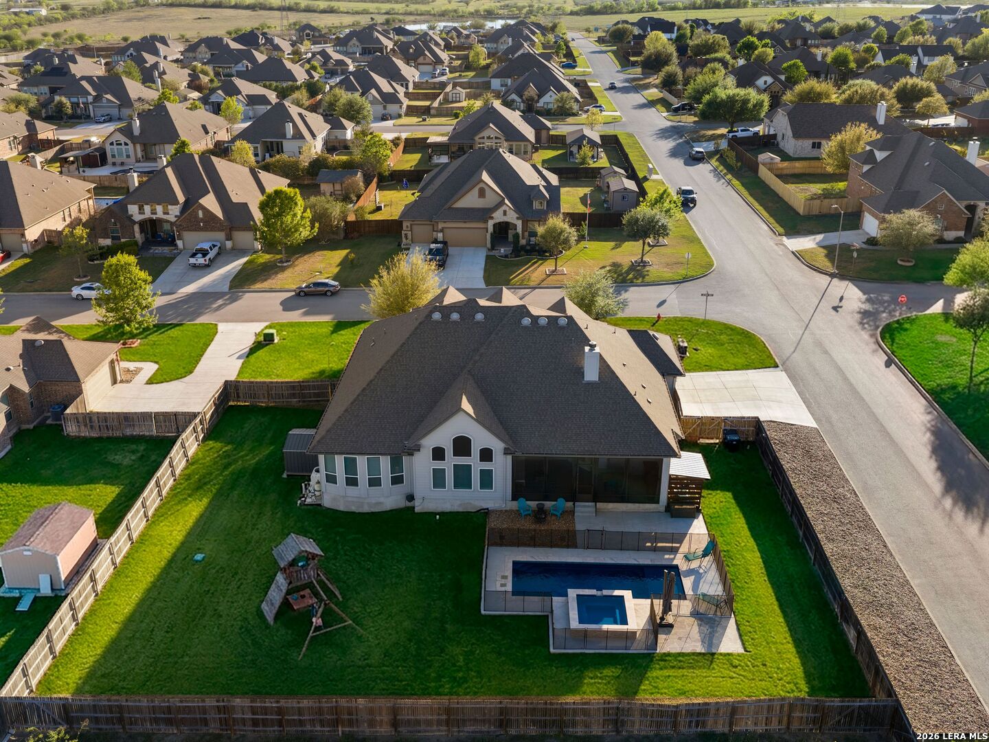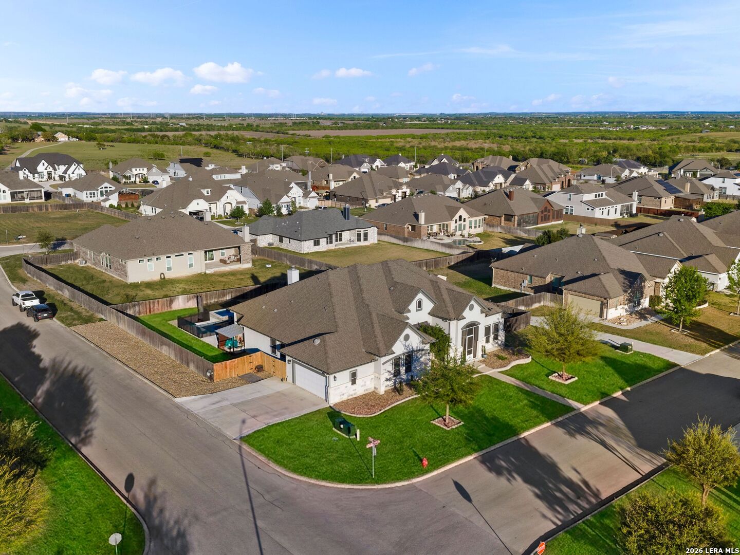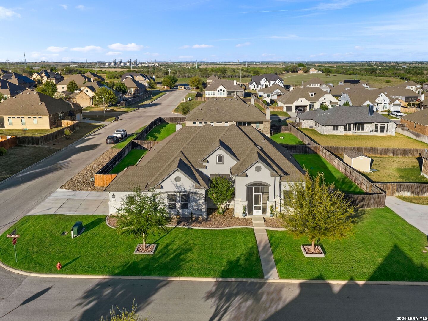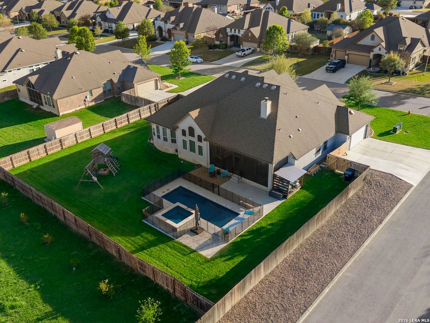 Situated on a premium corner lot within the gated community of Harvest Hills, this single-story 4-bedroom, 3.5-bath home with a dedicated office features an open-concept floorplan with hardwood flooring throughout, high ceilings, and a gourmet kitchen with built-in appliances and ample cabinetry. The split floorplan offers added privacy, with a spacious primary suite featuring multiple walk-in closets and dual vanities. The backyard is designed for enjoyment, complete with a screened-in patio, outdoor fireplace, and a fenced inground pool and spa. Located in an amenity-rich, controlled-access community with a clubhouse and sports courts. This home offers a strong balance of privacy, convenience, and lifestyle.