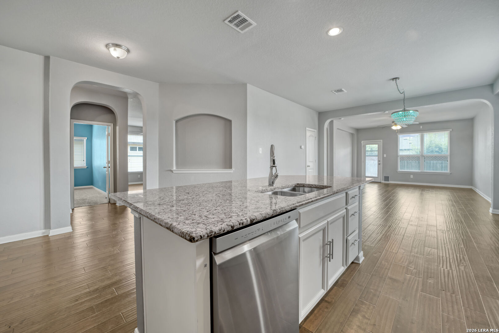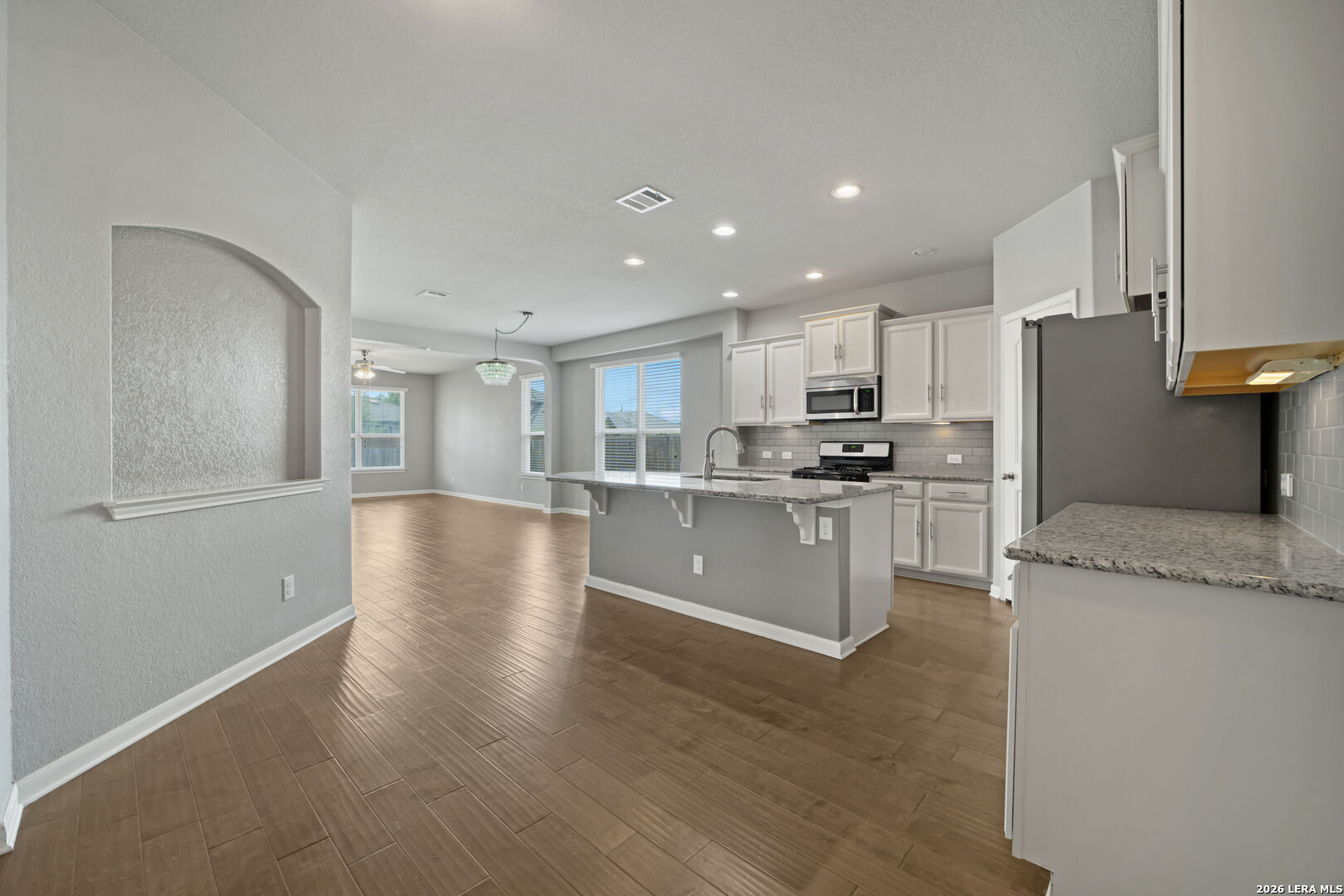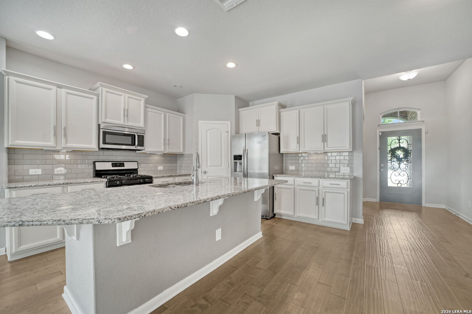 Welcome to 325 Oak Creek Way in New Braunfels, a beautifully maintained single story home with 3 bedrooms and 2 bathrooms designed for easy, modern living. An additional flex room also makes the perfect home office or play room. The open floor plan creates a natural flow between the spacious living, dining, and kitchen areas. The kitchen stands out with granite countertops, a large center island with breakfast bar, stainless steel appliances, white cabinetry, a subway tile backsplash, and a walk in pantry. The private primary suite offers a comfortable retreat with a generous bedroom, walk in closet, and an ensuite bath featuring dual vanities and a soaking tub. Outside, you will find a charming brick exterior, covered front entry, two car garage, landscaped yard, and a covered back patio that is perfect for relaxing or entertaining. Conveniently located near shopping, dining, schools, and quick access to I 35, this home offers both comfort and convenience in the heart of Texas Hill Country.