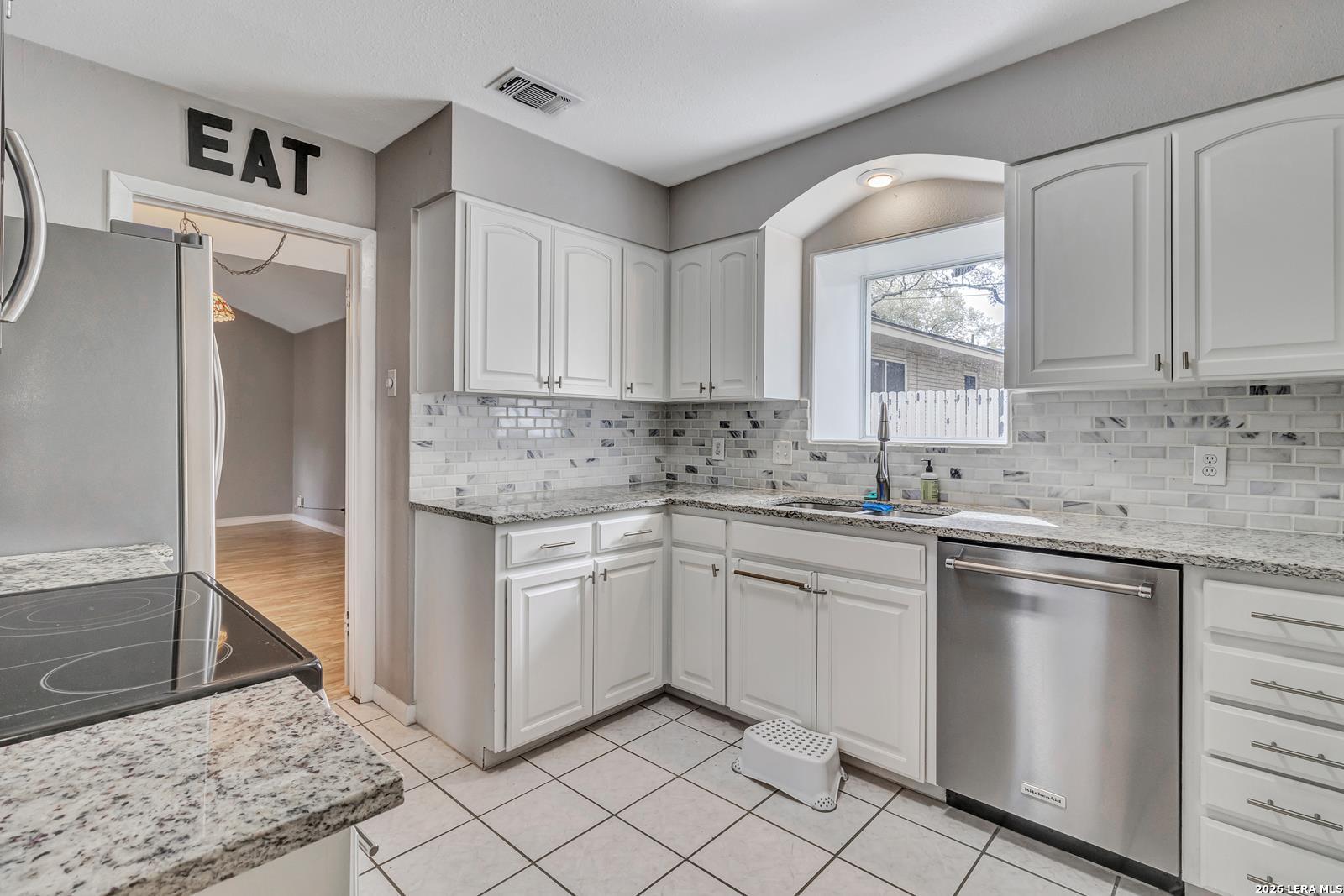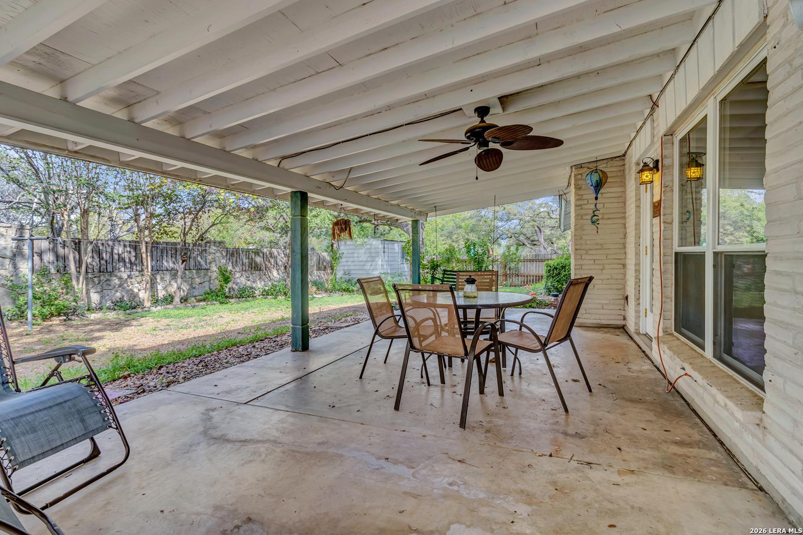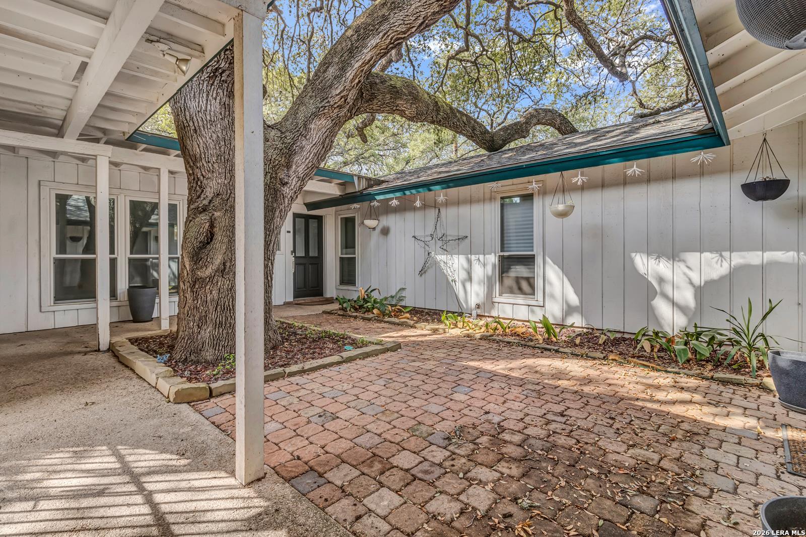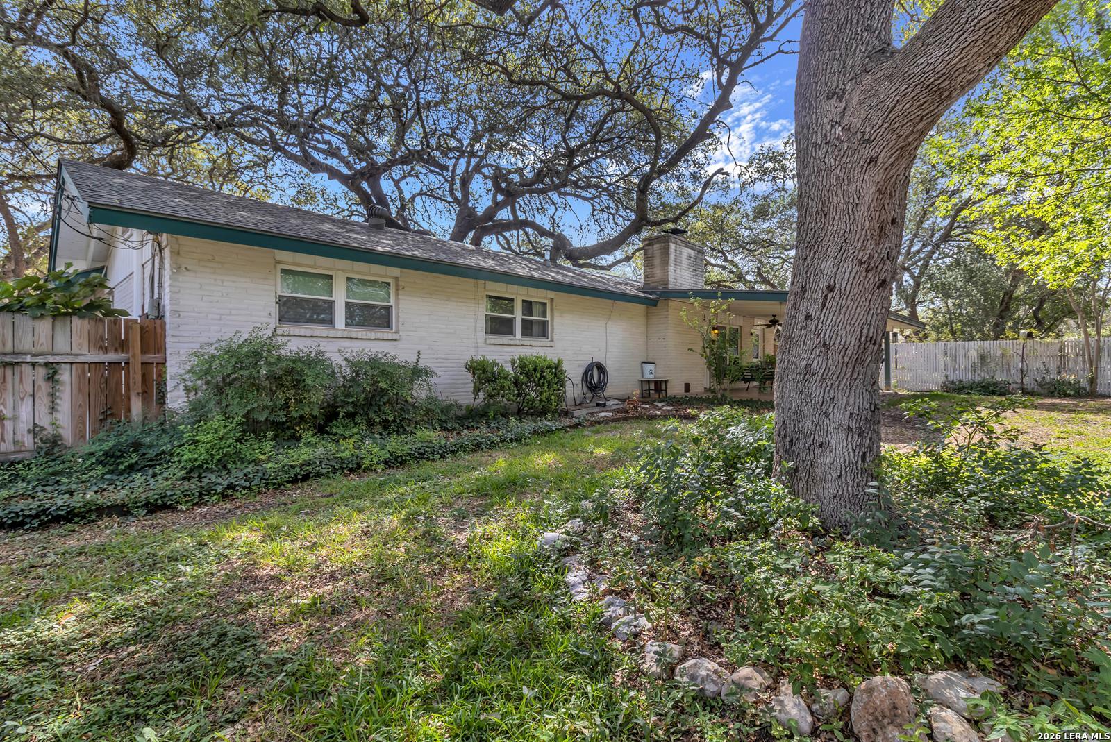 Beautiful Ranch-Style Home in Highly-Desirable Colonies North. Charming Exterior Styling with Swing Garage & Ample Driveway Parking, Gated Courtyard Anchored by HUGE Heritage Oak Tree! Primary Entrance Opens to Formal Living/Dining Space with Vaulted Ceiling. Separate Family Room with Handsome Brick Fireplace & Wood Center Ceiling Beam. Both Living Areas Open to Gourmet Kitchen Featuring Granite Countertops, Stainless Steel Appliances, & Custom Cabinetry. Cozy Breakfast Area Overlooks Covered Back Patio, Adjacent to Full Laundry Room with Washer/Dryer Included, Granite Countertop & Cabinet Space. Spacious Primary Suite with Sliding Doors to Interior Courtyard, Renovated Bathroom with Large Walk-In Shower, & Walk-In Closet. Nicely-Sized Secondary Bedrooms with Wood Flooring & Ceiling Fans. Secondary Bathroom with Tub/Shower & Vintage Styling. Gorgeous Private Backyard with Large Covered Patio & Mature Trees, Perfect for Play & Relaxation. 2-Car Attached Garage with Opener, Sprinkler System, & Water Softener. Northside ISD Schools.