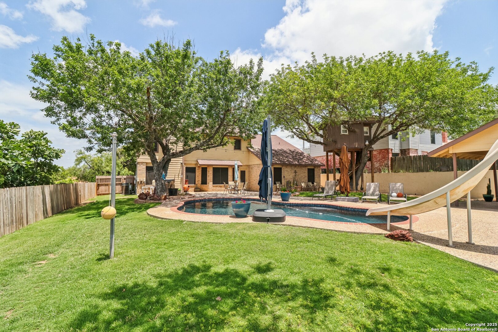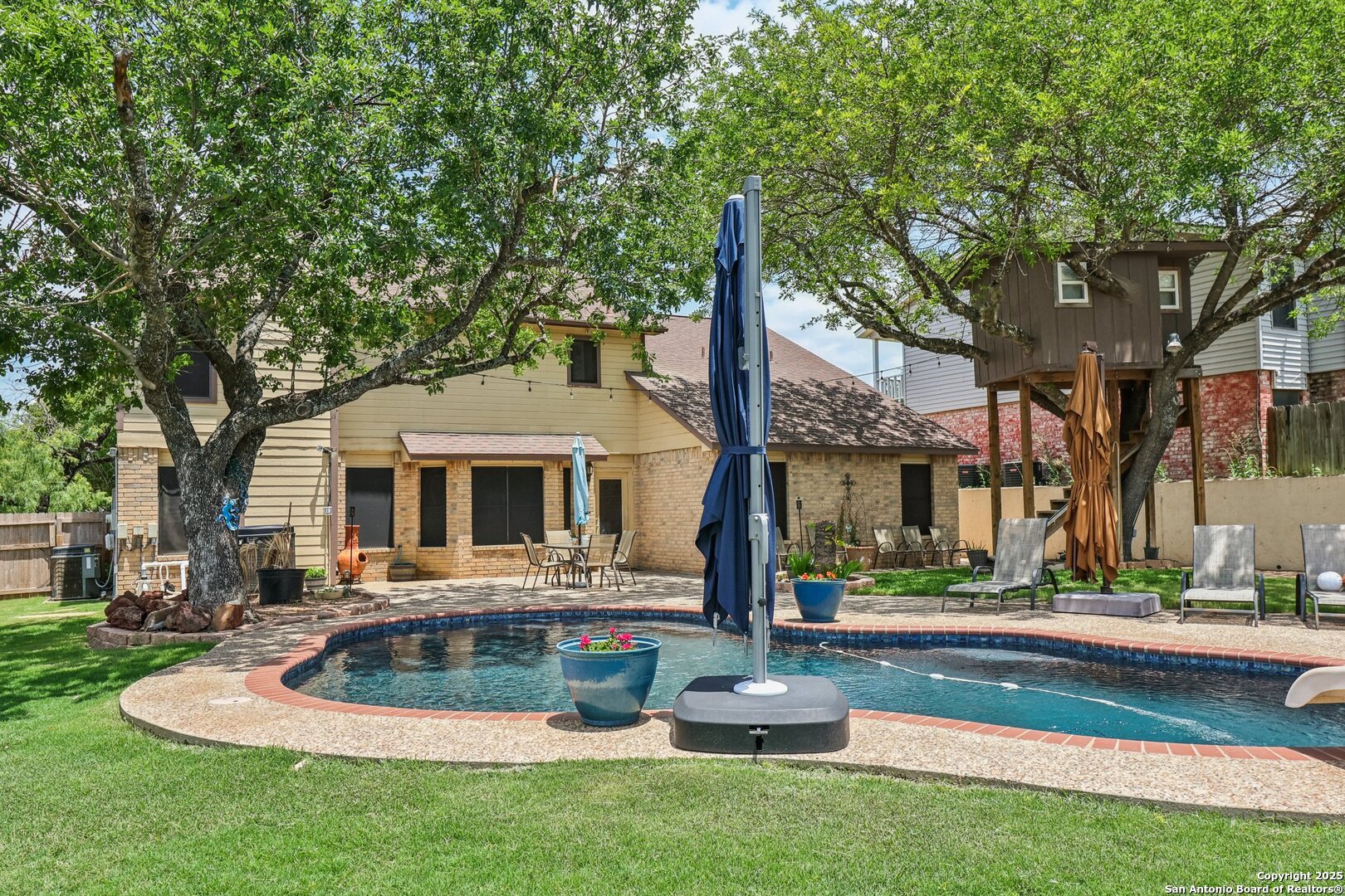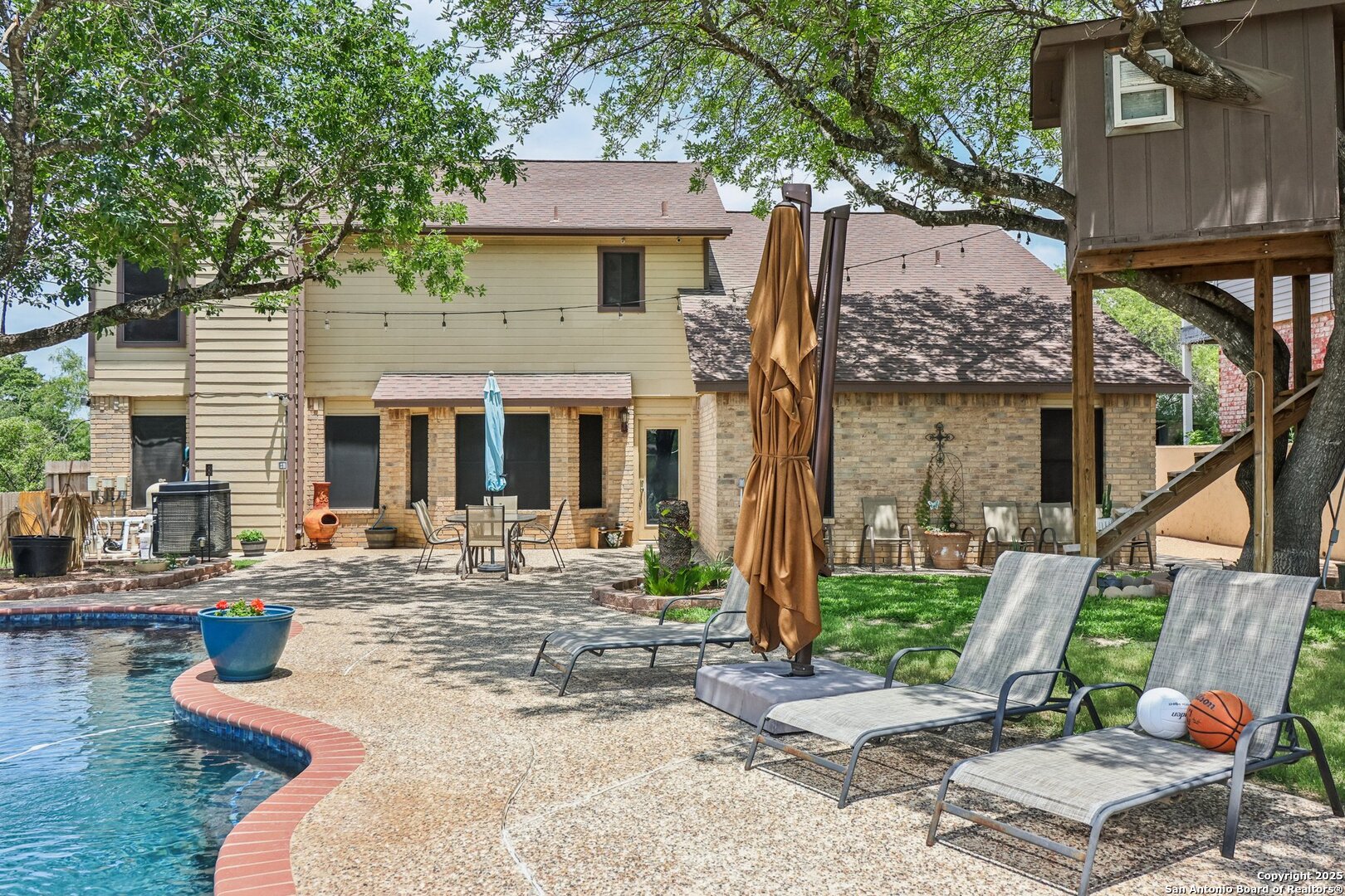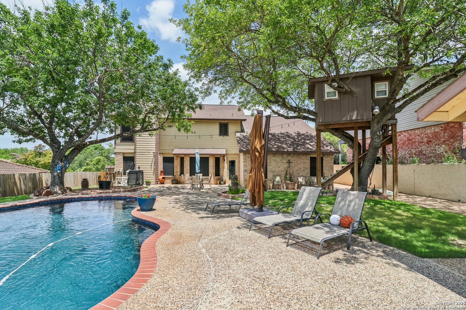 Welcome to 3330 Wimbledon Dr, a charming two-story home nestled in the sought-after Northcliffe community of Schertz. This home offers exceptional curb appeal, set back off the road with a spacious front yard and beautiful mature trees. Step inside to a welcoming foyer that opens to a spacious living room anchored by a stunning brick fireplace. The kitchen features bar-height seating, a cozy breakfast nook, and a formal dining area-ideal for both everyday living and entertaining. Upstairs, a generous bonus area provides flexible space for work or relaxation. The primary suite includes a private en-suite bath with double vanities and plenty of counter space. Step out back and discover a true private oasis with an extended patio, a sparkling inground swimming pool, lush landscaping, mature trees, a charming tree house, and a cozy pool house perfect for lounging or hosting. The neighborhood includes fantastic amenities such as a pool, splash pad, park, basketball courts, and scenic trails. This home offers the perfect blend of style, function, and serene outdoor space!