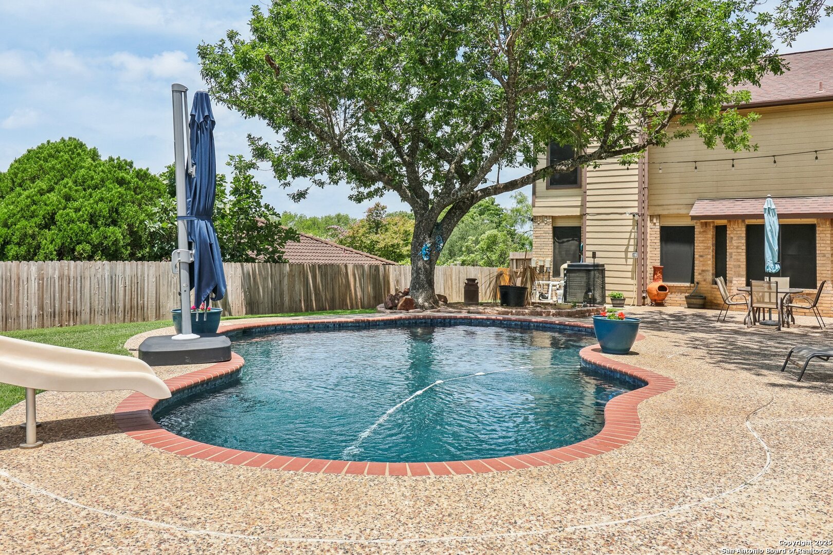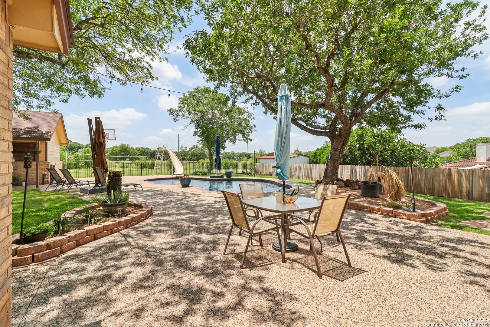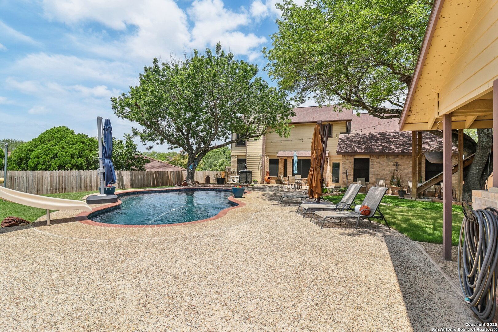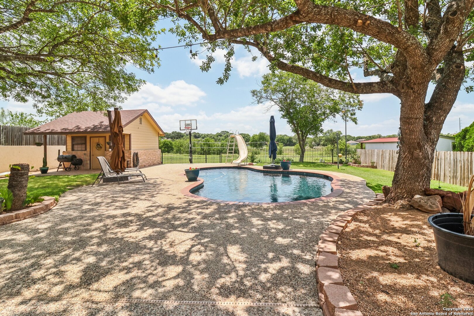 Welcome to 3330 Wimbledon Dr, a charming two-story home nestled in the sought-after Northcliffe community of Schertz. This home offers exceptional curb appeal, set back off the road with a spacious front yard and beautiful mature trees. Step inside to a welcoming foyer that opens to a spacious living room anchored by a stunning brick fireplace. The kitchen features bar-height seating, a cozy breakfast nook, and a formal dining area-ideal for both everyday living and entertaining. Upstairs, a generous bonus area provides flexible space for work or relaxation. The primary suite includes a private en-suite bath with double vanities and plenty of counter space. Step out back and discover a true private oasis with an extended patio, a sparkling inground swimming pool, lush landscaping, mature trees, a charming tree house, and a cozy pool house perfect for lounging or hosting. The neighborhood includes fantastic amenities such as a pool, splash pad, park, basketball courts, and scenic trails. This home offers the perfect blend of style, function, and serene outdoor space!