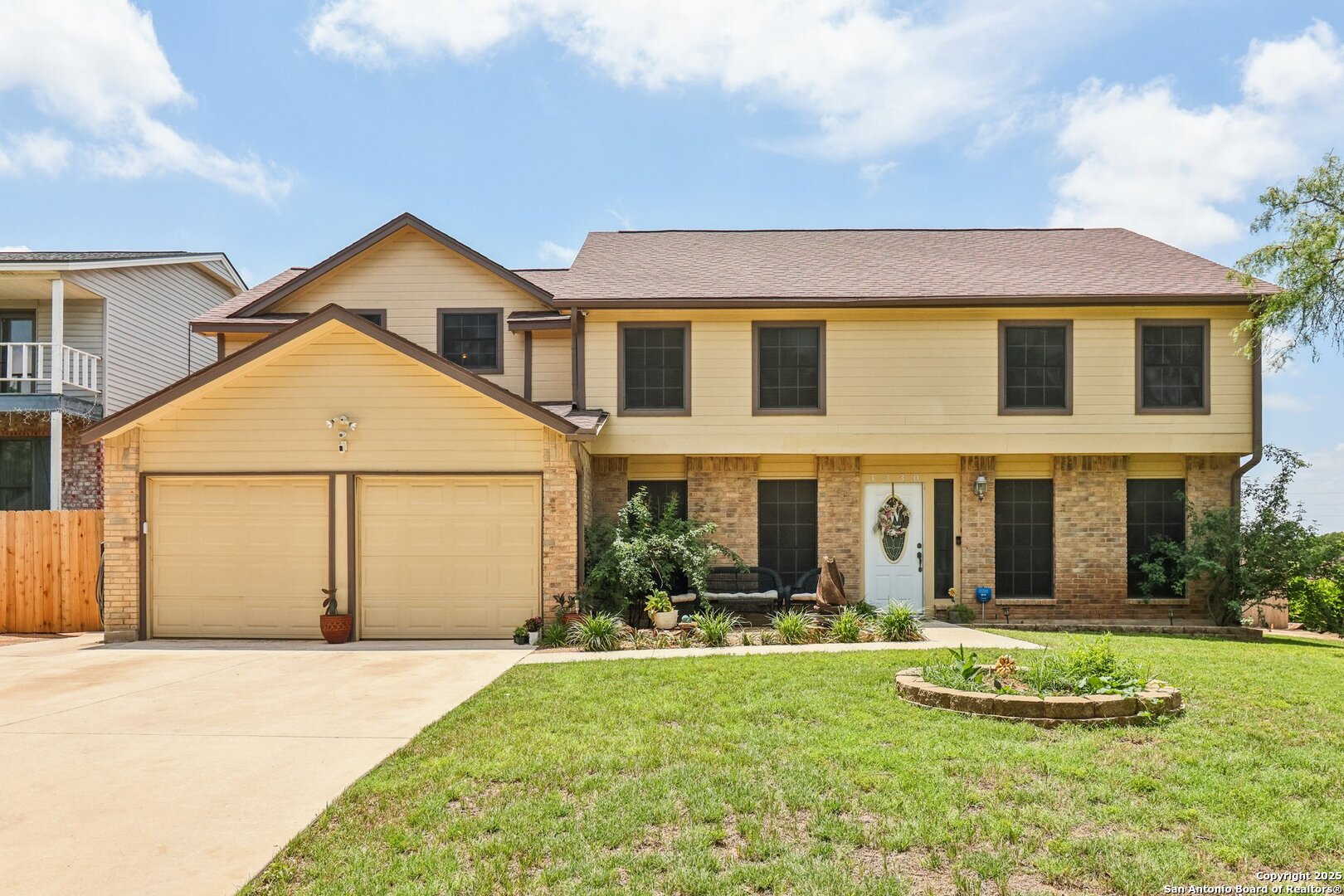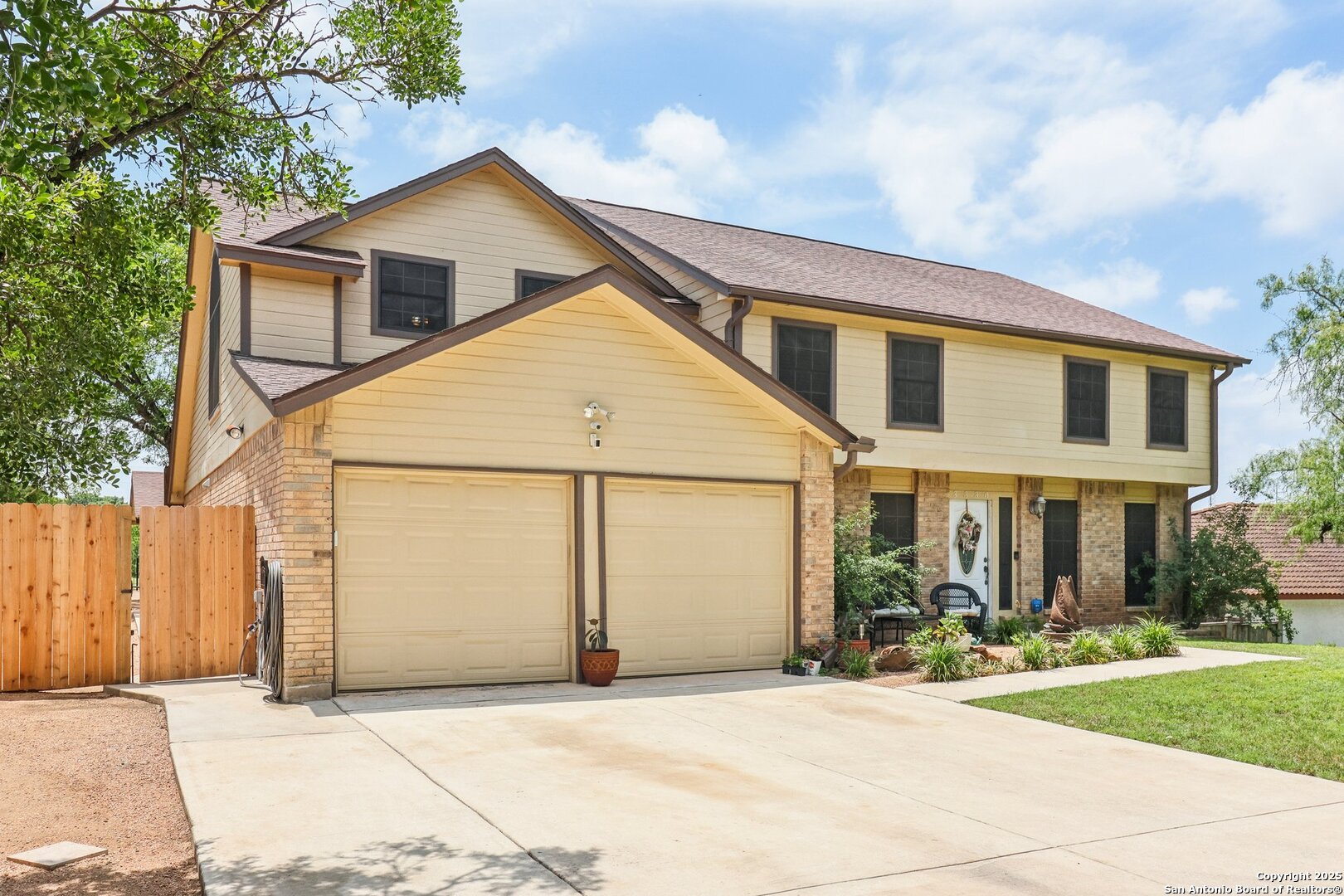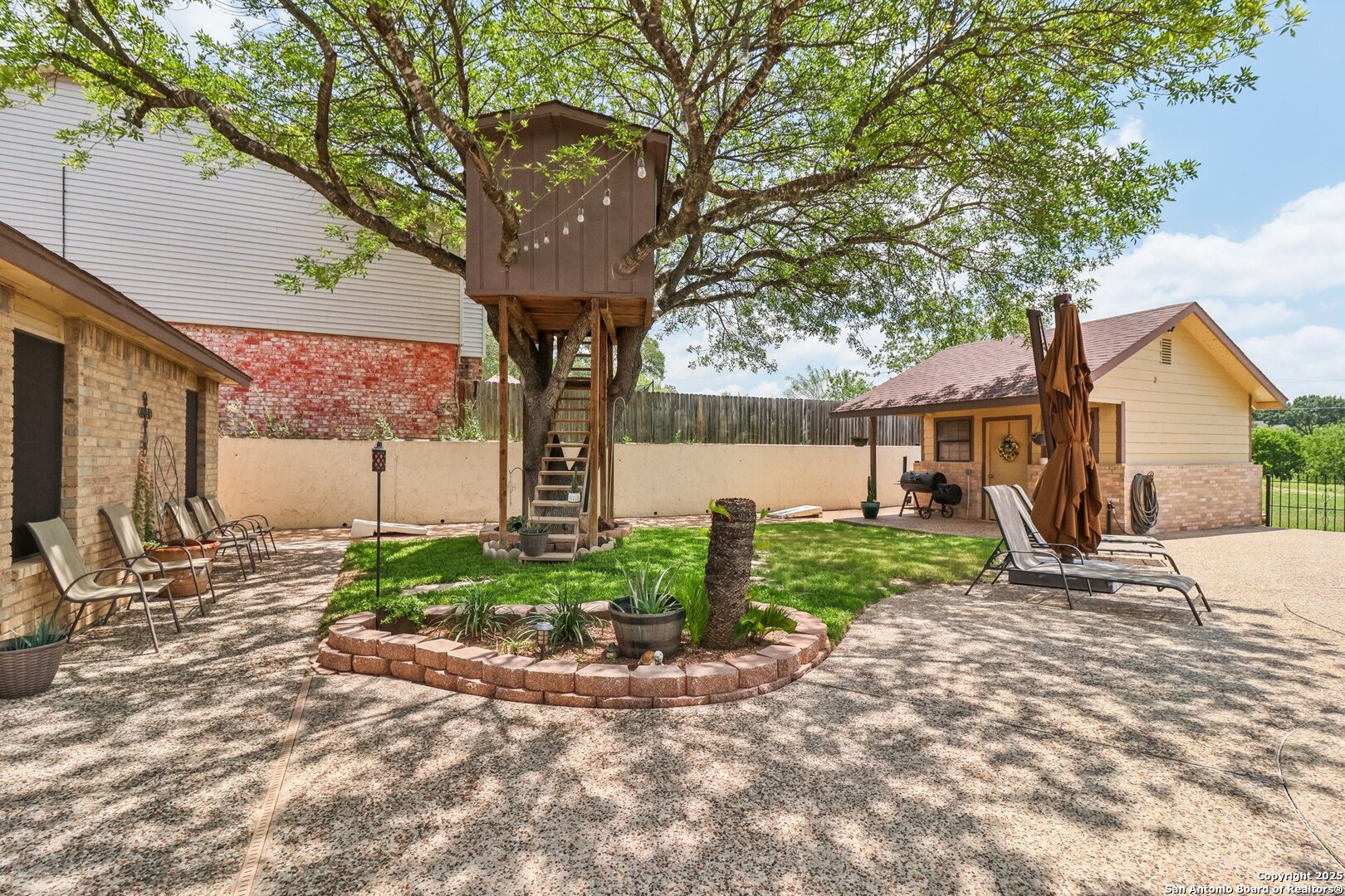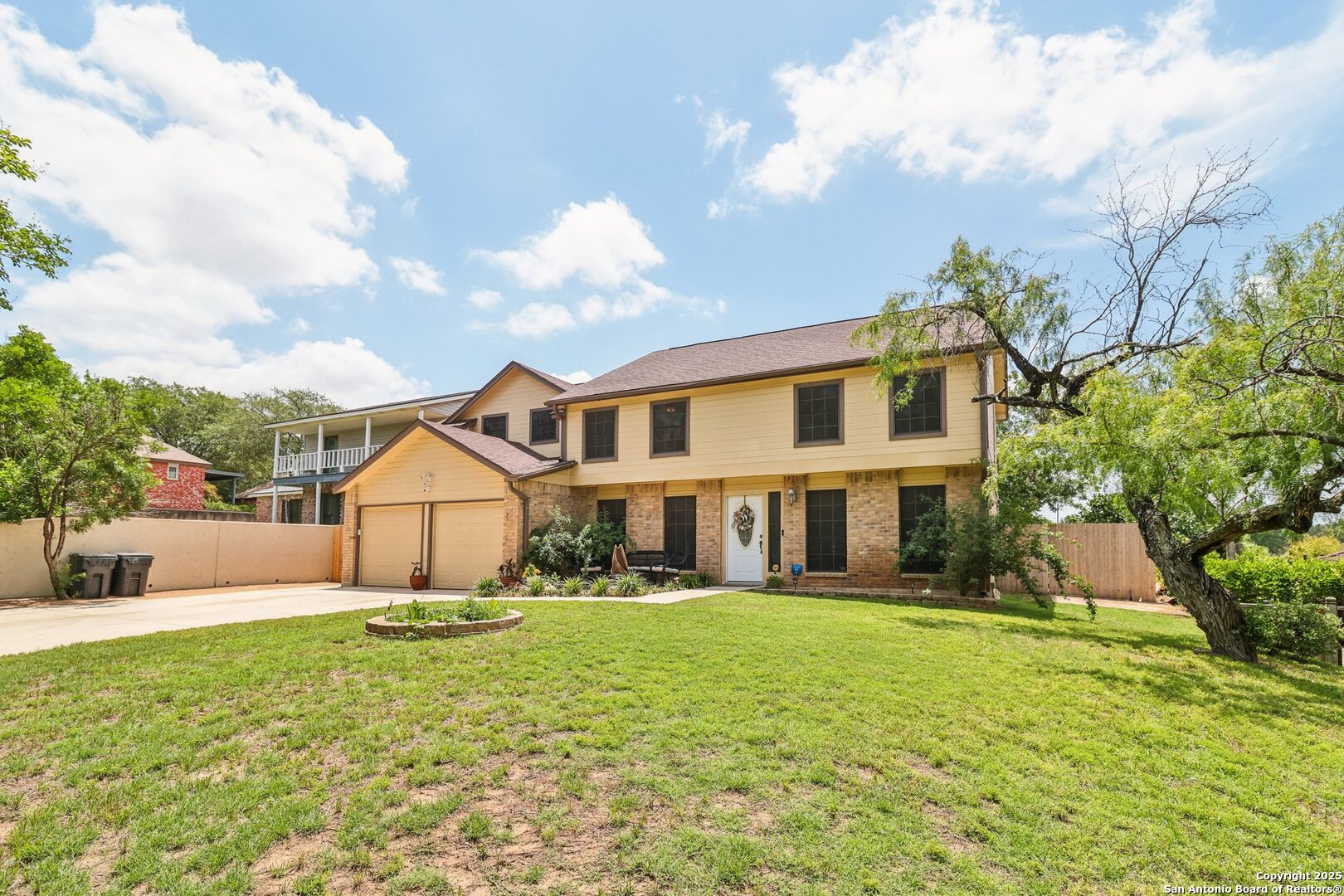 Welcome to 3330 Wimbledon Dr, a charming two-story home nestled in the sought-after Northcliffe community of Schertz. This home offers exceptional curb appeal, set back off the road with a spacious front yard and beautiful mature trees. Step inside to a welcoming foyer that opens to a spacious living room anchored by a stunning brick fireplace. The kitchen features bar-height seating, a cozy breakfast nook, and a formal dining area-ideal for both everyday living and entertaining. Upstairs, a generous bonus area provides flexible space for work or relaxation. The primary suite includes a private en-suite bath with double vanities and plenty of counter space. Step out back and discover a true private oasis with an extended patio, a sparkling inground swimming pool, lush landscaping, mature trees, a charming tree house, and a cozy pool house perfect for lounging or hosting. The neighborhood includes fantastic amenities such as a pool, splash pad, park, basketball courts, and scenic trails. This home offers the perfect blend of style, function, and serene outdoor space!