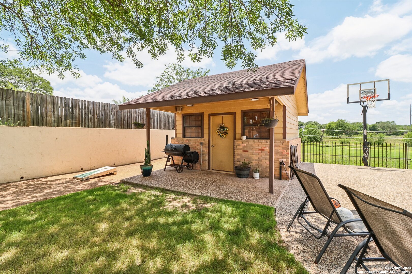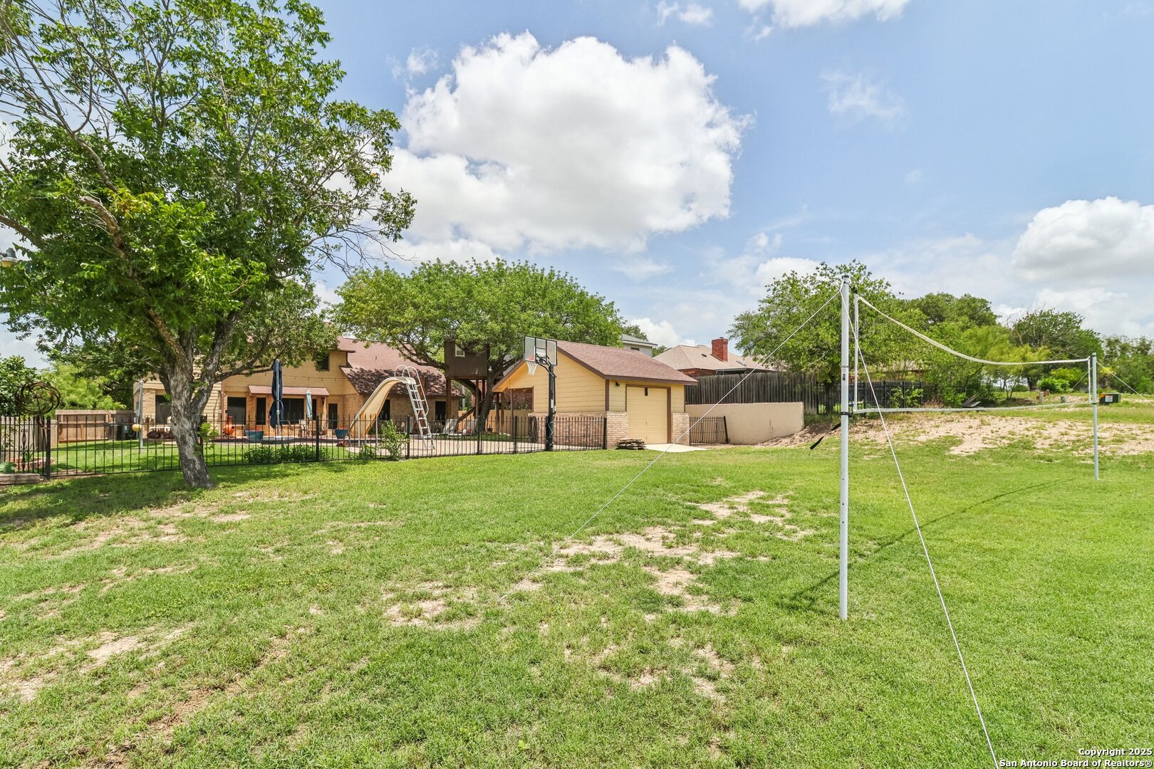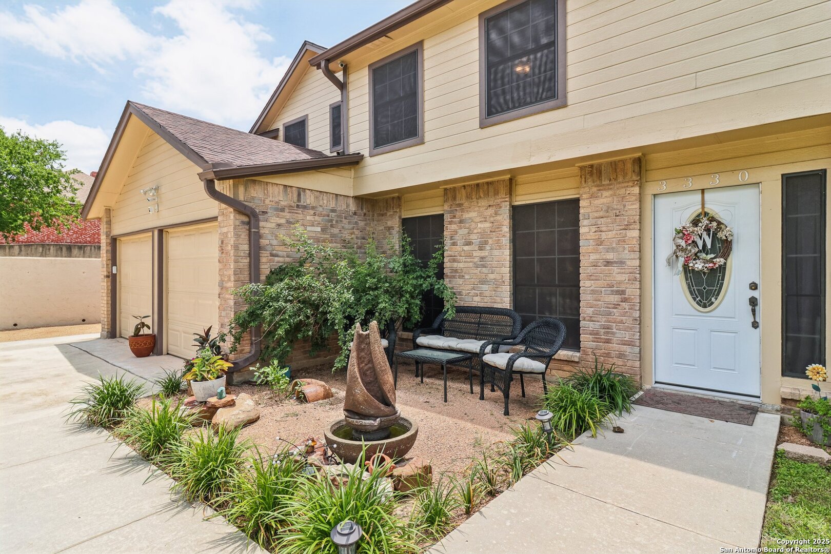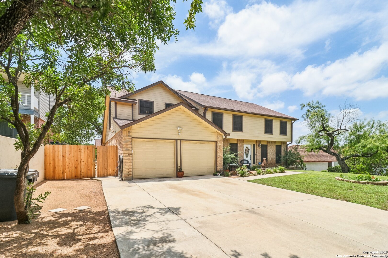 Welcome to 3330 Wimbledon Dr, a charming two-story home nestled in the sought-after Northcliffe community of Schertz. This home offers exceptional curb appeal, set back off the road with a spacious front yard and beautiful mature trees. Step inside to a welcoming foyer that opens to a spacious living room anchored by a stunning brick fireplace. The kitchen features bar-height seating, a cozy breakfast nook, and a formal dining area-ideal for both everyday living and entertaining. Upstairs, a generous bonus area provides flexible space for work or relaxation. The primary suite includes a private en-suite bath with double vanities and plenty of counter space. Step out back and discover a true private oasis with an extended patio, a sparkling inground swimming pool, lush landscaping, mature trees, a charming tree house, and a cozy pool house perfect for lounging or hosting. The neighborhood includes fantastic amenities such as a pool, splash pad, park, basketball courts, and scenic trails. This home offers the perfect blend of style, function, and serene outdoor space!