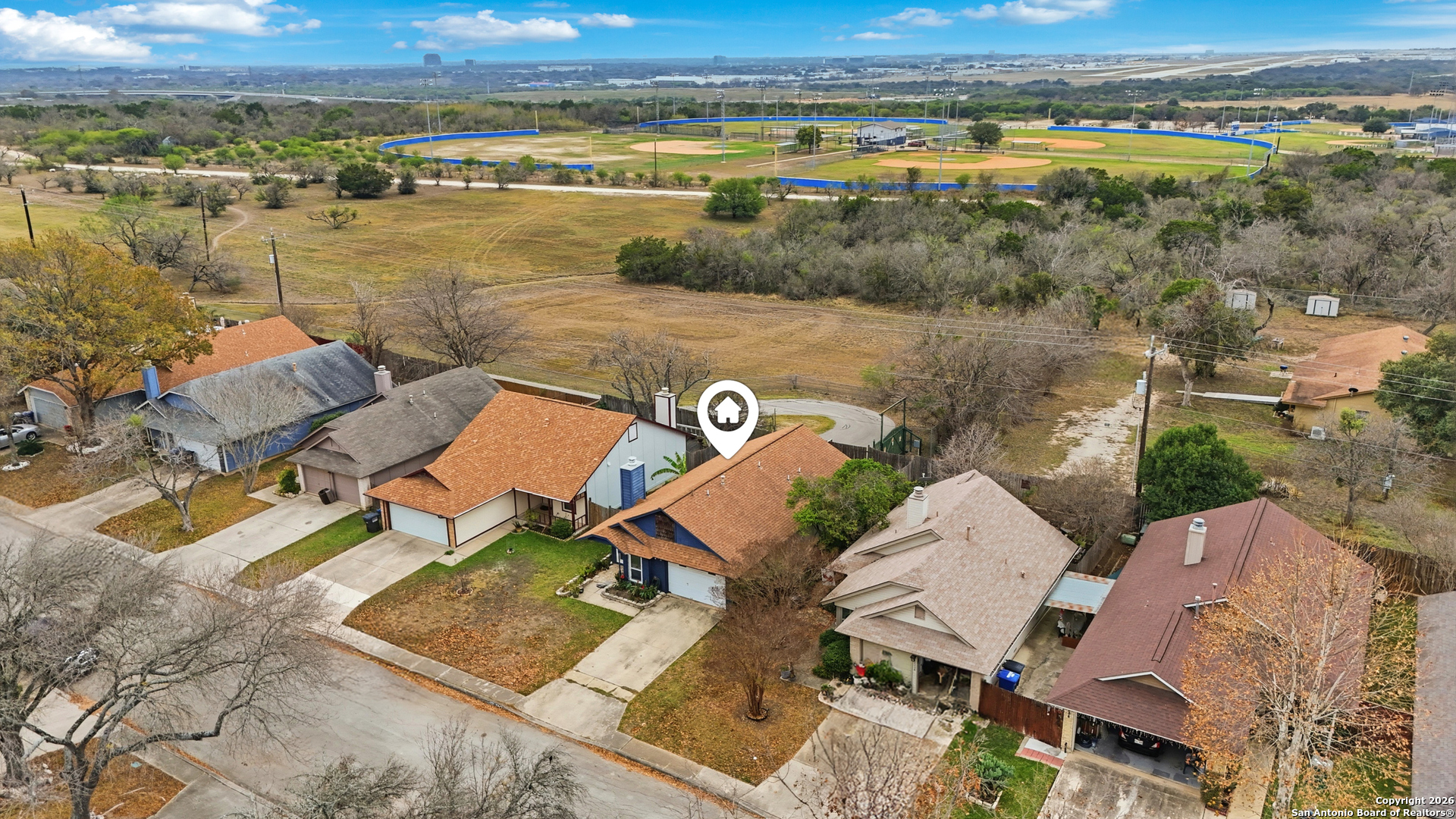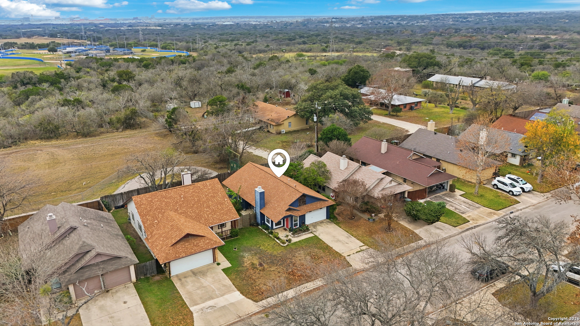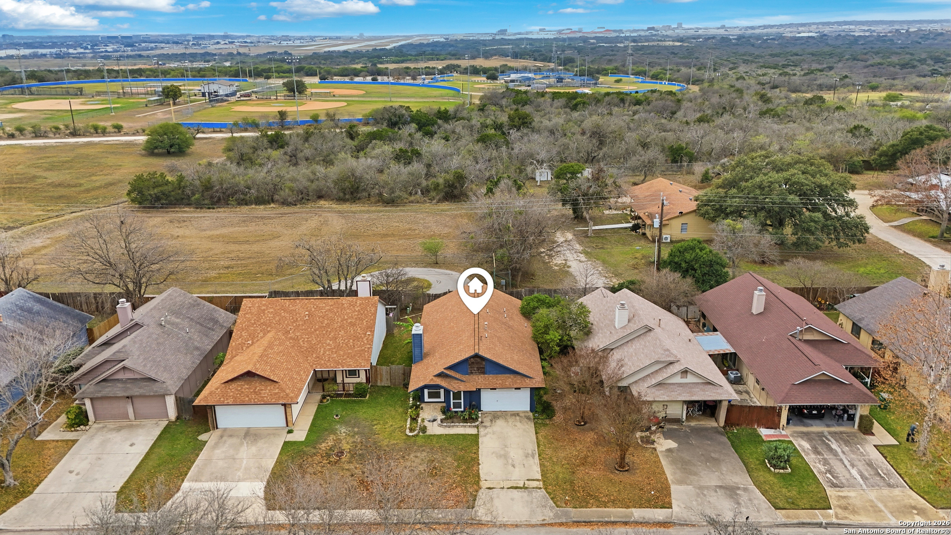 This well maintained home features an open and inviting layout enhanced by high ceilings and recessed lighting that allow natural light to flow beautifully throughout the main living space. The living room is anchored by a striking brick wood burning stone fireplace, creating a warm focal point that is further elevated by a custom accent wall for added style and character. The kitchen is designed for both everyday use and entertaining, offering stainless steel appliances, updated cabinetry, and newer paint, all seamlessly connected to the main living areas for easy flow and functionality. Outdoor living is a standout feature with no back neighbors, as the property backs directly to McAllister Park, providing added privacy and peaceful views. The privacy fenced backyard includes a stone patio slab, ideal for outdoor dining, relaxing. Neighborhood amenities include a community pool, park, playground, and basketball courts, offering convenient recreation just minutes from home. The location provides an easy commute to Randolph Air Force Base and Fort Sam Houston, with quick access to San Antonio International Airport, shopping, dining, and major roadways.