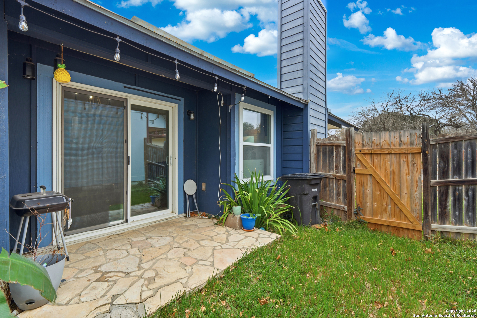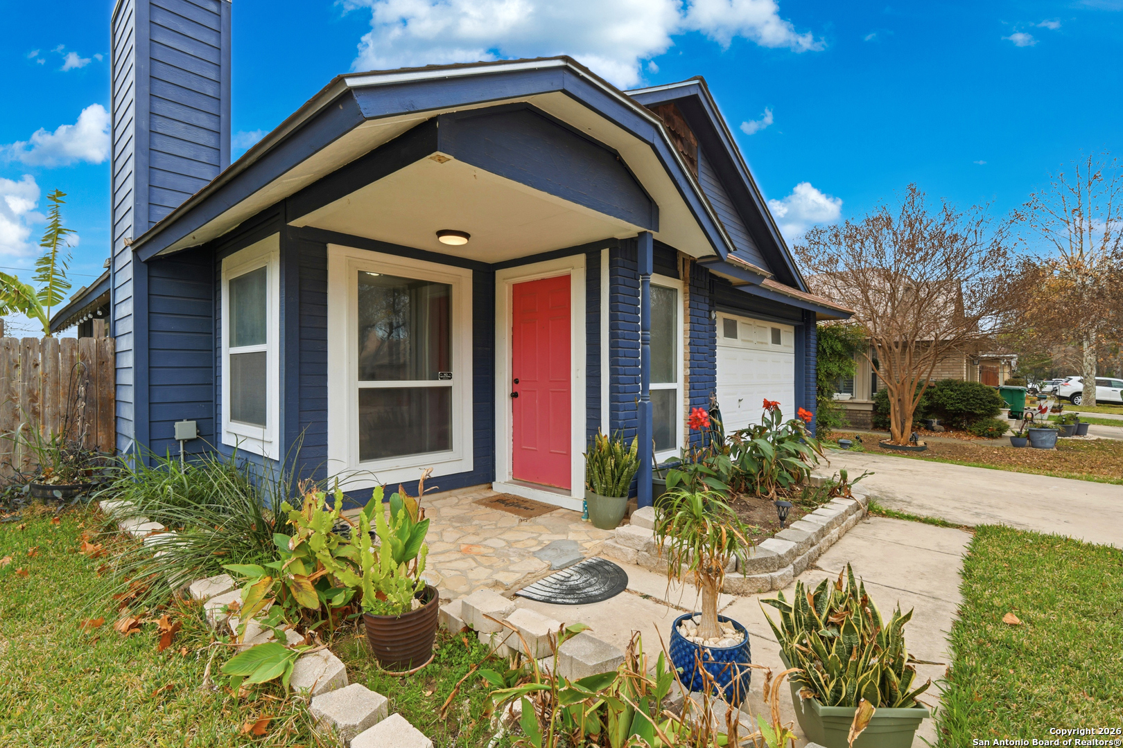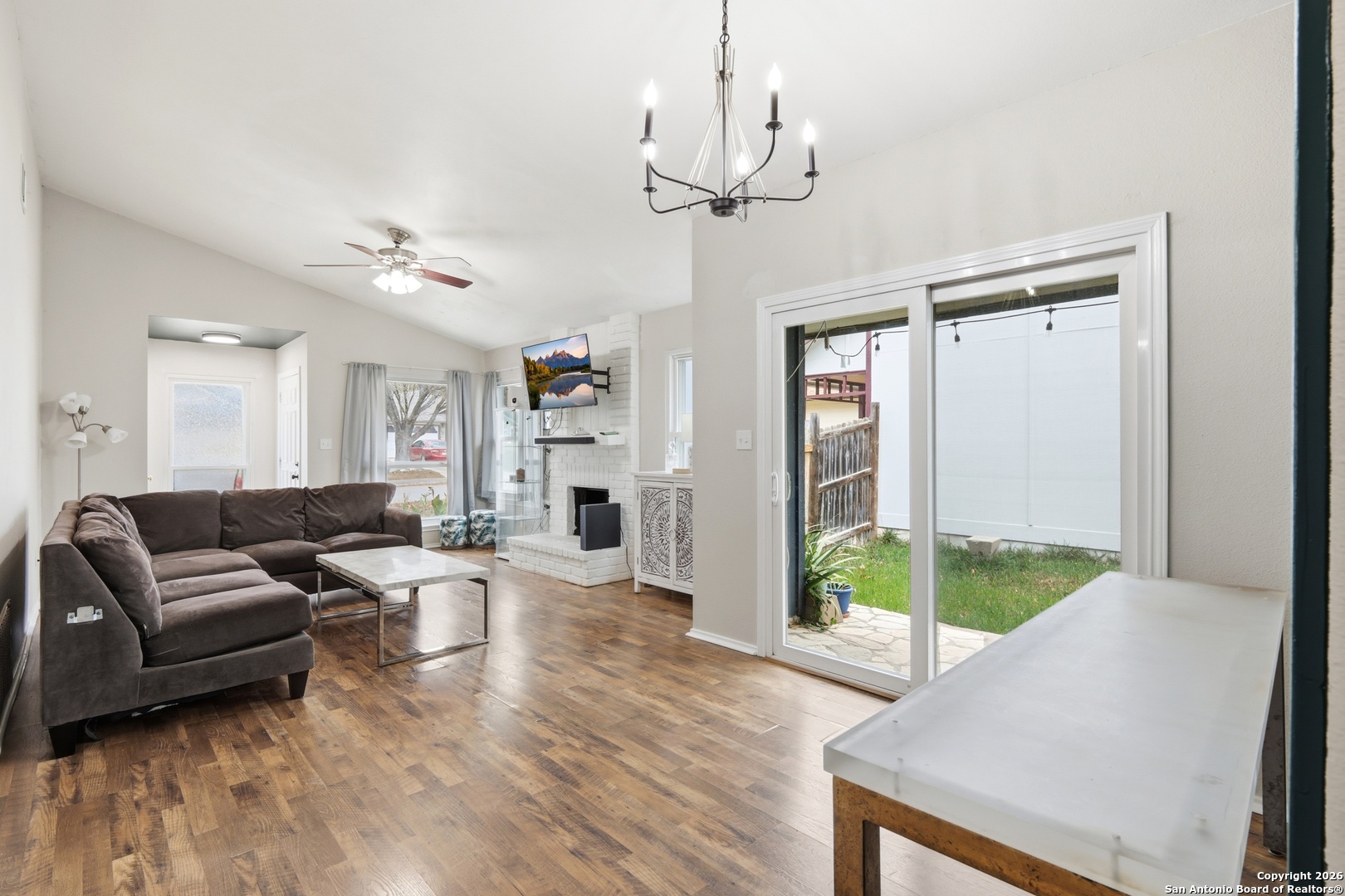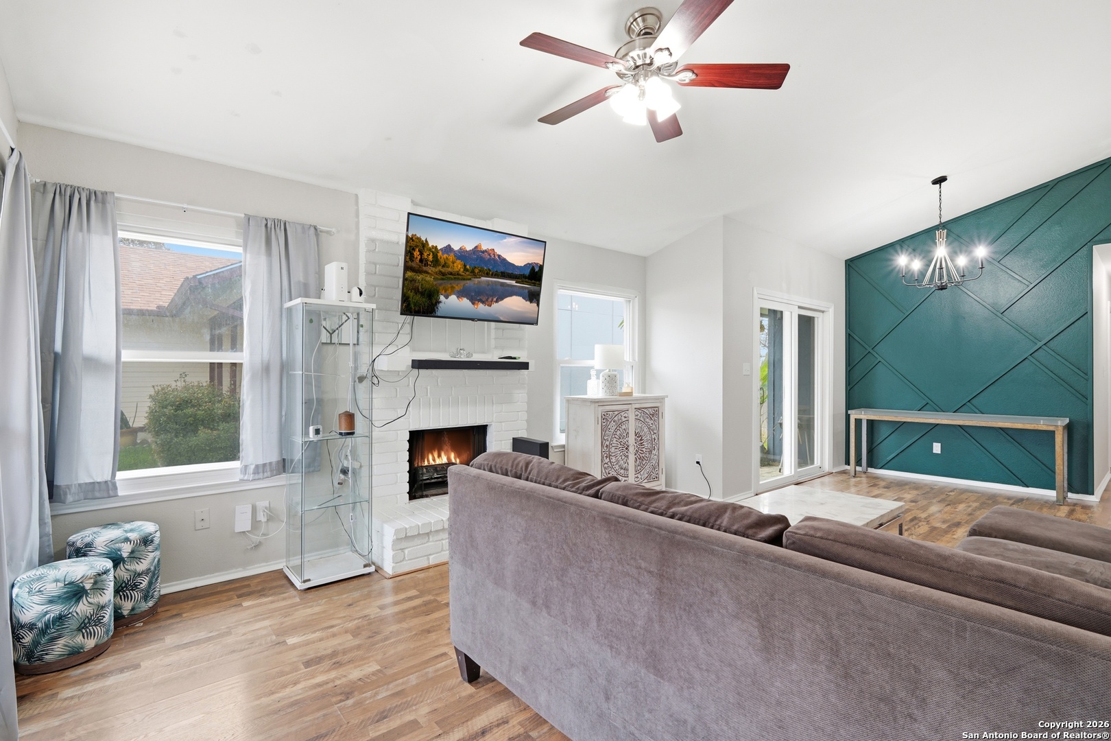 This well maintained home features an open and inviting layout enhanced by high ceilings and recessed lighting that allow natural light to flow beautifully throughout the main living space. The living room is anchored by a striking brick wood burning stone fireplace, creating a warm focal point that is further elevated by a custom accent wall for added style and character. The kitchen is designed for both everyday use and entertaining, offering stainless steel appliances, updated cabinetry, and newer paint, all seamlessly connected to the main living areas for easy flow and functionality. Outdoor living is a standout feature with no back neighbors, as the property backs directly to McAllister Park, providing added privacy and peaceful views. The privacy fenced backyard includes a stone patio slab, ideal for outdoor dining, relaxing. Neighborhood amenities include a community pool, park, playground, and basketball courts, offering convenient recreation just minutes from home. The location provides an easy commute to Randolph Air Force Base and Fort Sam Houston, with quick access to San Antonio International Airport, shopping, dining, and major roadways.