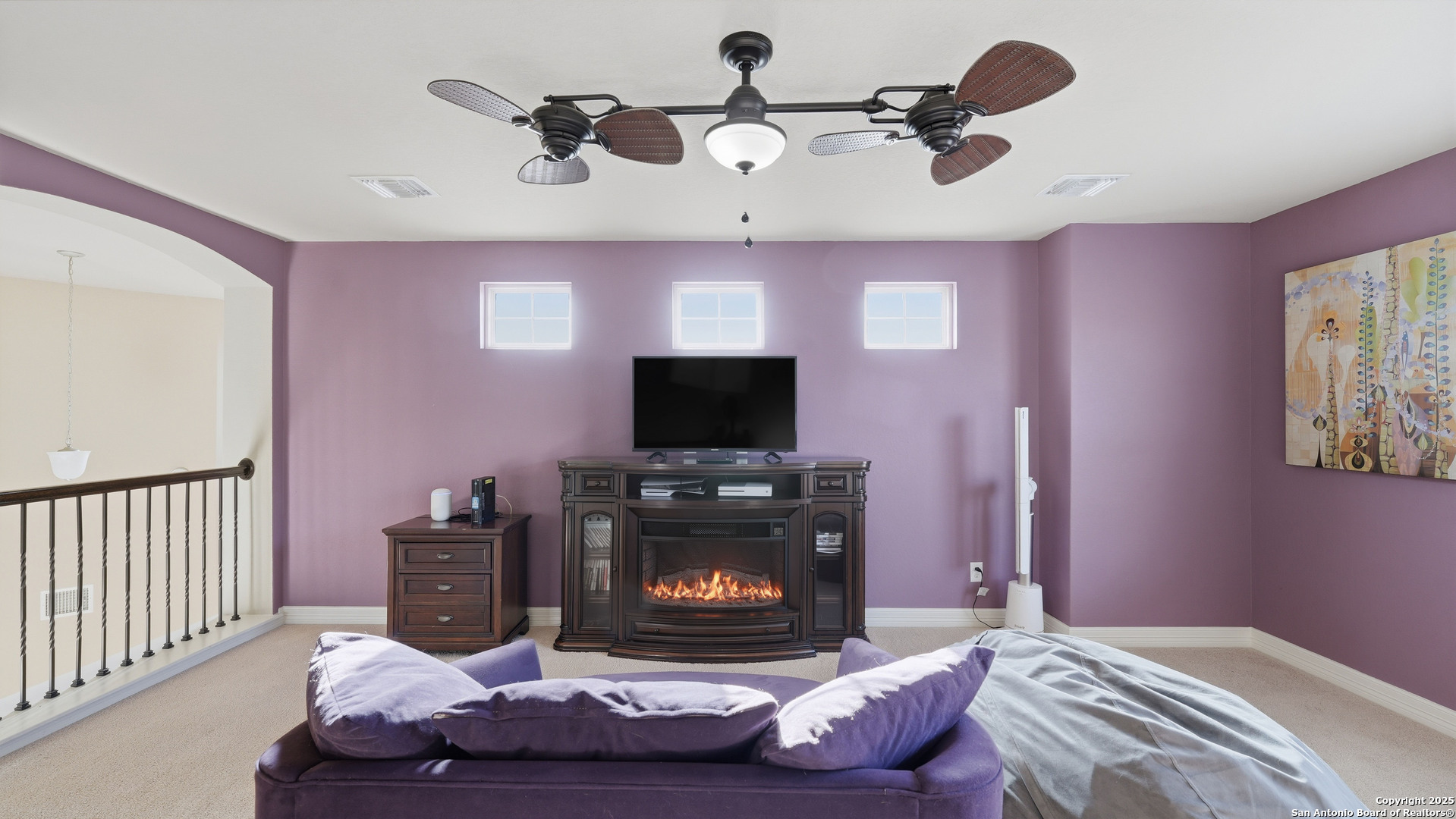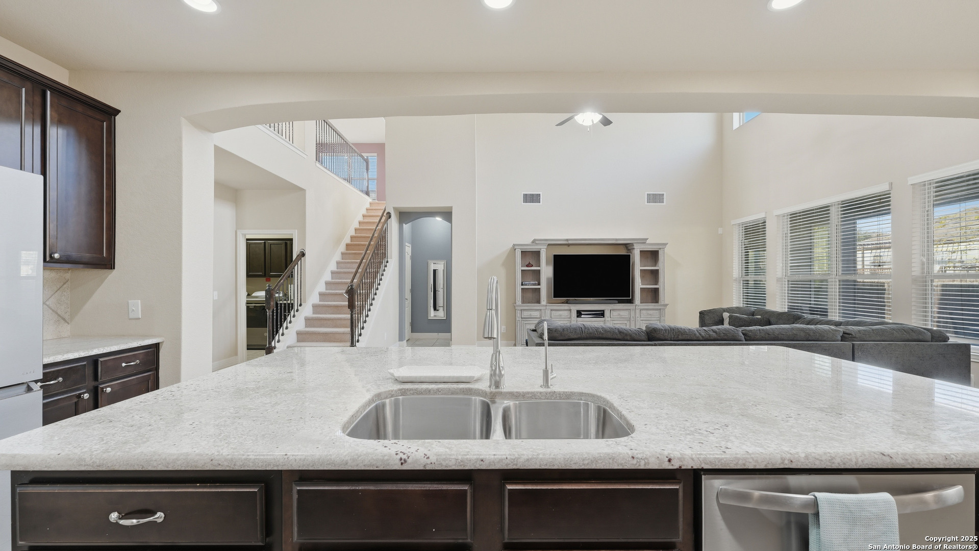 Welcome to 335 Snow Goose! This beautifully upgraded home features a grand foyer leading to an open-concept living area with soaring 26-ft ceilings, expansive windows, abundant natural light, and stunning sky views. A downstairs office or flex room with upgraded engineered hardwood flooring offers versatility for work or guests. The kitchen opens to the living space and includes a large granite island, stainless steel appliances, double ovens, and ample cabinetry that is perfect for entertaining. The primary suite offers a private sitting area with patio access, while the spa-like bath features a walk-in shower, separate tub, dual vanities, framed mirrors, and an oversized walk-in closet with a custom-built closet system. Upstairs includes an open media/living area and spacious secondary bedrooms. Oversized garage with water softener and backyard access. Fully landscaped yard with sprinkler system and peaceful greenbelt views. Conveniently located near top New Braunfels attractions, dining, shopping, and IH-35 for quick access anywhere.***This home is also eligible for a VA 2.99 assumable interest rate for a qualified buyer.***
