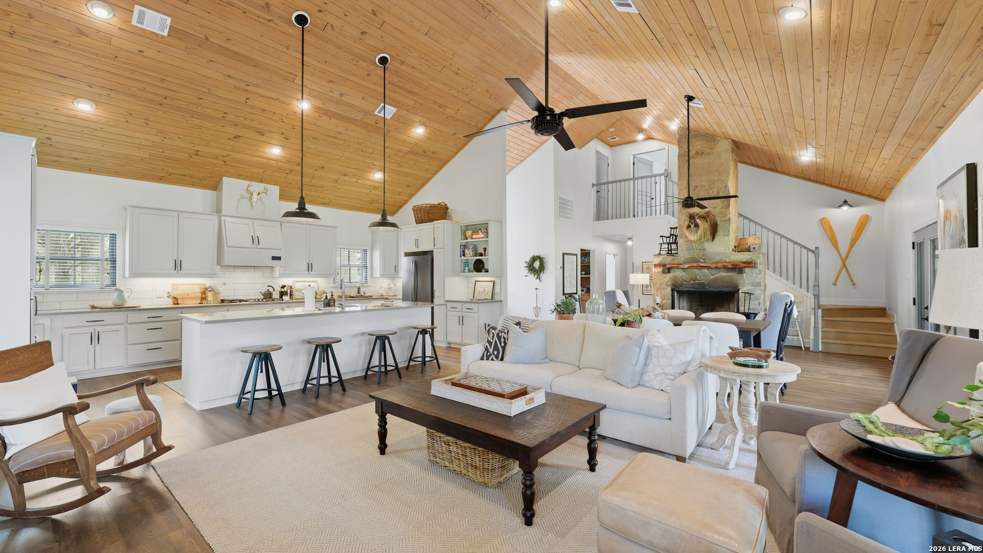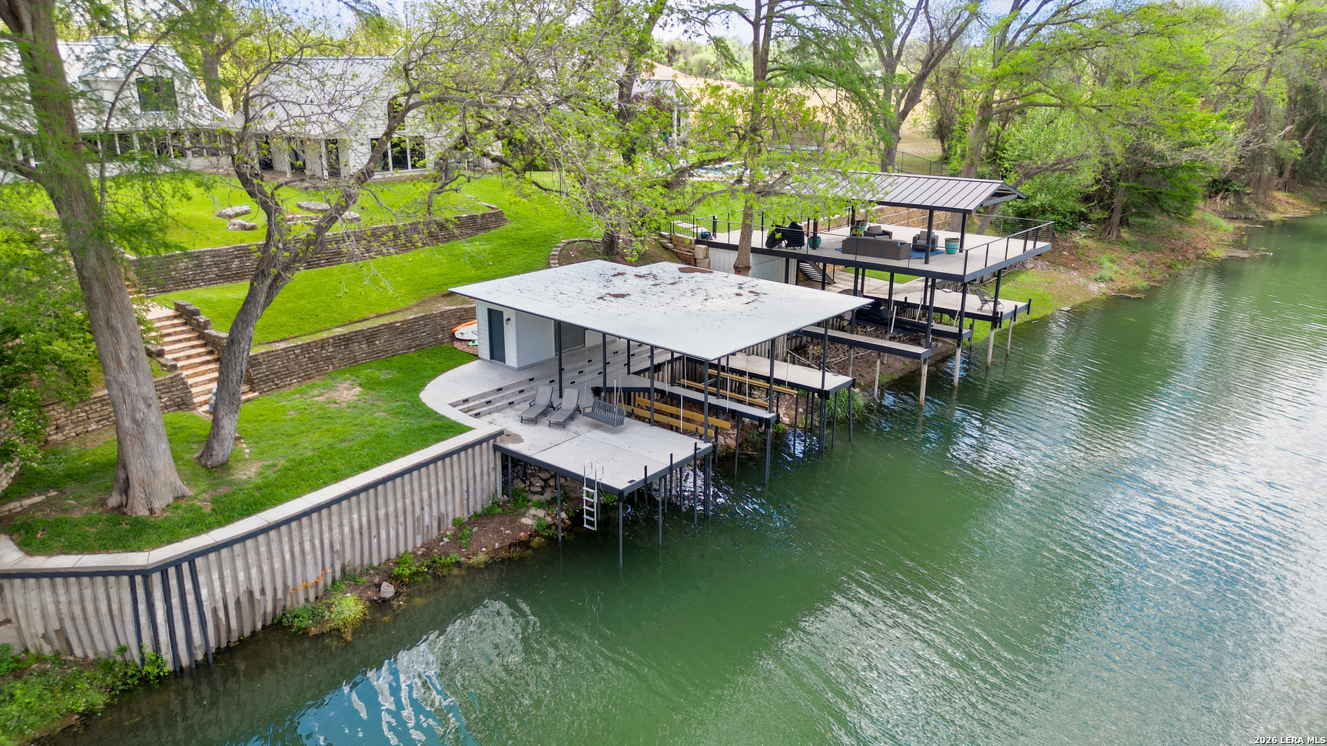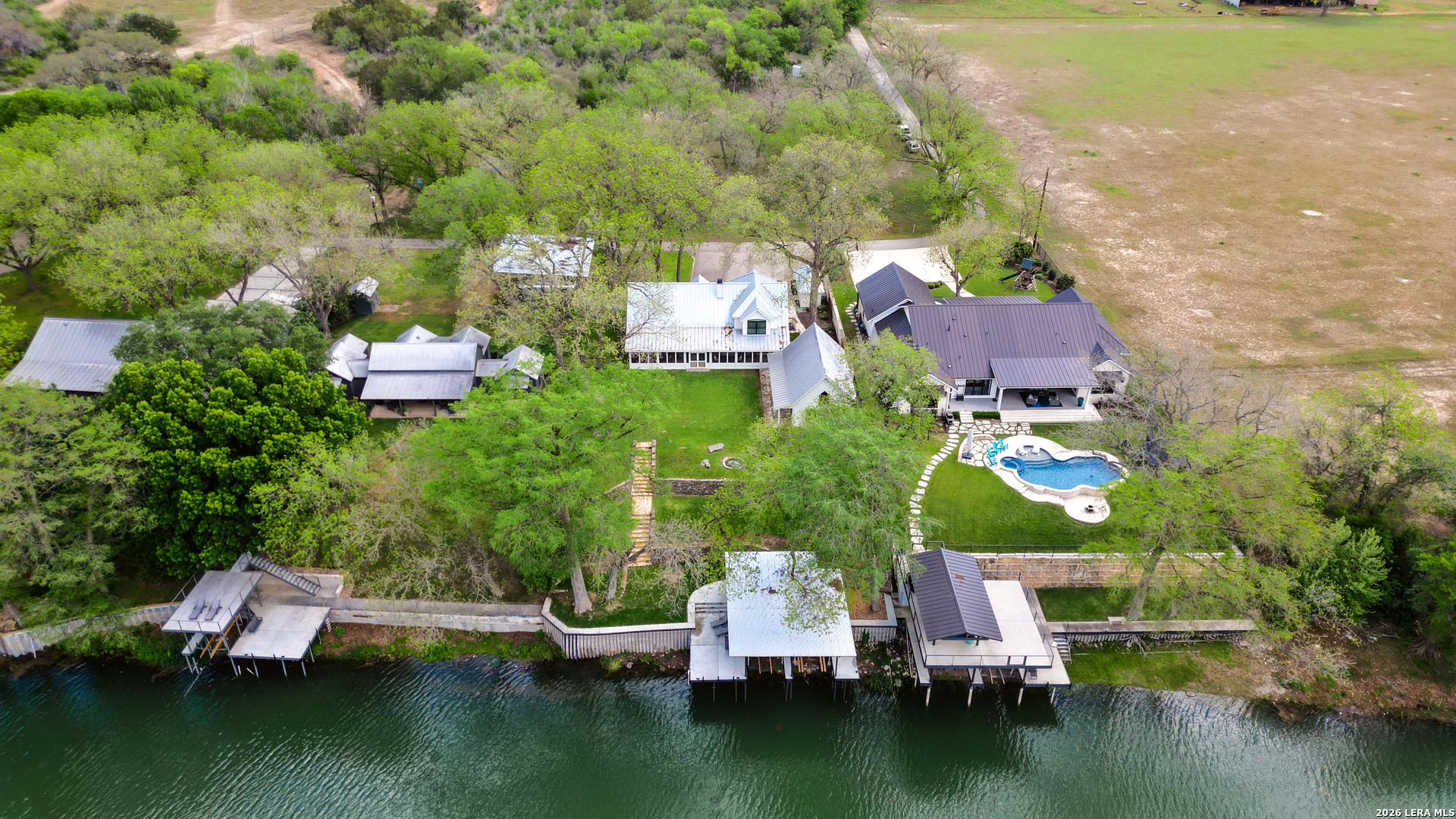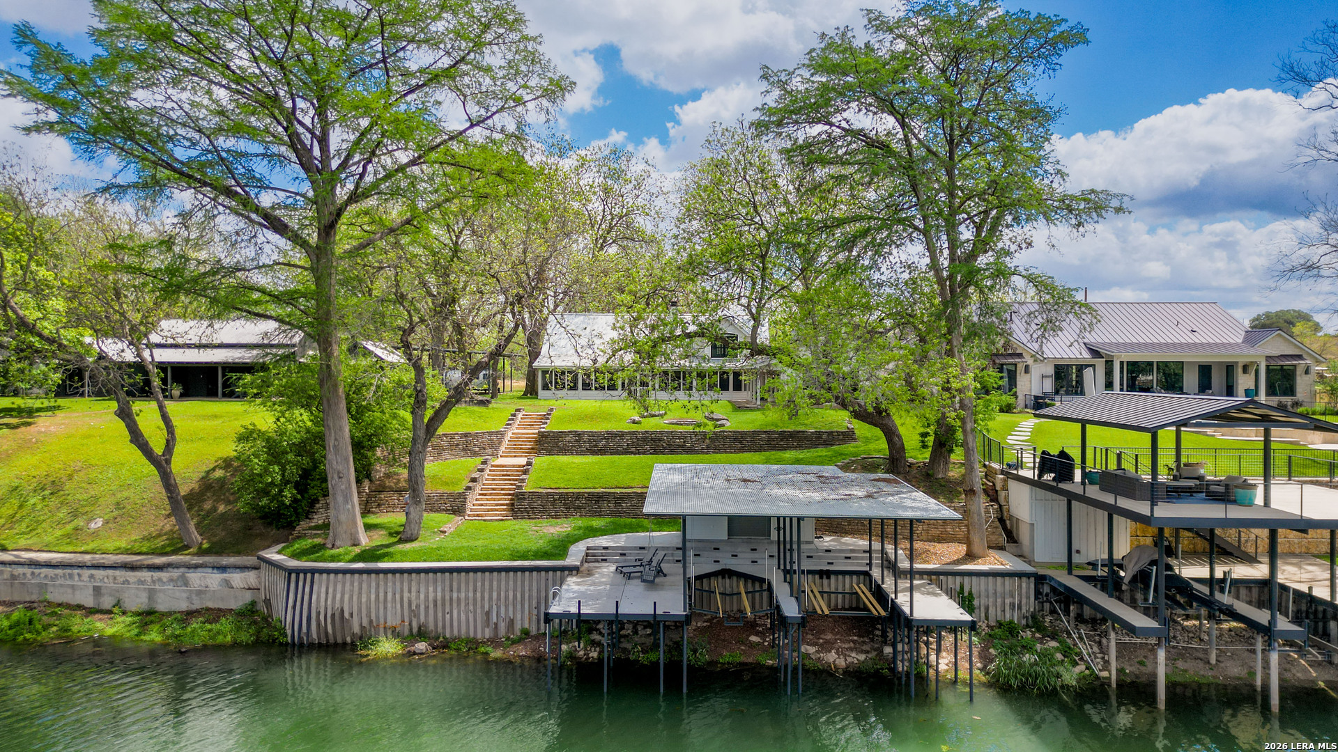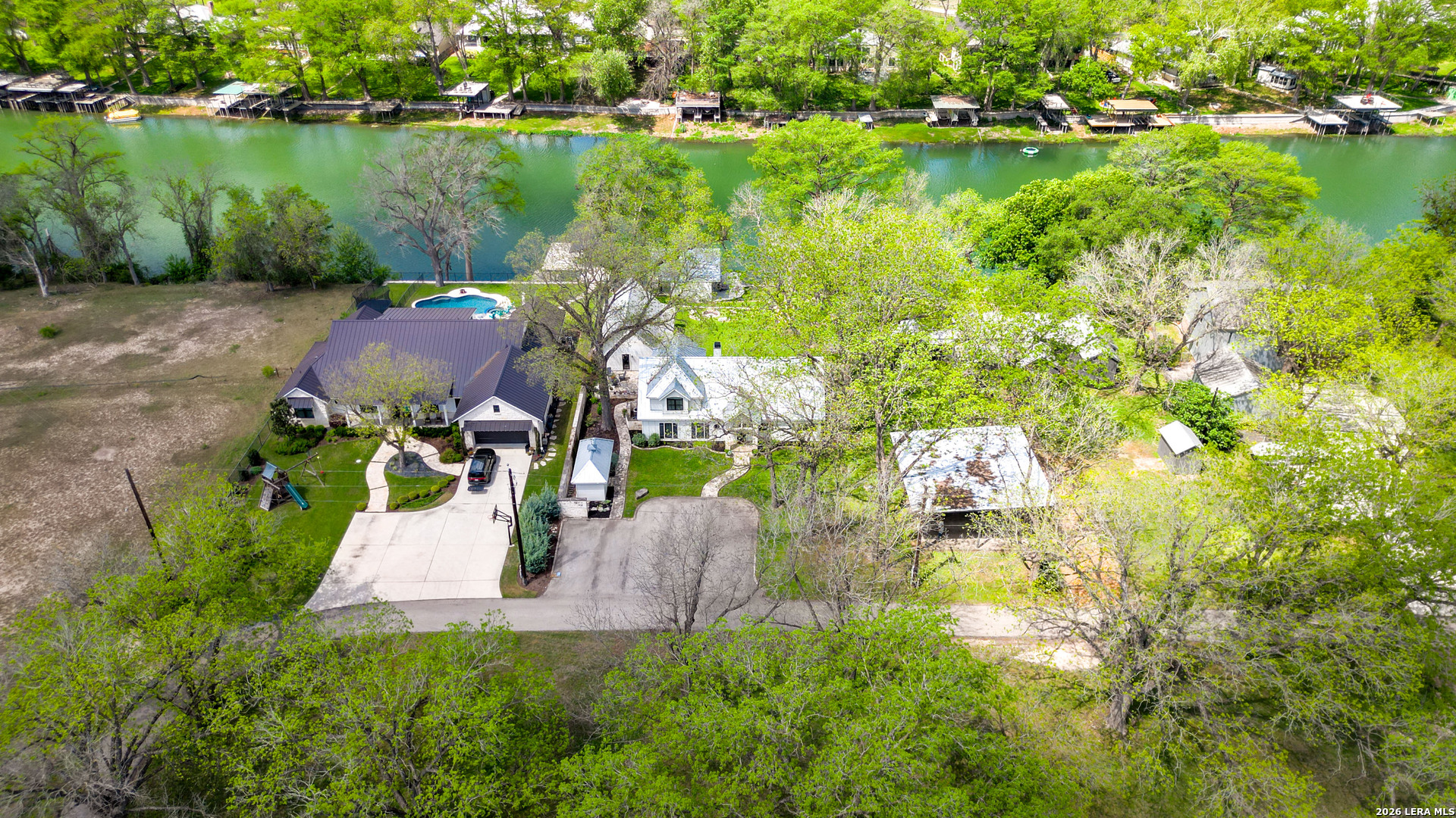 Welcome to the lake life on Lake McQueeney! This stunning lake house with a separate guest house, comes fully furnished and is located off 46, in a small gated neighborhood. The main home is 2316 sq ft, 3 bedrooms, 2.5 baths and recently renovated to include the kitchen and both bathroom renovations, updated flooring, lighting, plumbing fixtures, appliances and more! As you enter, you'll be welcomed into the large living/dining/kitchen with a vaulted shiplap ceiling, beautiful wood burning stone fireplace and 3 sets of patio doors that head out to the screened in back porch which spans the width of the house. Downstairs are 2 guest bedrooms with a jack-n-jill bath, plus a laundry space that leads to the powder bath. Upstairs over looking the main living space, you'll find a large primary suite with views of the lake plus a beautifully renovated master bathroom with an elegant claw foot tub and separate shower. Head back downstairs and out the screened in back porch to a stone patio with a built in BBQ pit and great seating space. The 892 sq ft detached casita is perfect for overflow guests with it's loft style sleeping space, a large game room for game nights, just a perfect flex space with kitchenette and full bath. New standing seam metal roof and Marvin windows in 2019, new HVAC in main house in 2020. Sprinkler system, 100 ft of waterfront on .49 AC. A new double boat house with ski storage in 2025.