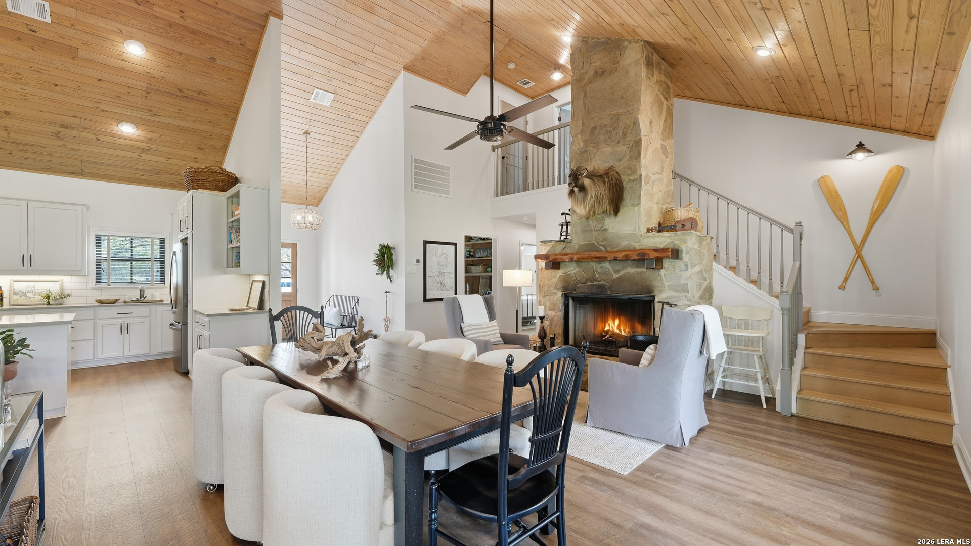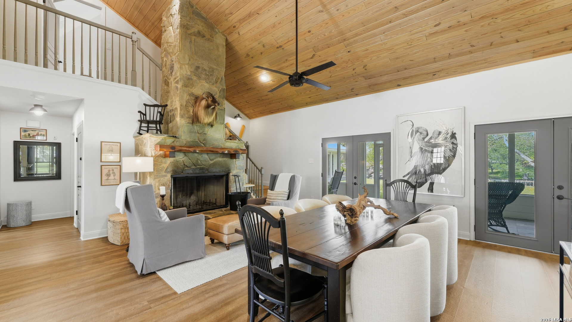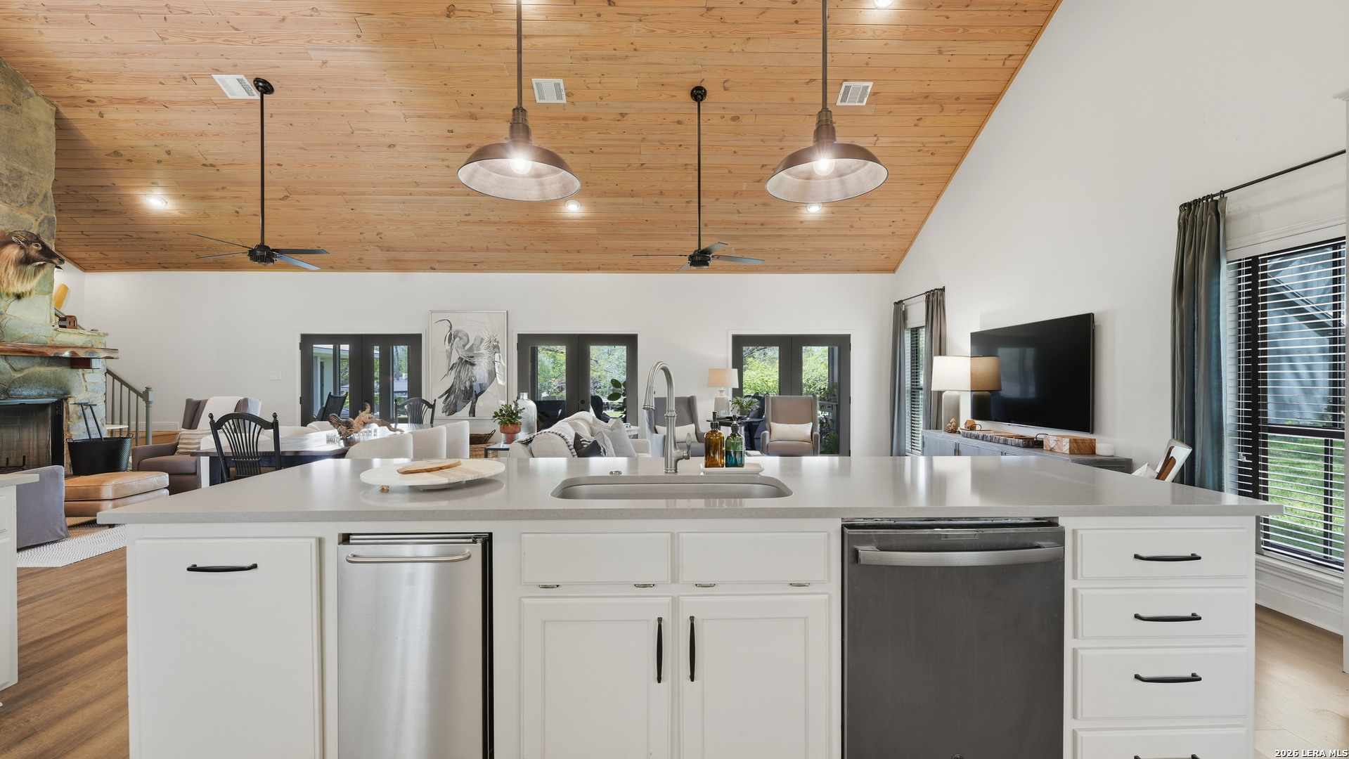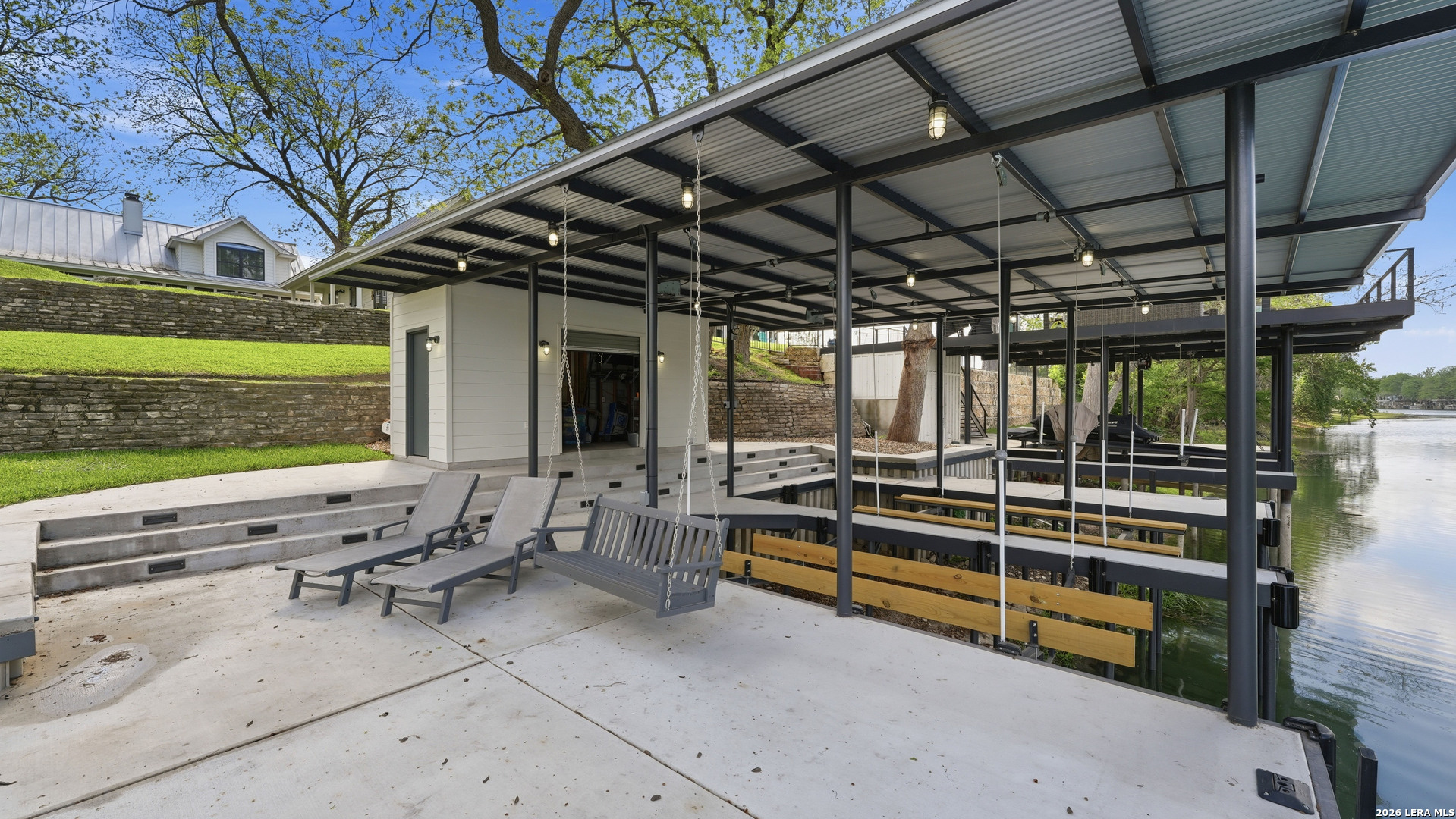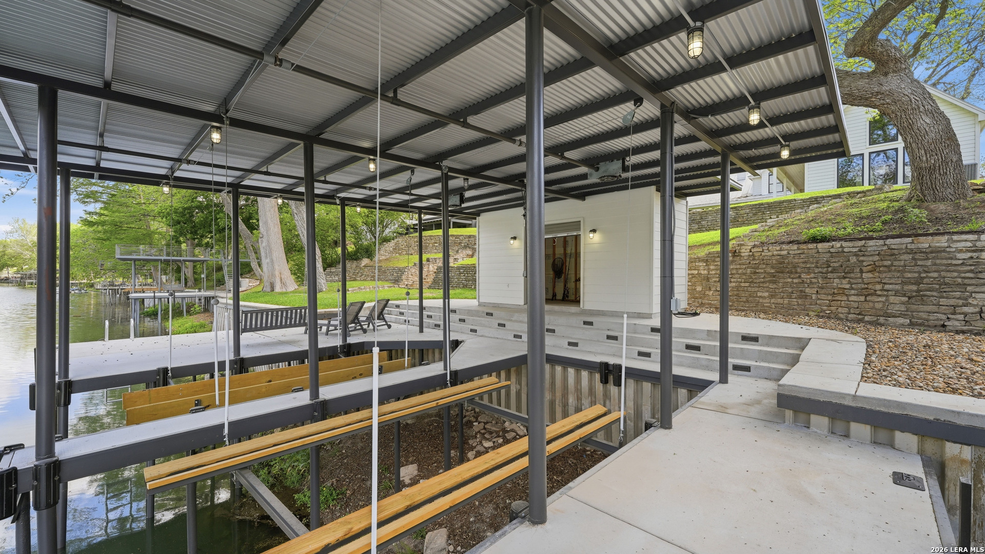 Welcome to the lake life on Lake McQueeney! This stunning lake house with a separate guest house, comes fully furnished and is located off 46, in a small gated neighborhood. The main home is 2316 sq ft, 3 bedrooms, 2.5 baths and recently renovated to include the kitchen and both bathroom renovations, updated flooring, lighting, plumbing fixtures, appliances and more! As you enter, you'll be welcomed into the large living/dining/kitchen with a vaulted shiplap ceiling, beautiful wood burning stone fireplace and 3 sets of patio doors that head out to the screened in back porch which spans the width of the house. Downstairs are 2 guest bedrooms with a jack-n-jill bath, plus a laundry space that leads to the powder bath. Upstairs over looking the main living space, you'll find a large primary suite with views of the lake plus a beautifully renovated master bathroom with an elegant claw foot tub and separate shower. Head back downstairs and out the screened in back porch to a stone patio with a built in BBQ pit and great seating space. The 892 sq ft detached casita is perfect for overflow guests with it's loft style sleeping space, a large game room for game nights, just a perfect flex space with kitchenette and full bath. New standing seam metal roof and Marvin windows in 2019, new HVAC in main house in 2020. Sprinkler system, 100 ft of waterfront on .49 AC. A new double boat house with ski storage in 2025.