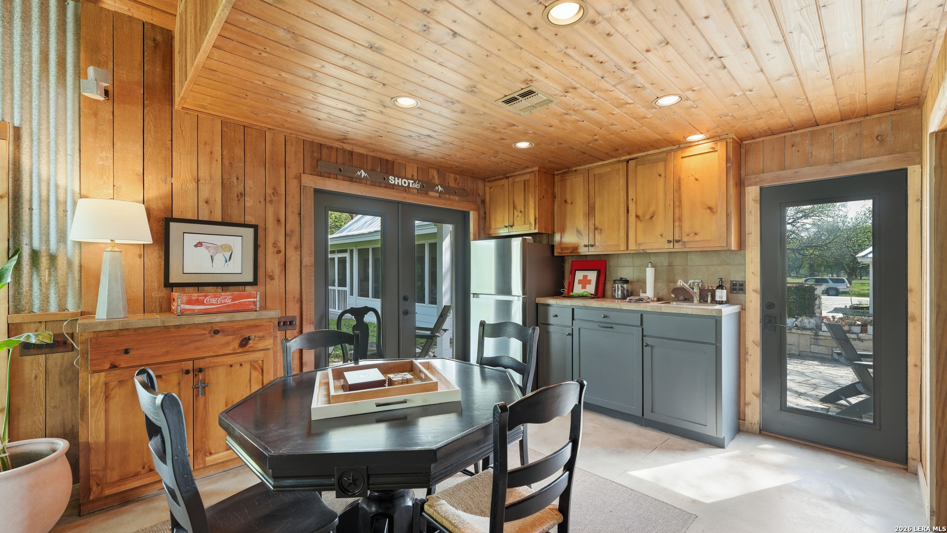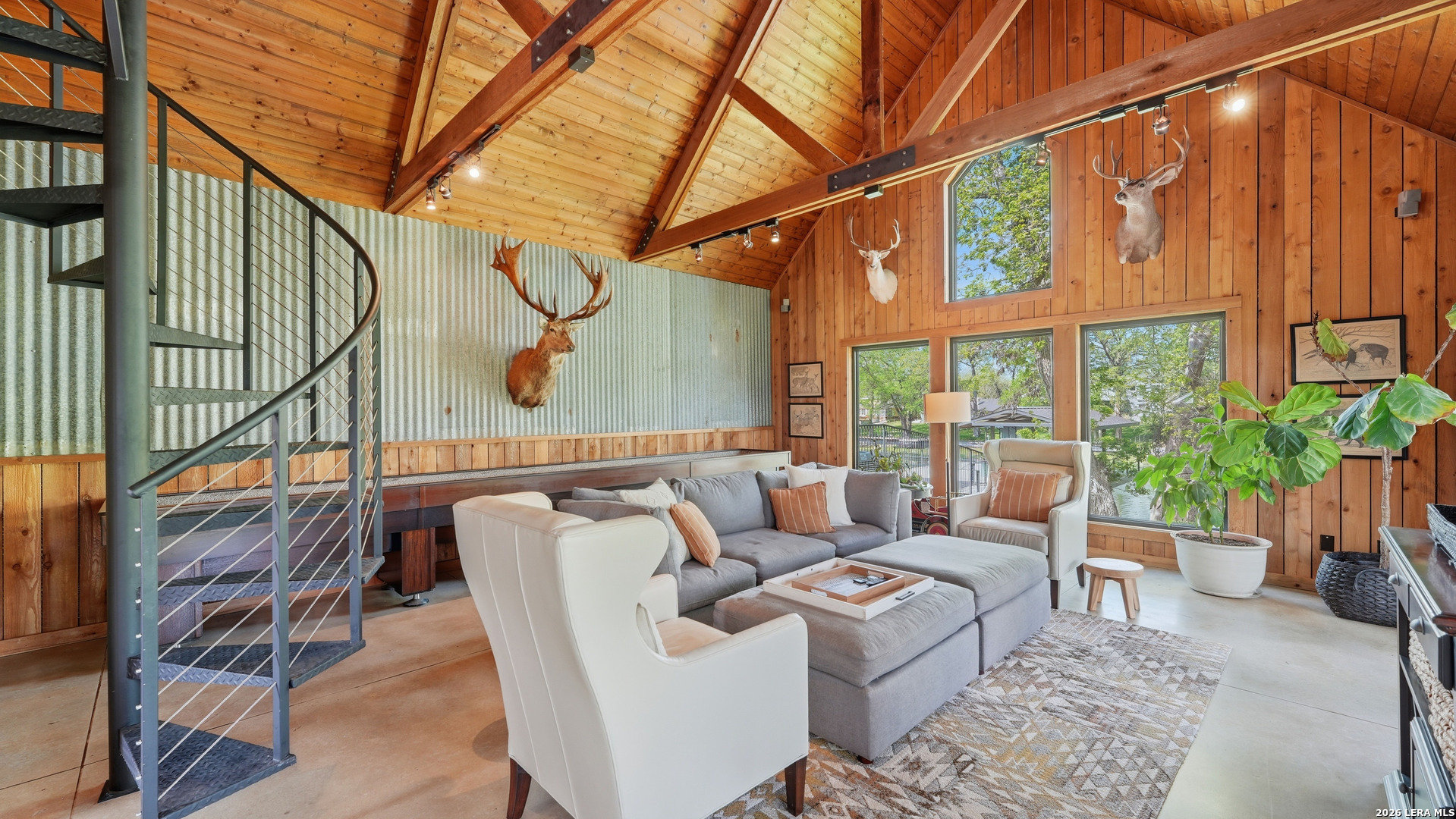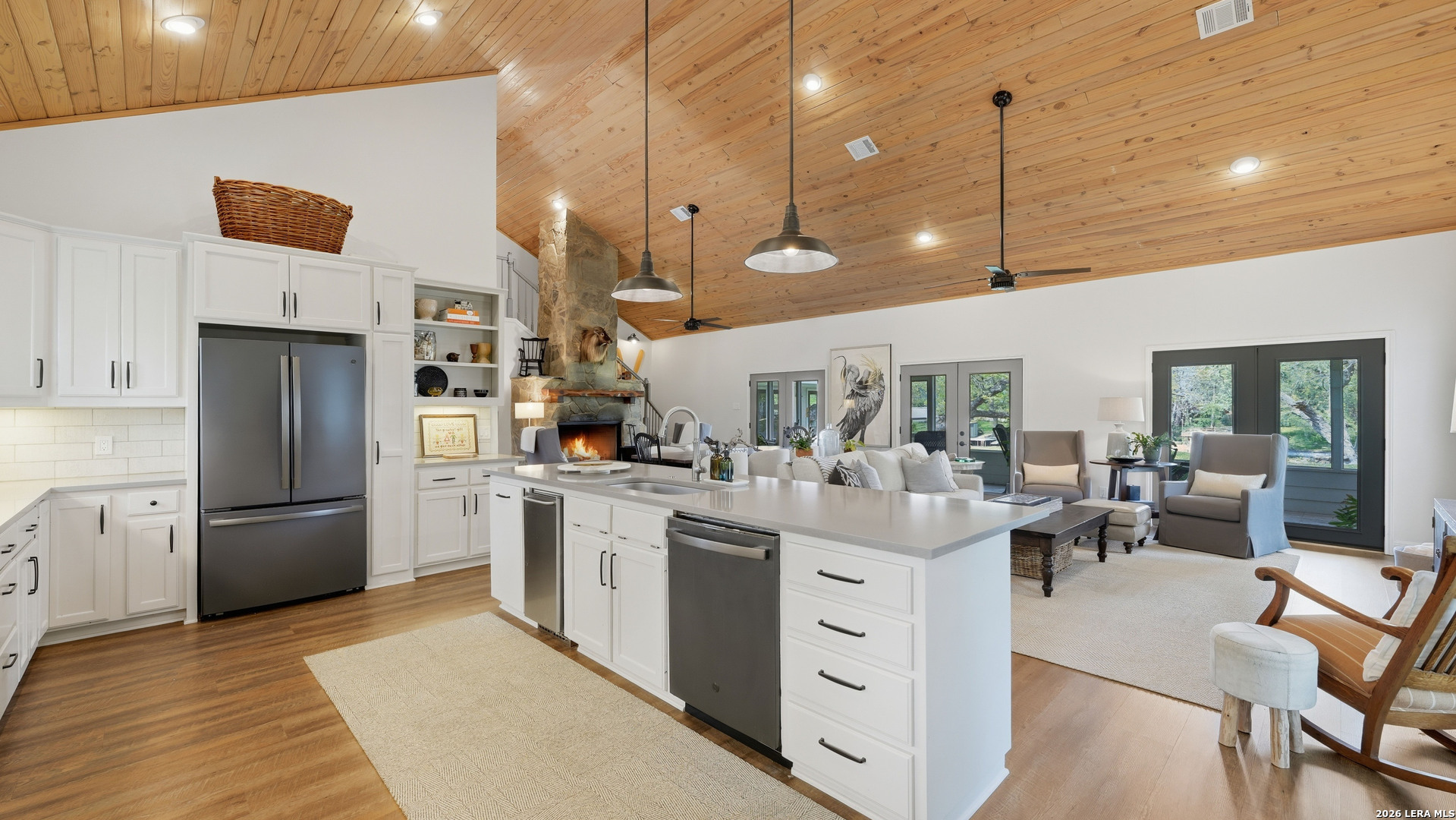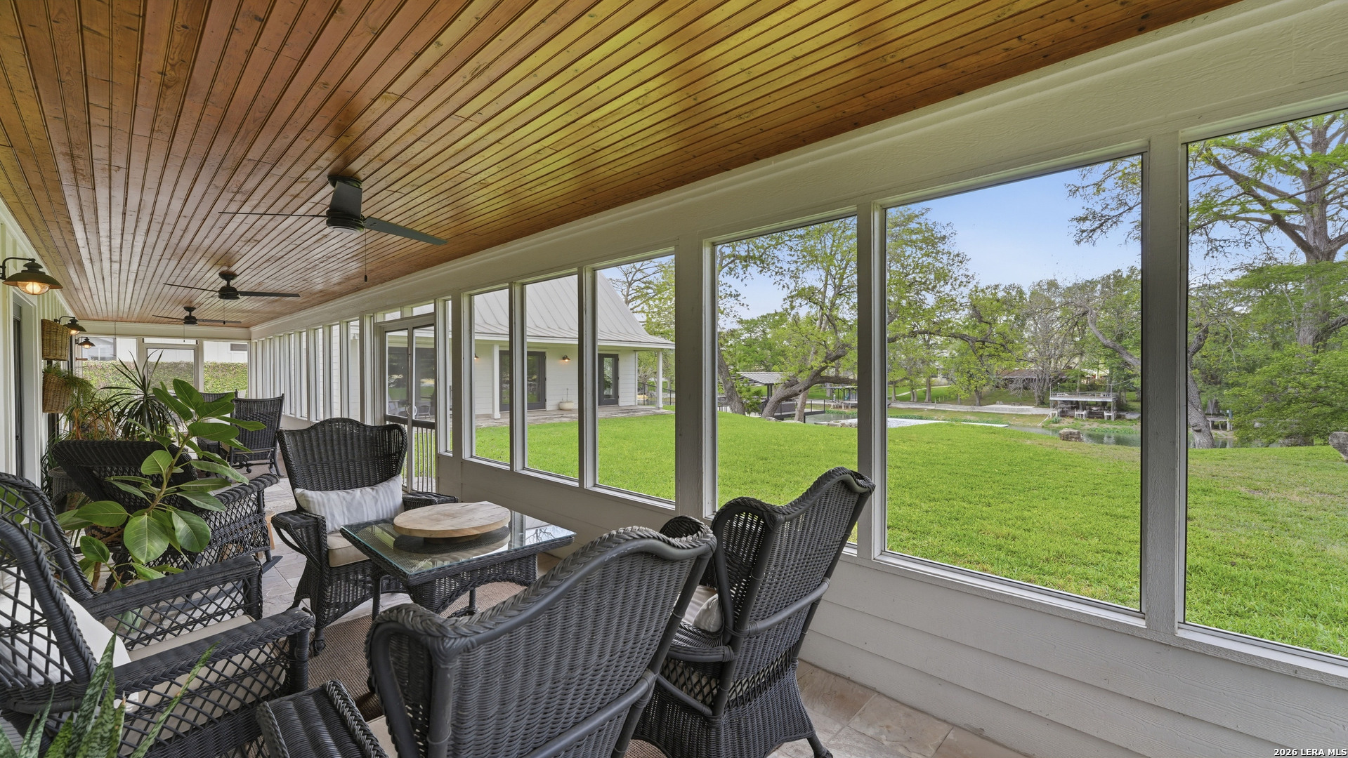 Welcome to the lake life on Lake McQueeney! This stunning lake house with a separate guest house, comes fully furnished and is located off 46, in a small gated neighborhood. The main home is 2316 sq ft, 3 bedrooms, 2.5 baths and recently renovated to include the kitchen and both bathroom renovations, updated flooring, lighting, plumbing fixtures, appliances and more! As you enter, you'll be welcomed into the large living/dining/kitchen with a vaulted shiplap ceiling, beautiful wood burning stone fireplace and 3 sets of patio doors that head out to the screened in back porch which spans the width of the house. Downstairs are 2 guest bedrooms with a jack-n-jill bath, plus a laundry space that leads to the powder bath. Upstairs over looking the main living space, you'll find a large primary suite with views of the lake plus a beautifully renovated master bathroom with an elegant claw foot tub and separate shower. Head back downstairs and out the screened in back porch to a stone patio with a built in BBQ pit and great seating space. The 892 sq ft detached casita is perfect for overflow guests with it's loft style sleeping space, a large game room for game nights, just a perfect flex space with kitchenette and full bath. New standing seam metal roof and Marvin windows in 2019, new HVAC in main house in 2020. Sprinkler system, 100 ft of waterfront on .49 AC. A new double boat house with ski storage in 2025.