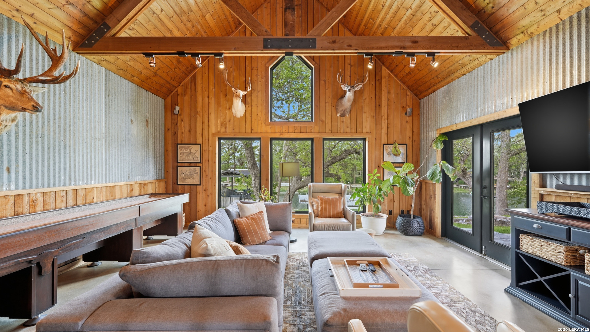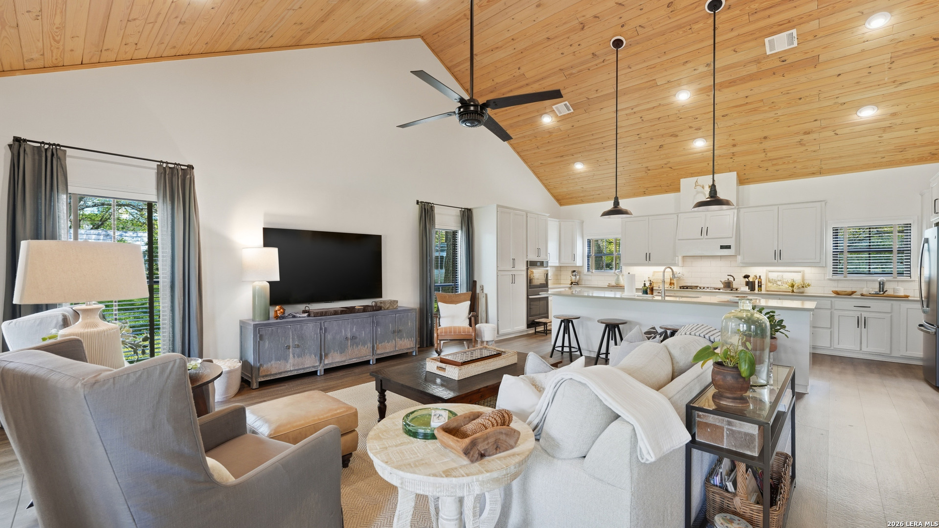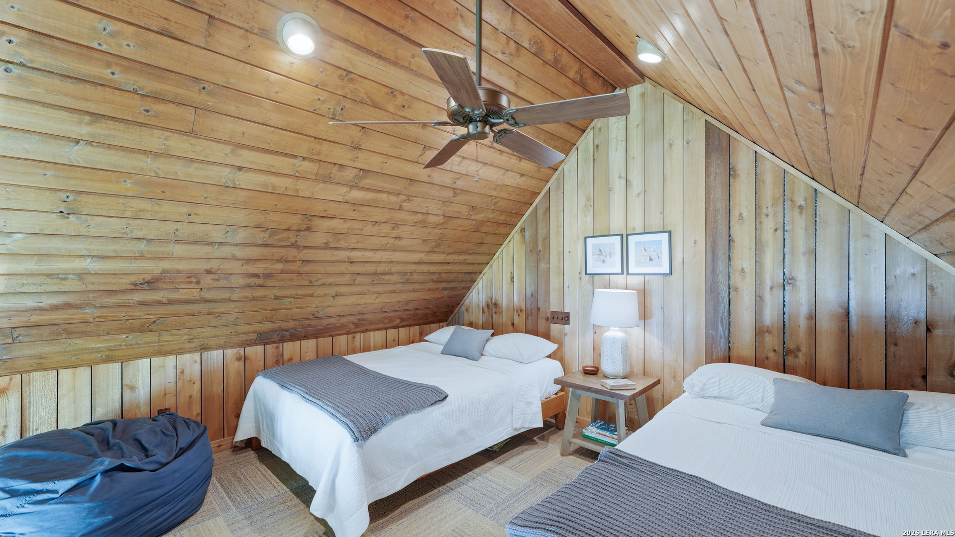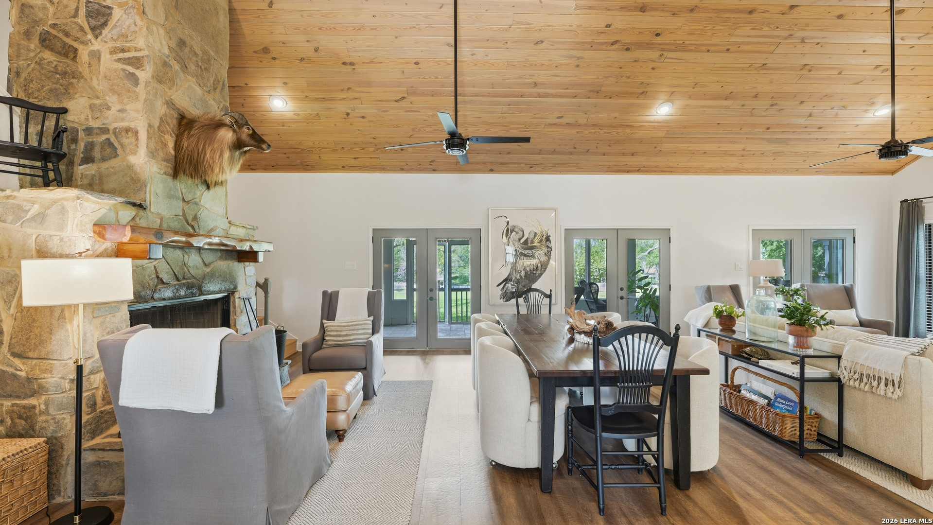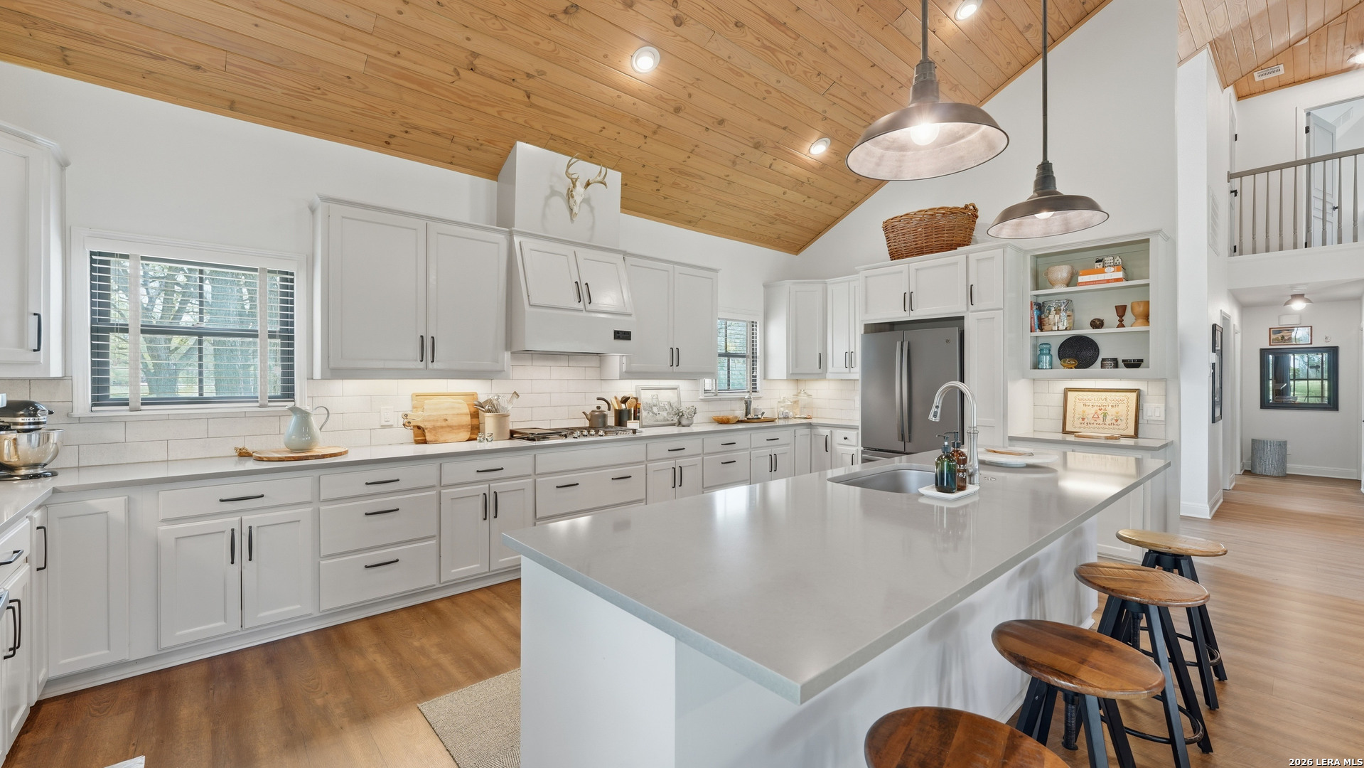 Welcome to the lake life on Lake McQueeney! This stunning lake house with a separate guest house, comes fully furnished and is located off 46, in a small gated neighborhood. The main home is 2316 sq ft, 3 bedrooms, 2.5 baths and recently renovated to include the kitchen and both bathroom renovations, updated flooring, lighting, plumbing fixtures, appliances and more! As you enter, you'll be welcomed into the large living/dining/kitchen with a vaulted shiplap ceiling, beautiful wood burning stone fireplace and 3 sets of patio doors that head out to the screened in back porch which spans the width of the house. Downstairs are 2 guest bedrooms with a jack-n-jill bath, plus a laundry space that leads to the powder bath. Upstairs over looking the main living space, you'll find a large primary suite with views of the lake plus a beautifully renovated master bathroom with an elegant claw foot tub and separate shower. Head back downstairs and out the screened in back porch to a stone patio with a built in BBQ pit and great seating space. The 892 sq ft detached casita is perfect for overflow guests with it's loft style sleeping space, a large game room for game nights, just a perfect flex space with kitchenette and full bath. New standing seam metal roof and Marvin windows in 2019, new HVAC in main house in 2020. Sprinkler system, 100 ft of waterfront on .49 AC. A new double boat house with ski storage in 2025.