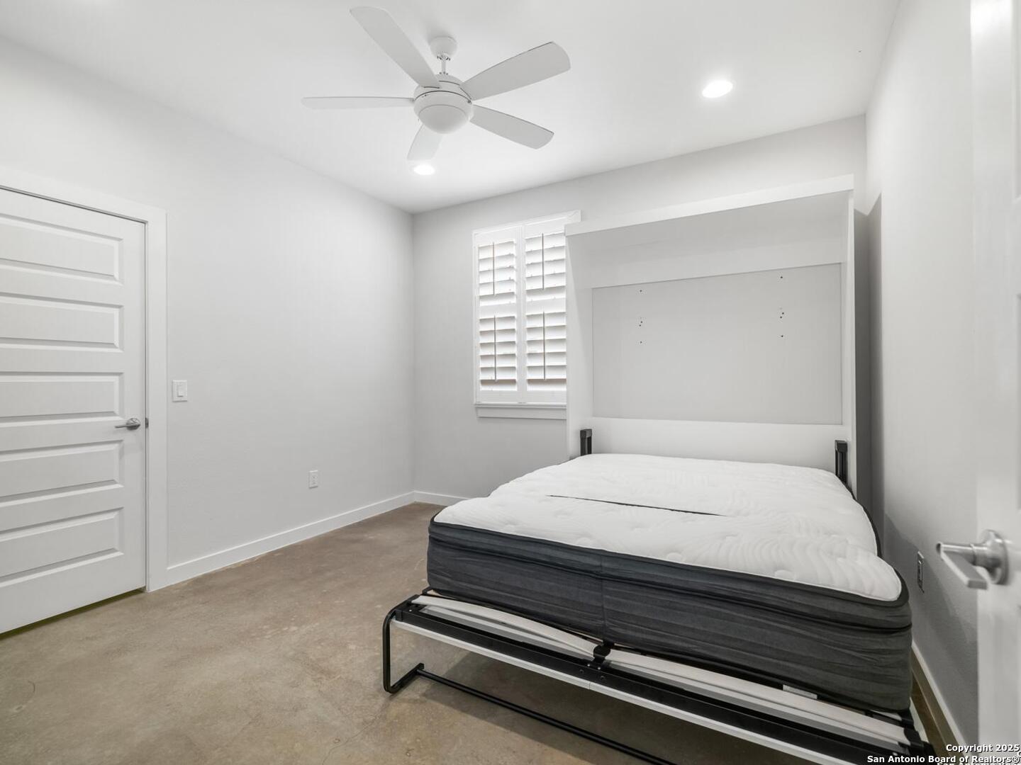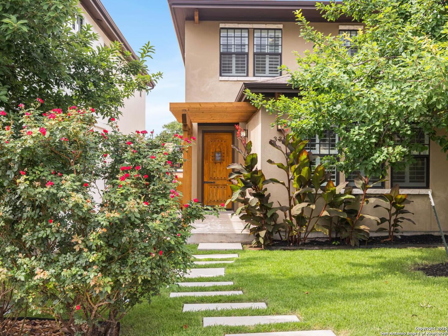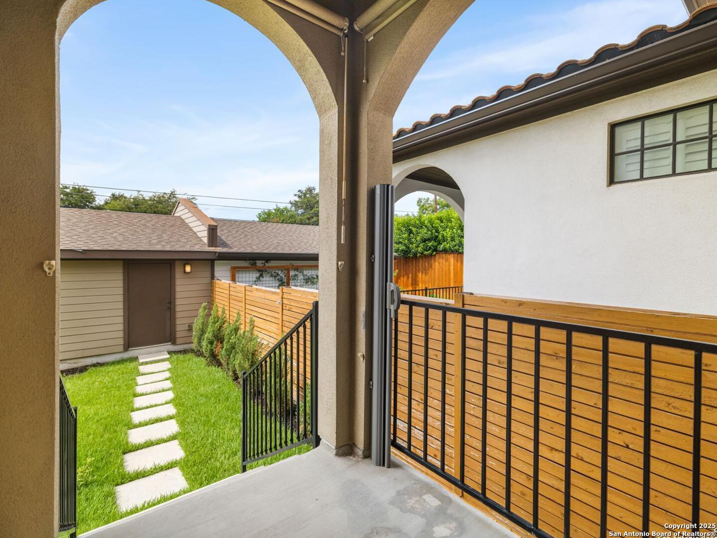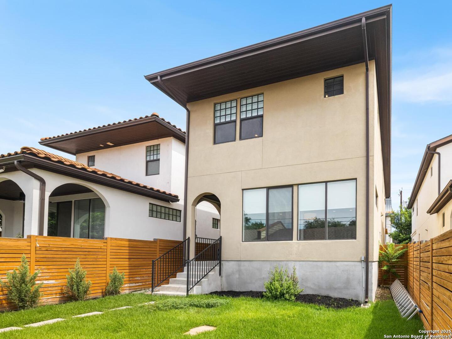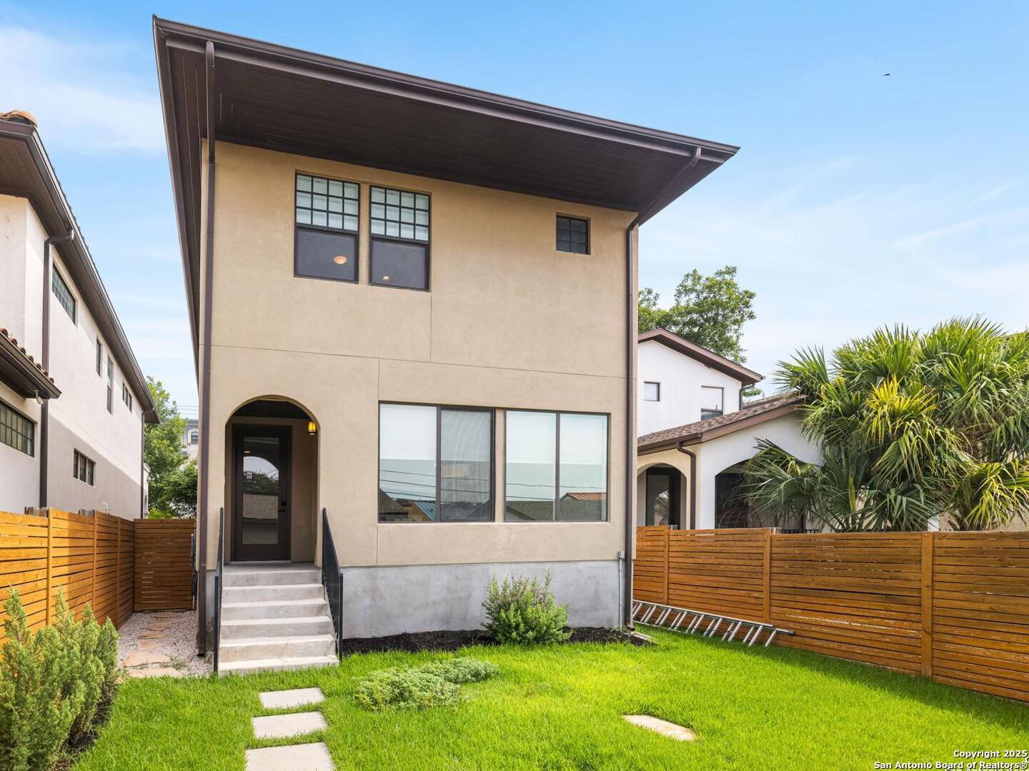 Welcome to your modern Spanish eclectic home in a prime San Antonio location, highly desirable Olmos Park! Discover the perfect blend of contemporary comfort and Spanish eclectic charm in this stunning two story home. Featuring 4 spacious bedrooms and 3 full bathrooms, this eco-friendly home is thoughtfully designed for modern living. Step inside to find a bright move in ready interior with stylish cement flooring downstairs and warm wood flooring upstairs. The main floor includes a conveniently located bedroom, with a murphy bed, perfect for guests, or home office, all electic shades and window treatments remain. Fully insulated, including exterior walls, whole house has water filter and softener, pre wired house, 2x6 framing, a smart thermostat, and 10 ft doors. Upstairs, retreat to the private bedrooms and enjoy the sleek, cohesive design throughout. The 2 car garage adds plenty of storage, and a sun shade to add comfort while working in the garage. Front yard features a apricot and a pecan tree, while the front and back yard are fully maintained every 2 wks by the HOA, along with the fence. Enjoy the unbeatable location, just minutes from downtown, with easy access to shopping, dining, and a grocery store within walking distance. Don't miss this opportunity to own a unique and beautifully maintained home in one of San Antonio's most accessible neighborhoods. This is the largest floor plan in the HOA!!