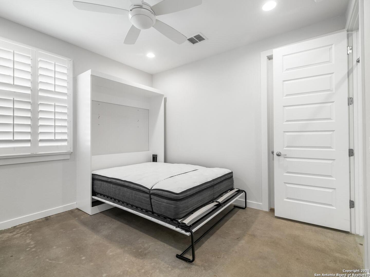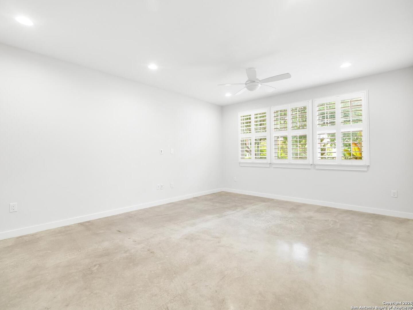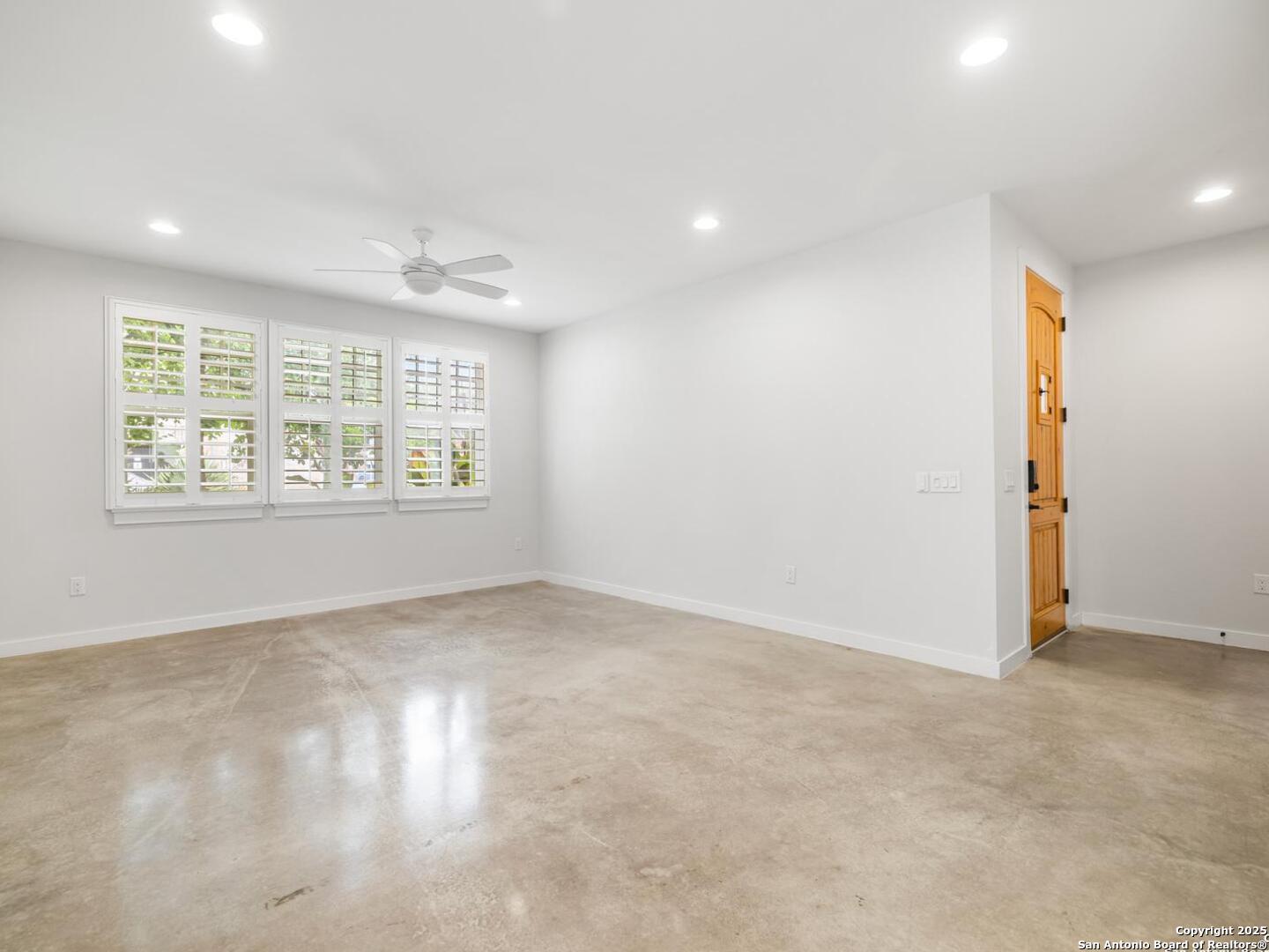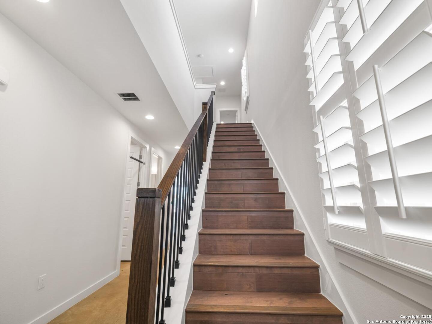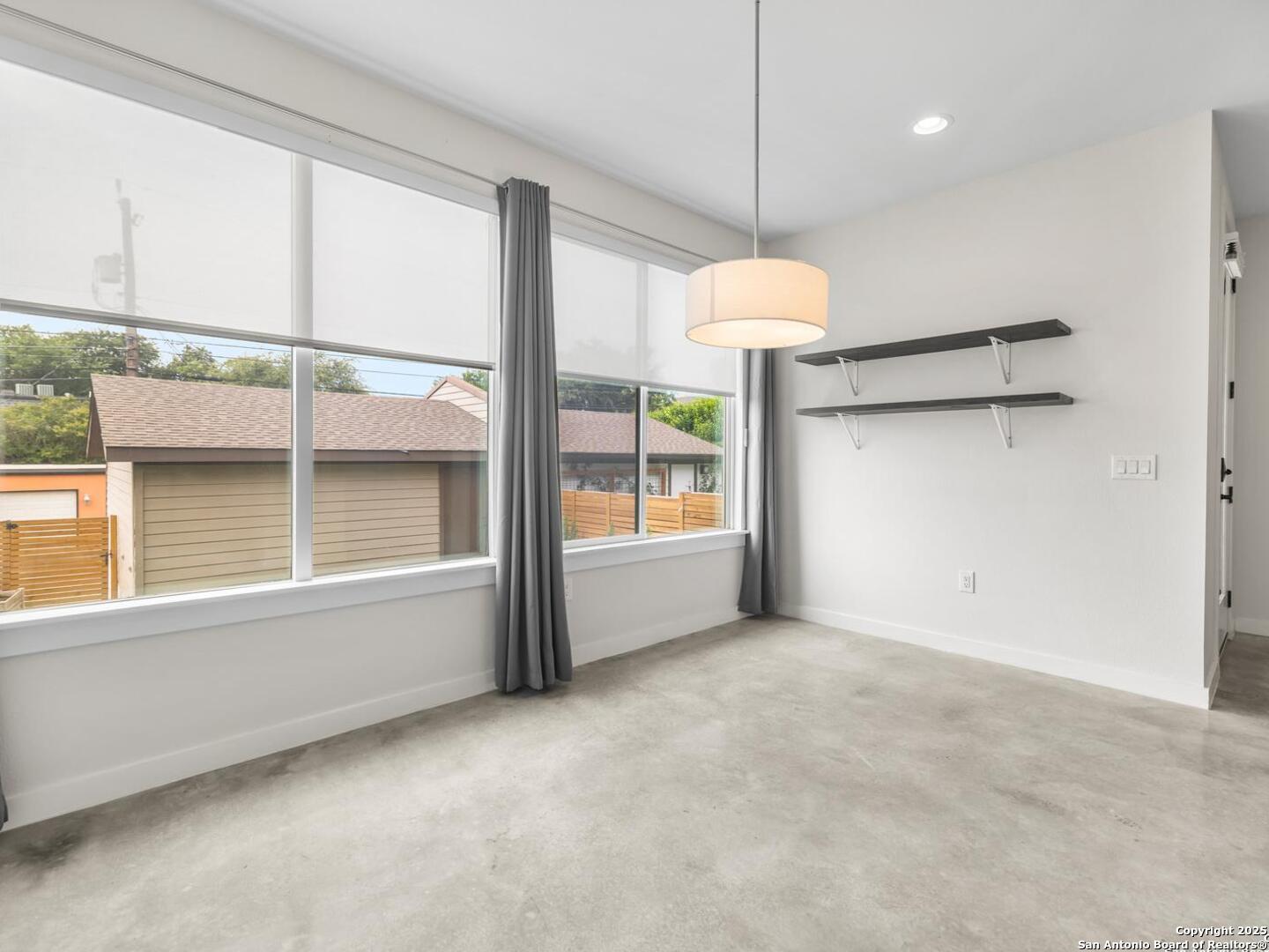 Welcome to your modern Spanish eclectic home in a prime San Antonio location, highly desirable Olmos Park! Discover the perfect blend of contemporary comfort and Spanish eclectic charm in this stunning two story home. Featuring 4 spacious bedrooms and 3 full bathrooms, this eco-friendly home is thoughtfully designed for modern living. Step inside to find a bright move in ready interior with stylish cement flooring downstairs and warm wood flooring upstairs. The main floor includes a conveniently located bedroom, with a murphy bed, perfect for guests, or home office, all electic shades and window treatments remain. Fully insulated, including exterior walls, whole house has water filter and softener, pre wired house, 2x6 framing, a smart thermostat, and 10 ft doors. Upstairs, retreat to the private bedrooms and enjoy the sleek, cohesive design throughout. The 2 car garage adds plenty of storage, and a sun shade to add comfort while working in the garage. Front yard features a apricot and a pecan tree, while the front and back yard are fully maintained every 2 wks by the HOA, along with the fence. Enjoy the unbeatable location, just minutes from downtown, with easy access to shopping, dining, and a grocery store within walking distance. Don't miss this opportunity to own a unique and beautifully maintained home in one of San Antonio's most accessible neighborhoods. This is the largest floor plan in the HOA!!
