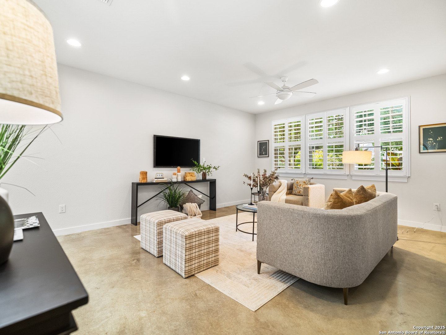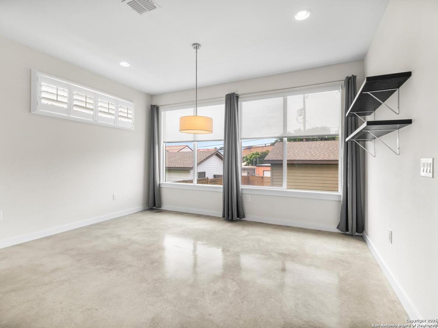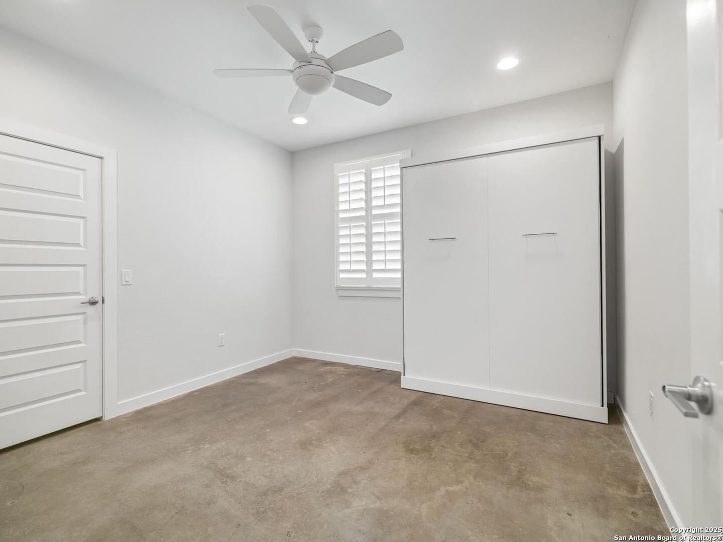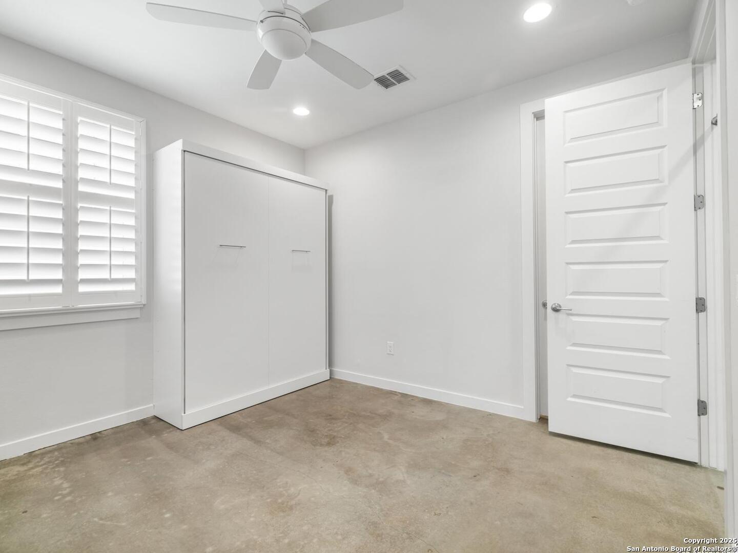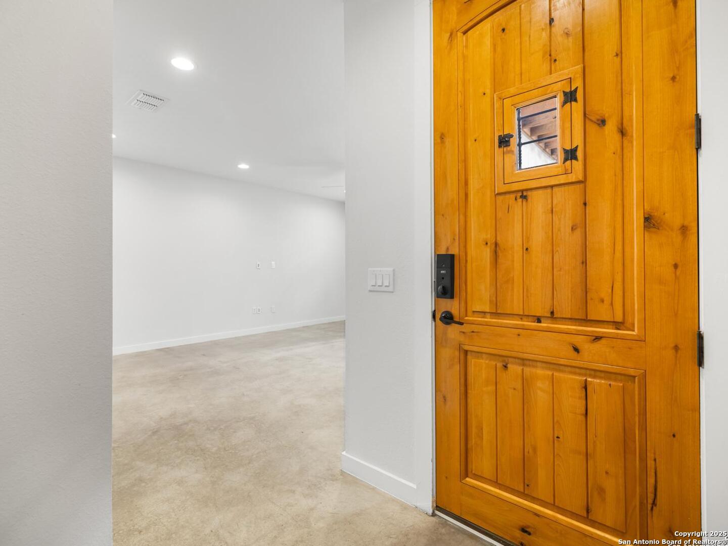 Welcome to your modern Spanish eclectic home in a prime San Antonio location, highly desirable Olmos Park! Discover the perfect blend of contemporary comfort and Spanish eclectic charm in this stunning two story home. Featuring 4 spacious bedrooms and 3 full bathrooms, this eco-friendly home is thoughtfully designed for modern living. Step inside to find a bright move in ready interior with stylish cement flooring downstairs and warm wood flooring upstairs. The main floor includes a conveniently located bedroom, with a murphy bed, perfect for guests, or home office, all electic shades and window treatments remain. Fully insulated, including exterior walls, whole house has water filter and softener, pre wired house, 2x6 framing, a smart thermostat, and 10 ft doors. Upstairs, retreat to the private bedrooms and enjoy the sleek, cohesive design throughout. The 2 car garage adds plenty of storage, and a sun shade to add comfort while working in the garage. Front yard features a apricot and a pecan tree, while the front and back yard are fully maintained every 2 wks by the HOA, along with the fence. Enjoy the unbeatable location, just minutes from downtown, with easy access to shopping, dining, and a grocery store within walking distance. Don't miss this opportunity to own a unique and beautifully maintained home in one of San Antonio's most accessible neighborhoods. This is the largest floor plan in the HOA!!