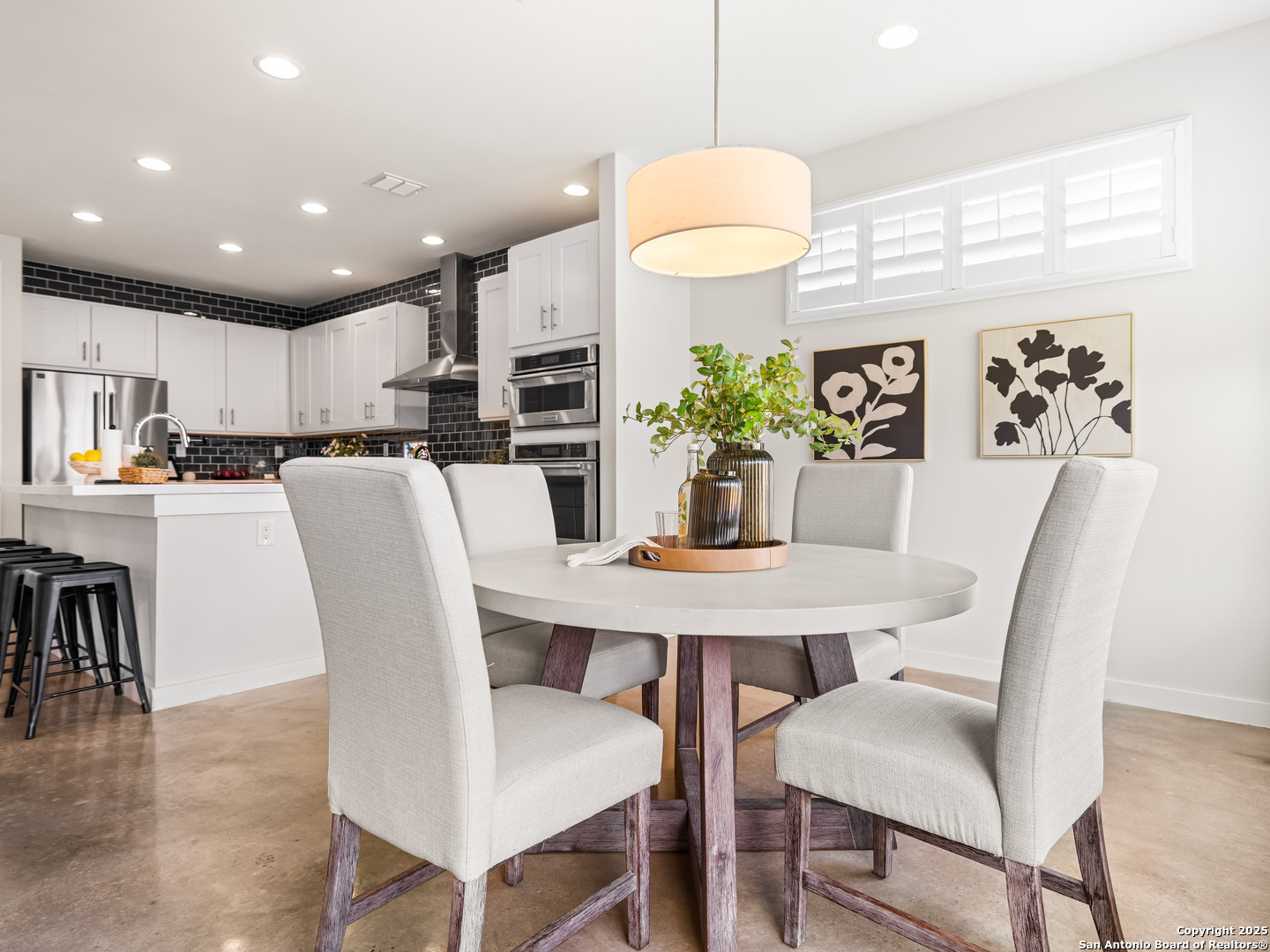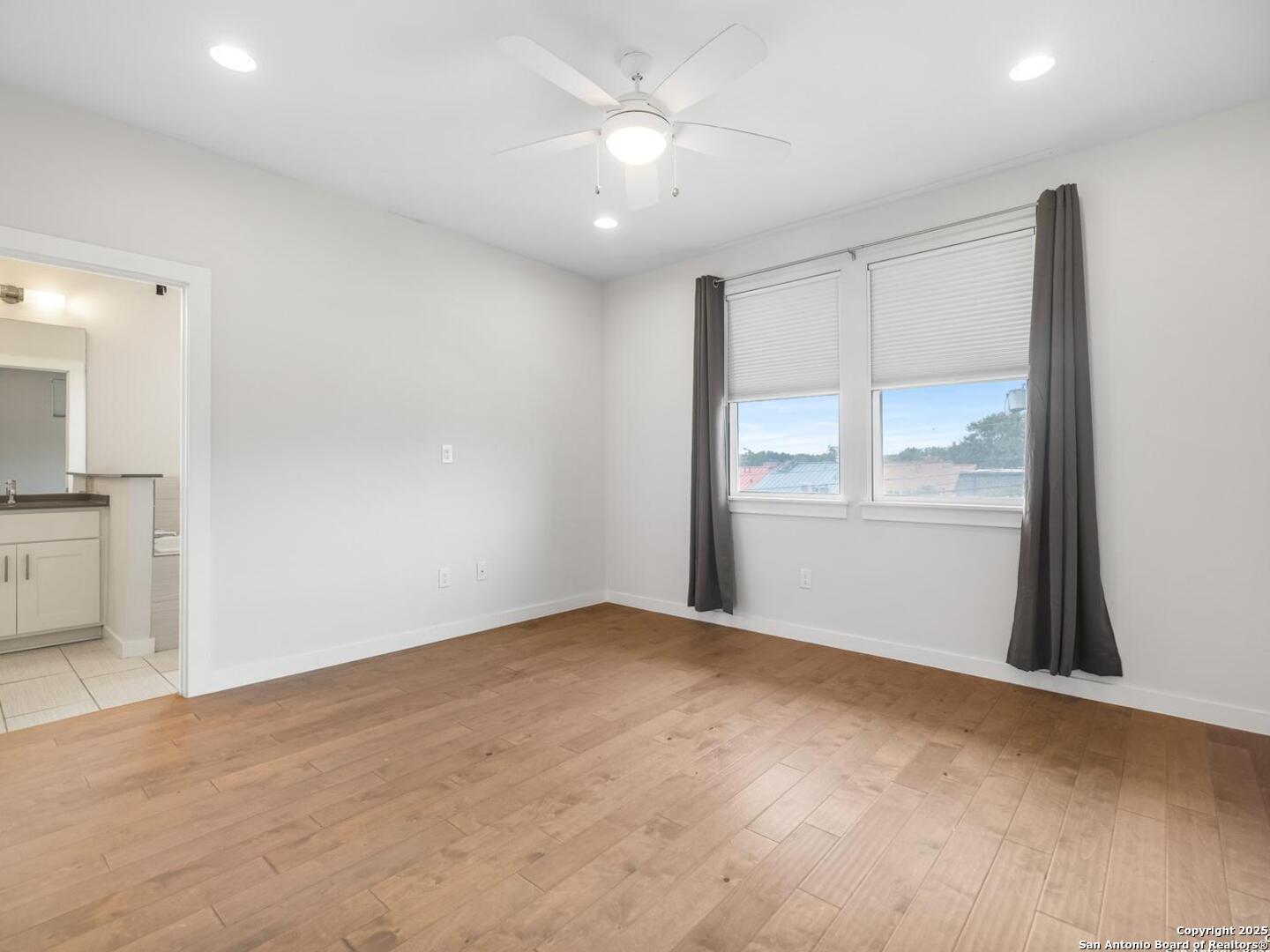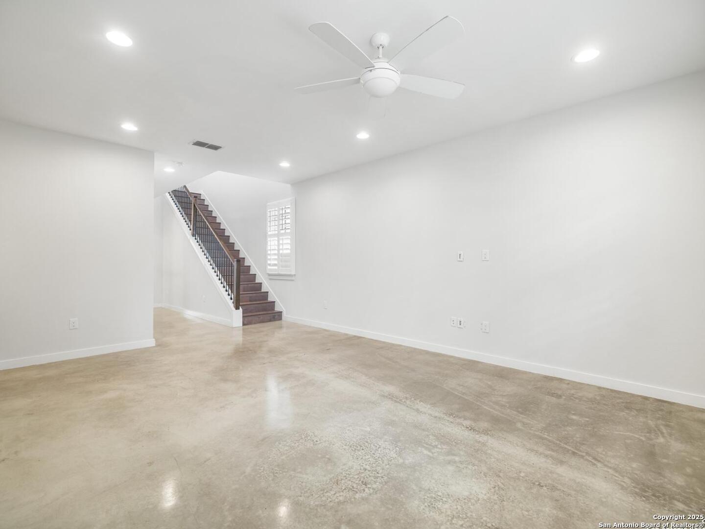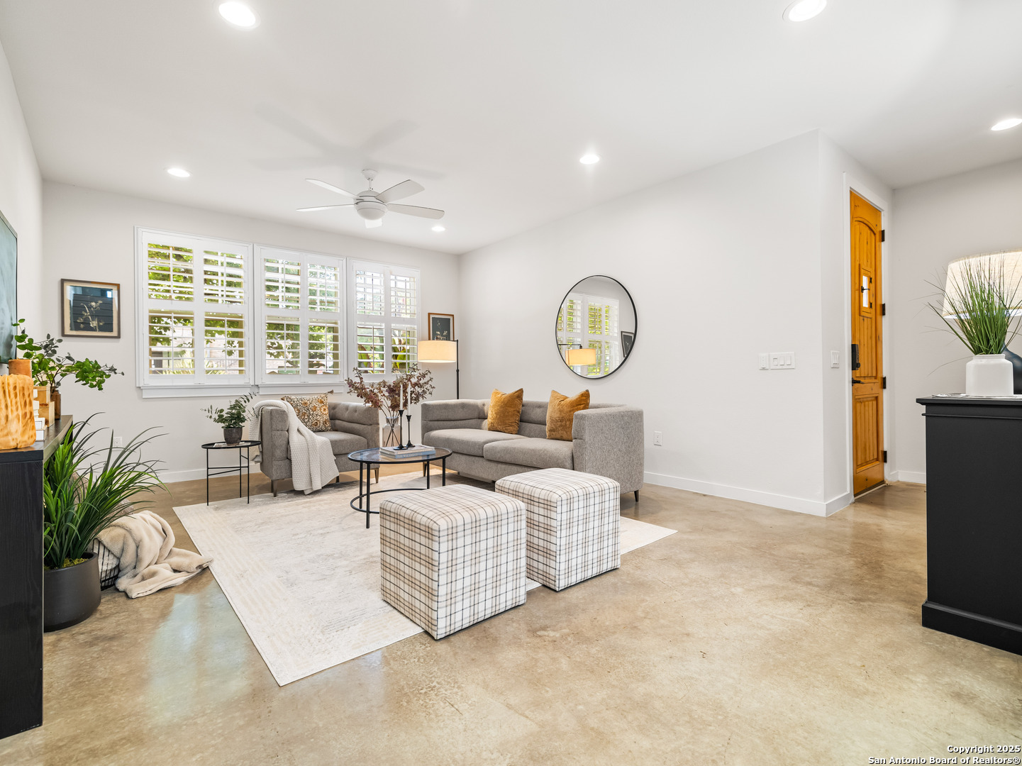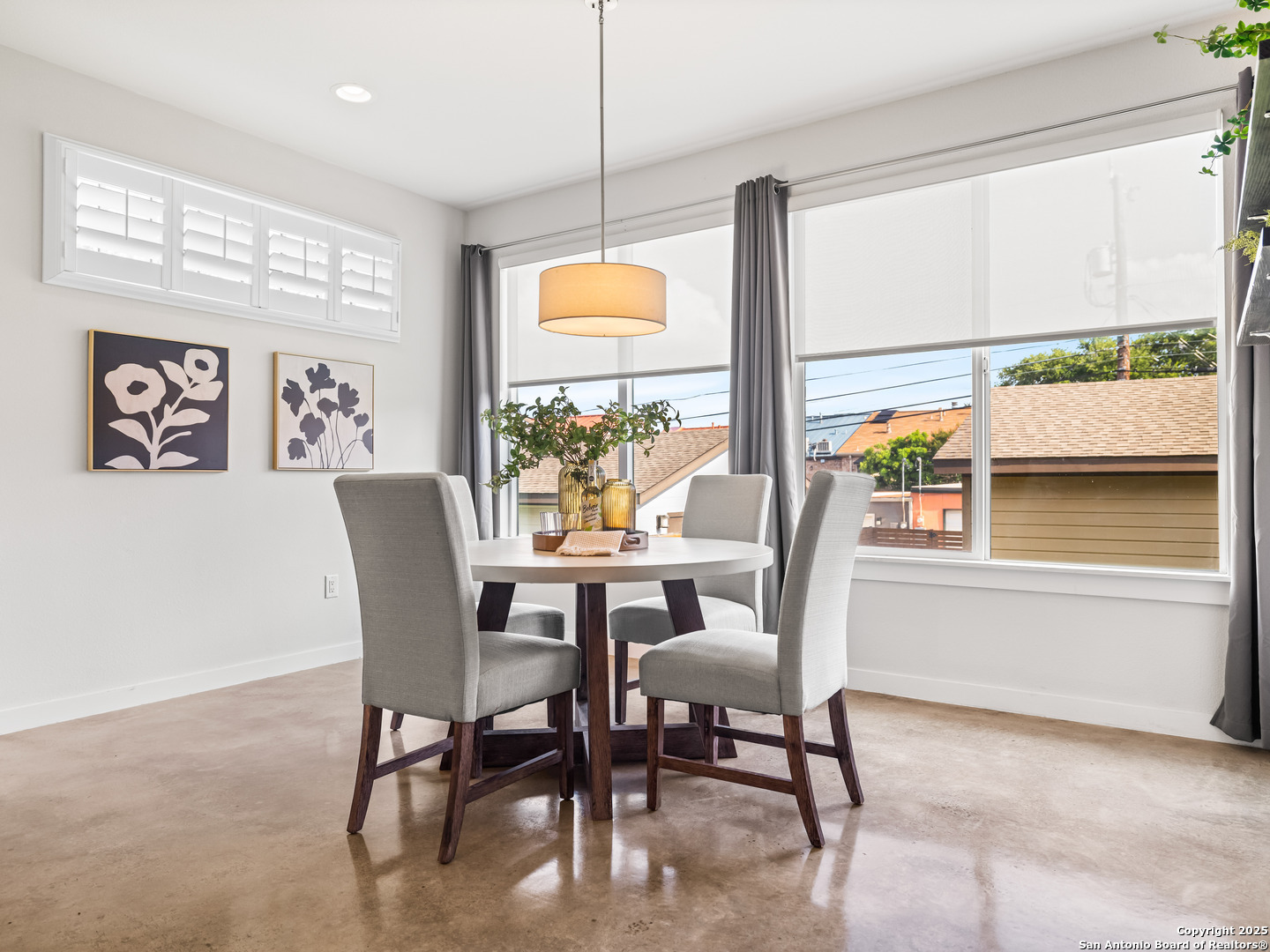 Welcome to your modern Spanish eclectic home in a prime San Antonio location, highly desirable Olmos Park! Discover the perfect blend of contemporary comfort and Spanish eclectic charm in this stunning two story home. Featuring 4 spacious bedrooms and 3 full bathrooms, this eco-friendly home is thoughtfully designed for modern living. Step inside to find a bright move in ready interior with stylish cement flooring downstairs and warm wood flooring upstairs. The main floor includes a conveniently located bedroom, with a murphy bed, perfect for guests, or home office, all electic shades and window treatments remain. Fully insulated, including exterior walls, whole house has water filter and softener, pre wired house, 2x6 framing, a smart thermostat, and 10 ft doors. Upstairs, retreat to the private bedrooms and enjoy the sleek, cohesive design throughout. The 2 car garage adds plenty of storage, and a sun shade to add comfort while working in the garage. Front yard features a apricot and a pecan tree, while the front and back yard are fully maintained every 2 wks by the HOA, along with the fence. Enjoy the unbeatable location, just minutes from downtown, with easy access to shopping, dining, and a grocery store within walking distance. Don't miss this opportunity to own a unique and beautifully maintained home in one of San Antonio's most accessible neighborhoods. This is the largest floor plan in the HOA!!