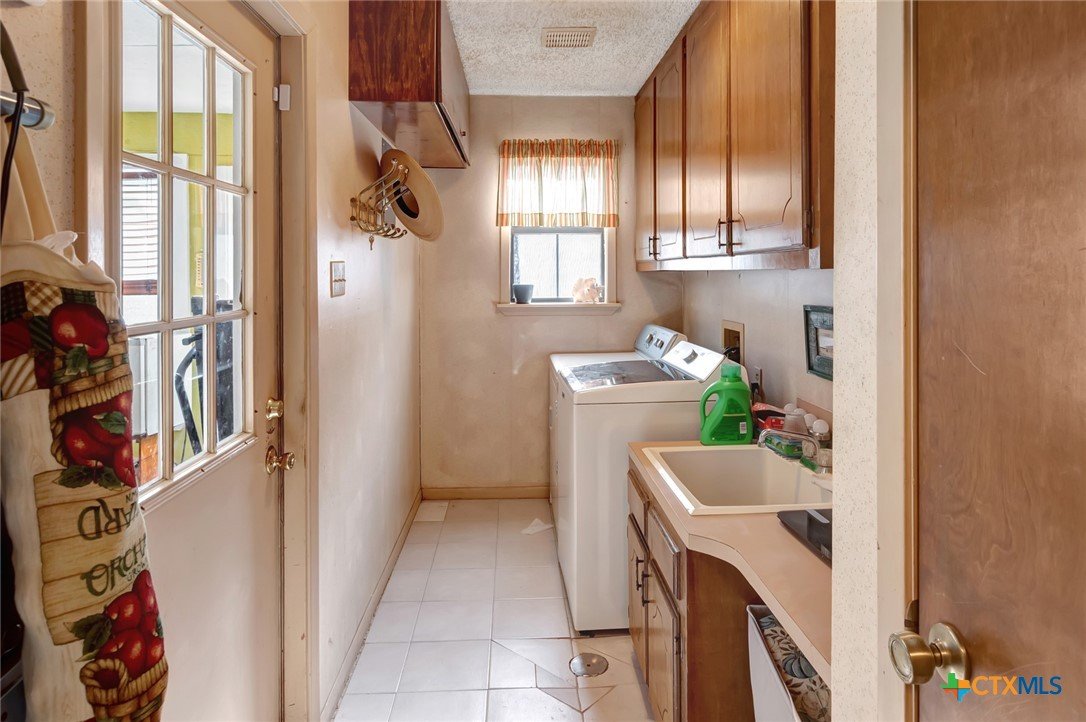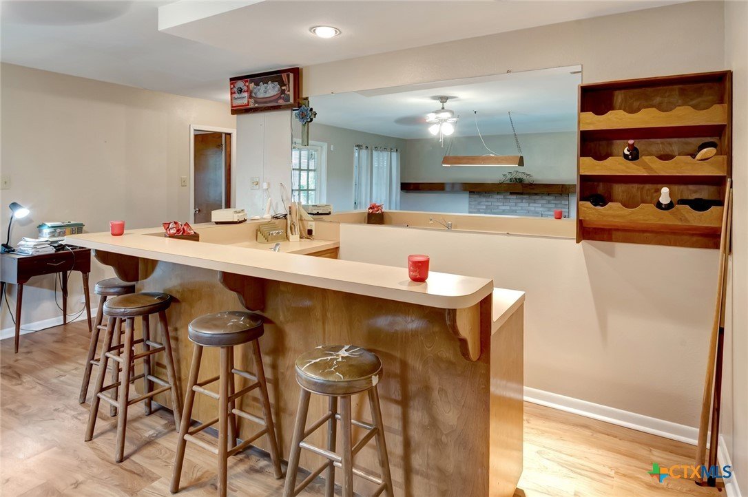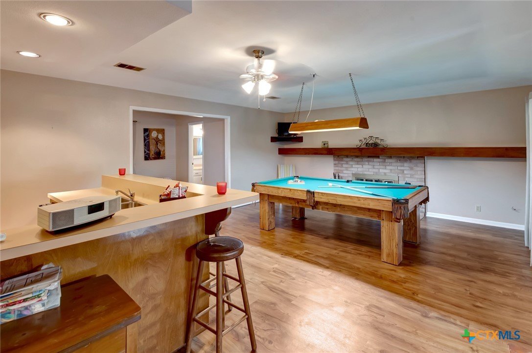 This wonderful home, originally constructed in 1962, underwent subsequent renovations and expansions. The garage has been transformed into an additional room, featuring a captivating fireplace for ultimate comfort. This space can serve as an additional living area or, as currently configured, as a bedroom. The expansion of the home extends beyond the kitchen and dining room, encompassing an indoor laundry room, a spacious open game room/living room with a fully equipped wet bar, sink, and storage, and a second fireplace. Additionally, there is a smaller living/lounging area and a second bathroom. A large, enclosed sunroom with a compact air conditioning unit is also present. Outback, paved sidewalks facilitate easy lawn care and other outdoor amenities. A fire pit is situated on a covered concrete deck, and a storage building is available for storage purposes.