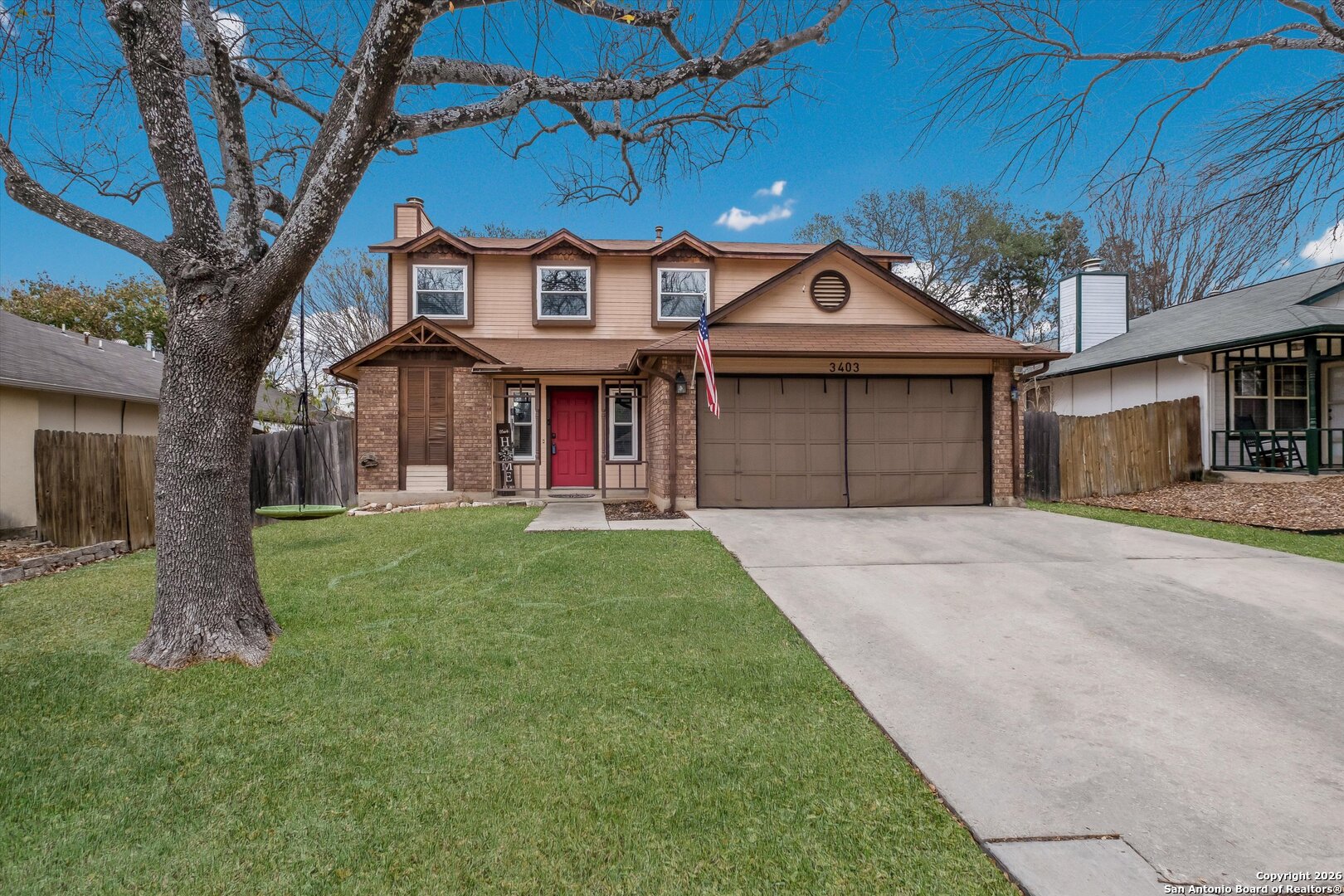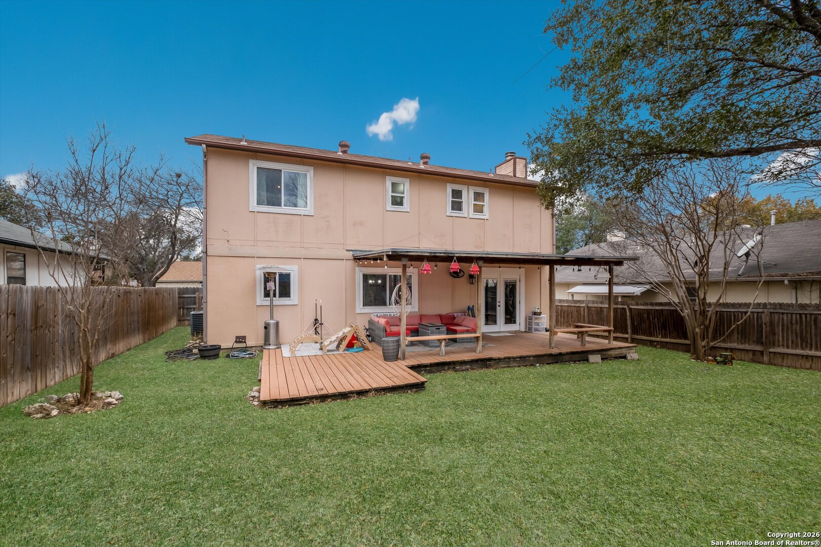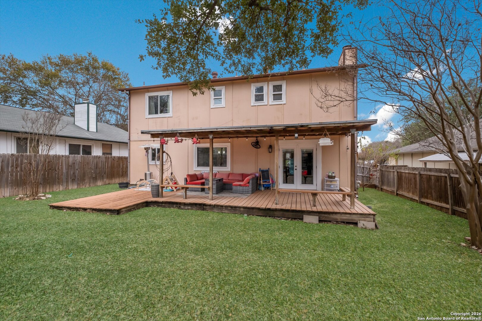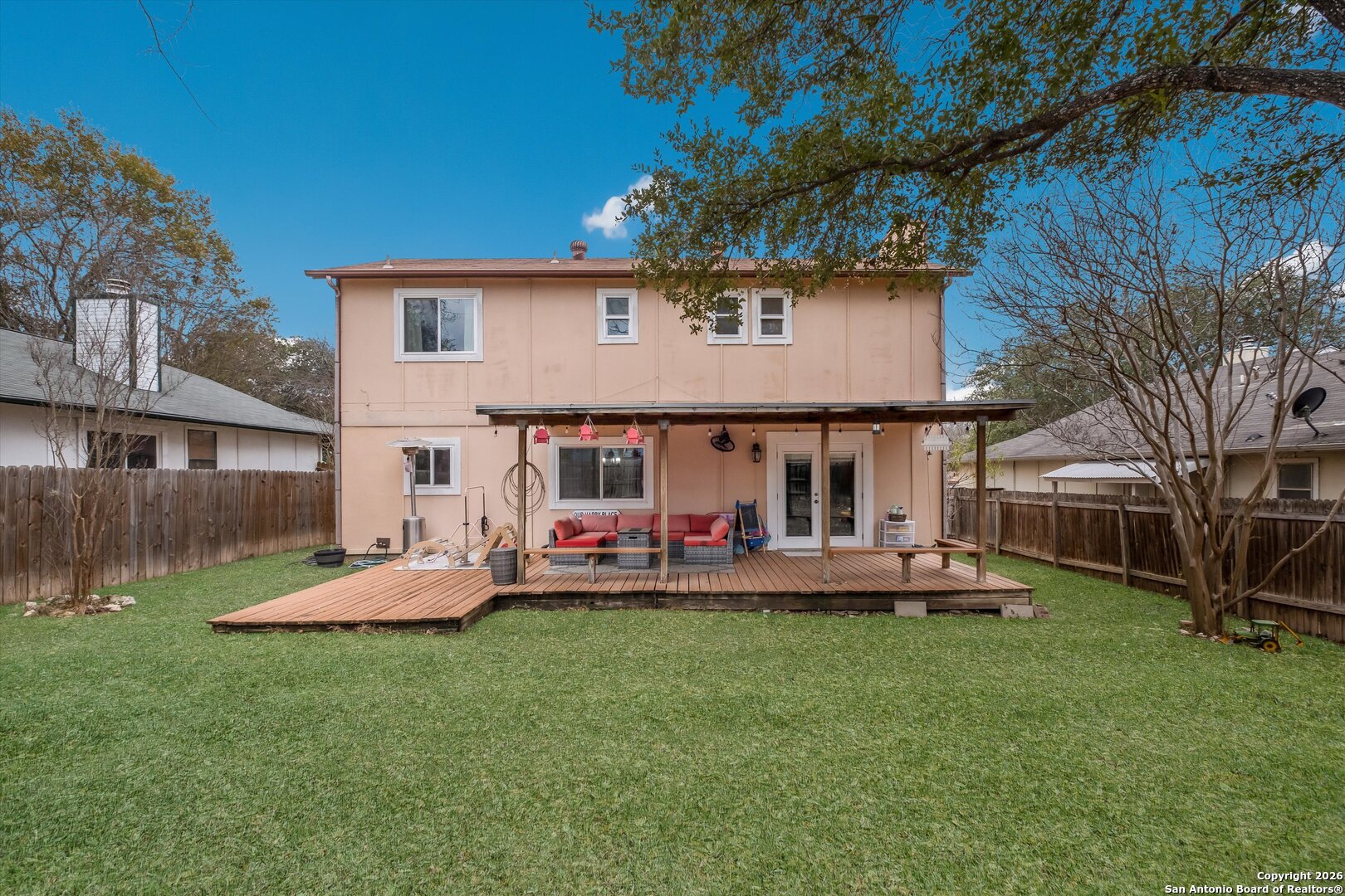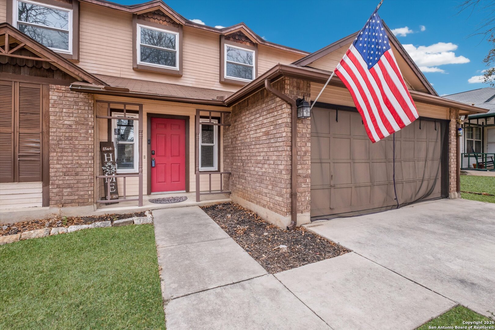 Welcome to this charming home in the Stoneridge community. From the moment you arrive, welcoming mature trees and sweet curb appeal leads into a bright interior featuring LVP flooring, soaring ceilings, and a classic brick, wood-burning fireplace anchoring the main living area. The layout flows naturally into the dining space and kitchen. French doors extend the living space outdoors to an impressive covered deck with additional open deck areas-ideal for entertaining, weekend gatherings, or quiet evenings outside. Upstairs, the primary suite provides a relaxing retreat with generous space, a walk-in closet, and a private bath with dual vanity and tub/shower combination, while two secondary bedrooms and a full bath offer flexibility for guests, home office space, or hobbies. Residents enjoy neighborhood amenities including a pool, tennis courts, and park/playground, along with easy access to McAllister Park, major expressways, and nearby attractions. Located in the North East ISD and close to Wetmore Elementary, Driscoll Middle School, and MacArthur High School, this home delivers space, function, and location in one appealing package. This is where your next chapter begins!
