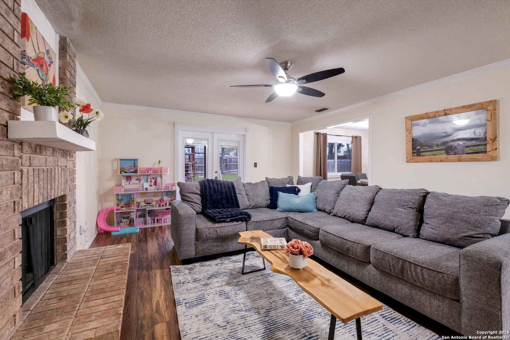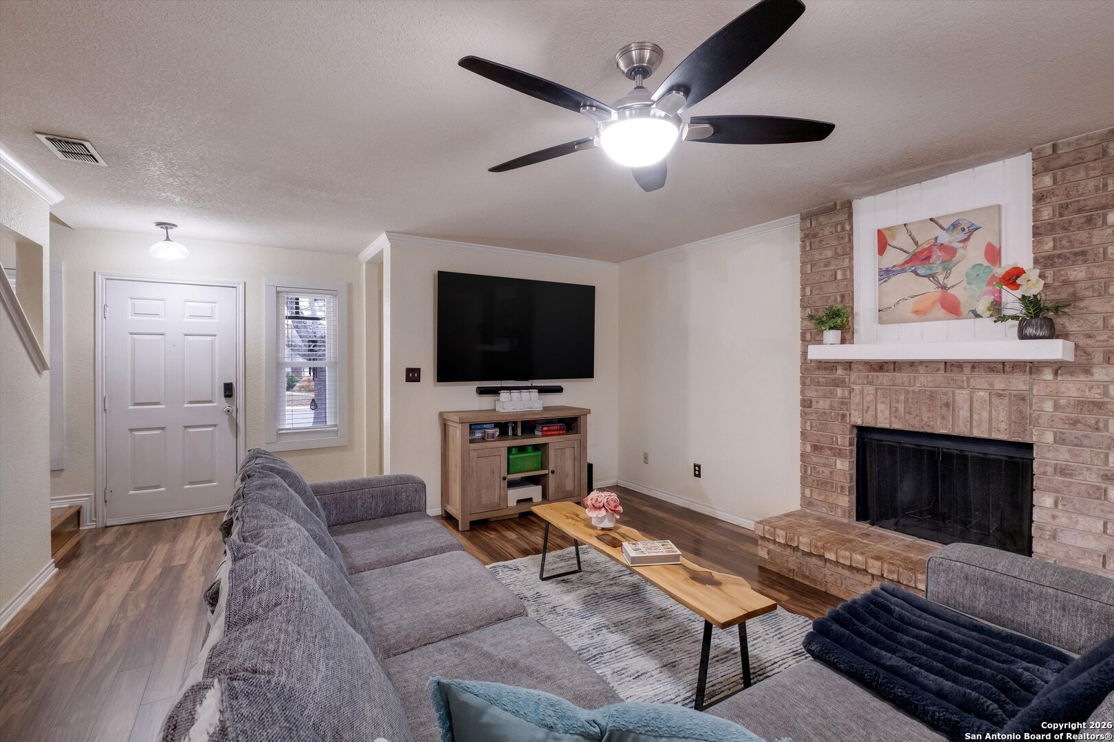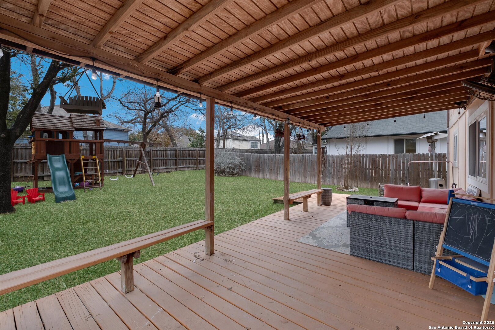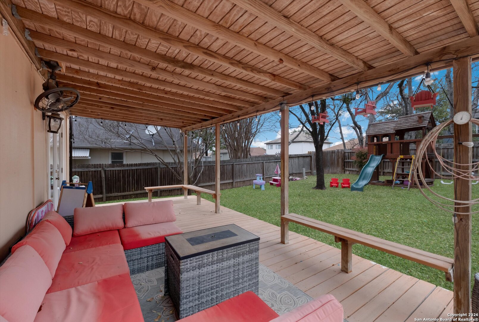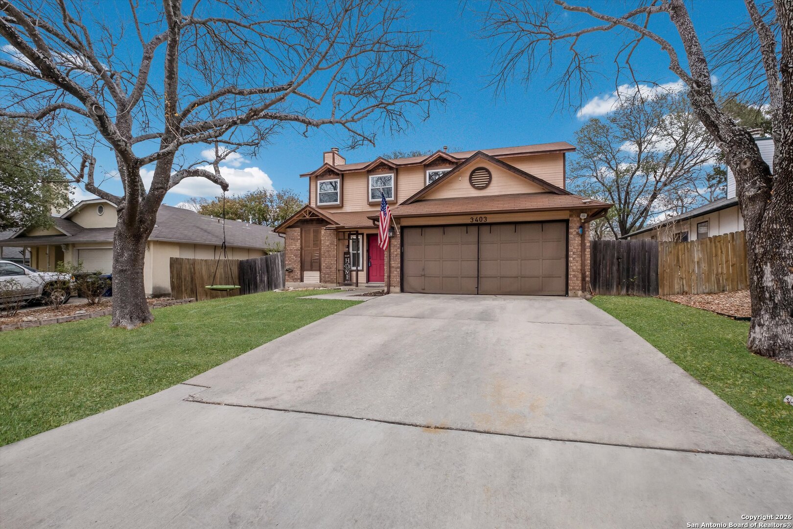 Welcome to this charming home in the Stoneridge community. From the moment you arrive, welcoming mature trees and sweet curb appeal leads into a bright interior featuring LVP flooring, soaring ceilings, and a classic brick, wood-burning fireplace anchoring the main living area. The layout flows naturally into the dining space and kitchen. French doors extend the living space outdoors to an impressive covered deck with additional open deck areas-ideal for entertaining, weekend gatherings, or quiet evenings outside. Upstairs, the primary suite provides a relaxing retreat with generous space, a walk-in closet, and a private bath with dual vanity and tub/shower combination, while two secondary bedrooms and a full bath offer flexibility for guests, home office space, or hobbies. Residents enjoy neighborhood amenities including a pool, tennis courts, and park/playground, along with easy access to McAllister Park, major expressways, and nearby attractions. Located in the North East ISD and close to Wetmore Elementary, Driscoll Middle School, and MacArthur High School, this home delivers space, function, and location in one appealing package. This is where your next chapter begins!