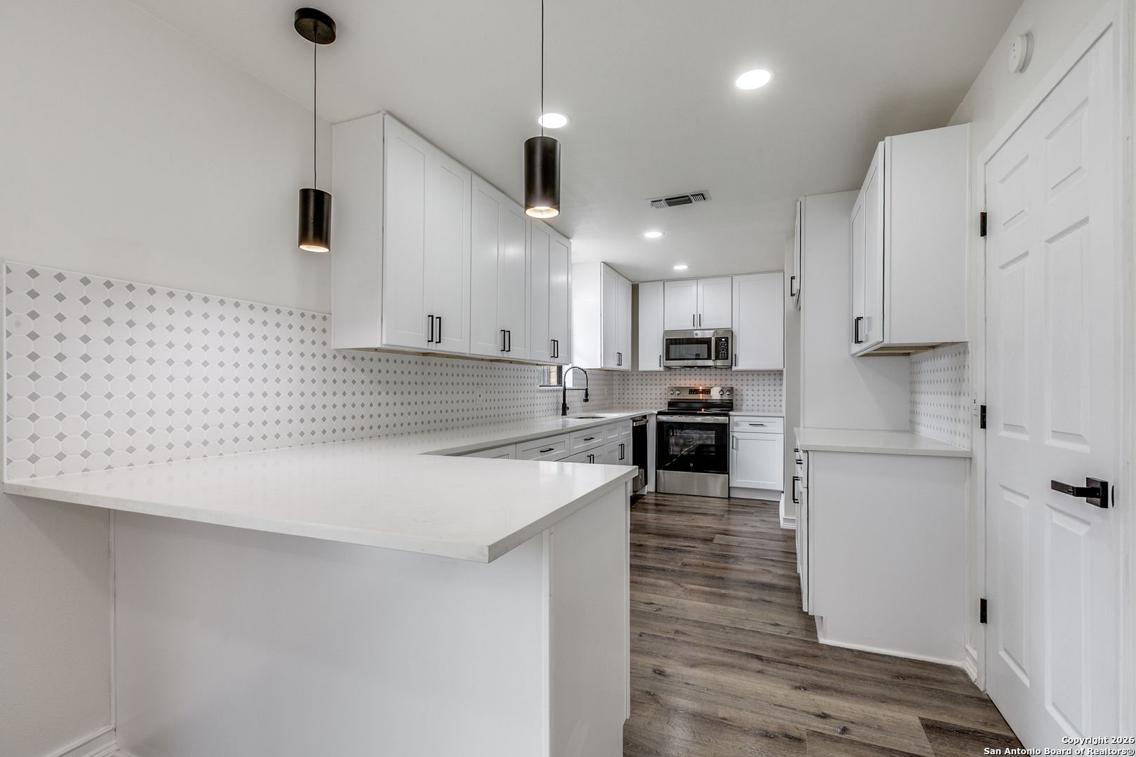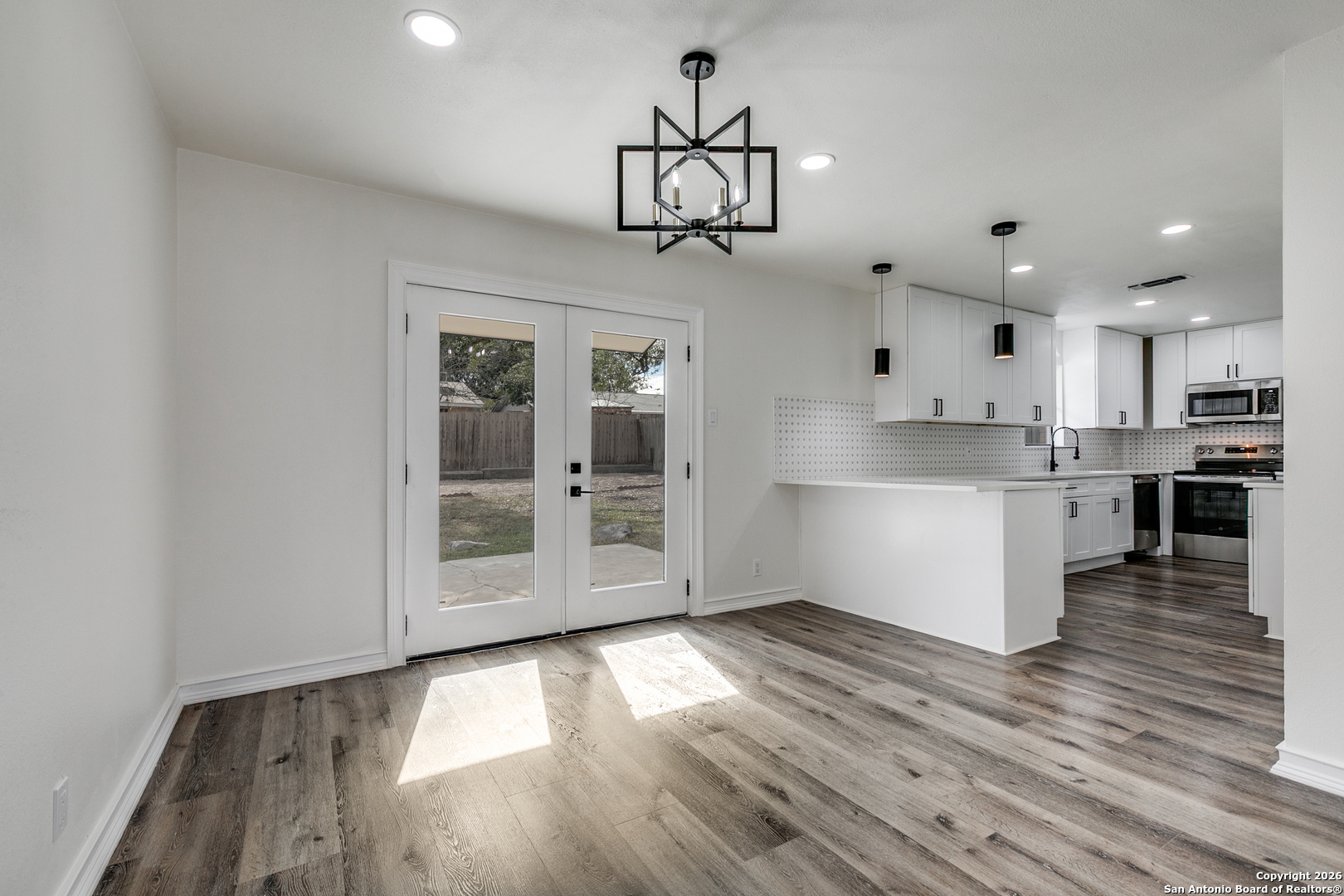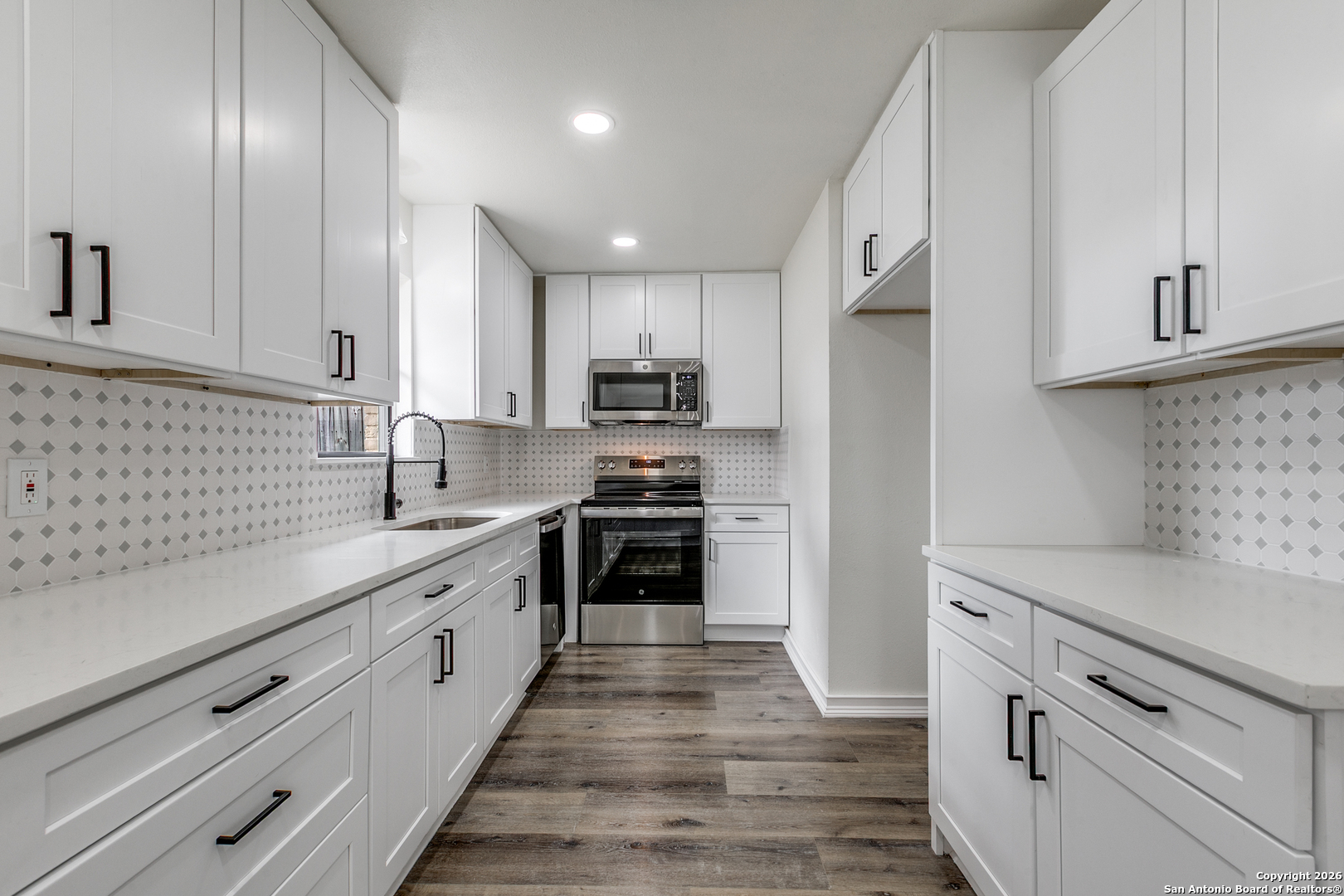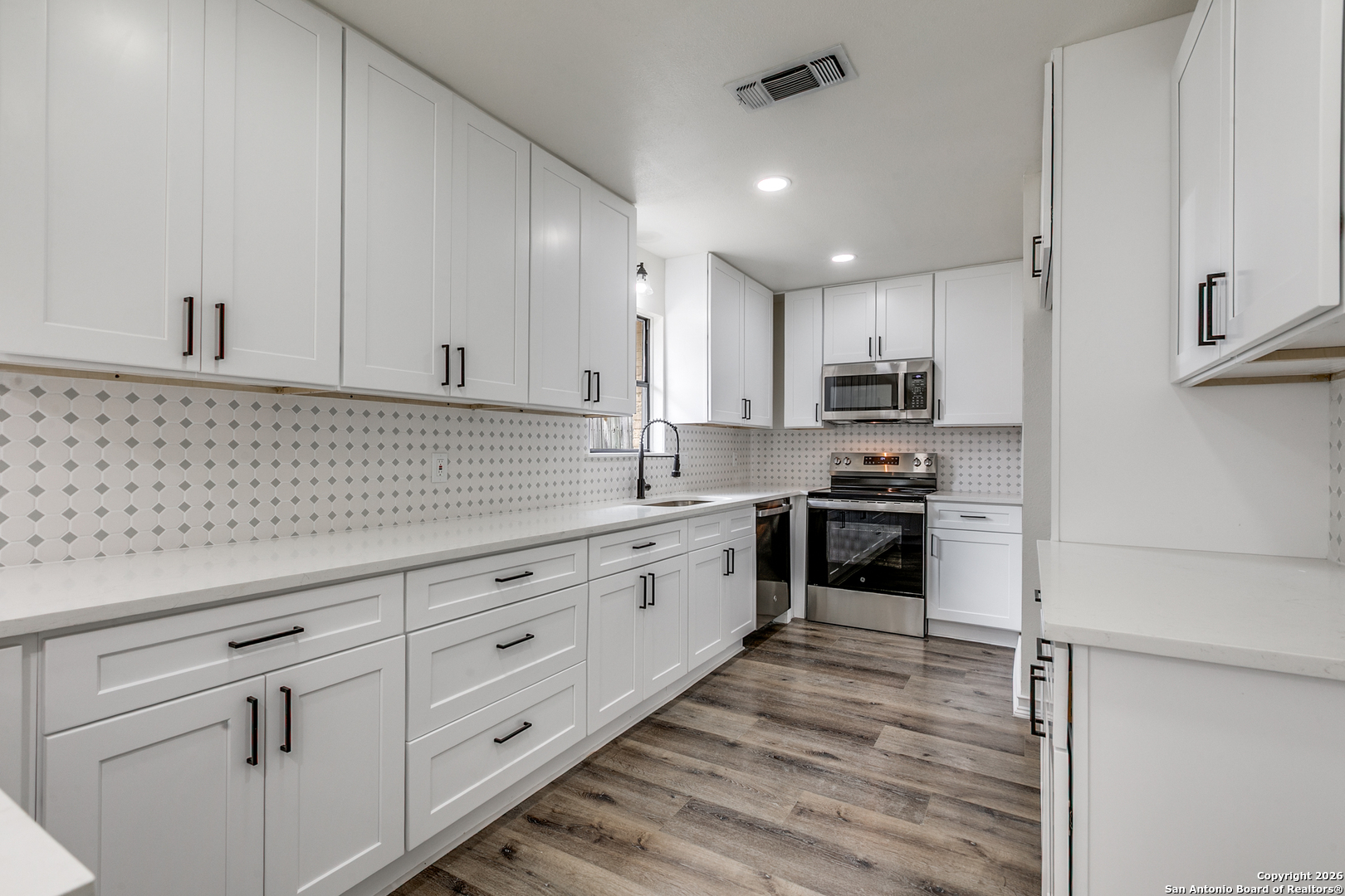 Beautiful, desirable and stylish home near Medical Center. This cozy home offers 3 bedrooms, 2 baths, and a 2-car garage. The open floor plan features brand-new waterproof SPC flooring, custom cabinets, quartz countertops, fresh paint, brand new roof. HVAC system and water heater are four years old. This residence offers a bright, open floor plan ideal for both everyday living and entertainment. The upgraded kitchen with stands out with its modern finishes, ample cabinetry, and seamless flow into the dining and living areas. Updated bathrooms with one-of-a-kind design floor tiles. The neighborhood also offers a pool and clubhouse with no HOA. Walking distance to HEB, blocks from I-10 and Wurzbach rd. Not to mention 10 minutes' drive to The Rim and La Cantera. You will not regret looking at this one. Come see it before it's gone!