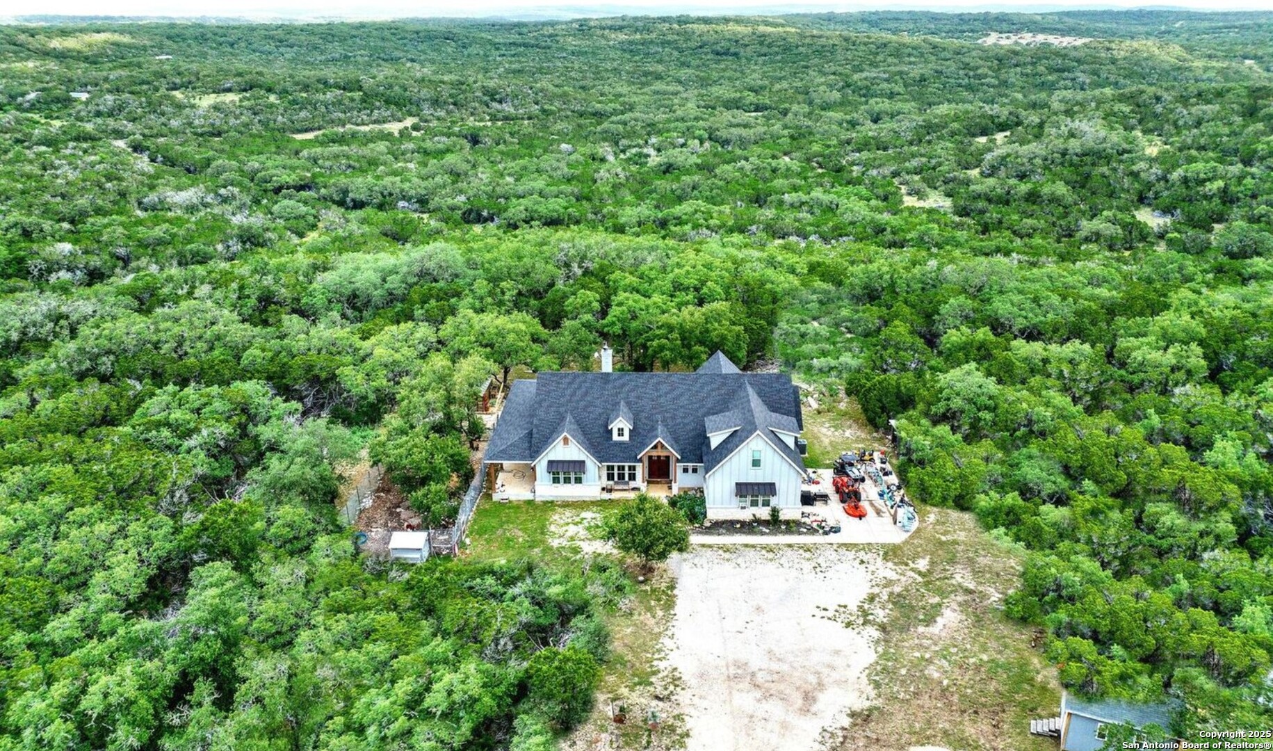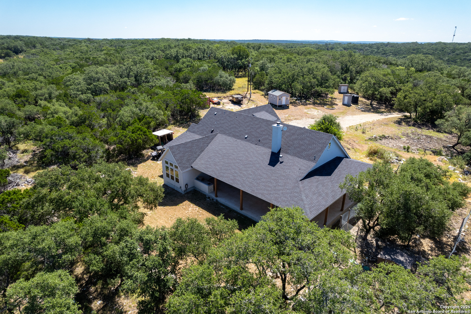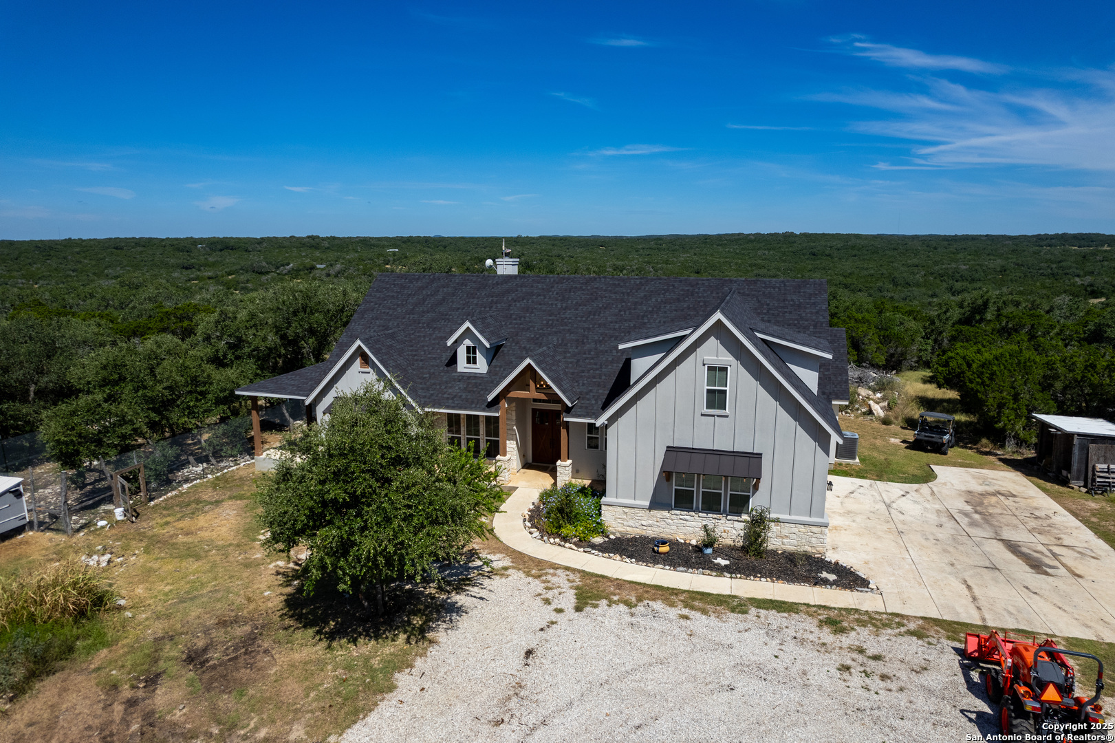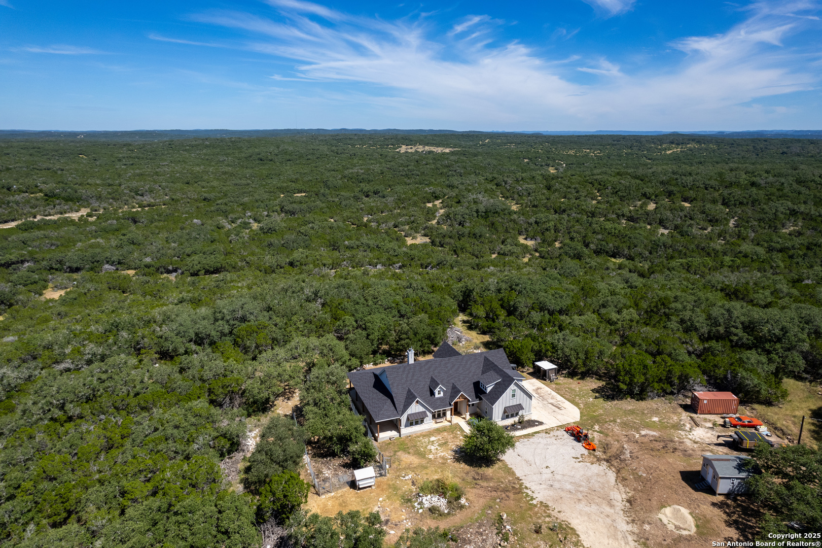 **2.875 Assumable mortgage available**Escape to your private 27-acre Texas paradise, where vast skies, serene luxury, and breathtaking views create an unrivaled sanctuary. Nestled on a scenic ridge, this custom-built 2021 home blends elegance, comfort, and seclusion, all just minutes from town.Step onto the expansive covered porch wrapping around the back, perfect for savoring morning coffee, vibrant sunsets, or the tranquil Hill Country landscape. Inside, the heart of the home is a warm, spacious Great Room with surround sound and a cozy wood/gas fireplace, ideal for gatherings or quiet evenings. The Great Room features oversized sliding glass doors that seamlessly connect indoor and outdoor living. The gourmet kitchen showcases custom cabinetry with hidden spice racks, stainless steel appliances, a gas stove, a coffee bar with filtered water, and a walk-in pantry with a deep freezer recess for effortless functionality.The private primary bedroom offers a peaceful retreat with direct porch access and a spa-inspired bathroom featuring a double vanity, garden tub, bidet, and dedicated water heater for ultimate comfort. Two additional bedrooms, located on the opposite side of the home, share a Jack-and-Jill bathroom and each open to the porch via elegant French doors, ensuring privacy and abundant natural light. A convenient powder room downstairs adds to the home's thoughtful design, totaling 3 bedrooms and 2.5 bathrooms on the main level. Upstairs, a spacious flex room with a full bath serves as a versatile space for entertainment, hobbies, or guest accommodations.The mudroom, off the three-car garage, provides a practical drop zone for coats, boots, and gear. Outside, enjoy a fully equipped outdoor kitchen with sink, grill, and fridge; irrigated garden beds; fruit trees (apple, pear, peach, plum); and ample space to explore. Chickens, wild turkeys, deer, and white-tailed hawks add to the daily charm of this idyllic retreat.Modern upgrades enhance the lifestyle: 2 RV hookups (30-amp), deep water well, aerobic septic system with quarterly maintenance, 2 tankless water heaters, spray foam insulation, whole-house water softener and filtration, south Texas Internet with Wi-Fi extender, cell phone booster, Dish Network, two storage sheds (12x16 with guest house potential, 8x8), deer blinds (convey), and 10-foot interior doors for an open, airy feel.More than a home, this is a lifestyle crafted with heart and intention. Experience the peaceful rhythm of the Hill Country living in your own slice of paradise.