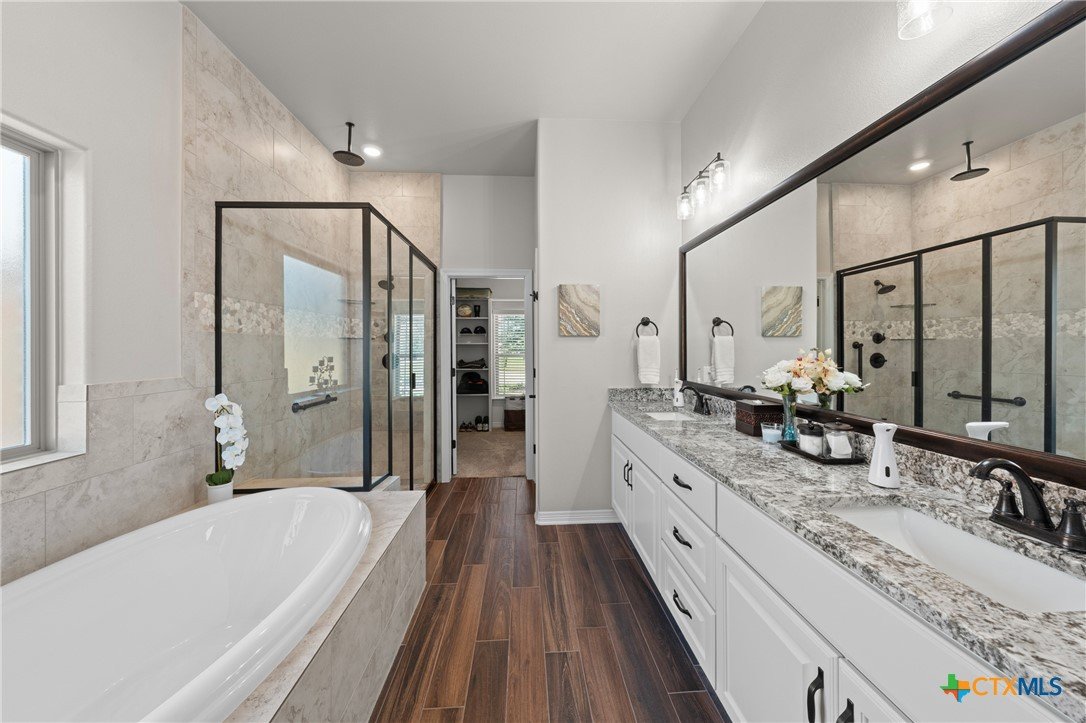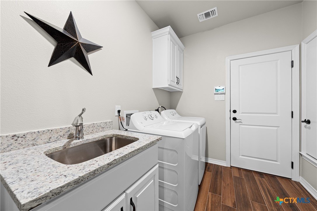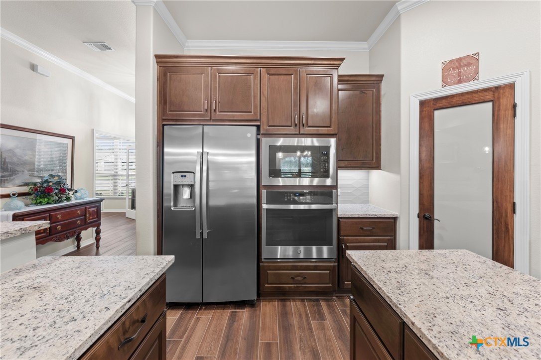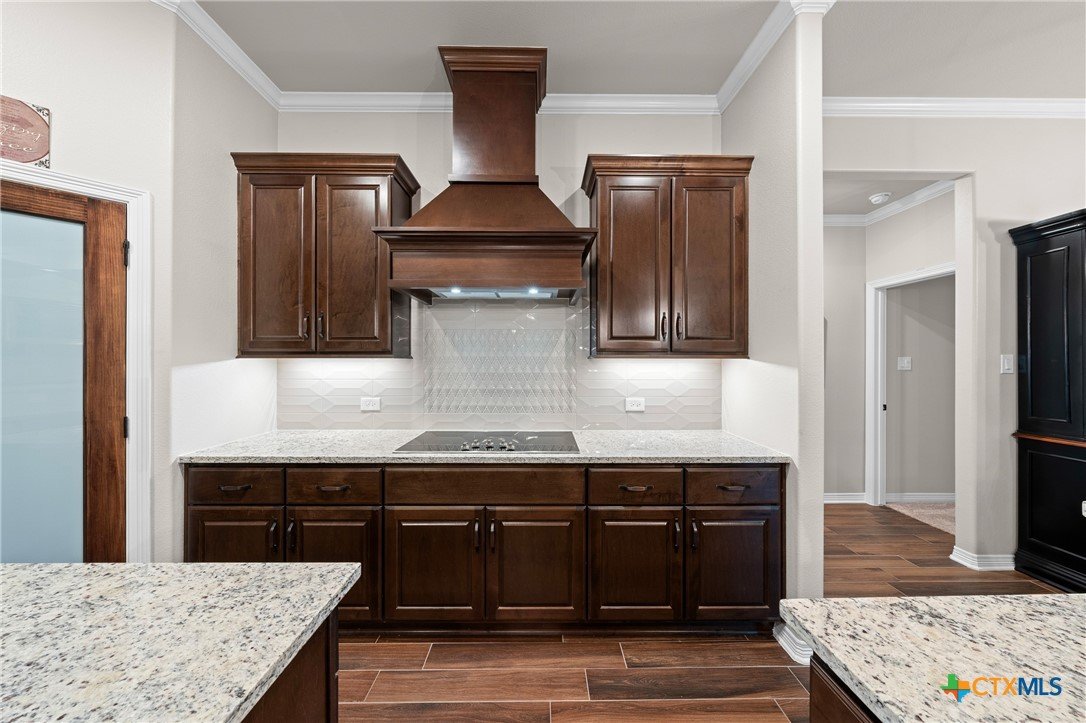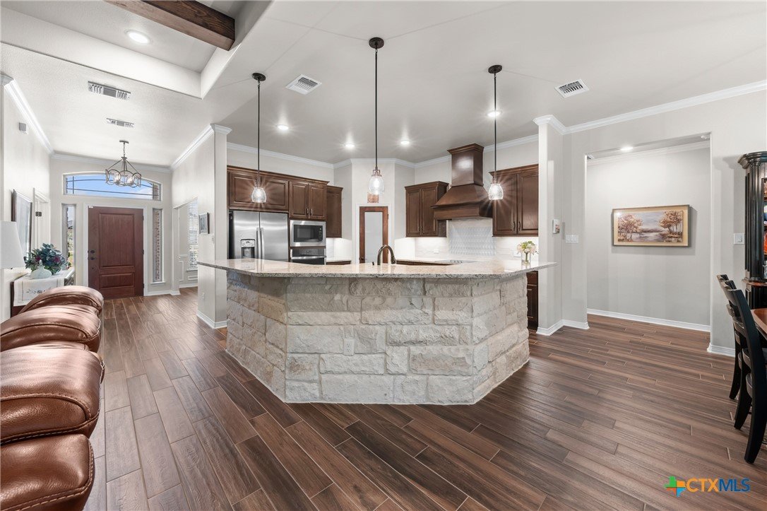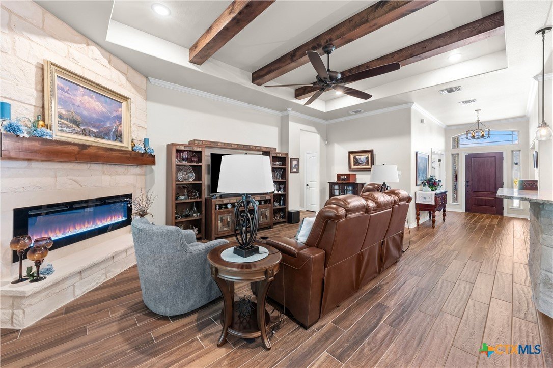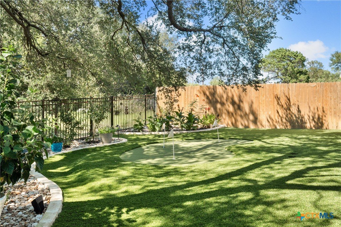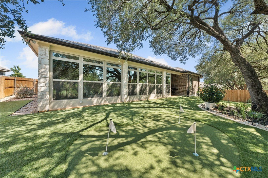 Welcome to this meticulously maintained Carothers Home in Belton, where thoughtful upgrades and timeless design meet low-maintenance living. From the moment you arrive, the curb appeal is undeniable—contrasting stone and brick exterior, manicured landscaping, and an inviting entryway that sets the tone for the quality inside. Step into a home designed for both function and refinement. Crown molding adds a touch of sophistication throughout the living spaces, while the chef-inspired kitchen is equipped with a custom vent-a-hood, sleek cabinetry, and generous prep space—ideal for culinary enthusiasts. The open layout ensures a seamless flow from the kitchen into the dining and living areas, creating a comfortable environment for both daily living and entertaining. Beyond the interior, the upgrades continue. The garage is a standout with epoxy-coated flooring and suspended shelving, maximizing both durability and storage. The enclosed patio, professionally finished with full glass windows and independent AC, extends your living space year-round, offering the perfect spot to relax or host guests while staying connected to the outdoors. The backyard is a private retreat and entertainer’s dream. Low-maintenance artificial turf provides a pristine look without the upkeep, while a custom putting green invites hours of recreation. A stately oak tree, enhanced by custom up-lighting, anchors the yard and provides both shade and natural beauty. Landscaped beds and an iron fence complete the space, attracting local wildlife and creating a serene backdrop for morning coffee or evening unwinding. Every feature of this property has been carefully chosen for efficiency, comfort, and enjoyment. Whether you’re drawn to the chef-style upgrades, the thoughtful storage solutions, or the backyard oasis, this Belton home delivers the perfect blend of style and practicality in one of the area’s most desirable locations.