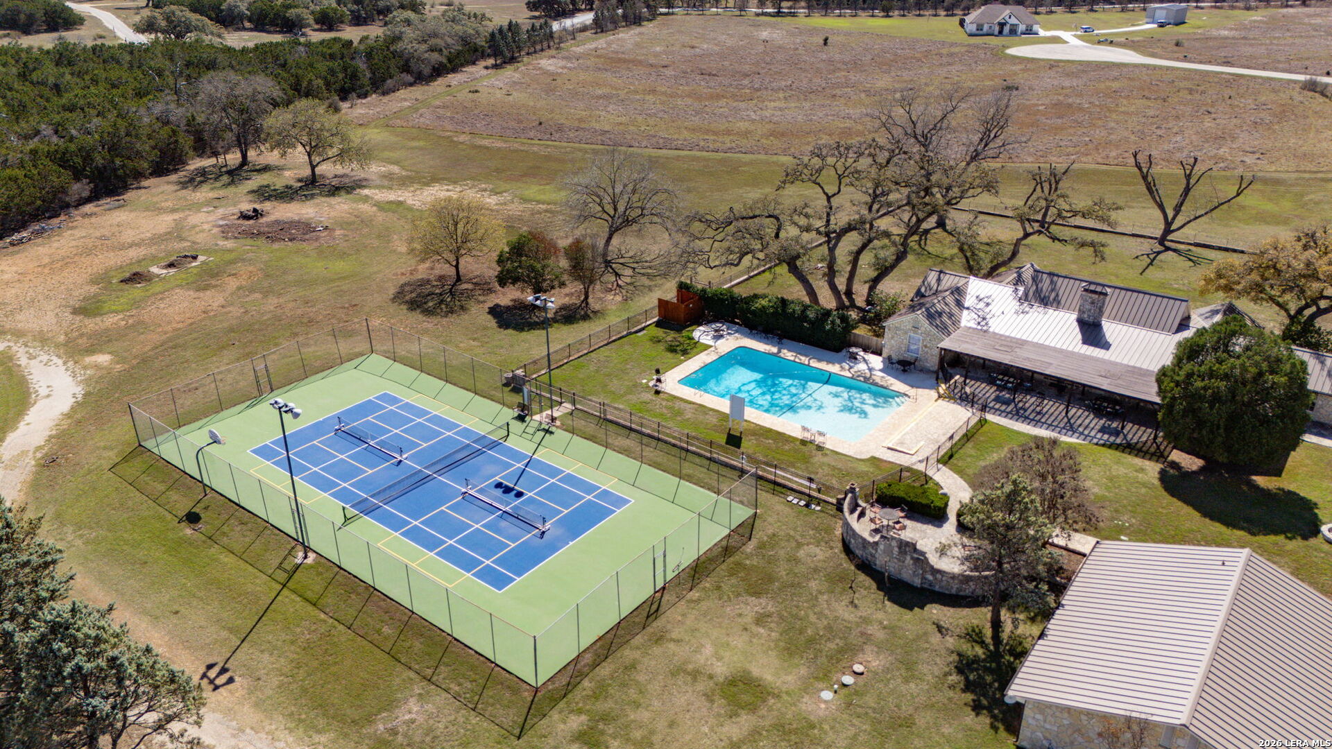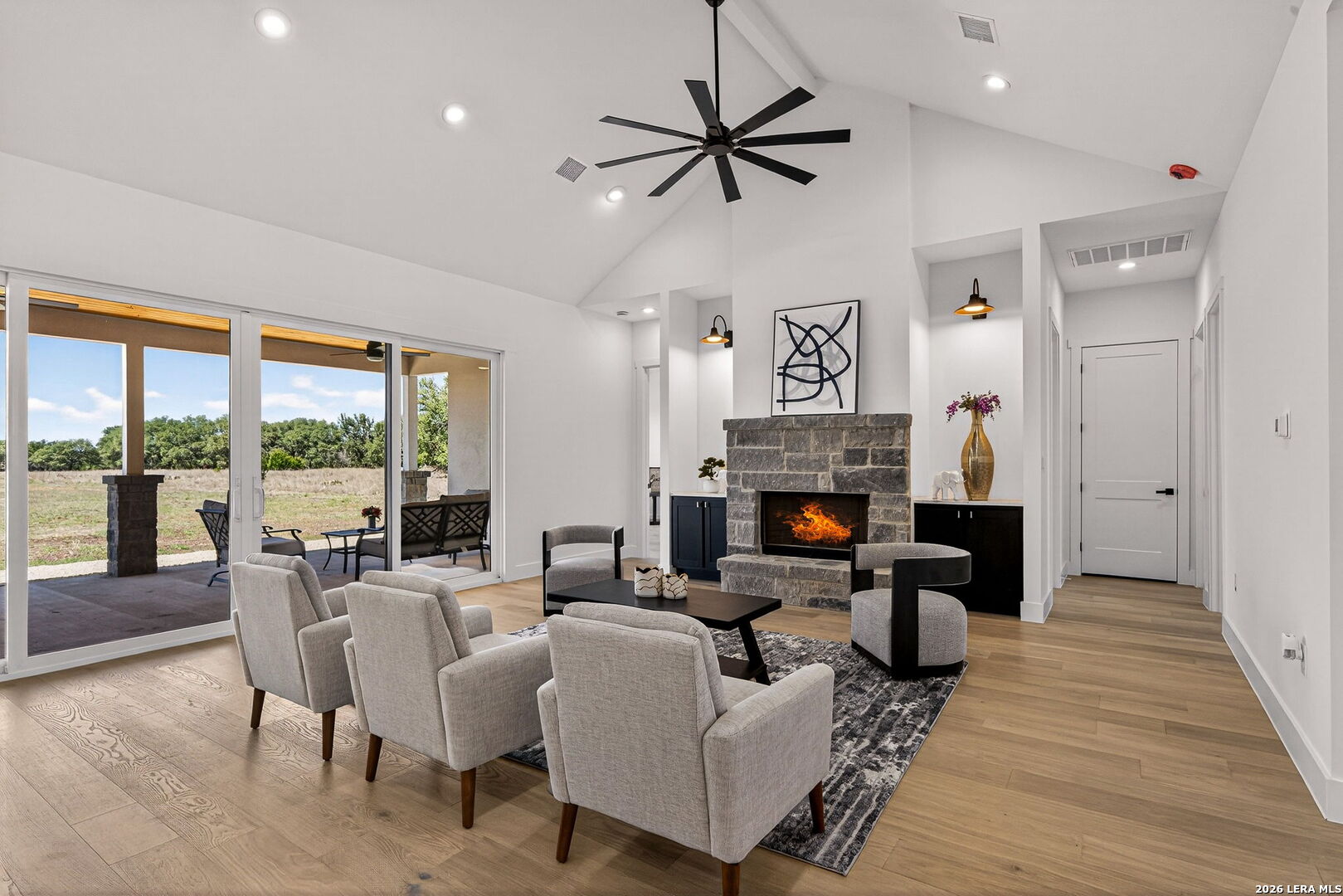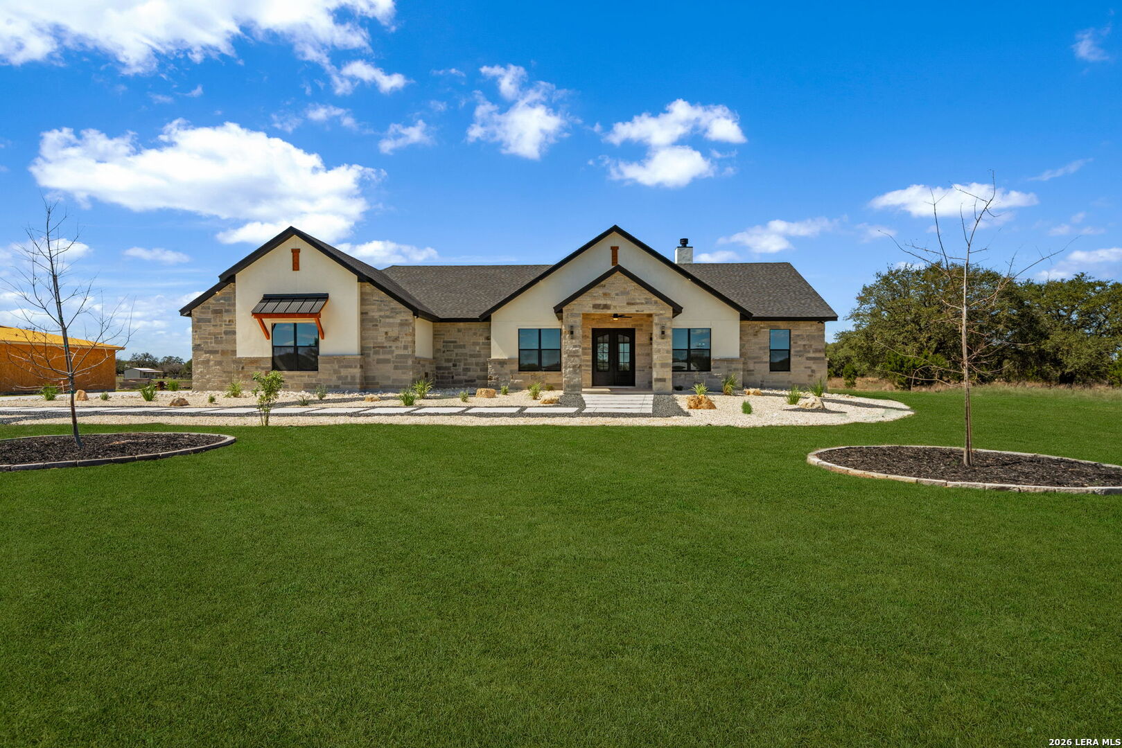 OPEN HOUSE March 21, 2026 from 1-4 pm. Welcome to your private slice of the Texas Hill Country in the highly sought-after Bridlegate community in Bandera, TX. This stunning new construction home offers 3,000 square feet of thoughtfully designed living space, featuring 4 bedrooms, 3.5 bathrooms, and breathtaking views of wide-open countryside. From the moment you arrive, the home's striking stone and stucco exterior, modern black accents, and inviting covered entry create unforgettable curb appeal. The beautifully designed xeriscape landscaping and modern stone walkway lead to elegant double doors that open into a bright and airy interior. Step inside to discover an open-concept floor plan with soaring vaulted ceilings, abundant natural light, and elegant finishes throughout. The spacious living room features a striking stone fireplace and large sliding glass doors that open to the covered patio, creating seamless indoor-outdoor living. The gourmet kitchen is designed to impress with quartz countertops, custom cabinetry, designer lighting, stainless steel appliances, and a large island with seating, perfect for gathering with family and friends. The luxurious primary suite offers a spa-inspired retreat with a freestanding soaking tub, oversized walk-in shower, dual vanities, and premium finishes. Secondary bedrooms provide generous space and flexibility for guests, office, or family needs. Step outside to the expansive covered back patio with cedar ceiling and ceiling fans, perfect for relaxing or entertaining while enjoying peaceful Hill Country views across your 2.1-acre homesite. Residents of Bridlegate enjoy incredible amenities, including gated entry, community pool, tennis courts, clubhouse, park, jogging trails, sports courts, volleyball court, and equestrian facilities with a horse arena. Whether you're looking for a peaceful retreat, a full-time residence, or a weekend escape, this exceptional home offers the perfect blend of luxury, space, and Hill Country lifestyle - all just a short drive from San Antonio.
