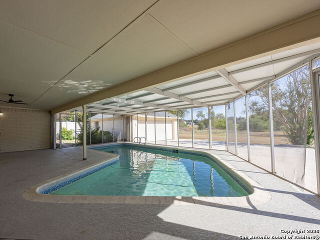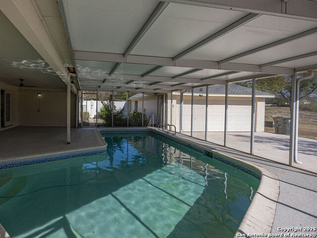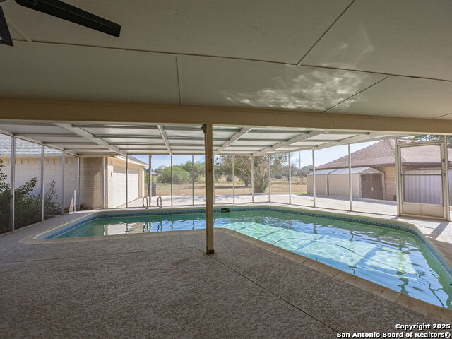 Here's your chance to purchase in a low volume listed Northcliffe Country Club Estates. Sitting on a 75x120 lot, you won't get a house this nice with a deal this good in the Schertz/Cibolo area. This home features 4 bedrooms and 2 and half bathrooms, 2 living areas, dining room, and separate eating area in the kitchen. You'll appreciate the high vaulted ceilings with sky lights as well as the wet bar which is perfect for entertaining. There's a bedroom with an awesome custom book shelf perfect for an office, avid reader, or someone looking for a nice place for their collectibles. This home offers 2 fireplaces, 1 in the living area and one in the primary bedroom. The star of the show of course is the enclosed pool, plenty big for gatherings and with this weather not letting up, you still have plenty of time to enjoy it. The pesky mosquitos won't get in your way with the screened in porch. This home backs into what was once a golf course so you'll appreciate not having neighbors in the rear. Lastly, the home has an oversized detached garage which offers a dedicated workspace inside.