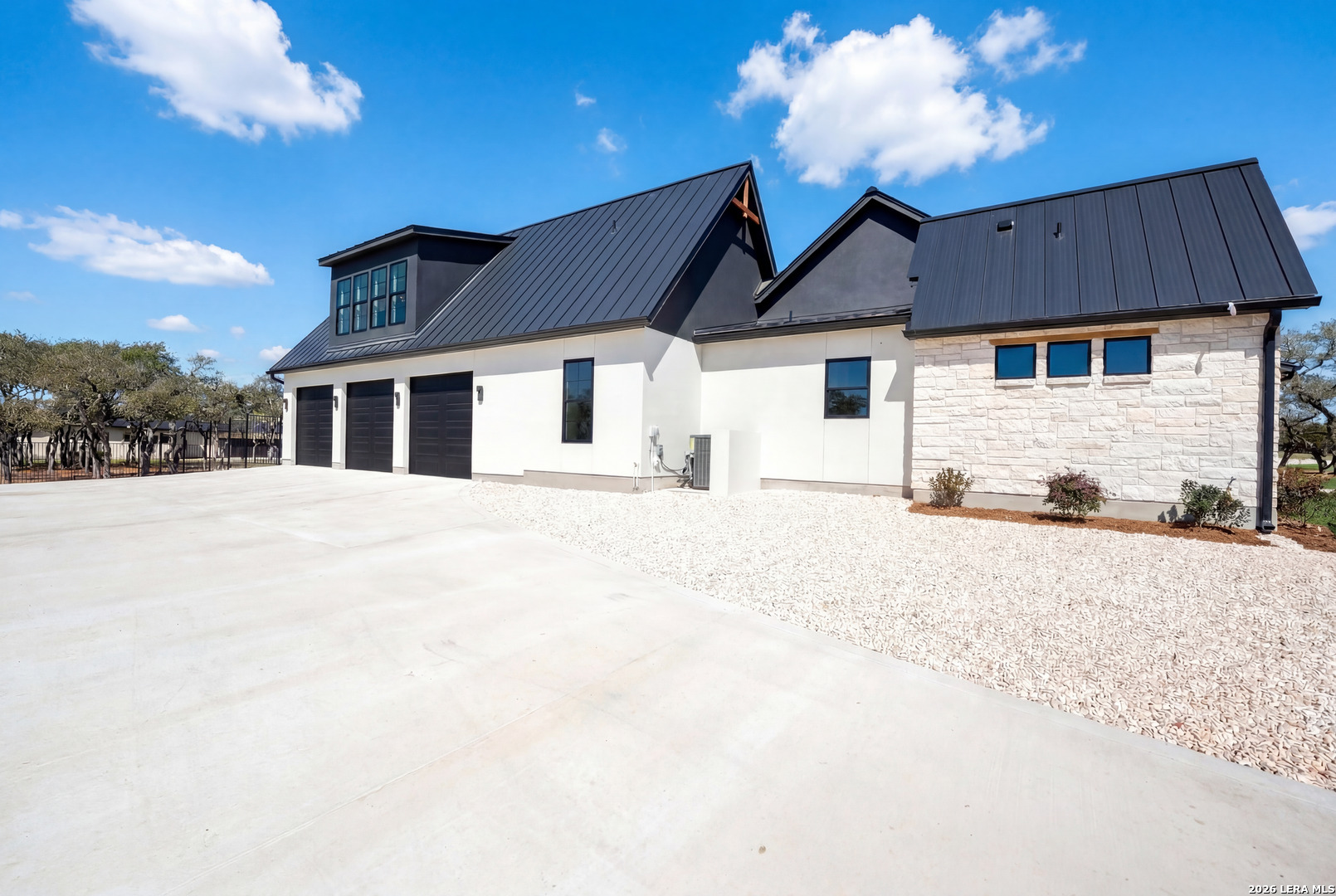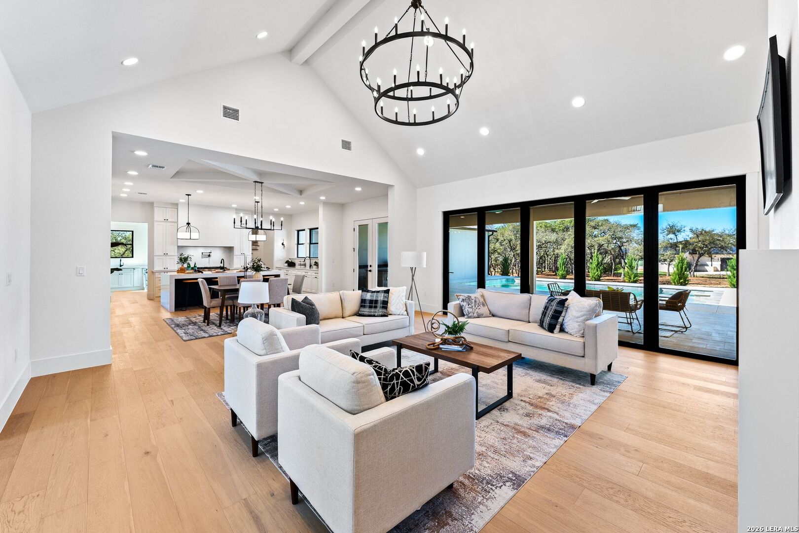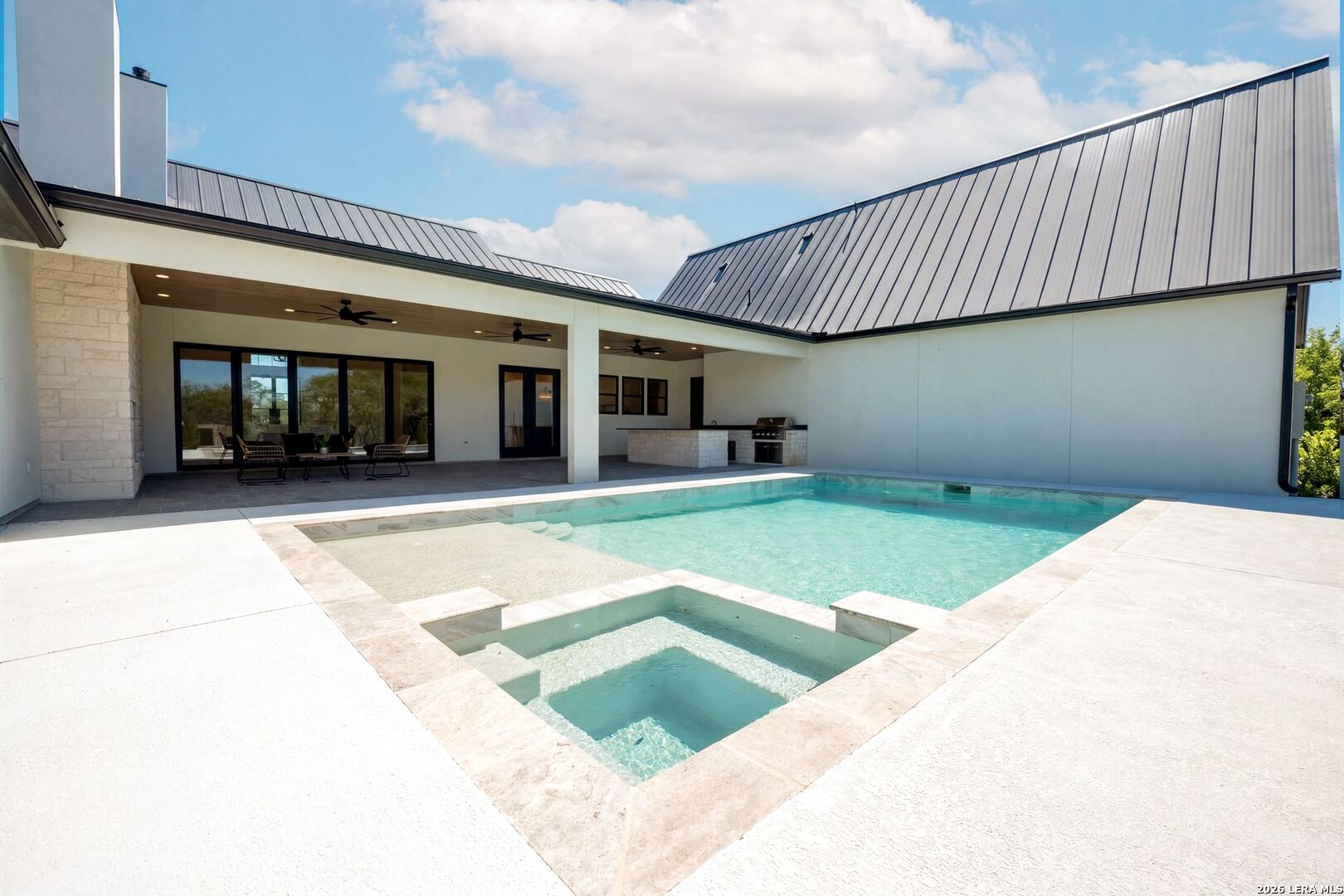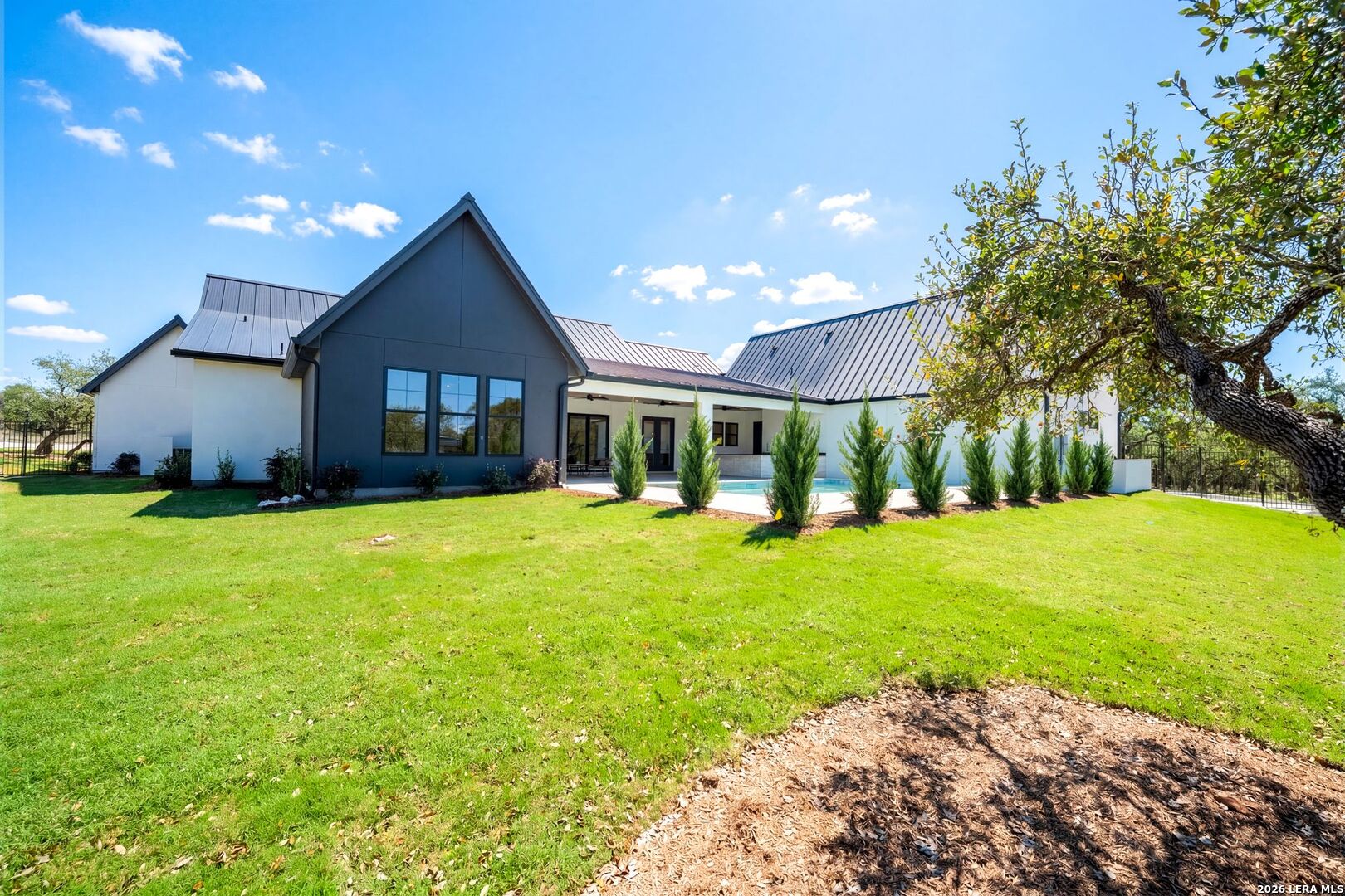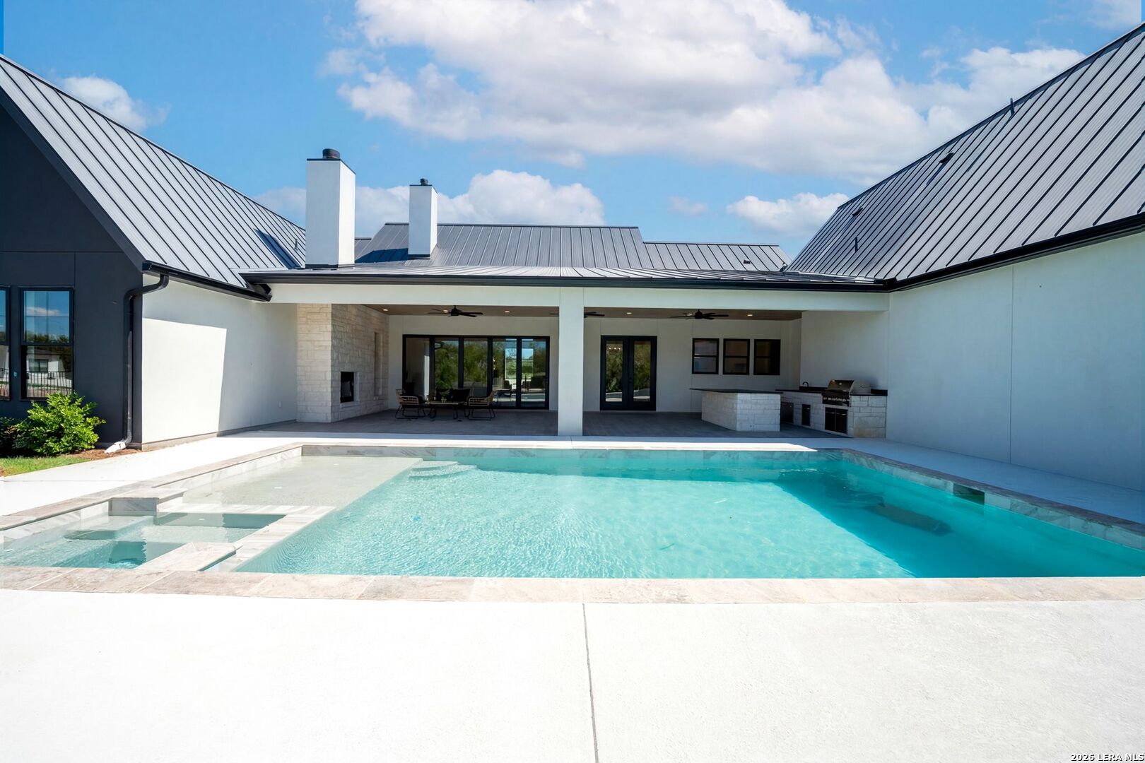 Featuring an exceptional new custom built home where timeless elegance meets modern convenience. Nestled on a beautifully landscaped 1.07 acre lot, this home boasts a striking stone and stucco traditional craftsmanship exterior paired with an impressive 3-car epoxy garage. The open floor plan features 4 bedrooms, 5 full baths, an office, upstairs loft/ media room, pool with spa and an outdoor full bath. Step inside the grand iron double doors, and be greeted by soaring high vaulted ceilings, and an abundance of natural light streaming through the 16-foot accordion doors connecting indoor/outdoor living space. The floor plan features spacious living areas around a propane fireplace, perfect for both relaxed living and elegant entertaining. The chef's dream kitchen offers an oversized island, sleek quartz waterfall countertops, off-white cabinetry providing exceptional storage with a Z-Line appliance package that includes a 48-inch 8 burner propane range, a custom built-in vent hood, refrigerator, and beverage fridge. The large butlers pantry adds even more function and style with an additional fridge, and ice maker. Retreat to a spa-like comfort with the primary suite featuring vaulted ceilings, a large custom walk-in closet that seamlessly connects to the laundry room for ultimate convenience. Upstairs is a large loft/ media room with a full bathroom. Outside, enjoy an entertainer's paradise with a large covered patio, full outdoor kitchen with a wood burning fireplace and lush landscaping surrounding a swimming pool and hot tub, supported by outdoor sprinkler systems in the front and backyards. Practical luxury is at the heart of this home with energy-efficient foam insulation in all the exterior walls and ceilings including the garage with a 240-vault EV charger outlet, two AC units, and a grand roundabout driveway- all working together to maximize comfort and efficiency. This property is located within The Belle Oaks Ranch subdivision, where you'll enjoy a community pool, tennis court, and clubhouse. Situated within highly rated schools in Comal ISD, this home is a must-see in person-