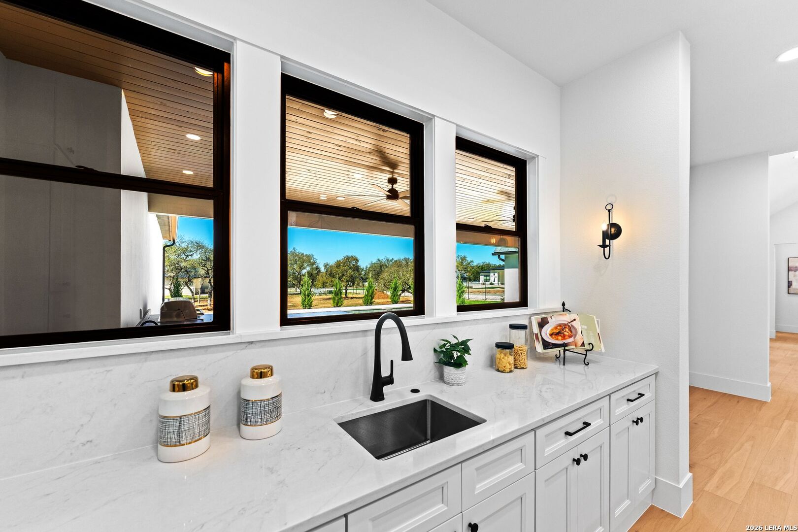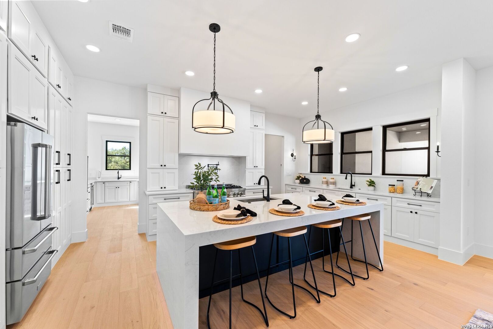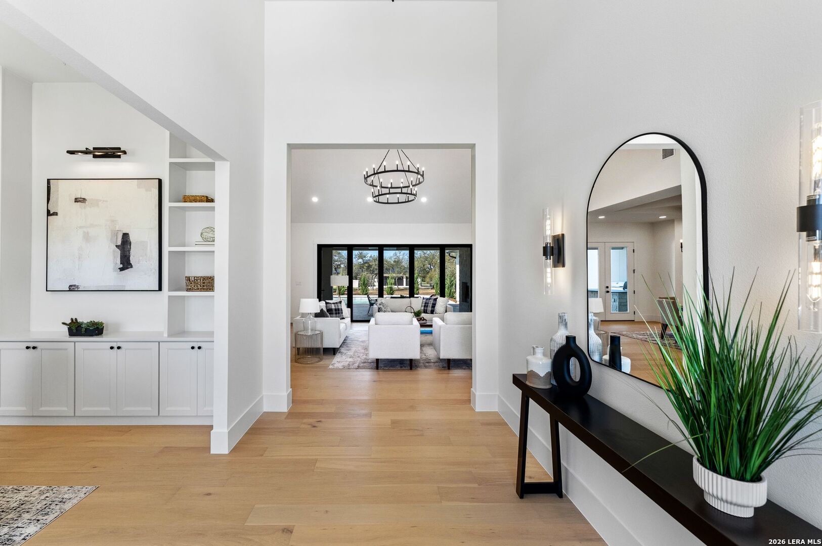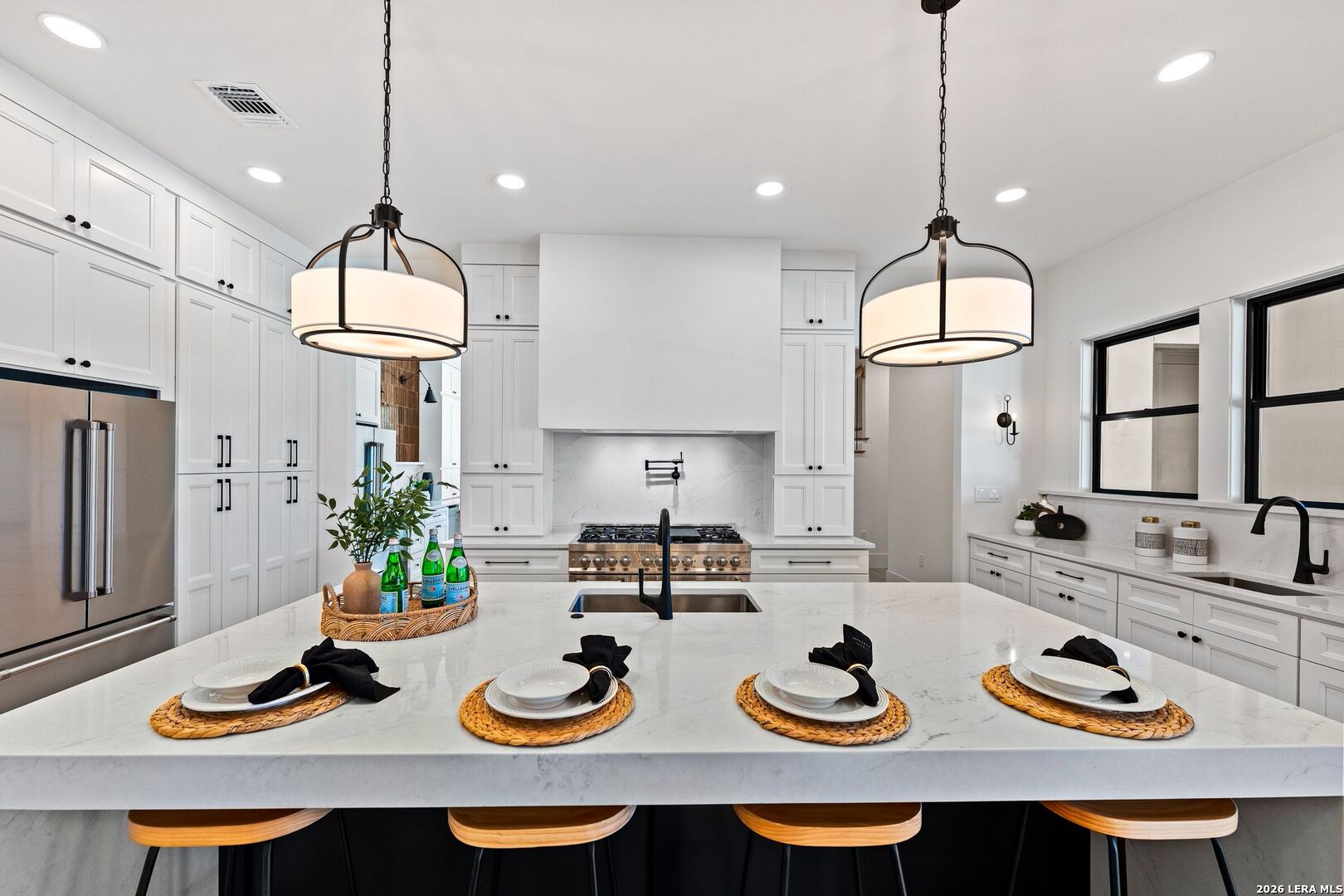 Featuring an exceptional new custom built home where timeless elegance meets modern convenience. Nestled on a beautifully landscaped 1.07 acre lot, this home boasts a striking stone and stucco traditional craftsmanship exterior paired with an impressive 3-car epoxy garage. The open floor plan features 4 bedrooms, 5 full baths, an office, upstairs loft/ media room, pool with spa and an outdoor full bath. Step inside the grand iron double doors, and be greeted by soaring high vaulted ceilings, and an abundance of natural light streaming through the 16-foot accordion doors connecting indoor/outdoor living space. The floor plan features spacious living areas around a propane fireplace, perfect for both relaxed living and elegant entertaining. The chef's dream kitchen offers an oversized island, sleek quartz waterfall countertops, off-white cabinetry providing exceptional storage with a Z-Line appliance package that includes a 48-inch 8 burner propane range, a custom built-in vent hood, refrigerator, and beverage fridge. The large butlers pantry adds even more function and style with an additional fridge, and ice maker. Retreat to a spa-like comfort with the primary suite featuring vaulted ceilings, a large custom walk-in closet that seamlessly connects to the laundry room for ultimate convenience. Upstairs is a large loft/ media room with a full bathroom. Outside, enjoy an entertainer's paradise with a large covered patio, full outdoor kitchen with a wood burning fireplace and lush landscaping surrounding a swimming pool and hot tub, supported by outdoor sprinkler systems in the front and backyards. Practical luxury is at the heart of this home with energy-efficient foam insulation in all the exterior walls and ceilings including the garage with a 240-vault EV charger outlet, two AC units, and a grand roundabout driveway- all working together to maximize comfort and efficiency. This property is located within The Belle Oaks Ranch subdivision, where you'll enjoy a community pool, tennis court, and clubhouse. Situated within highly rated schools in Comal ISD, this home is a must-see in person-
