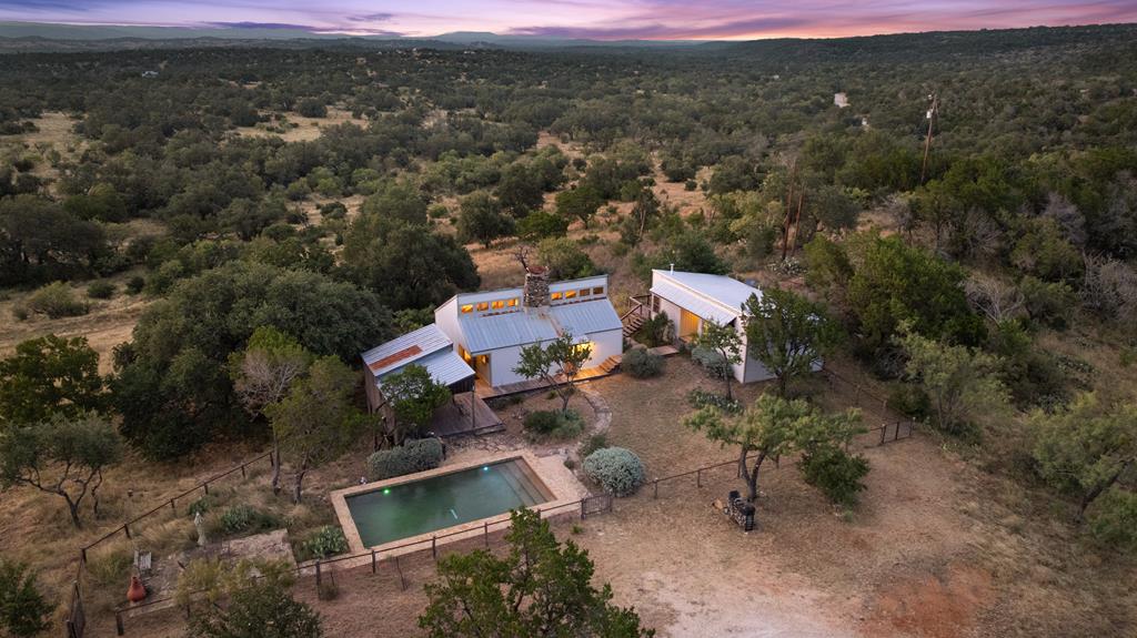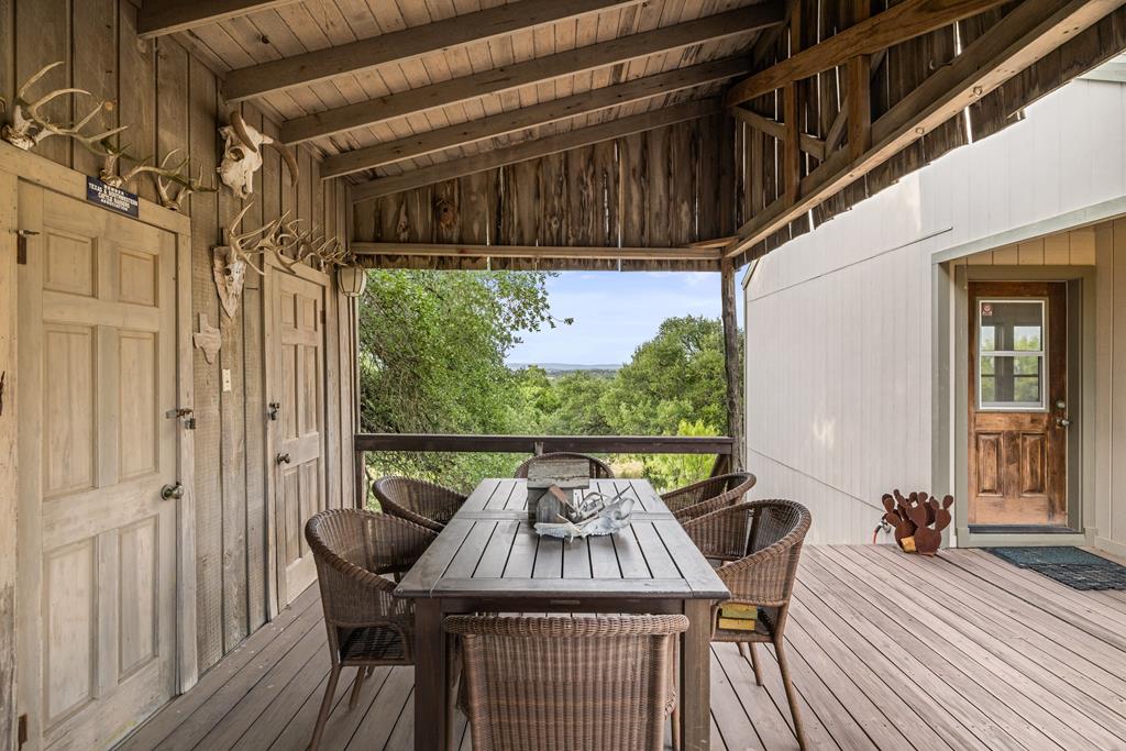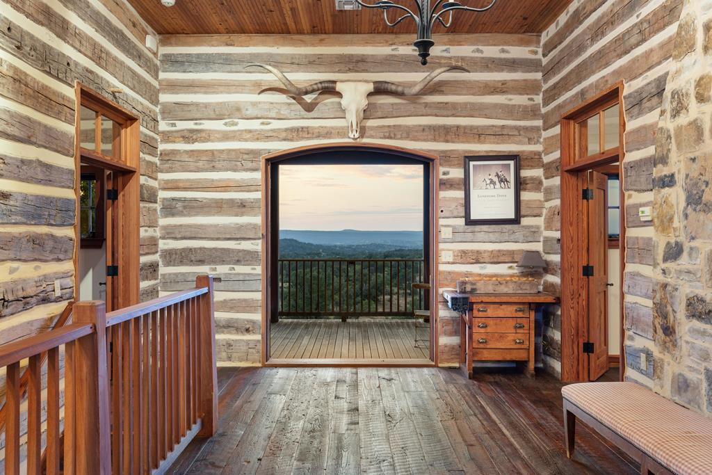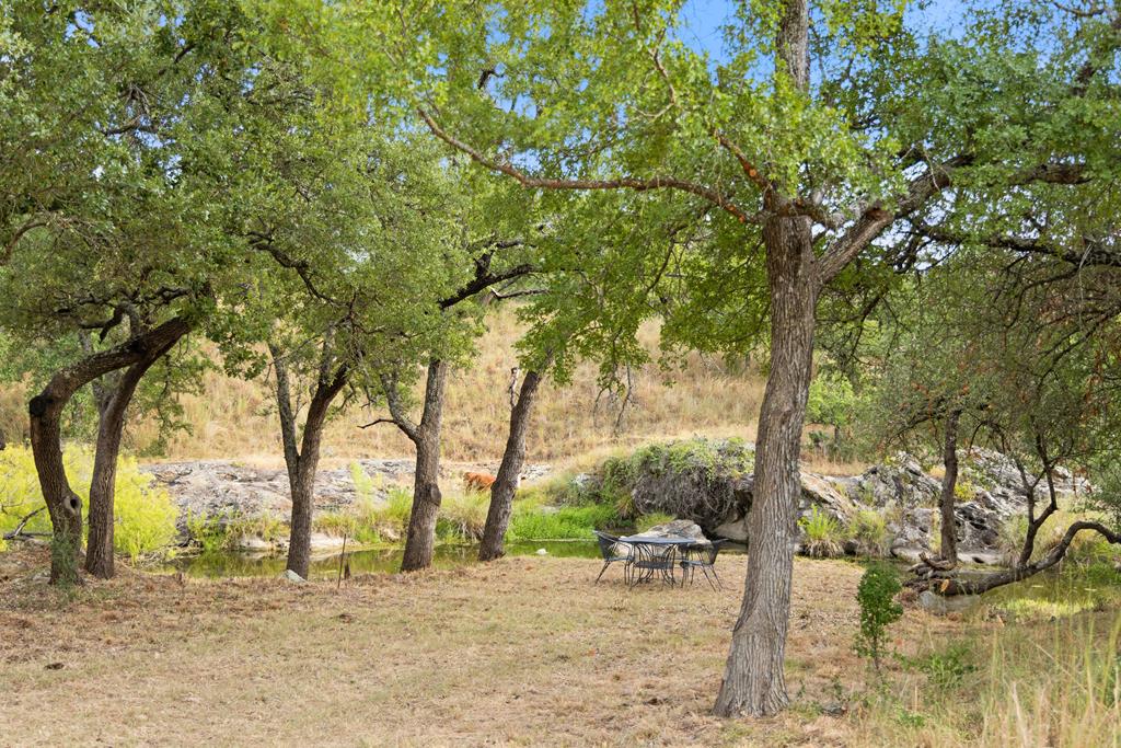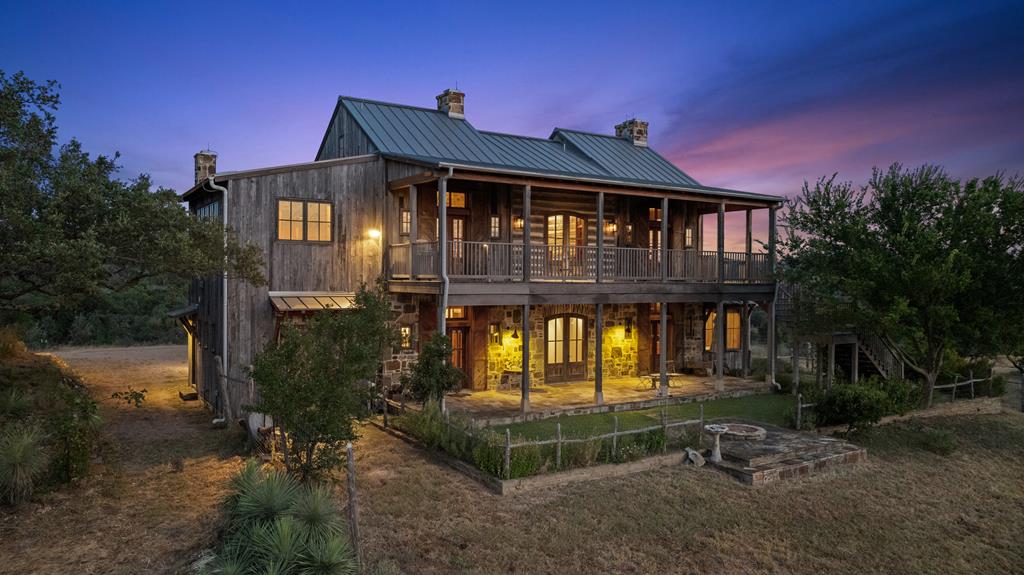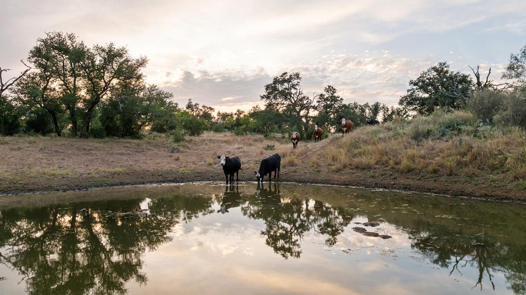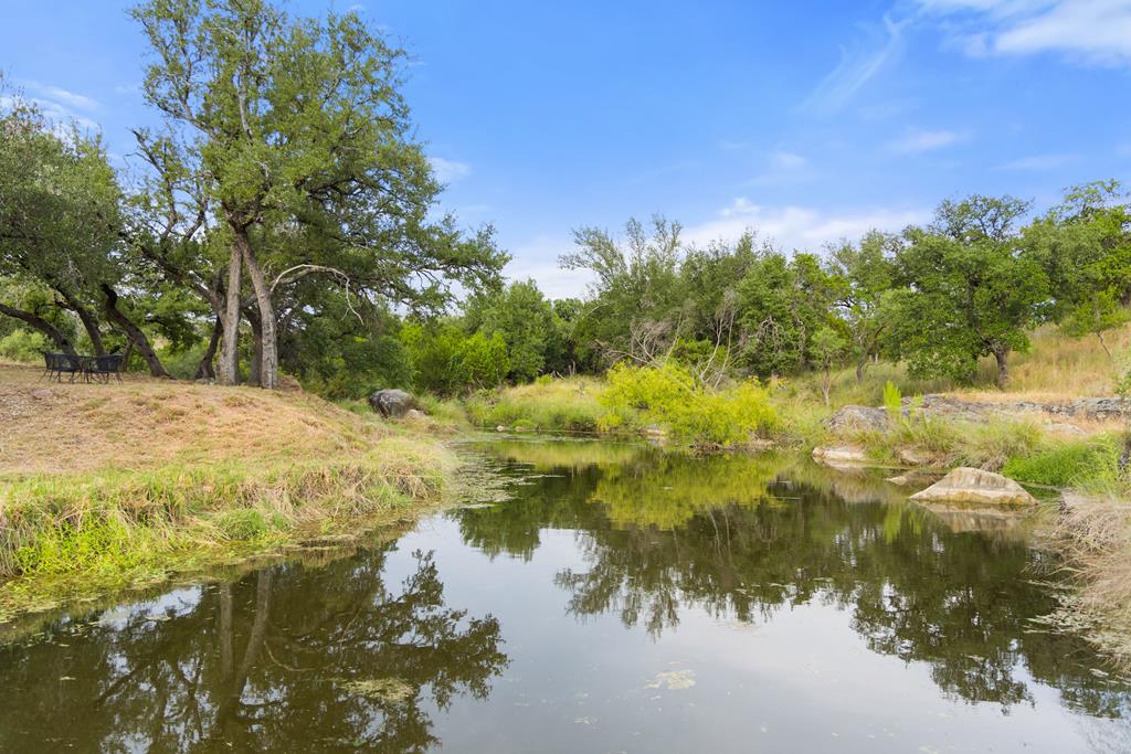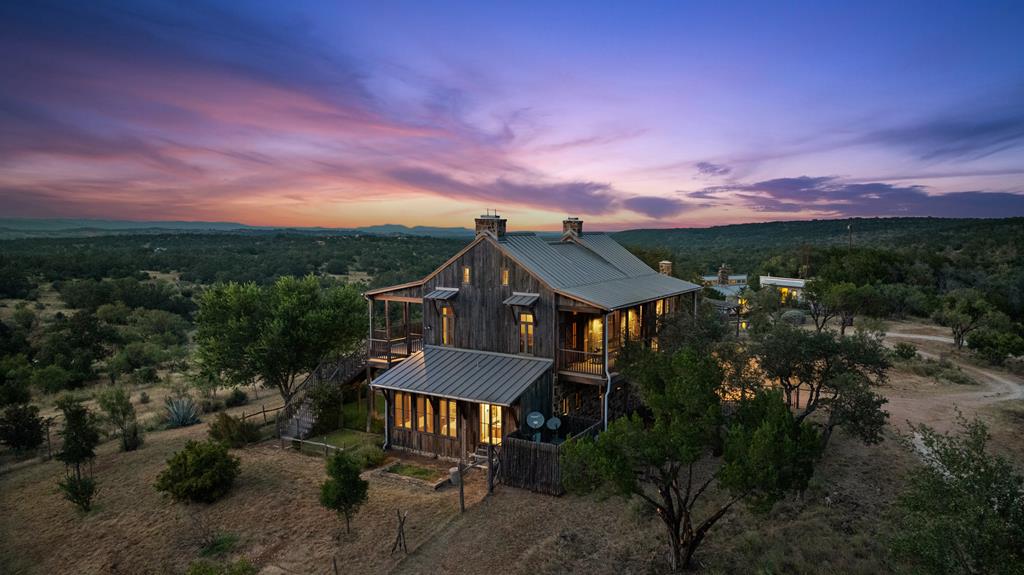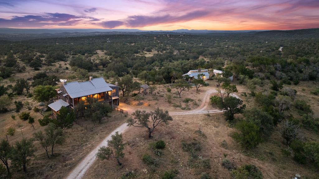 At the heart of the ranch lies a custom two-story home, built in 2008 designed by Tony Martin. The thoughtfully designed residence offers a seamless blend of rustic elegance and modern comfort, featuring a primary suite and guest quarters on the main level, along with a wine cellar, media room, and a sunroom that captures sweeping views. The upper level welcomes you with a grand dog trot entrance leading into an open-concept kitchen and living area, as well as a well-appointed den/study. Warmth and craftsmanship are evident throughout, with four interior fireplaces, Tennessee hewn timbers, reclaimed pine and oak finishes, and extensive custom rock masonry both inside and out. Multiple covered porches overlook the breathtaking Hill Country landscape, perfect for entertaining or quiet relaxation. For guests, a separate two-unit bunkhouse compound offers accommodations for 10+ people, complete with an in-ground swimming pool, outdoor living area, central HVAC, rustic fireplace, Franklin stove, and a full kitchen. A six-bay barn on a concrete slab provides ample storage, a workshop, and space for ranch equipment and vehicles. Also, located between the main house & guest houses is a rustic stone pergola taking in the impressive views & wildlife. Land & Water: The land is a beautiful mix of open pastures and wooded areas, thoughtfully managed with selective cedar clearing to promote native grasses and mature hardwoods including oak varieties, post oak, cedar elm and many other native species. The topography features gently rolling terrain, dramatic rock outcroppings, and panoramic views of the surrounding countryside. Water resources are a standout feature: two ponds, a concrete-dammed, spring-fed creek (Big Branch), and the presence of a rare dry-stacked stone wall along much of the western boundary add both function and character. The property is perimeter fenced and capable of supporting livestock. Rainfall on the main house is collected and piped down to the pond off the back side of the house. Conservation: This property is protected by a conservation easement, ensuring that its natural habitats, scenic vistas, and ecological value are preserved in perpetuity, while still allowing for private use and enjoyment.