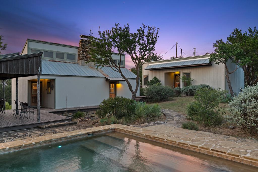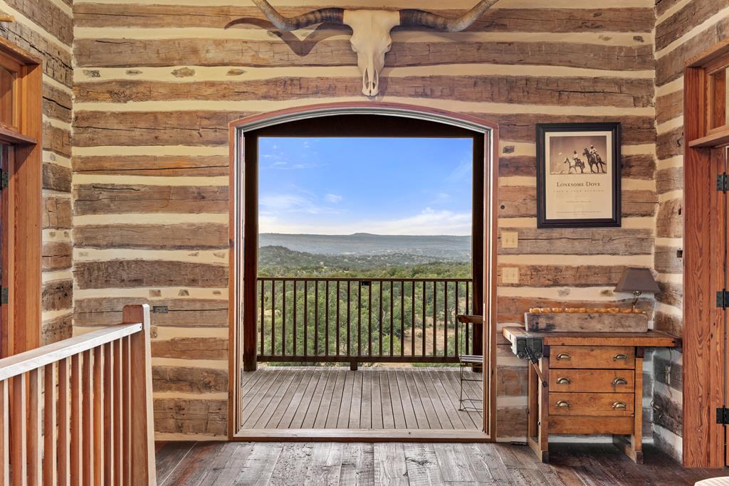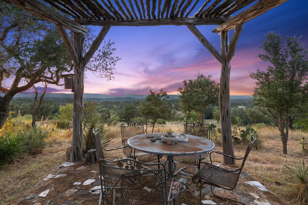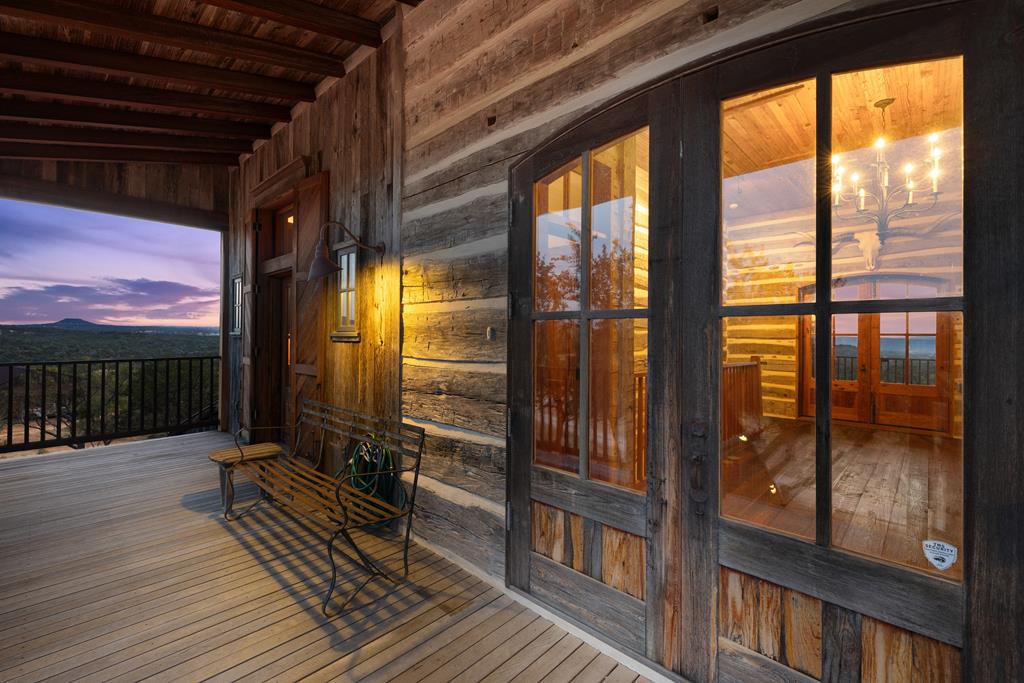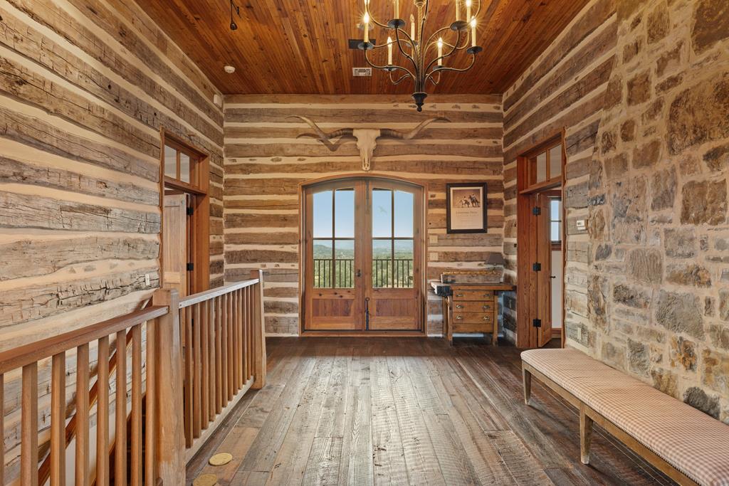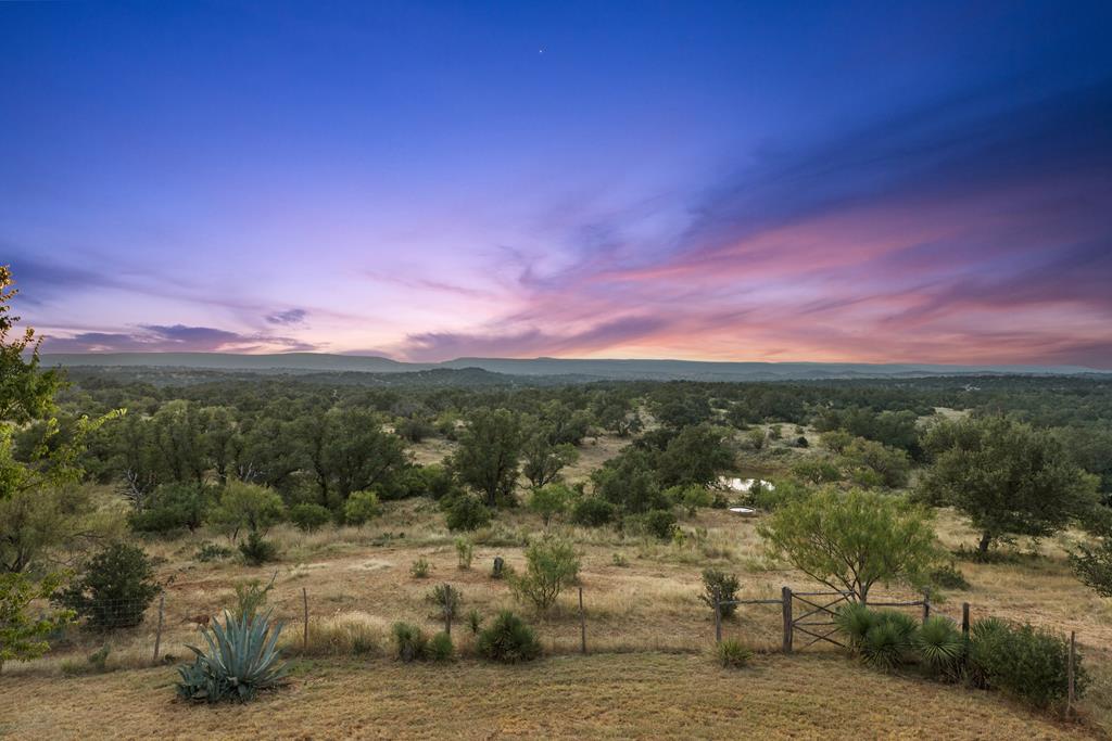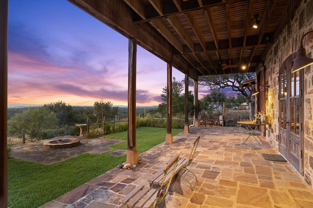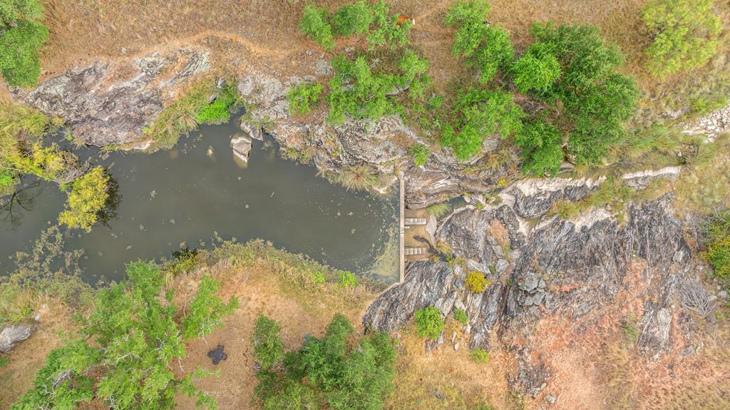 At the heart of the ranch lies a custom two-story home, built in 2008 designed by Tony Martin. The thoughtfully designed residence offers a seamless blend of rustic elegance and modern comfort, featuring a primary suite and guest quarters on the main level, along with a wine cellar, media room, and a sunroom that captures sweeping views. The upper level welcomes you with a grand dog trot entrance leading into an open-concept kitchen and living area, as well as a well-appointed den/study. Warmth and craftsmanship are evident throughout, with four interior fireplaces, Tennessee hewn timbers, reclaimed pine and oak finishes, and extensive custom rock masonry both inside and out. Multiple covered porches overlook the breathtaking Hill Country landscape, perfect for entertaining or quiet relaxation. For guests, a separate two-unit bunkhouse compound offers accommodations for 10+ people, complete with an in-ground swimming pool, outdoor living area, central HVAC, rustic fireplace, Franklin stove, and a full kitchen. A six-bay barn on a concrete slab provides ample storage, a workshop, and space for ranch equipment and vehicles. Also, located between the main house & guest houses is a rustic stone pergola taking in the impressive views & wildlife. Land & Water: The land is a beautiful mix of open pastures and wooded areas, thoughtfully managed with selective cedar clearing to promote native grasses and mature hardwoods including oak varieties, post oak, cedar elm and many other native species. The topography features gently rolling terrain, dramatic rock outcroppings, and panoramic views of the surrounding countryside. Water resources are a standout feature: two ponds, a concrete-dammed, spring-fed creek (Big Branch), and the presence of a rare dry-stacked stone wall along much of the western boundary add both function and character. The property is perimeter fenced and capable of supporting livestock. Rainfall on the main house is collected and piped down to the pond off the back side of the house. Conservation: This property is protected by a conservation easement, ensuring that its natural habitats, scenic vistas, and ecological value are preserved in perpetuity, while still allowing for private use and enjoyment.