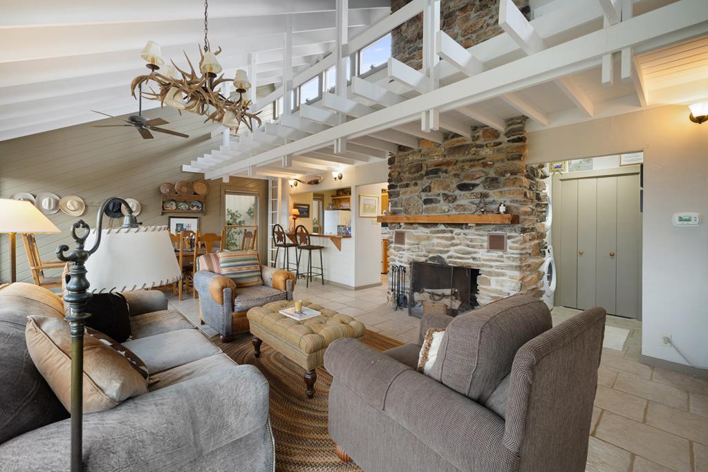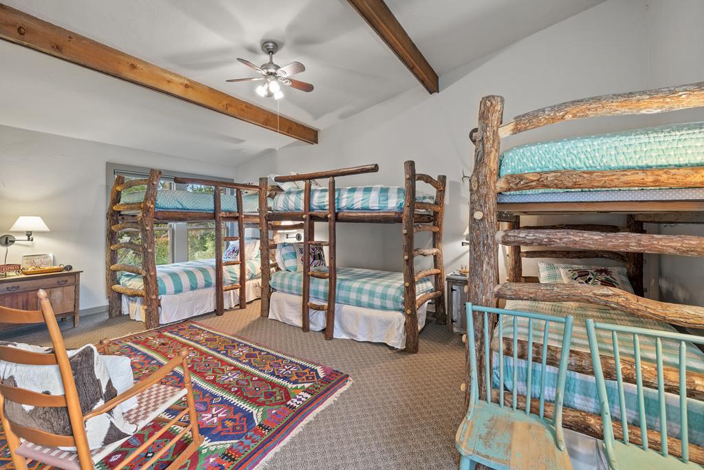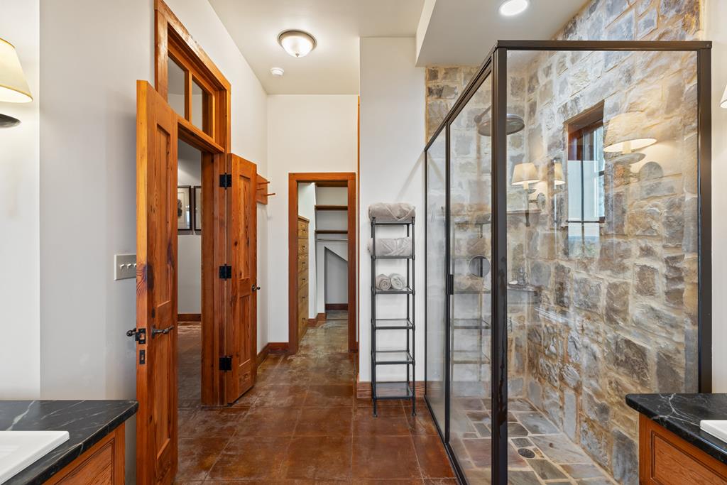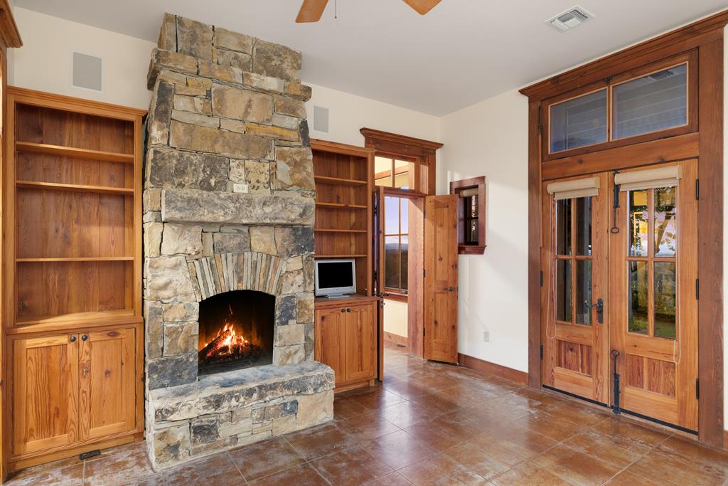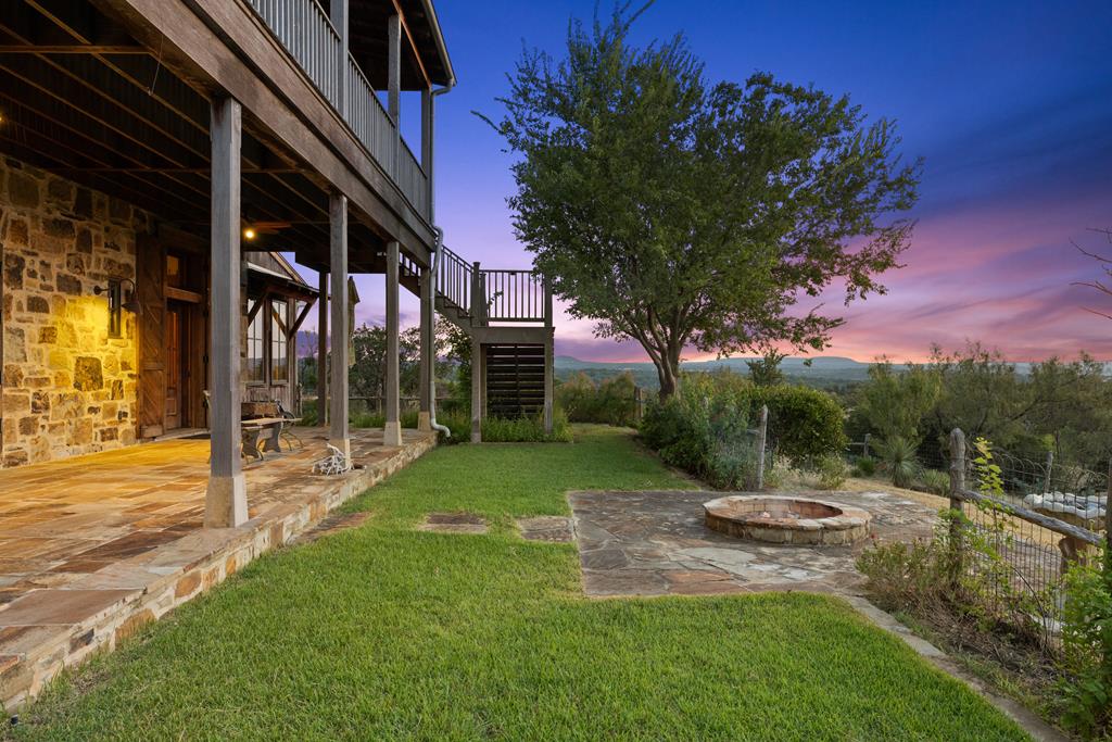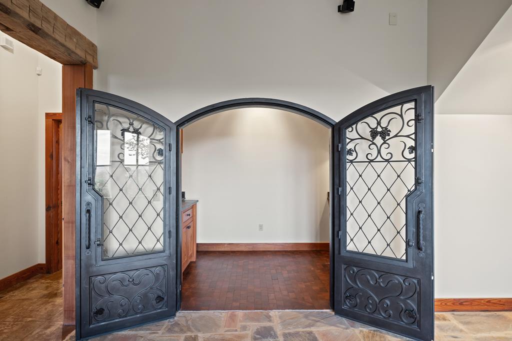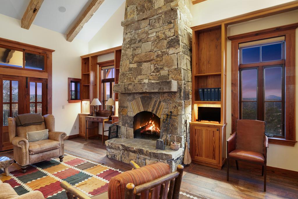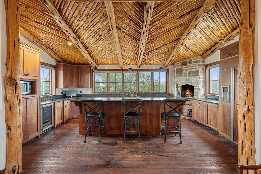 At the heart of the ranch lies a custom two-story home, built in 2008 designed by Tony Martin. The thoughtfully designed residence offers a seamless blend of rustic elegance and modern comfort, featuring a primary suite and guest quarters on the main level, along with a wine cellar, media room, and a sunroom that captures sweeping views. The upper level welcomes you with a grand dog trot entrance leading into an open-concept kitchen and living area, as well as a well-appointed den/study. Warmth and craftsmanship are evident throughout, with four interior fireplaces, Tennessee hewn timbers, reclaimed pine and oak finishes, and extensive custom rock masonry both inside and out. Multiple covered porches overlook the breathtaking Hill Country landscape, perfect for entertaining or quiet relaxation. For guests, a separate two-unit bunkhouse compound offers accommodations for 10+ people, complete with an in-ground swimming pool, outdoor living area, central HVAC, rustic fireplace, Franklin stove, and a full kitchen. A six-bay barn on a concrete slab provides ample storage, a workshop, and space for ranch equipment and vehicles. Also, located between the main house & guest houses is a rustic stone pergola taking in the impressive views & wildlife. Land & Water: The land is a beautiful mix of open pastures and wooded areas, thoughtfully managed with selective cedar clearing to promote native grasses and mature hardwoods including oak varieties, post oak, cedar elm and many other native species. The topography features gently rolling terrain, dramatic rock outcroppings, and panoramic views of the surrounding countryside. Water resources are a standout feature: two ponds, a concrete-dammed, spring-fed creek (Big Branch), and the presence of a rare dry-stacked stone wall along much of the western boundary add both function and character. The property is perimeter fenced and capable of supporting livestock. Rainfall on the main house is collected and piped down to the pond off the back side of the house. Conservation: This property is protected by a conservation easement, ensuring that its natural habitats, scenic vistas, and ecological value are preserved in perpetuity, while still allowing for private use and enjoyment.