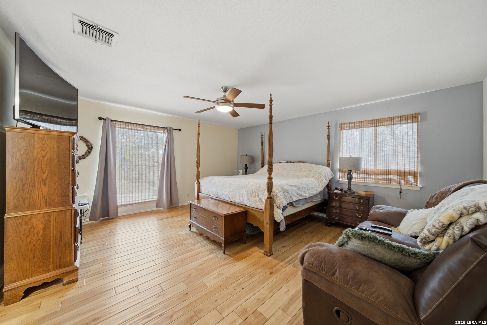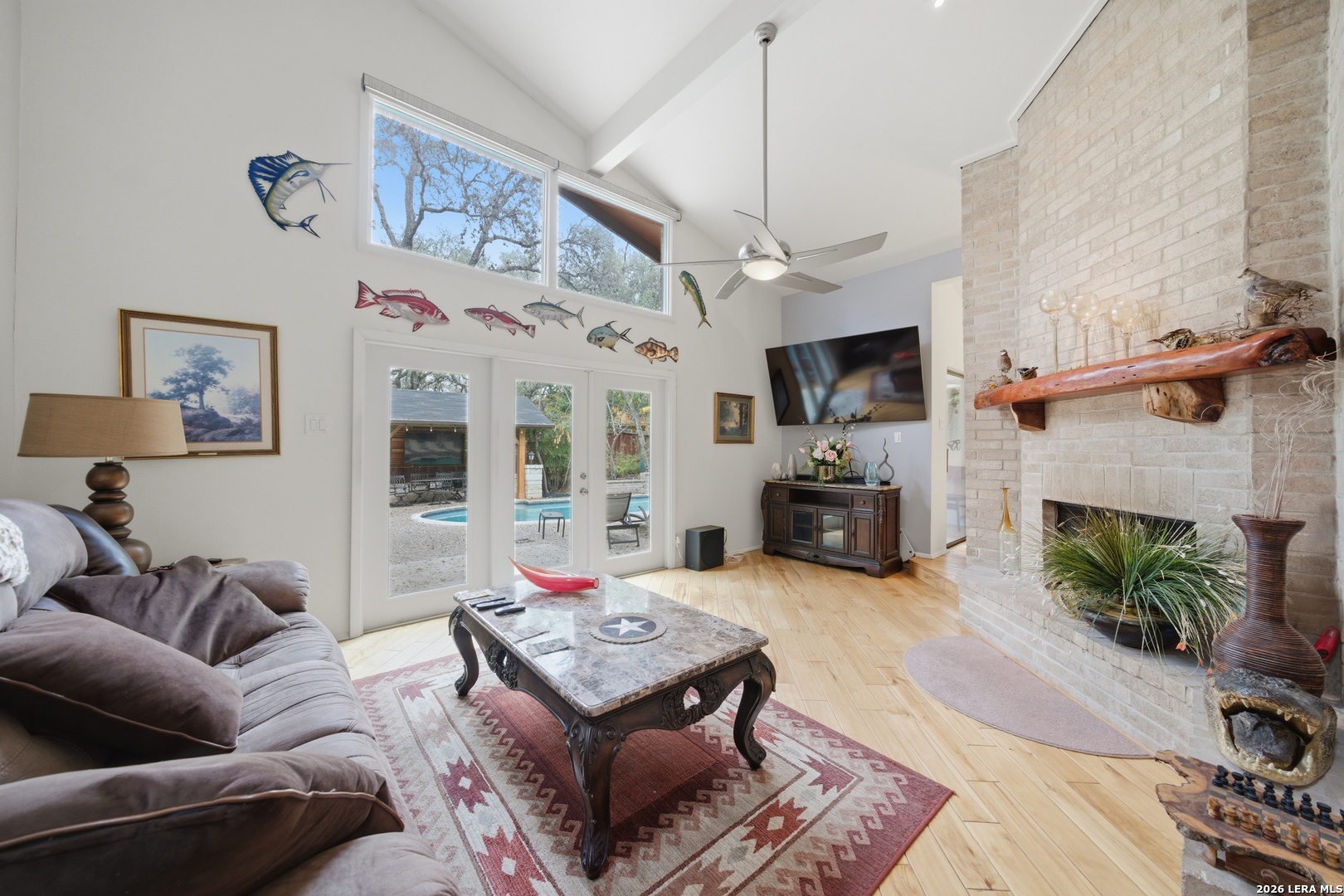 This stunning home features soaring ceilings, abundant natural light, and beautiful birch wood flooring throughout. The spacious layout includes a sunroom, formal dining room, breakfast area, and a dedicated office overlooking the backyard. A flexible fourth bedroom offers the perfect space for a media room, game room, or guest suite. The home also includes a large third-floor living area with a fireplace, wet bar, and adjacent bathroom, along with an additional seating area ideal for entertaining. Both bathrooms have been remodeled with elegant stone finishes, and the primary bathroom features a walk-in shower with dual shower heads. The home is equipped with three HVAC systems for efficient climate control. The outdoor space offers multiple seating and dining areas, including an impressive 3415 covered patio with a mounted TV, beautiful birch and Douglas fir wood accents, and high-end ceiling fans with remote controls. Mature oak trees, outdoor lighting, and a 10-foot privacy fence create a peaceful and private setting. Additional features include a water softener.