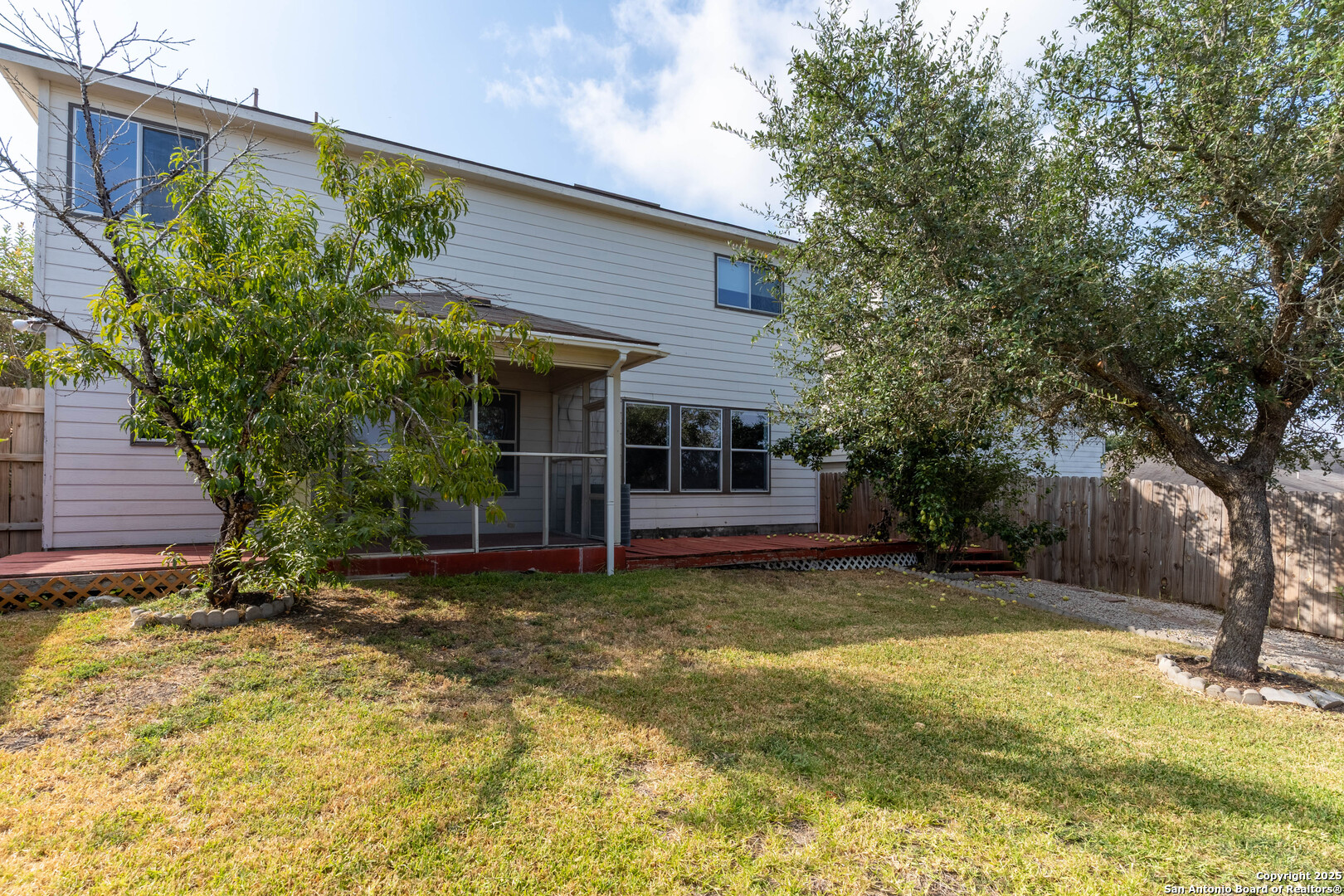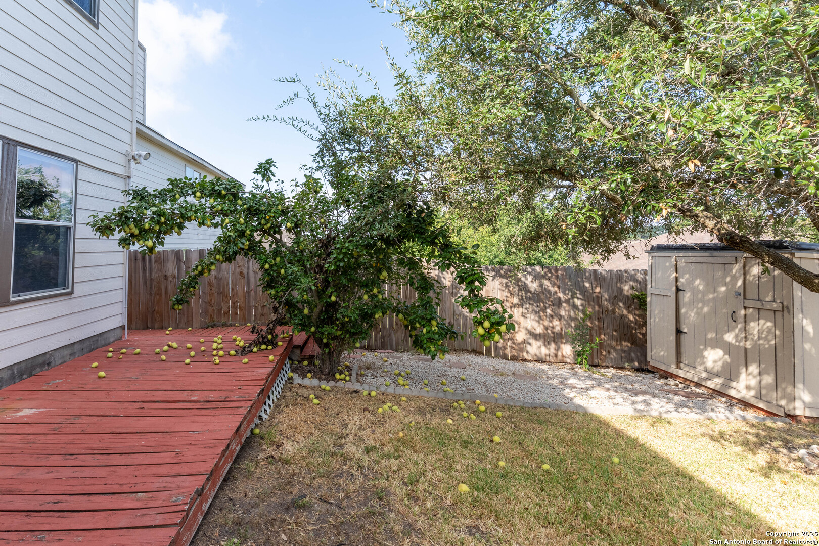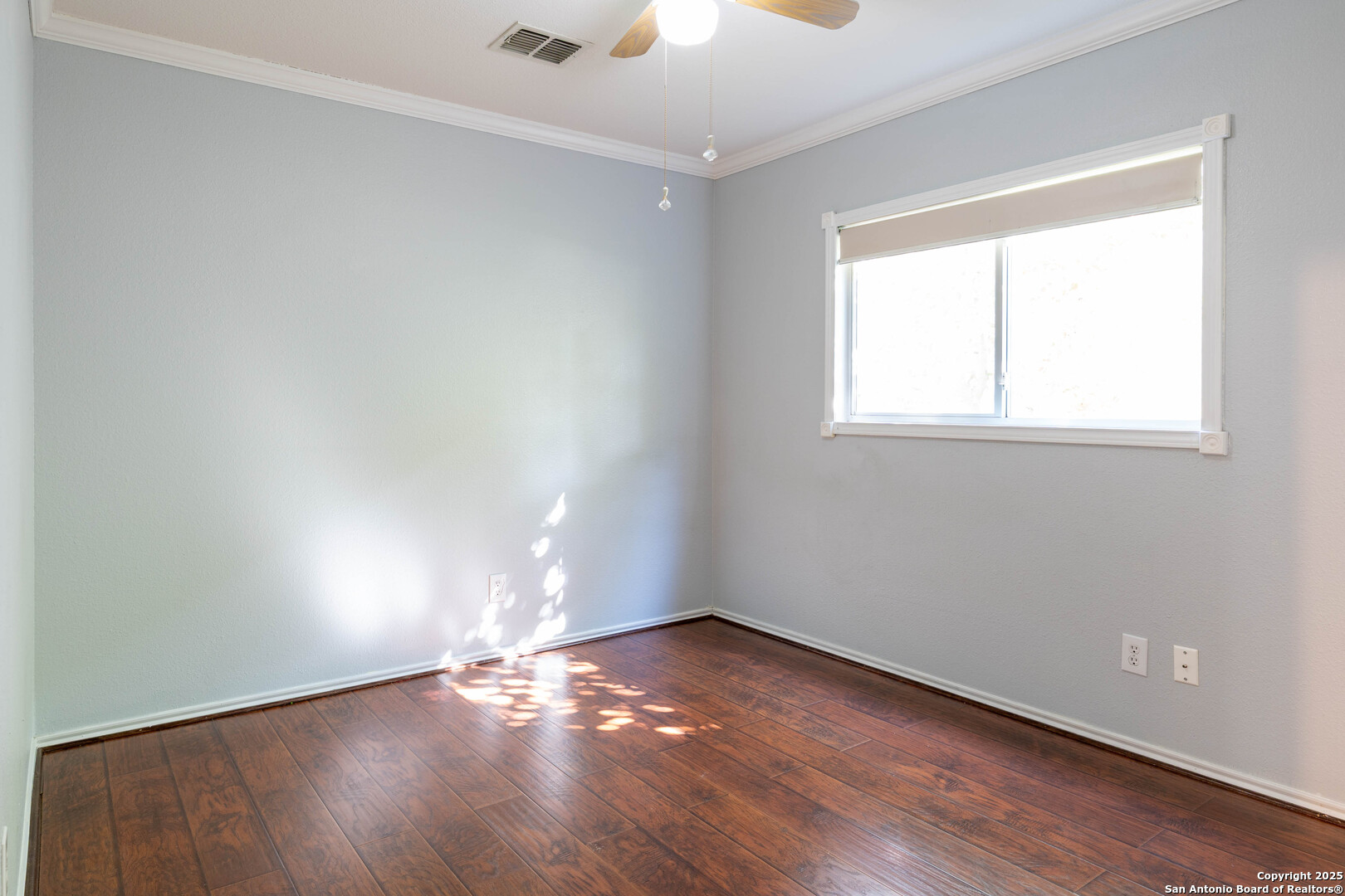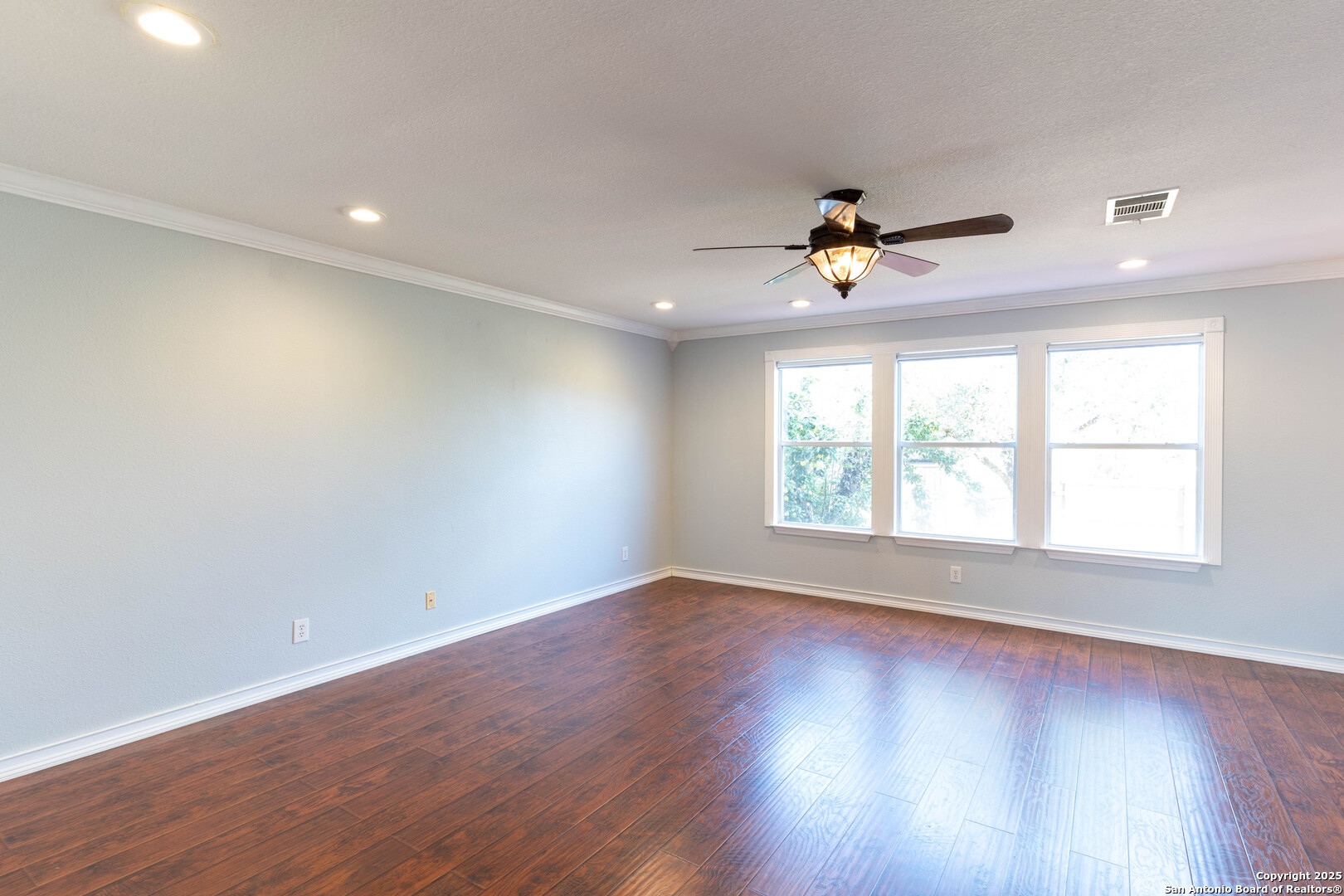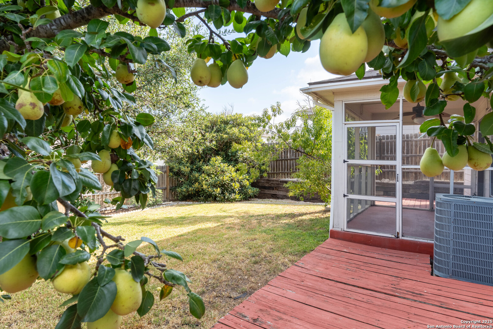 GUEST BEDROOM AND FULL BATH DOWN!! Step into this beautifully maintained two-story home in Creek Haven, offering generous living space and thoughtful updates throughout. The first floor boasts a versatile guest bedroom and full bath-ideal for visitors or multi-generational living. An open-concept layout connects the spacious living area and chef's kitchen featuring abundant cabinet and counter space, an under-mount sink, and a charming custom breakfast bench. Glistening wood floors, crown molding, and recessed lighting enhance the home's elegant appeal. Upstairs, a large game room provides the perfect spot for movie nights or casual entertaining. The massive primary suite is a true retreat, complete with a custom closet organizer and a spa-like bath with separate tub and shower. Two additional bedrooms and a full bath with double vanity round out the second level. Outdoors, enjoy a covered and screened patio, fruit-bearing pear (please help yourself to a pear or two) and peach trees, and a storage shed. Located in top-rated NEISD and close to Hwy 281, this home offers both convenience and comfort in a desirable neighborhood.