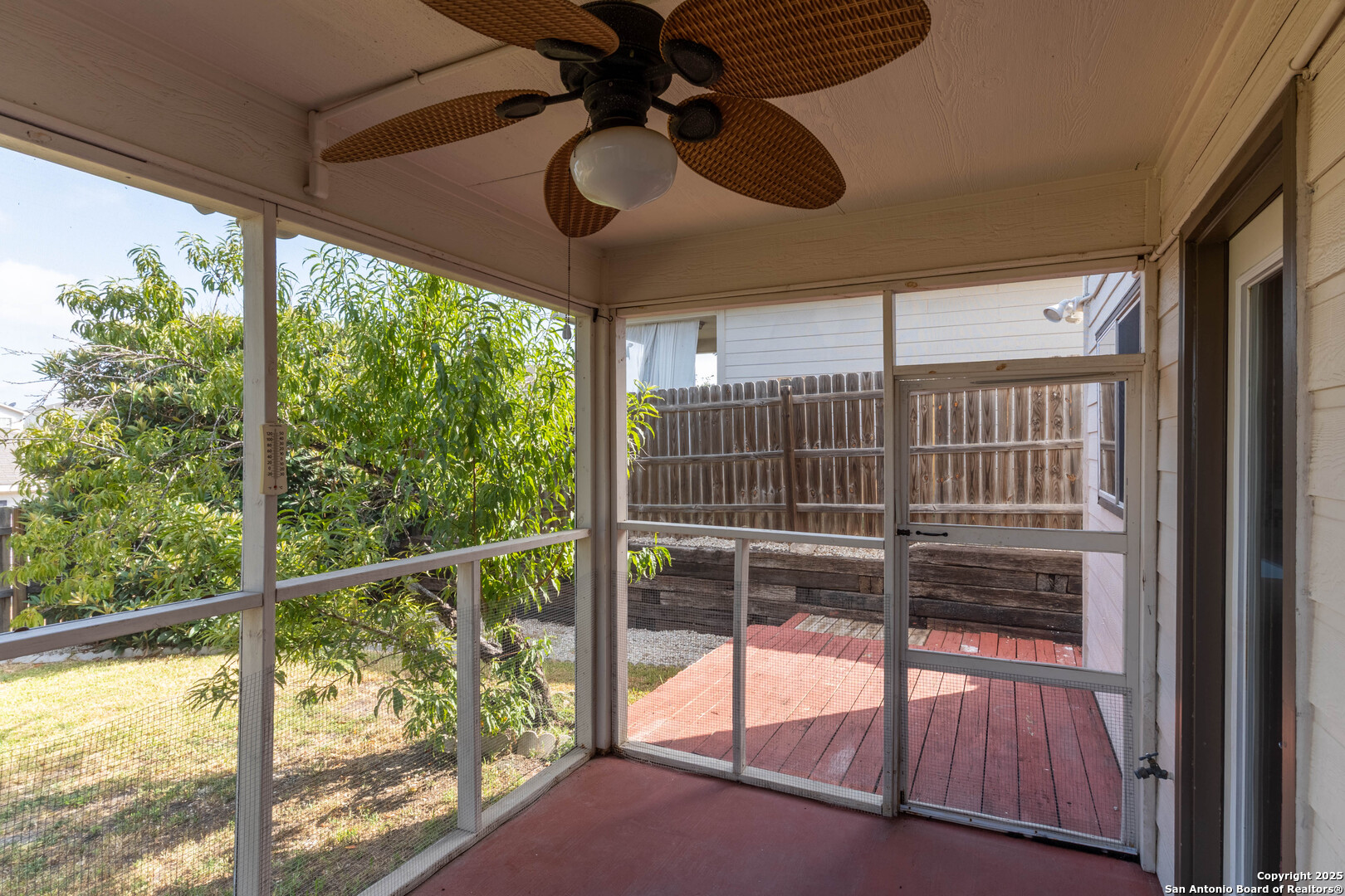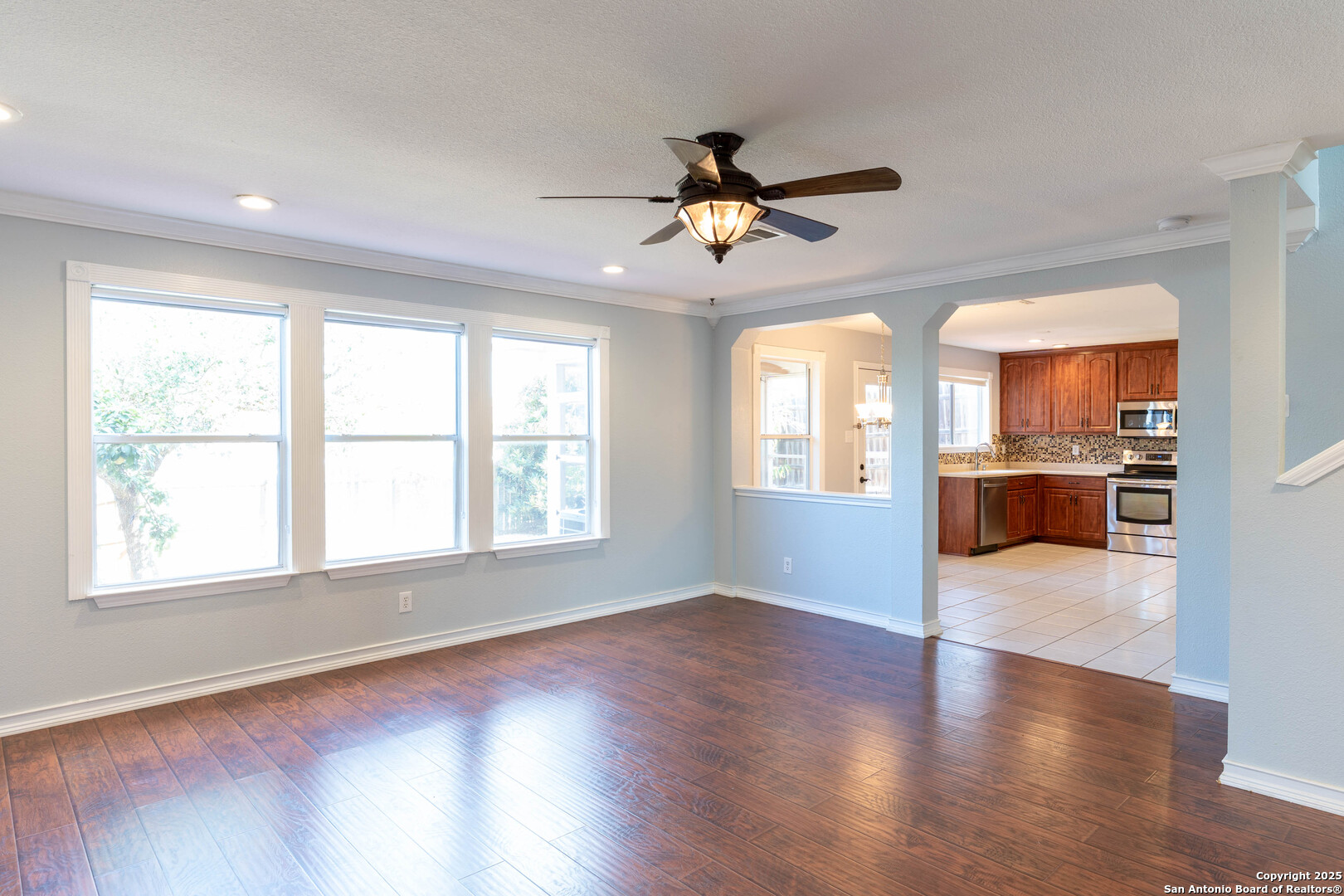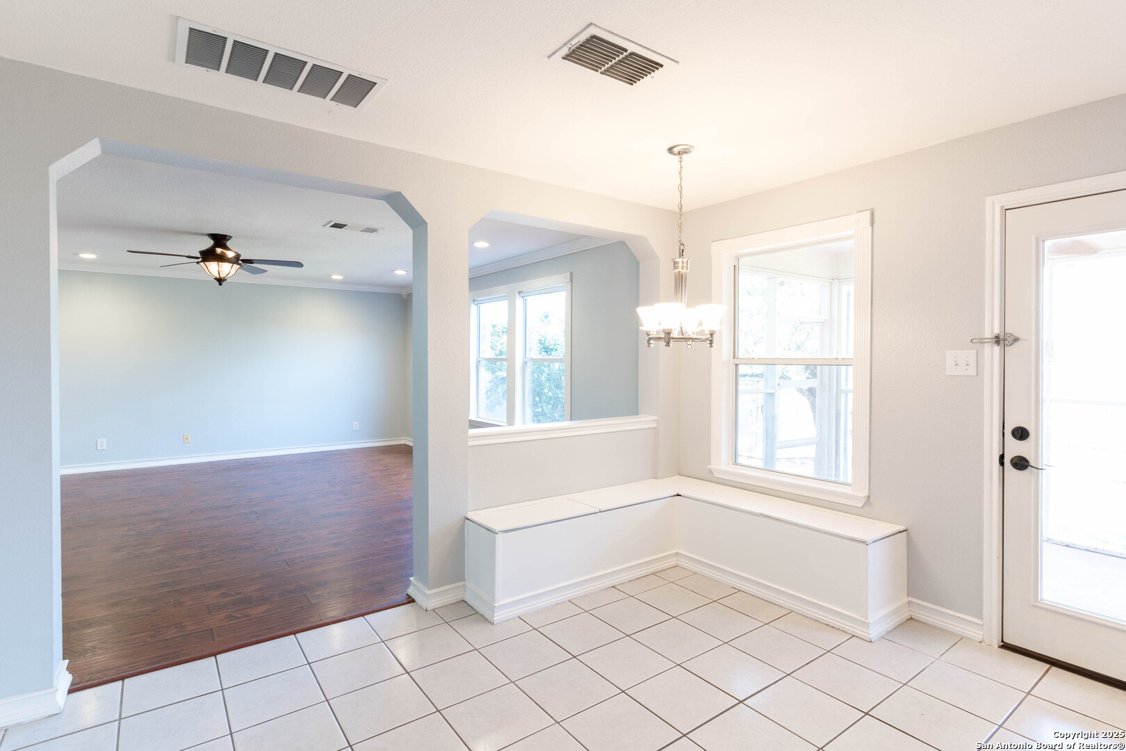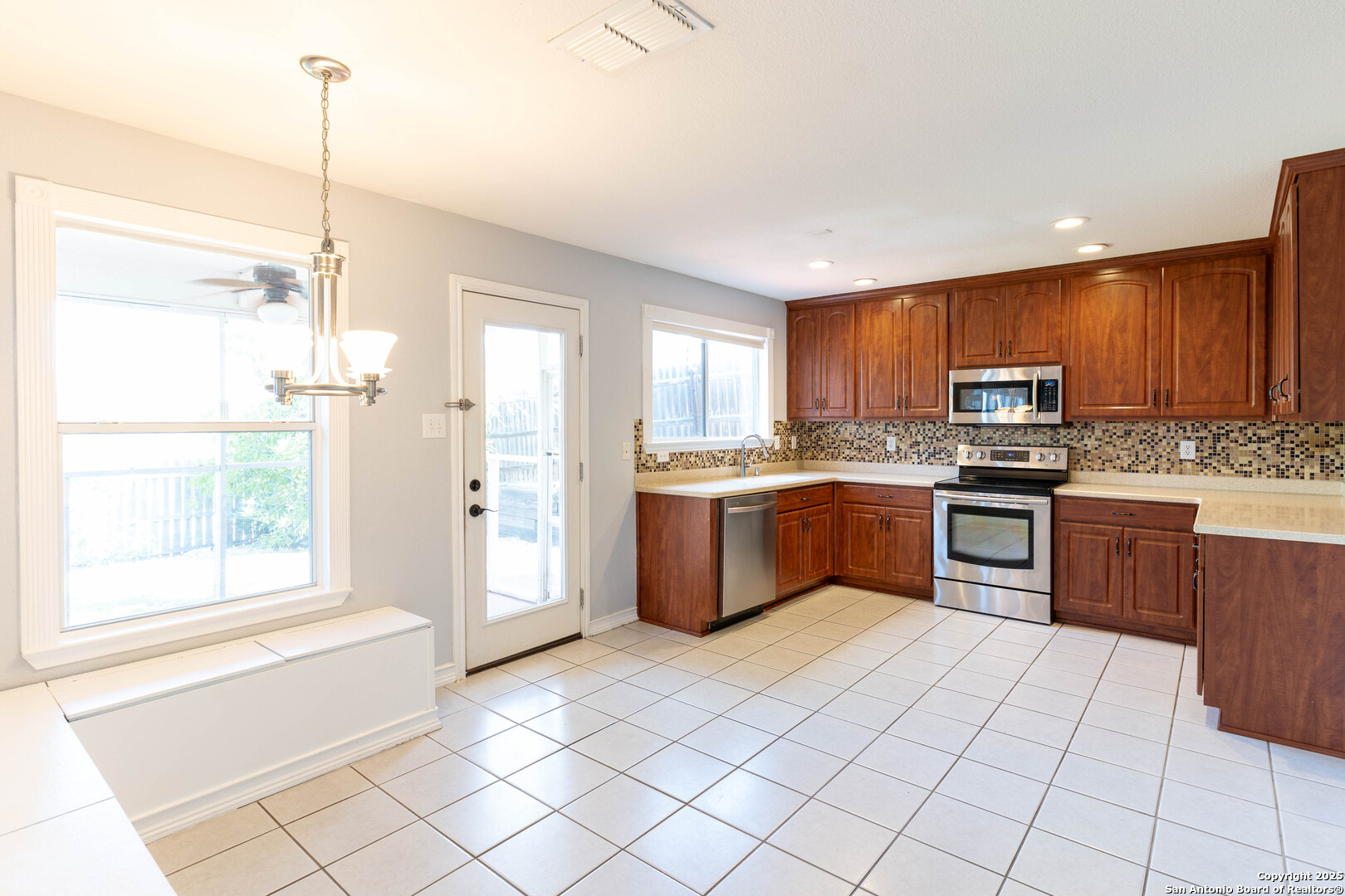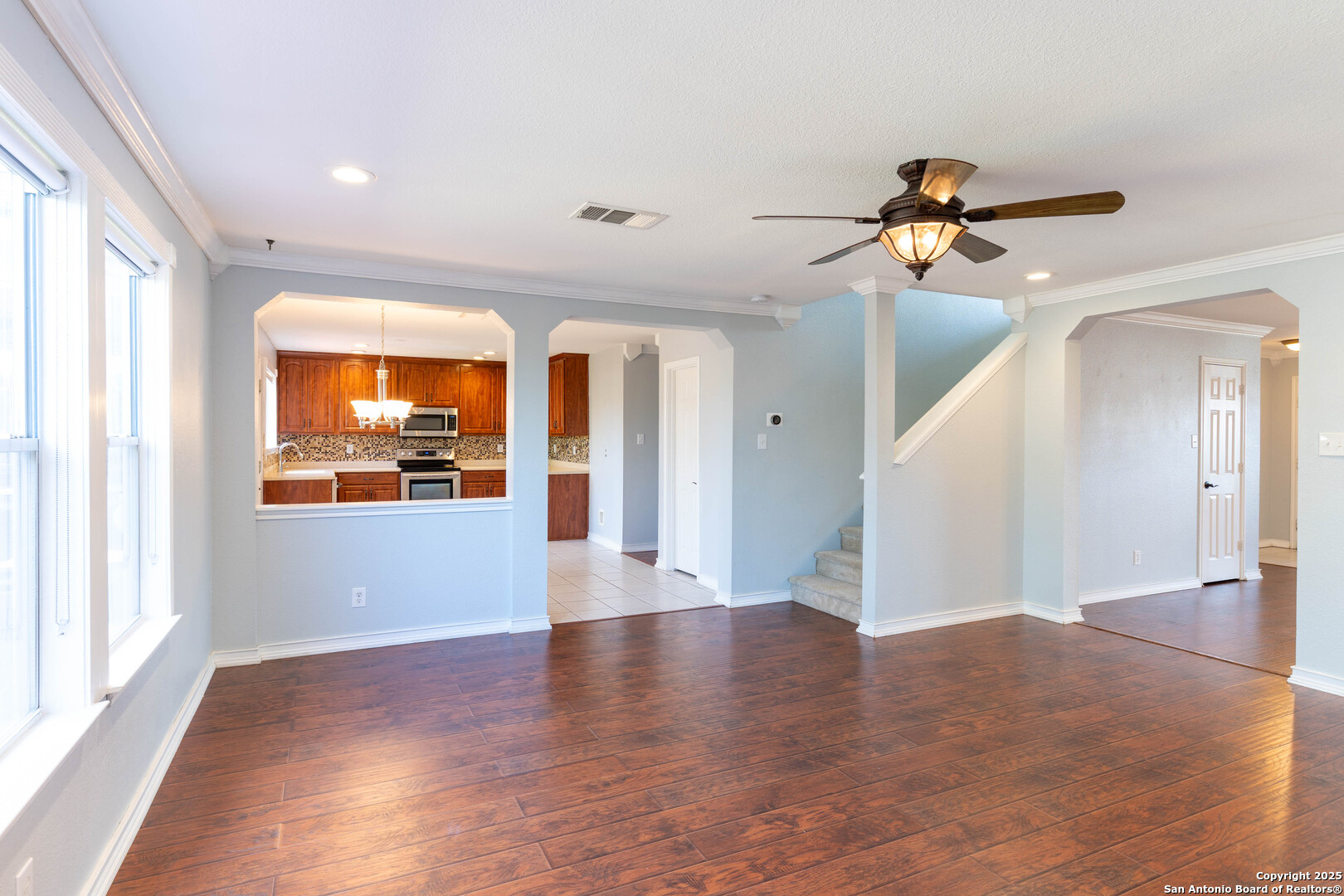 GUEST BEDROOM AND FULL BATH DOWN!! Step into this beautifully maintained two-story home in Creek Haven, offering generous living space and thoughtful updates throughout. The first floor boasts a versatile guest bedroom and full bath-ideal for visitors or multi-generational living. An open-concept layout connects the spacious living area and chef's kitchen featuring abundant cabinet and counter space, an under-mount sink, and a charming custom breakfast bench. Glistening wood floors, crown molding, and recessed lighting enhance the home's elegant appeal. Upstairs, a large game room provides the perfect spot for movie nights or casual entertaining. The massive primary suite is a true retreat, complete with a custom closet organizer and a spa-like bath with separate tub and shower. Two additional bedrooms and a full bath with double vanity round out the second level. Outdoors, enjoy a covered and screened patio, fruit-bearing pear (please help yourself to a pear or two) and peach trees, and a storage shed. Located in top-rated NEISD and close to Hwy 281, this home offers both convenience and comfort in a desirable neighborhood.