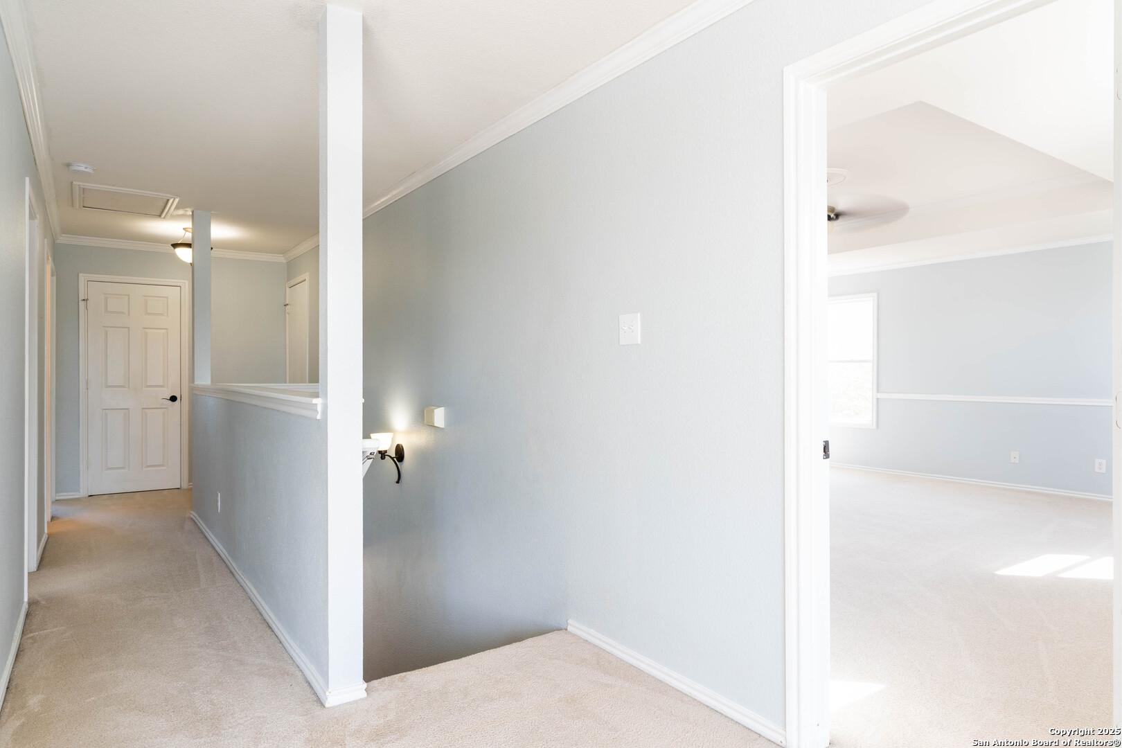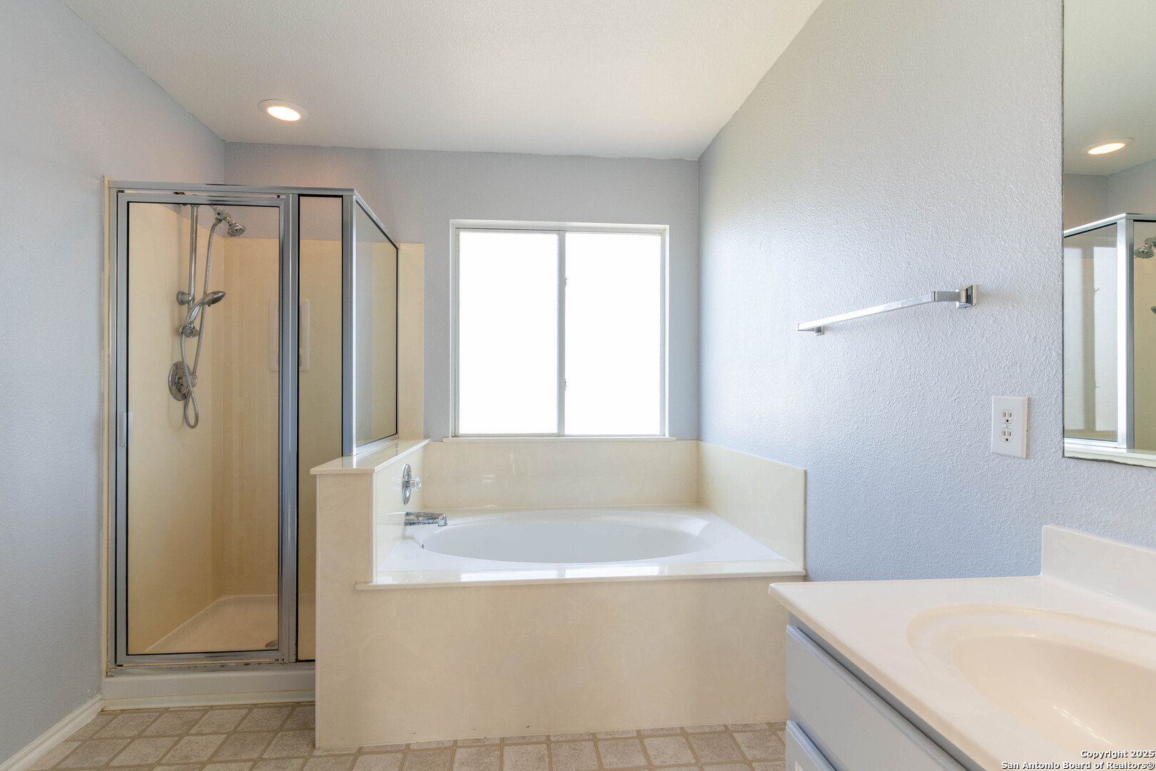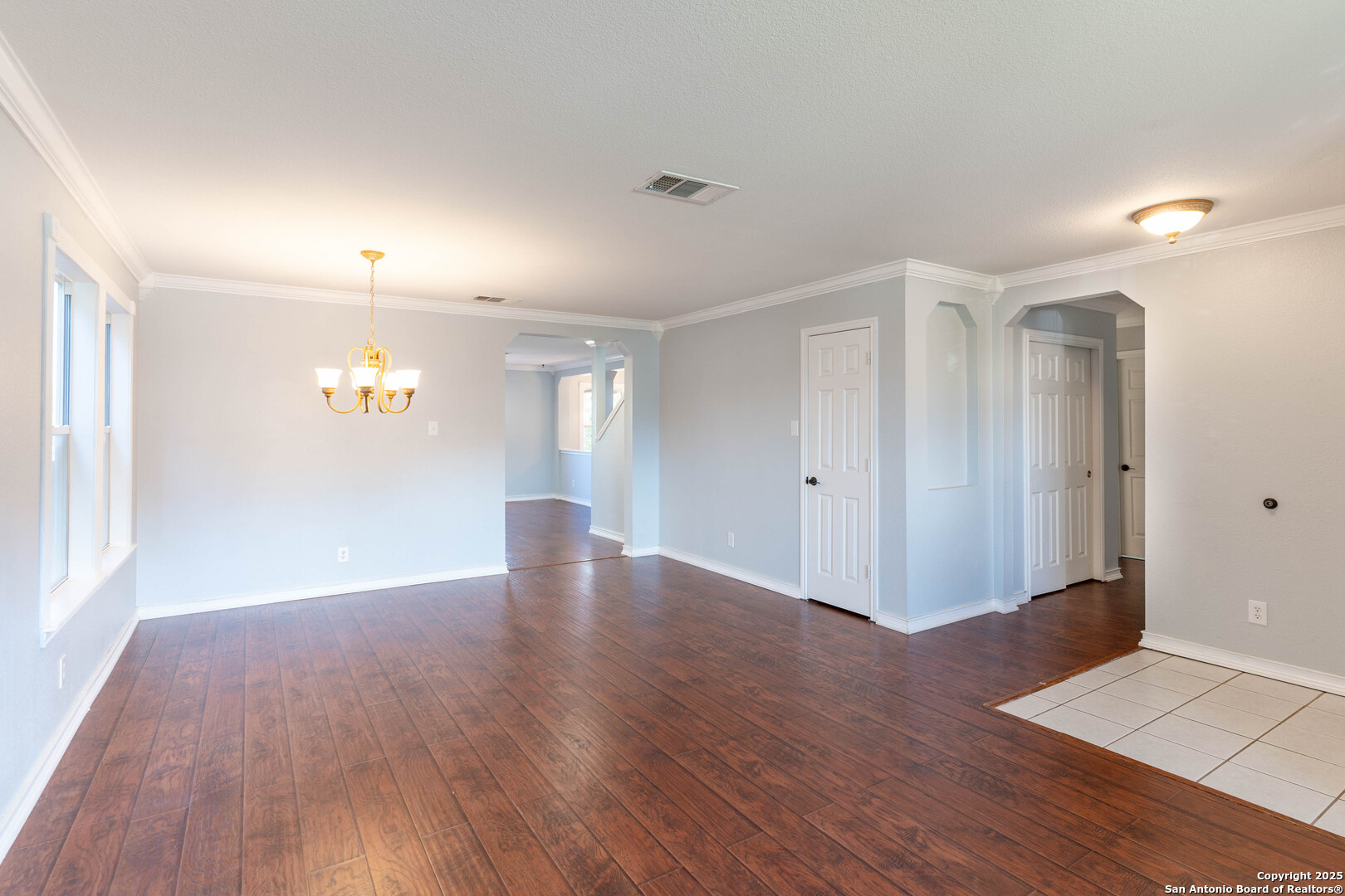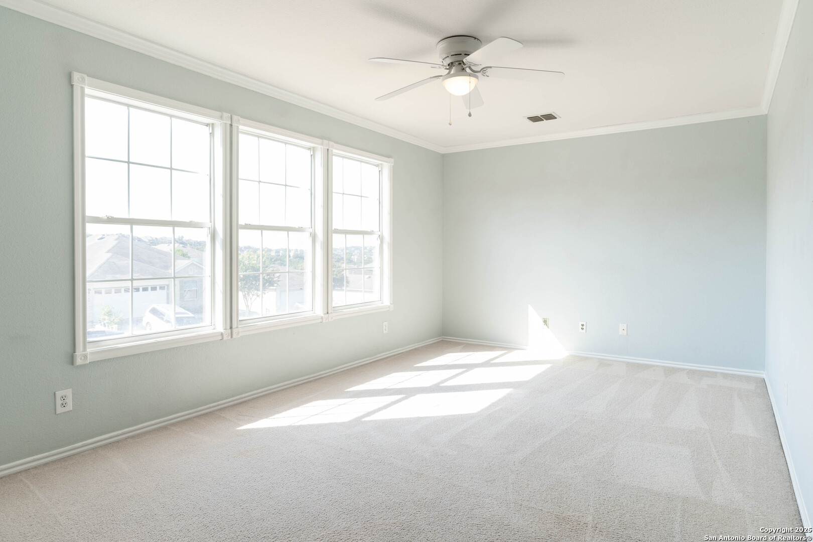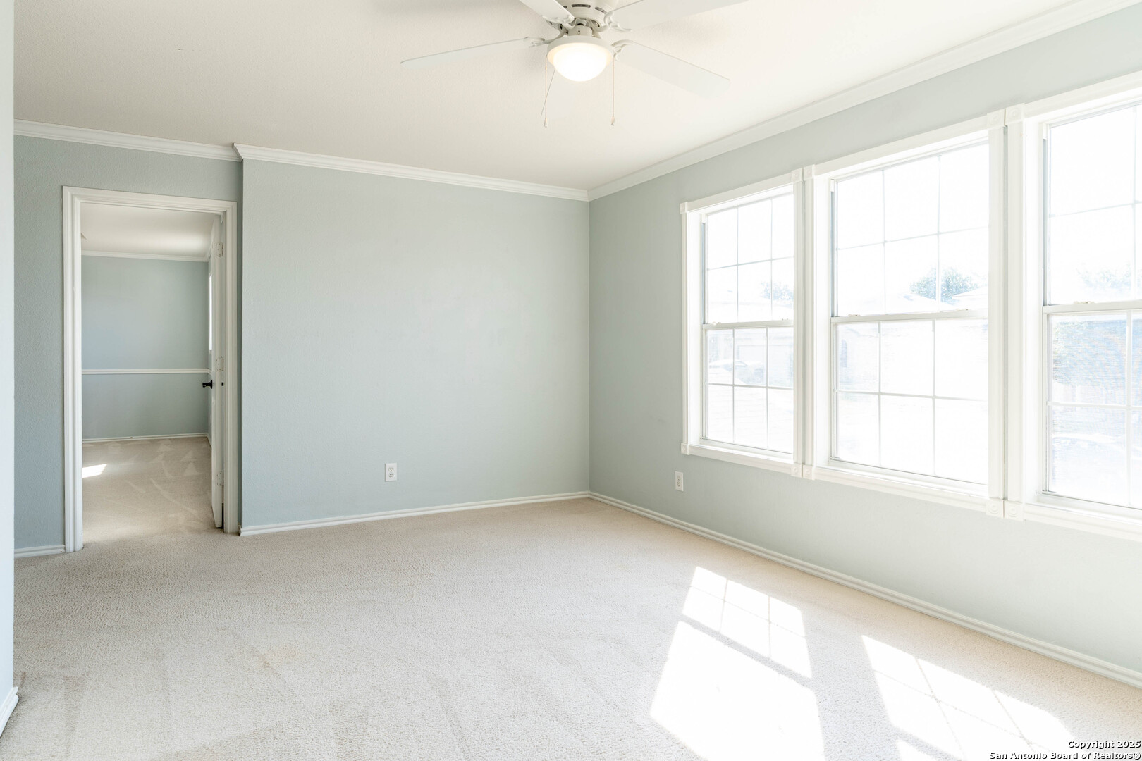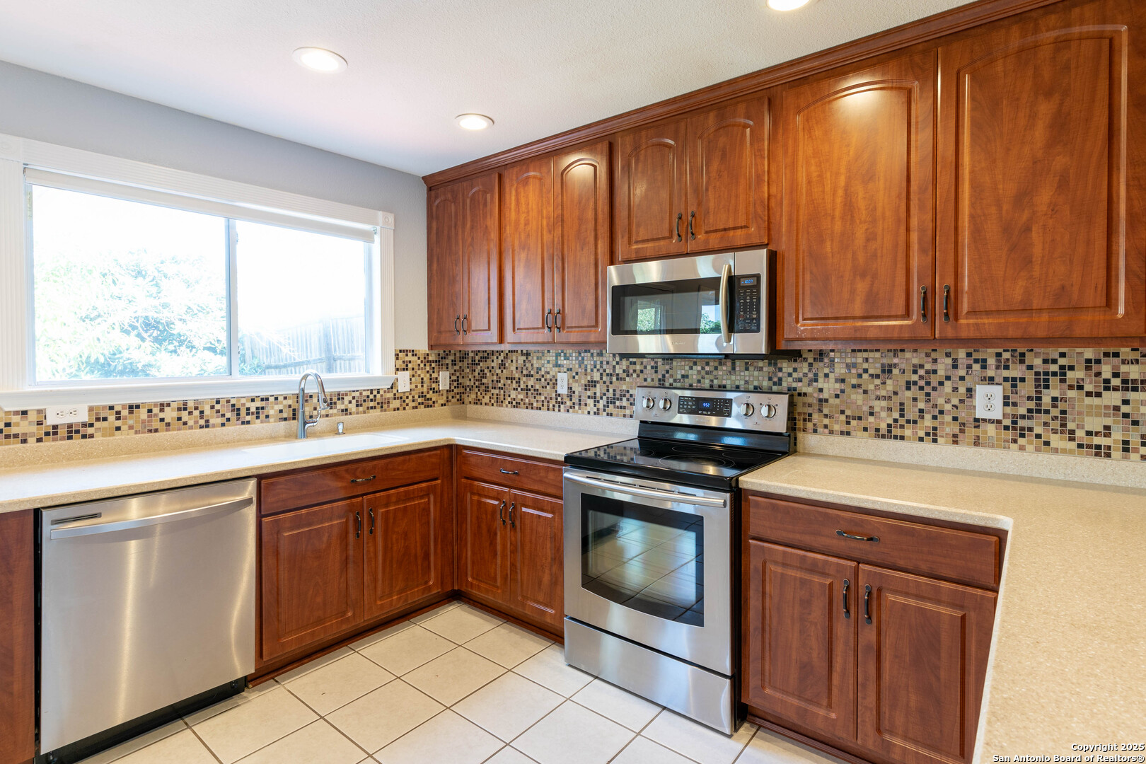 GUEST BEDROOM AND FULL BATH DOWN!! Step into this beautifully maintained two-story home in Creek Haven, offering generous living space and thoughtful updates throughout. The first floor boasts a versatile guest bedroom and full bath-ideal for visitors or multi-generational living. An open-concept layout connects the spacious living area and chef's kitchen featuring abundant cabinet and counter space, an under-mount sink, and a charming custom breakfast bench. Glistening wood floors, crown molding, and recessed lighting enhance the home's elegant appeal. Upstairs, a large game room provides the perfect spot for movie nights or casual entertaining. The massive primary suite is a true retreat, complete with a custom closet organizer and a spa-like bath with separate tub and shower. Two additional bedrooms and a full bath with double vanity round out the second level. Outdoors, enjoy a covered and screened patio, fruit-bearing pear (please help yourself to a pear or two) and peach trees, and a storage shed. Located in top-rated NEISD and close to Hwy 281, this home offers both convenience and comfort in a desirable neighborhood.