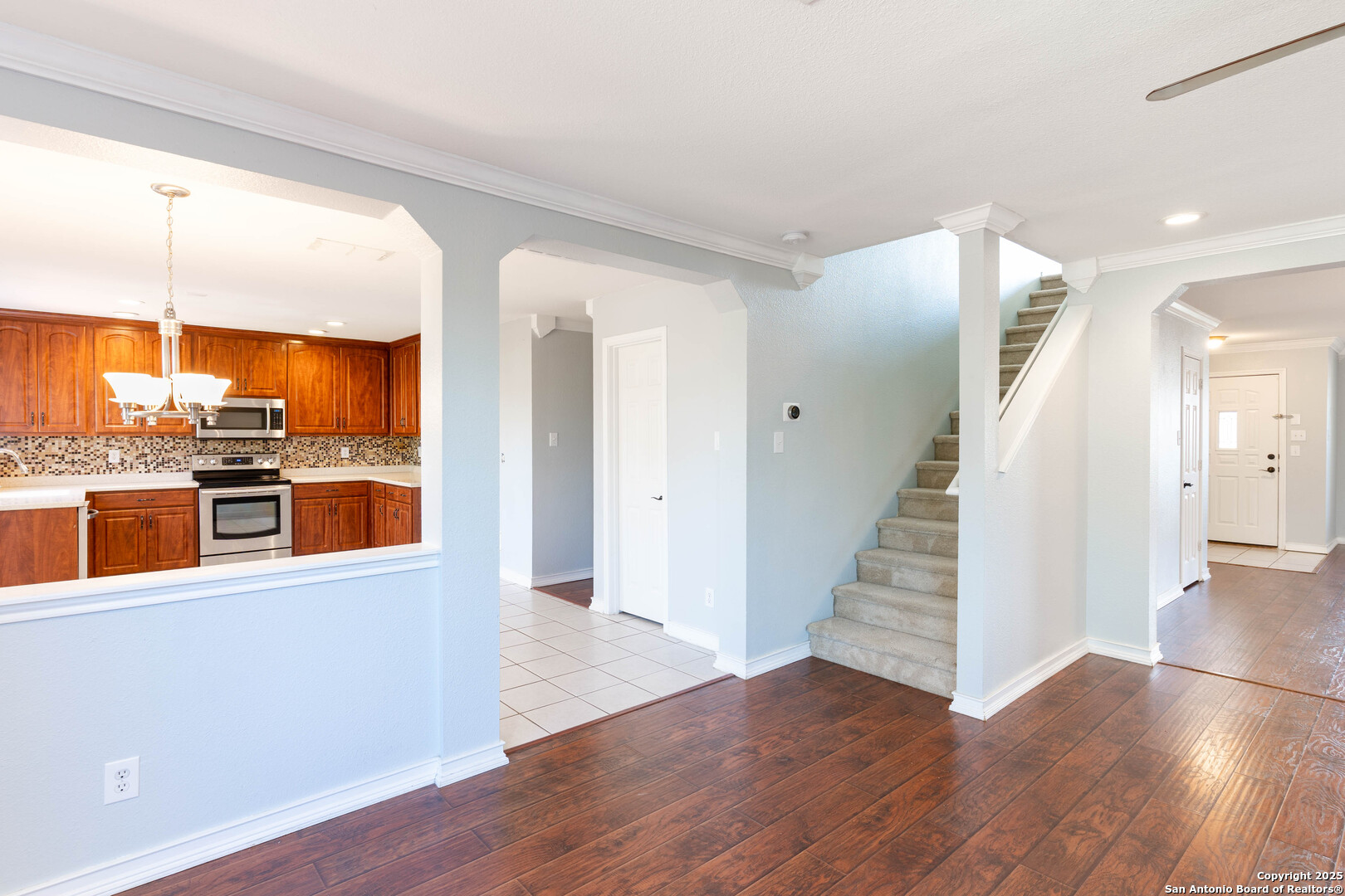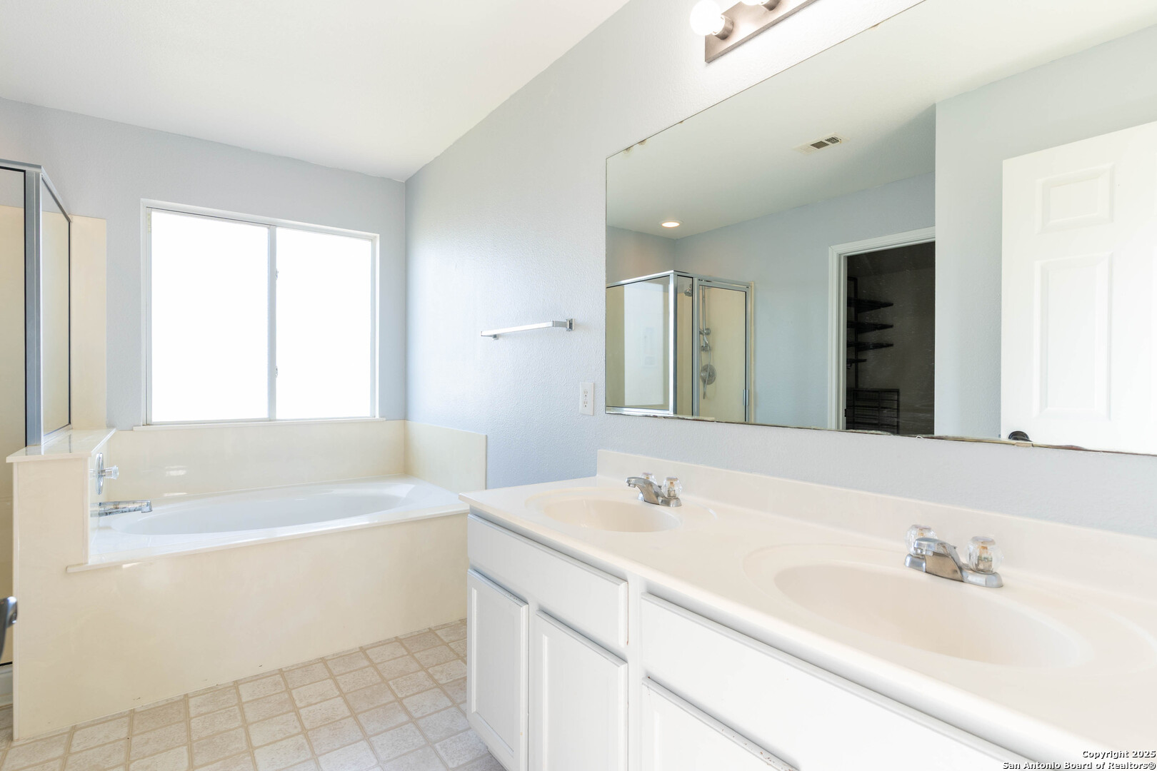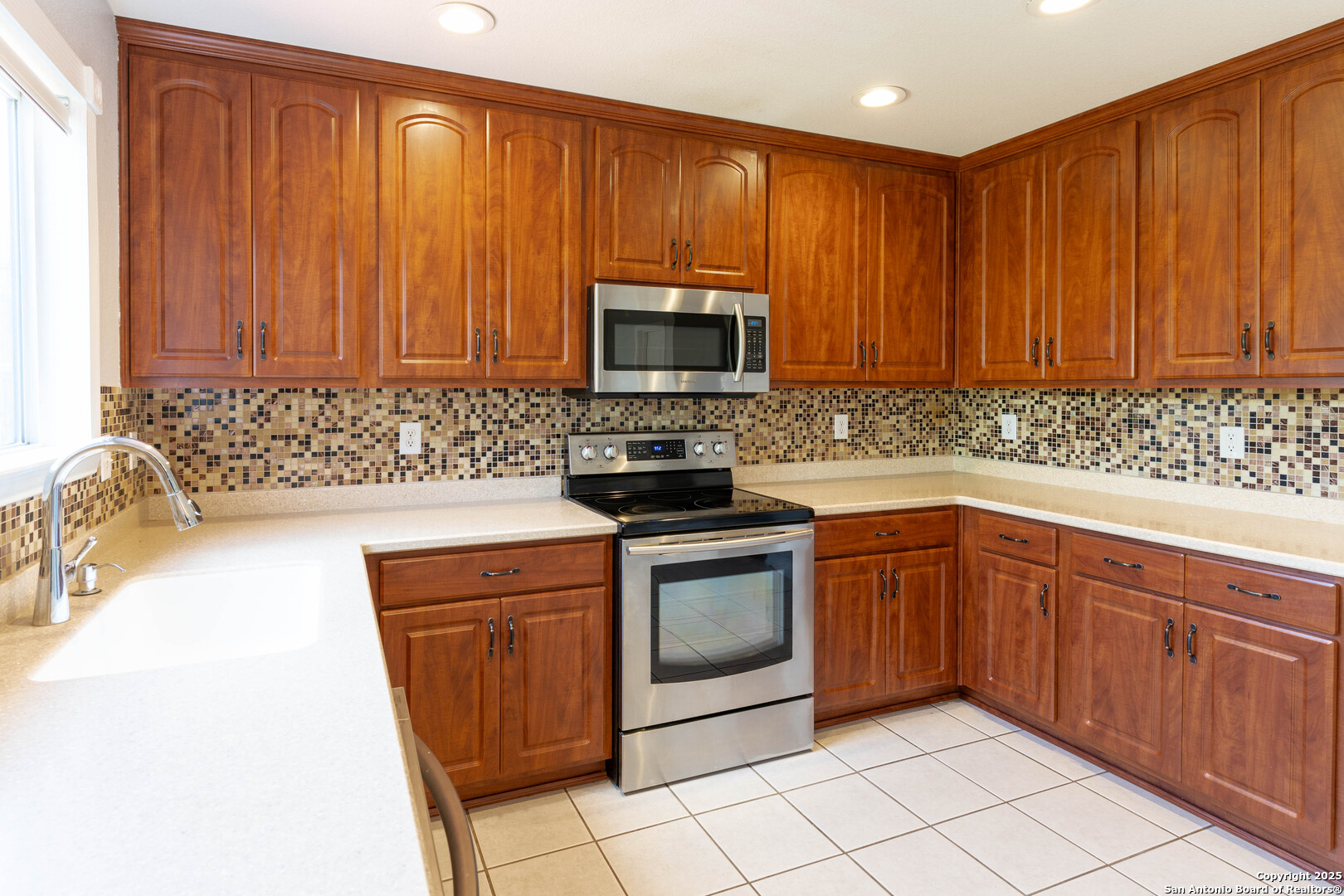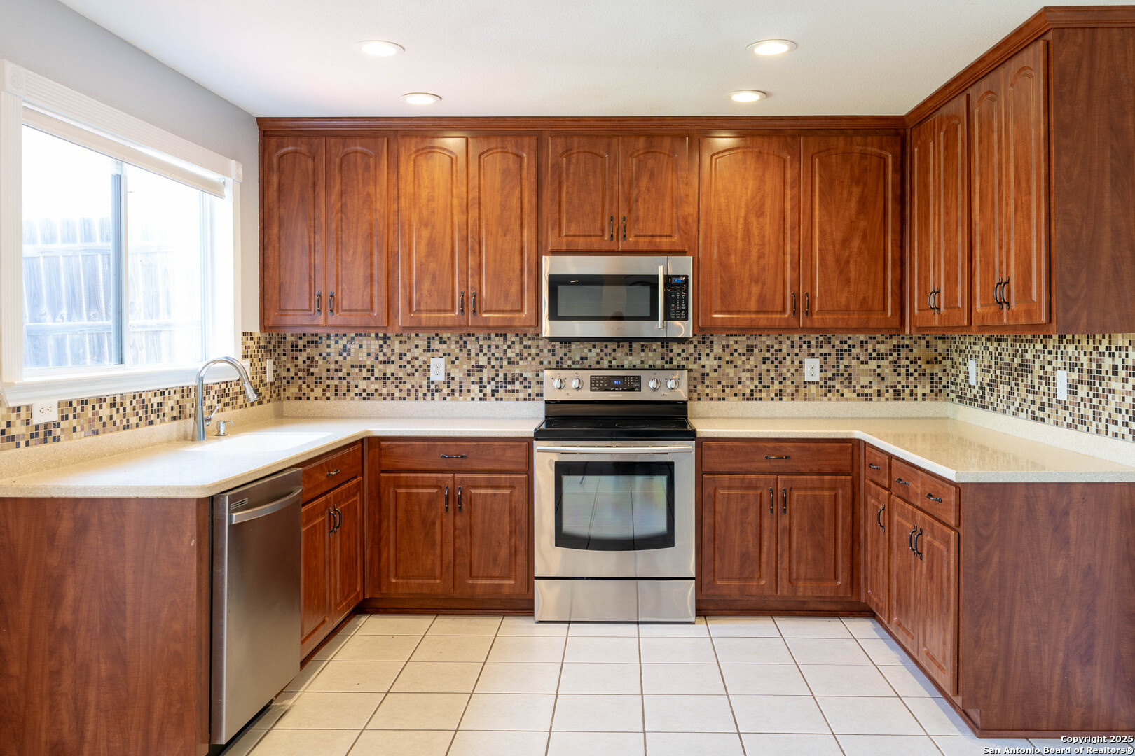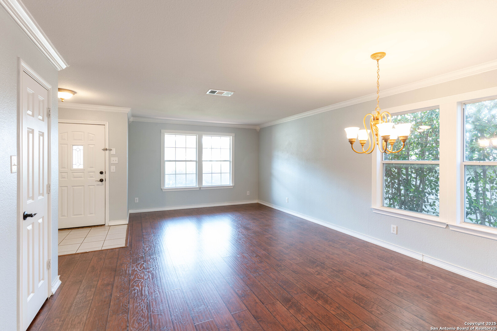 GUEST BEDROOM AND FULL BATH DOWN!! Step into this beautifully maintained two-story home in Creek Haven, offering generous living space and thoughtful updates throughout. The first floor boasts a versatile guest bedroom and full bath-ideal for visitors or multi-generational living. An open-concept layout connects the spacious living area and chef's kitchen featuring abundant cabinet and counter space, an under-mount sink, and a charming custom breakfast bench. Glistening wood floors, crown molding, and recessed lighting enhance the home's elegant appeal. Upstairs, a large game room provides the perfect spot for movie nights or casual entertaining. The massive primary suite is a true retreat, complete with a custom closet organizer and a spa-like bath with separate tub and shower. Two additional bedrooms and a full bath with double vanity round out the second level. Outdoors, enjoy a covered and screened patio, fruit-bearing pear (please help yourself to a pear or two) and peach trees, and a storage shed. Located in top-rated NEISD and close to Hwy 281, this home offers both convenience and comfort in a desirable neighborhood.