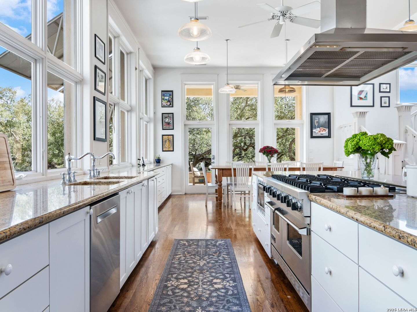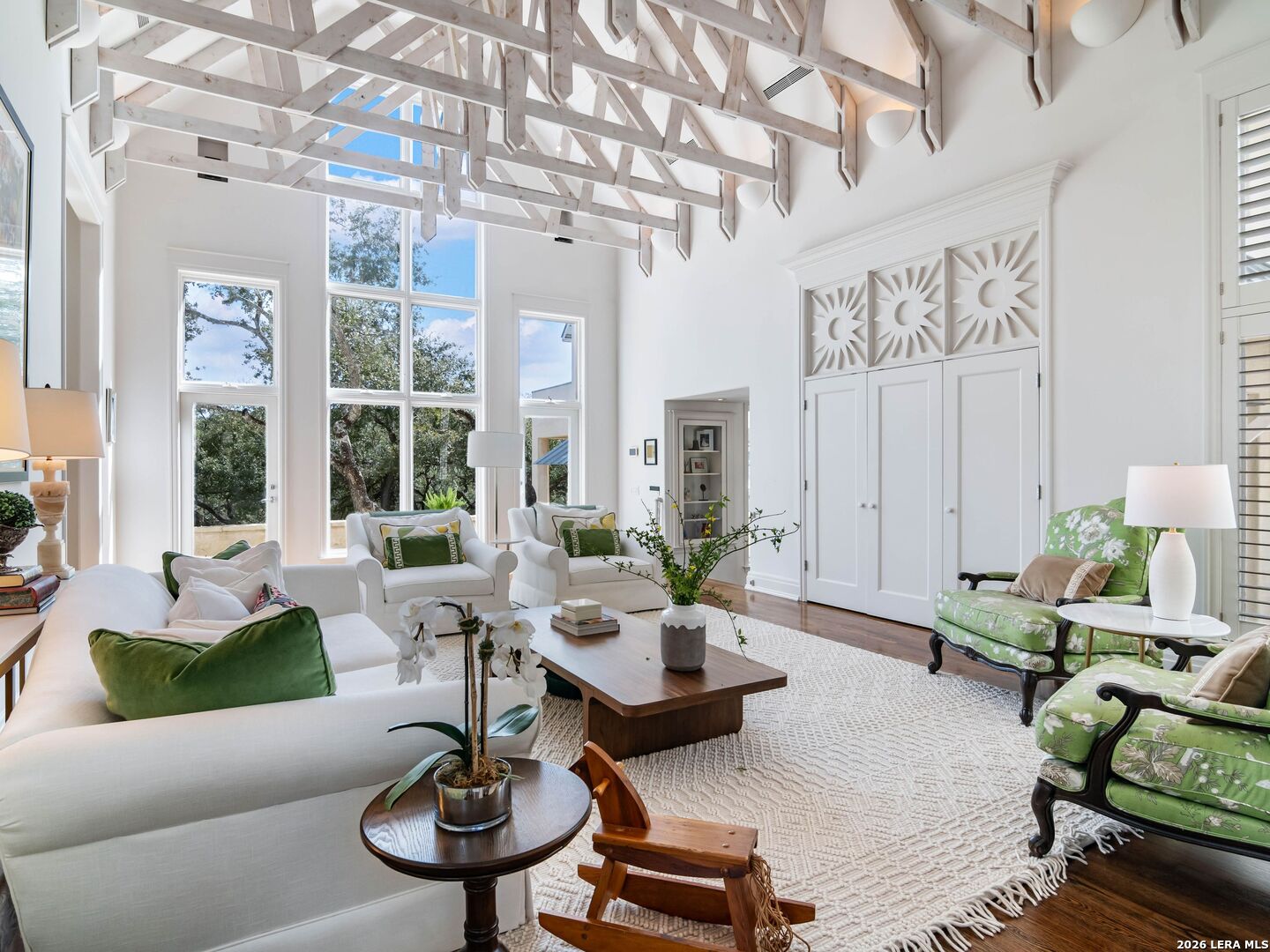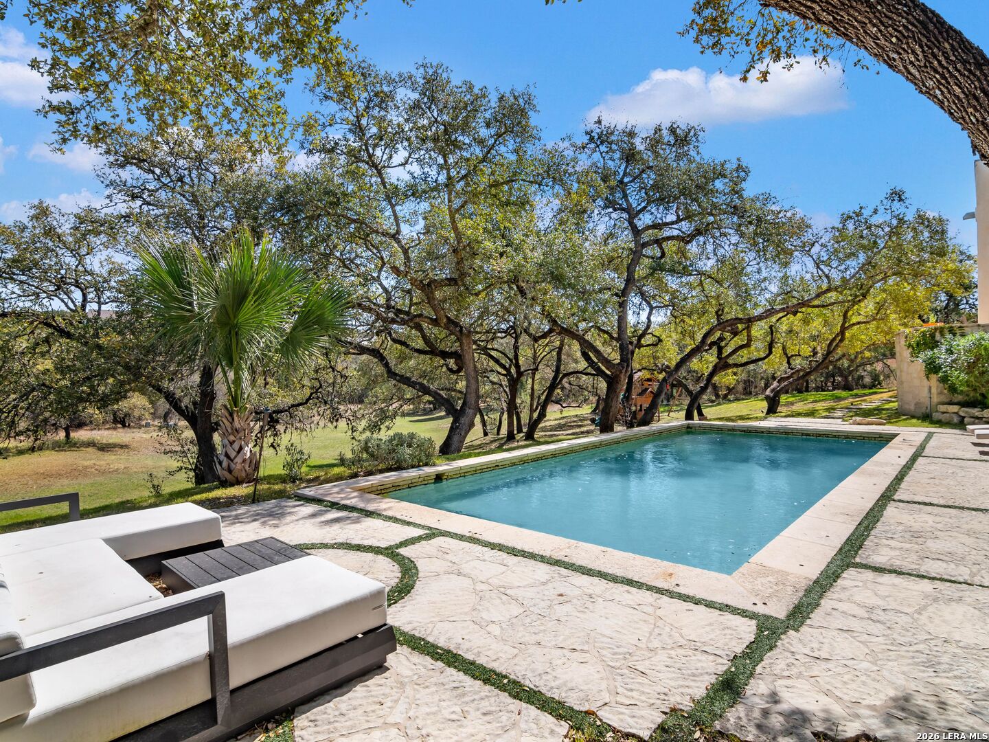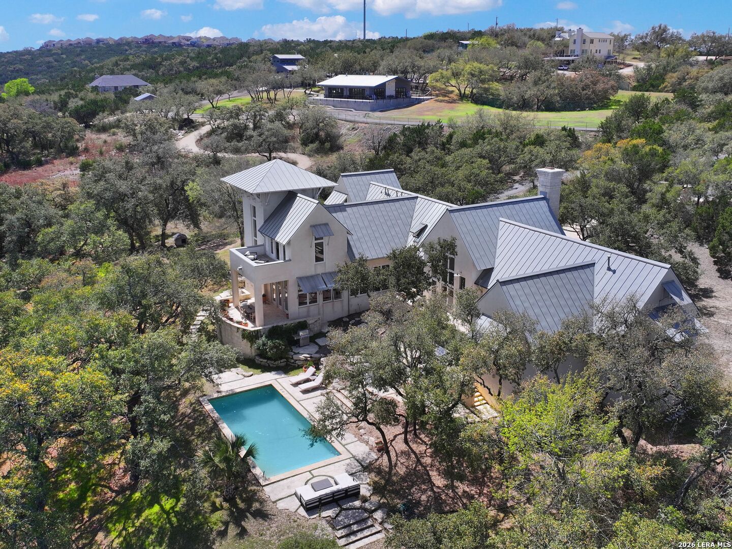 Privately gated and set across 7.89 acres, 3564 Mountain Loop offers a rare combination of architectural pedigree, privacy, and Hill Country presence just minutes from Stone Oak. Designed by Roy Braswell, the residence blends limestone, metal, and expansive glass with a clean architectural sensibility that feels both distinctive and grounded in its natural surroundings. A winding drive framed by mature oaks creates a strong sense of arrival, while the stone facade, standing seam metal roof, and dramatic rooflines establish the home's character from the outset. Inside, the home is defined by volume, light, and a strong connection to the surrounding landscape. The main living area is anchored by soaring ceilings, exposed structural elements, a striking fireplace, and an expansive wall of windows that draws the outdoors in. The overall layout balances openness with intimacy, creating spaces that work equally well for entertaining and everyday living. The kitchen is designed as both a functional workspace and natural gathering point, appointed with premium appliances, substantial stone surfaces, and custom cabinetry that delivers both visual impact and practicality. Adjacent living and dining spaces are oriented to capture the views, allowing the interior to transition seamlessly into the home's outdoor living areas. The primary suite offers a private retreat with refined finishes, a spa style bath, and thoughtfully integrated storage, while the secondary accommodations are positioned with comfort and privacy in mind. Outdoor living is equally compelling, with terraced patios, a resort style pool, and multiple settings for dining, lounging, and entertaining beneath the canopy of mature oaks. Panoramic views and exceptional seclusion define the setting, while the agricultural exemption adds meaningful long term value. Properties offering this level of architectural substance, land, and privacy with such close proximity to Stone Oak are increasingly rare.