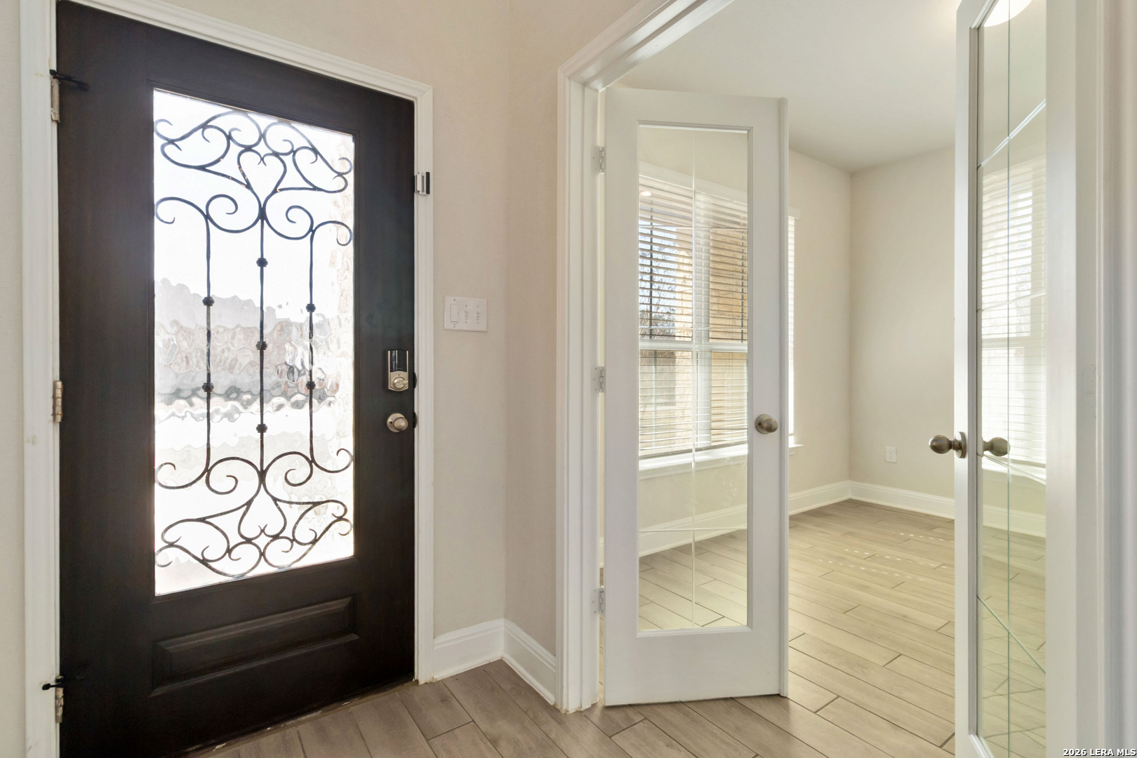Welcome to this beautifully maintained, light, airy and spacious 4-bedroom, 2.5-bath home located in the award-winning Comal ISD. Thoughtful upgrades, new refrigerator and dishwasher, whole home water filtration system along with water softener. Expansive pantry! The large Primary bedroom is conveniently downstairs offering a peaceful retreat, along with a private study accented by elegant French doors. Ceiling fans in every bedroom. Upstairs you will find a versatile flex space, three bedrooms, each with spacious walk in closets! Enjoy access to community amenities, including a sparkling pool, sports court, and neighborhood park with playground. Ideally situated with easy access to Hwy 281 and FM 1863, placing you minutes from San Antonio, the scenic Hill Country, and only 20 minutes from San Antonio International Airport.