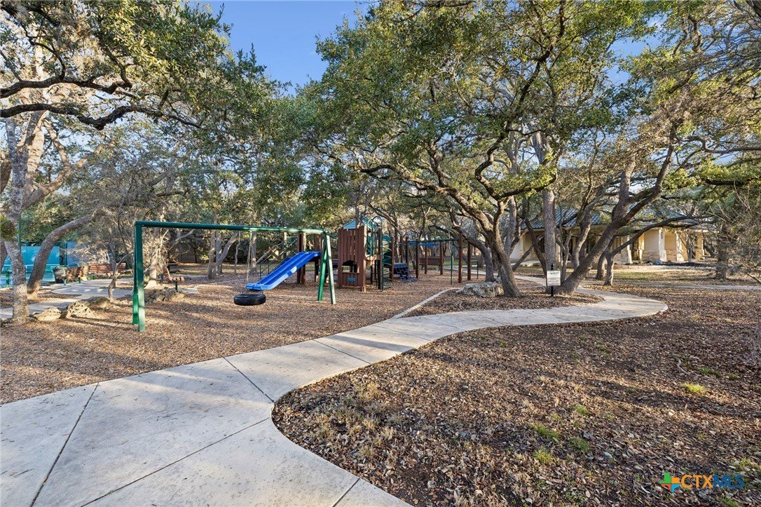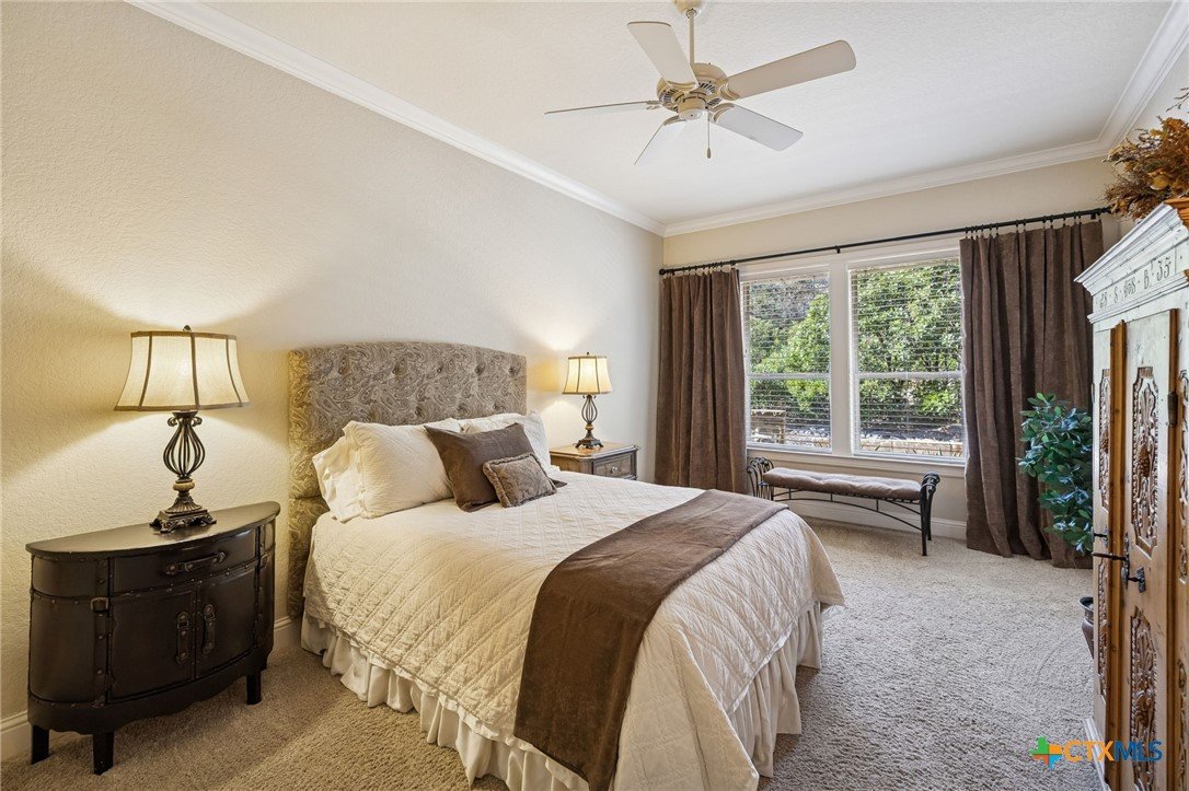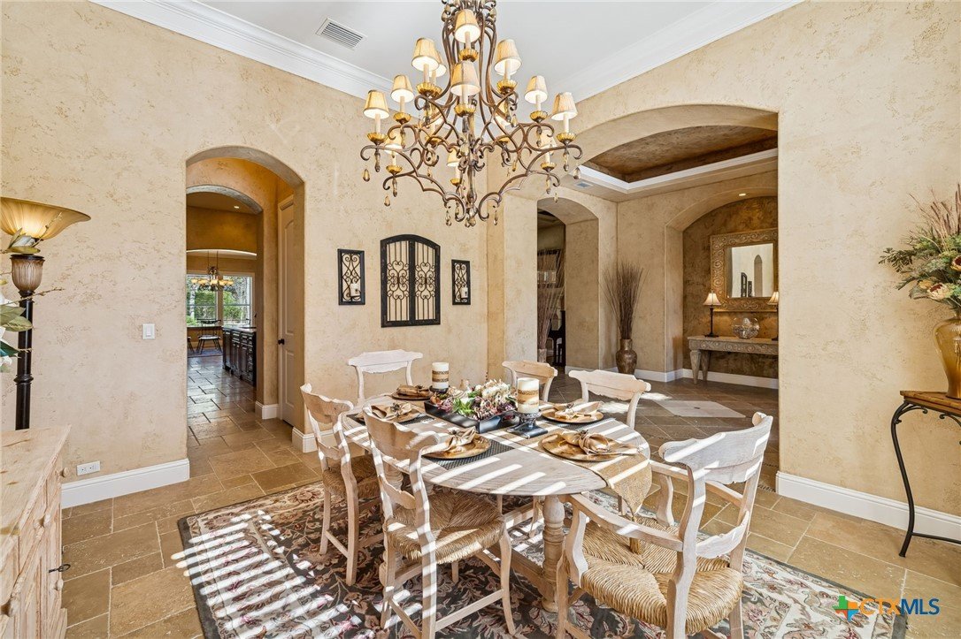 Welcome to Riverforest, where gated privacy meets the relaxed rhythm of Guadalupe River living. This beautifully built home sits in one of the area’s most sought-after communities, offering private Guadalupe River access, scenic walking trails, a clubhouse, and sport courts, all while being less than 10 minutes from the restaurants, shops, and live music of historic Gruene. Outdoor living is a highlight. A covered patio with wood-plank ceiling, recessed lighting, and motorized electric blinds creates a comfortable year-round retreat. The outdoor kitchen with granite prep space and tile accents makes grilling easy, while a stone gas firepit and professionally landscaped yard with accent lighting set the stage for relaxed Hill Country evenings. Inside, craftsmanship and character carry throughout. Travertine floors, hand-textured walls, crown molding, and custom cabinetry create a warm, refined feel. The living area features a stone fireplace and coffered ceiling, while large doors open to the patio for seamless indoor-outdoor entertaining. The chef’s kitchen includes granite countertops, a large island, custom cabinets, a seven-burner gas cooktop, and walk-in pantry. A built-in study provides a perfect work-from-home space. The primary suite offers a peaceful retreat with tray ceilings and a spa-style bath featuring a soaking tub, walk-in shower, dual vanities, and a spacious custom closet. Finished with a Spanish tile roof and a three-car garage, this home captures the easygoing Riverforest river lifestyle.