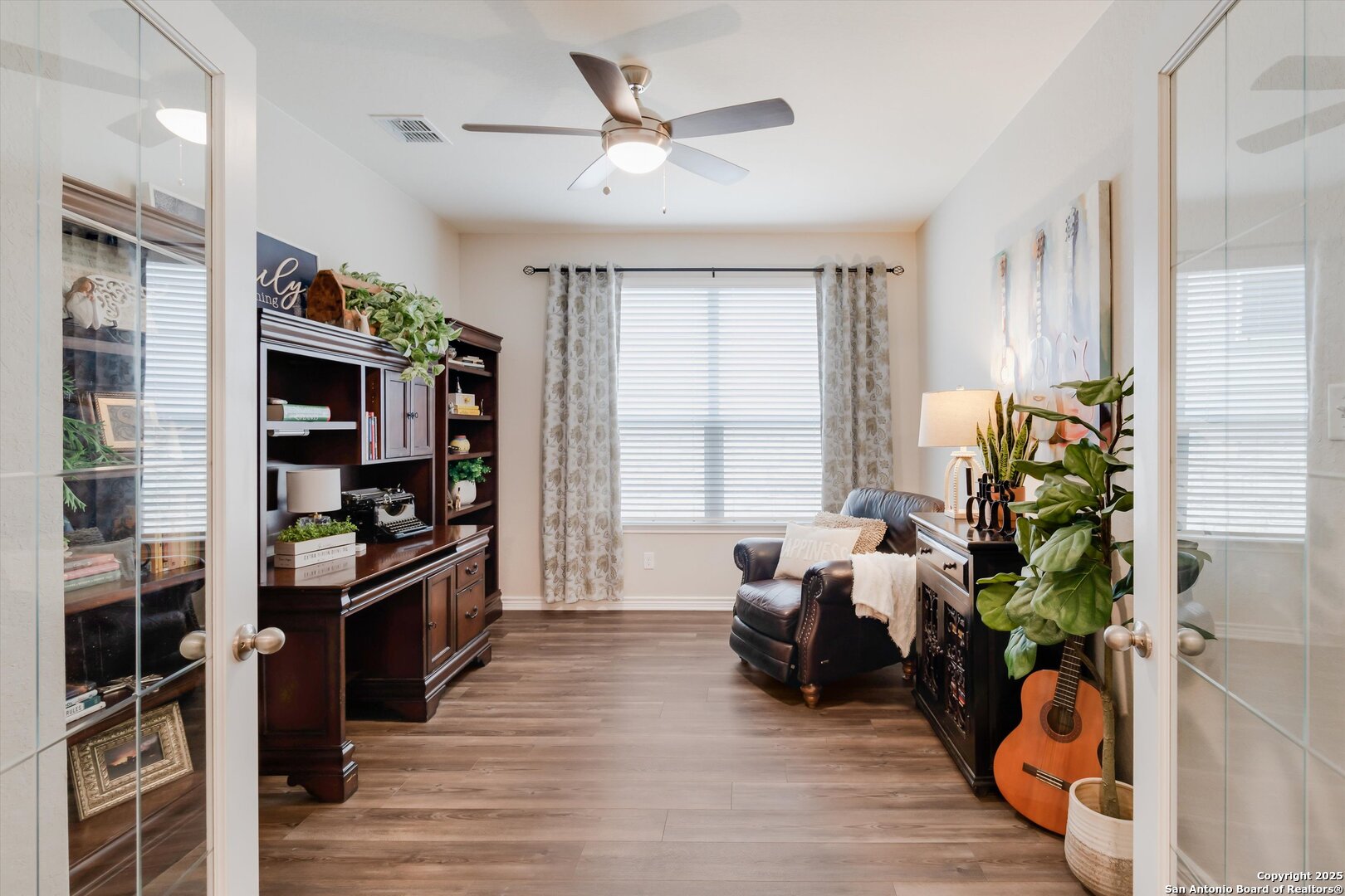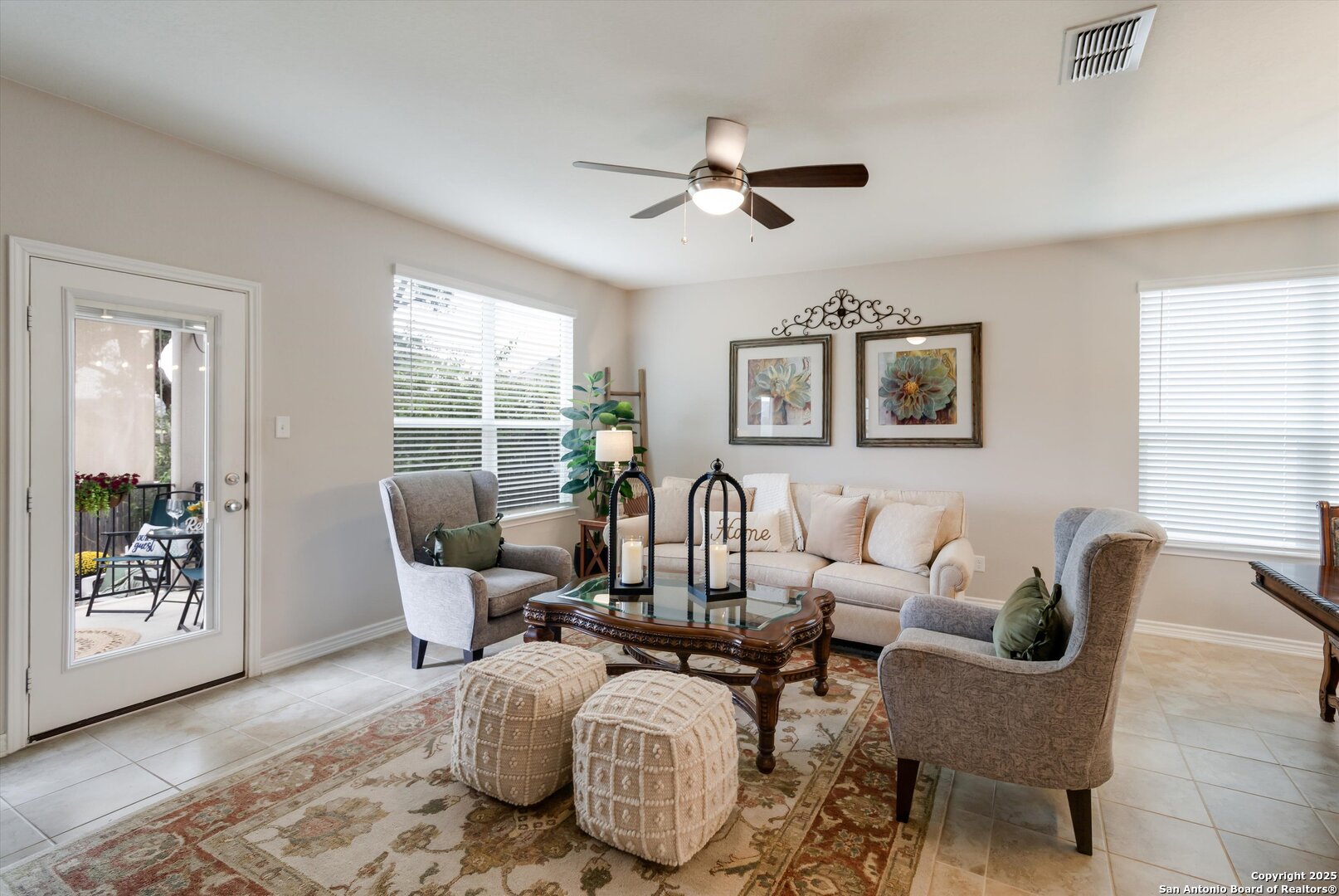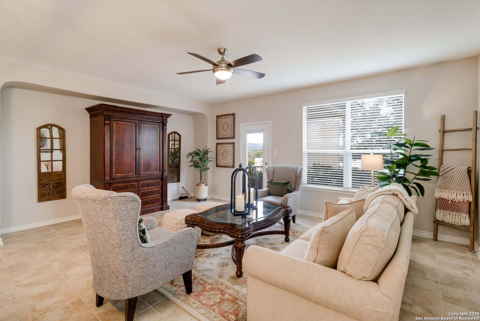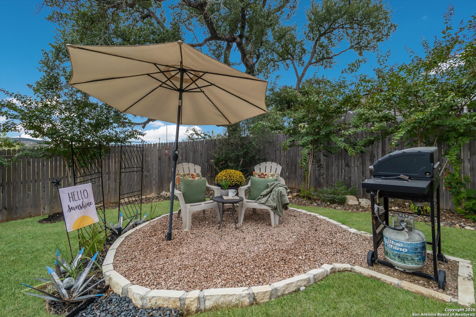Adorned with extensive, professional landscaping and outdoor lighting, you will love this home from the moment you arrive! Beautifully decorated and customized with upgraded lighting and unique accents throughout, this immaculately maintained three bedroom, two and a half bathroom home complete with a private study will exceed all of your living expectations. The seamless flow from the kitchen to the dining room and ultimately into the living space makes this open concept home an entertaining masterpiece. Enjoy hill country views from your covered patio overlooking your spacious backyard with a mature oak tree and numerous crepe myrtle trees. Flowering pollinator plants invite butterflies adding even more appeal to the serene atmosphere. While the home backs to a quiet utility easement, the mature trees and thoughtful garden layout provide a natural buffer that transforms the space into your own tranquil escape. Schedule your private tour today!