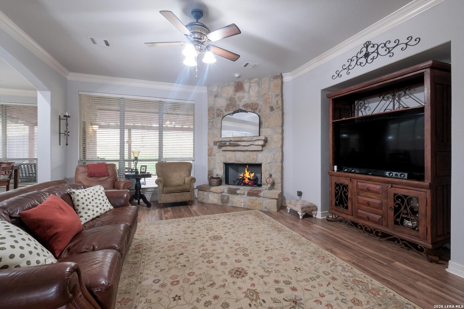 Beautifully maintained 4-bedroom, 3.5-bath home located in the highly sought-after Cibolo Canyons - The Vallitas community. With over 3,060 square feet of living space on a .23-acre lot, this one-and-a-half-story gem offers the perfect blend of elegance, comfort, and modern updates. The home features a spacious open layout with a gourmet kitchen equipped with gas cooking, a large center island, granite countertops, and recently updated dishwasher and disposal (2024)-perfect for entertaining and everyday living. Living area with floor to ceiling stone fireplace with gas logs and Laminate Floors. The primary suite and three secondary bedrooms are conveniently located on the main floor, while the upstairs includes a game room, media room, and a full bath, offering flexible living space. Recent upgrades include new carpet and interior paint, a new deck, and major system updates with the roof, downstairs HVAC, and dual water heaters replaced just 3 years ago. Half bath with custom handmade vanity. Enjoy outdoor living with a private backyard, sprinkler system, and privacy fence. Windows are professionally tinted for energy efficiency and tint can be removed for more natural light if preferred. Two beautiful Custom hand crafted furniture pieces in living area for sale. This home is move-in ready and situated in a premier neighborhood with top-tier amenities such as Controlled Access, Pool, Lazy River, Splash Pad, Fitness Center, Clubhouse, Park/Playground, Jogging Trails, Sports court and easy access to shopping, dining, and highly rated NEISD schools. Johnson High School.
