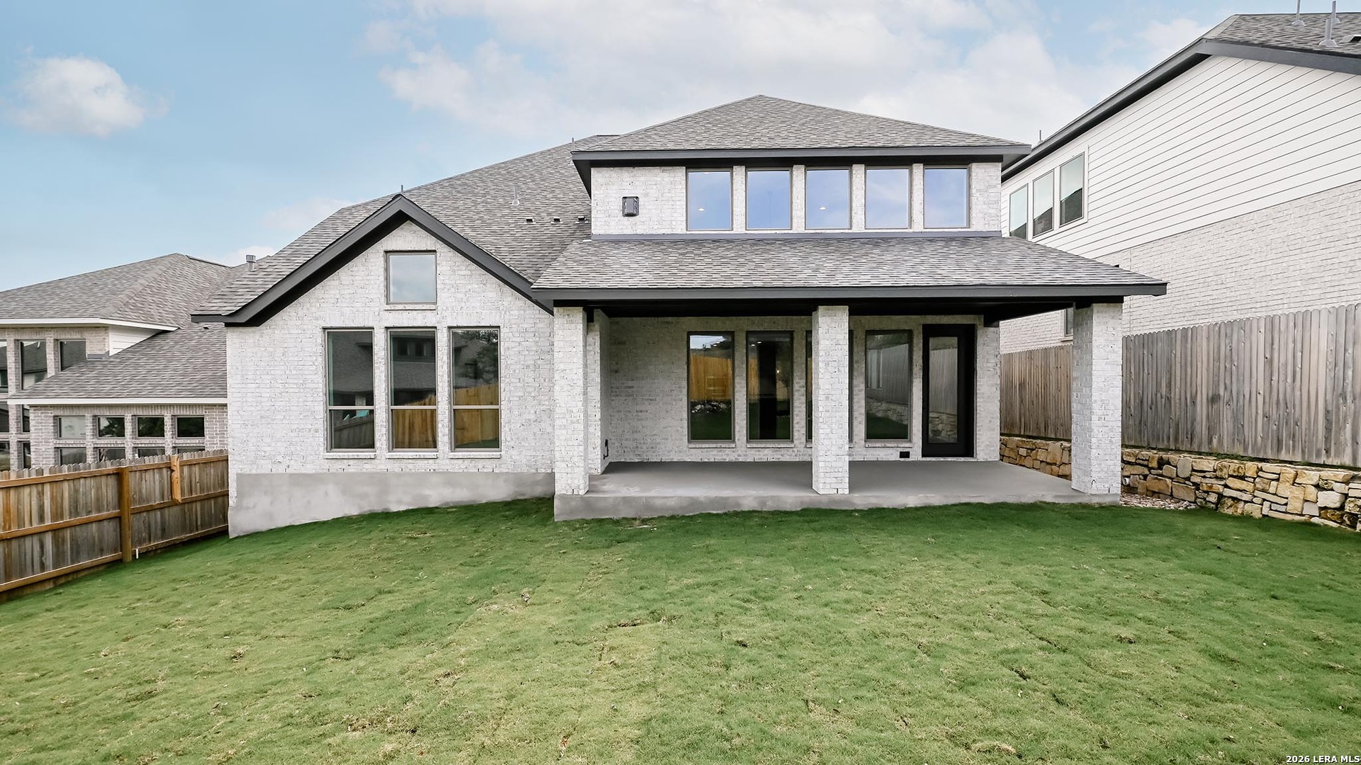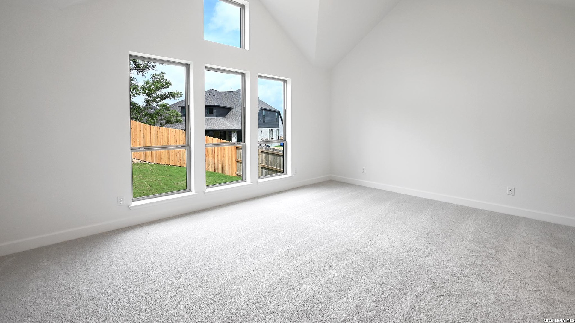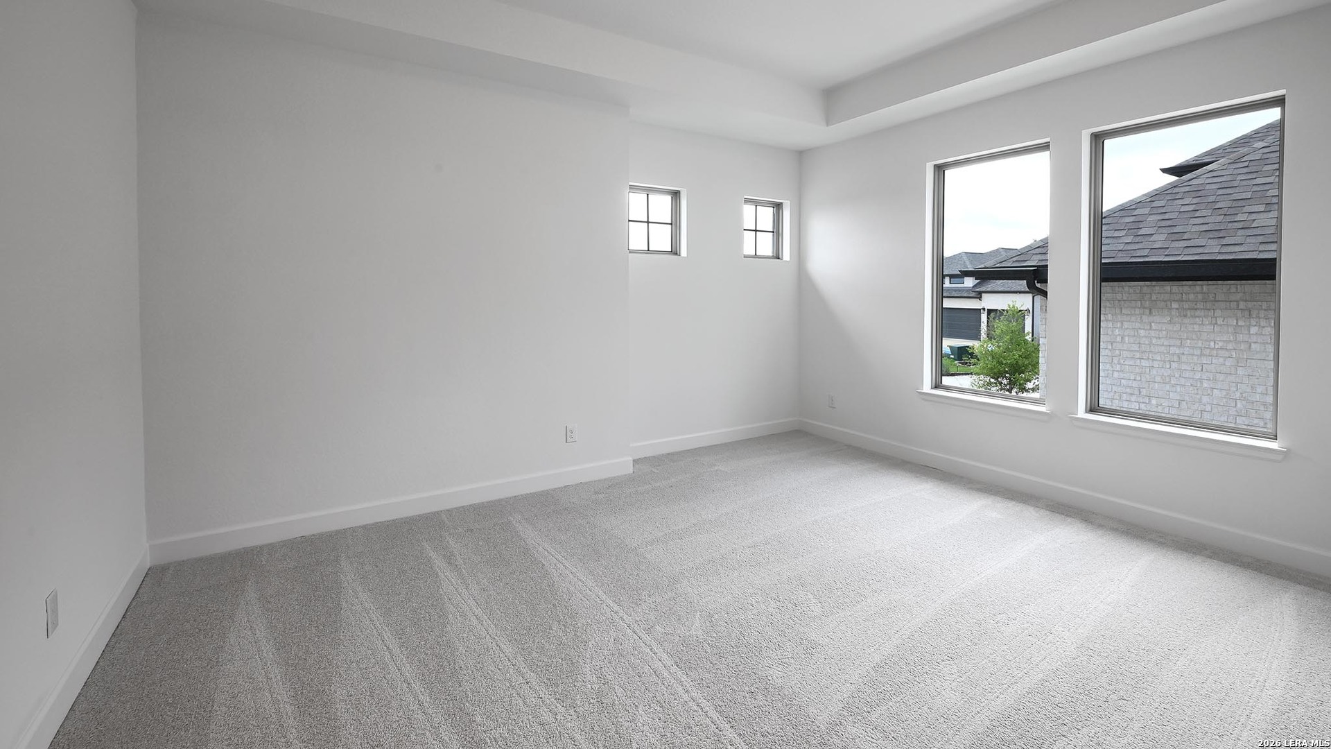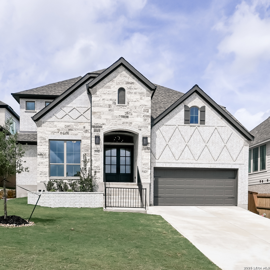 This spacious design features a two-story rotunda entry. Home office with French doors across from curved staircase. Open kitchen offers corner walk-in pantry, 5-burner gas cooktop, generous counter space and inviting island with built-in seating space. Two-story dining area opens to two-story family room with a wood mantel fireplace and wall of windows. First-floor primary suite includes bedroom with 13-foot ceiling and wall of windows. Primary bath includes dual vanities, freestanding tub, separate glass-enclosed shower and two large walk-in closets, one with access to utility room. First-floor guest suite. A game room, media room with French doors and two secondary bedrooms are upstairs. Covered backyard patio. Three-car garage.