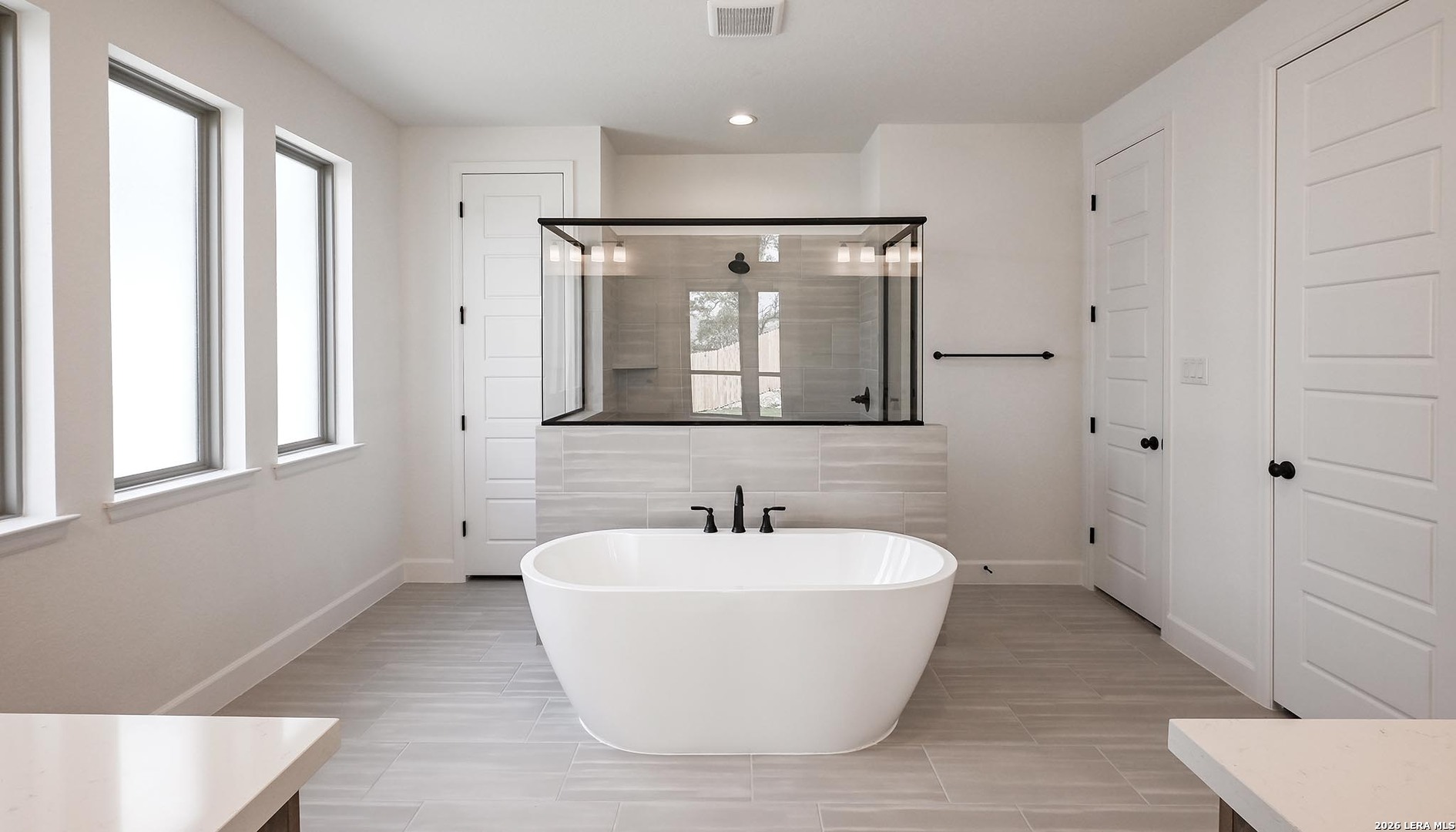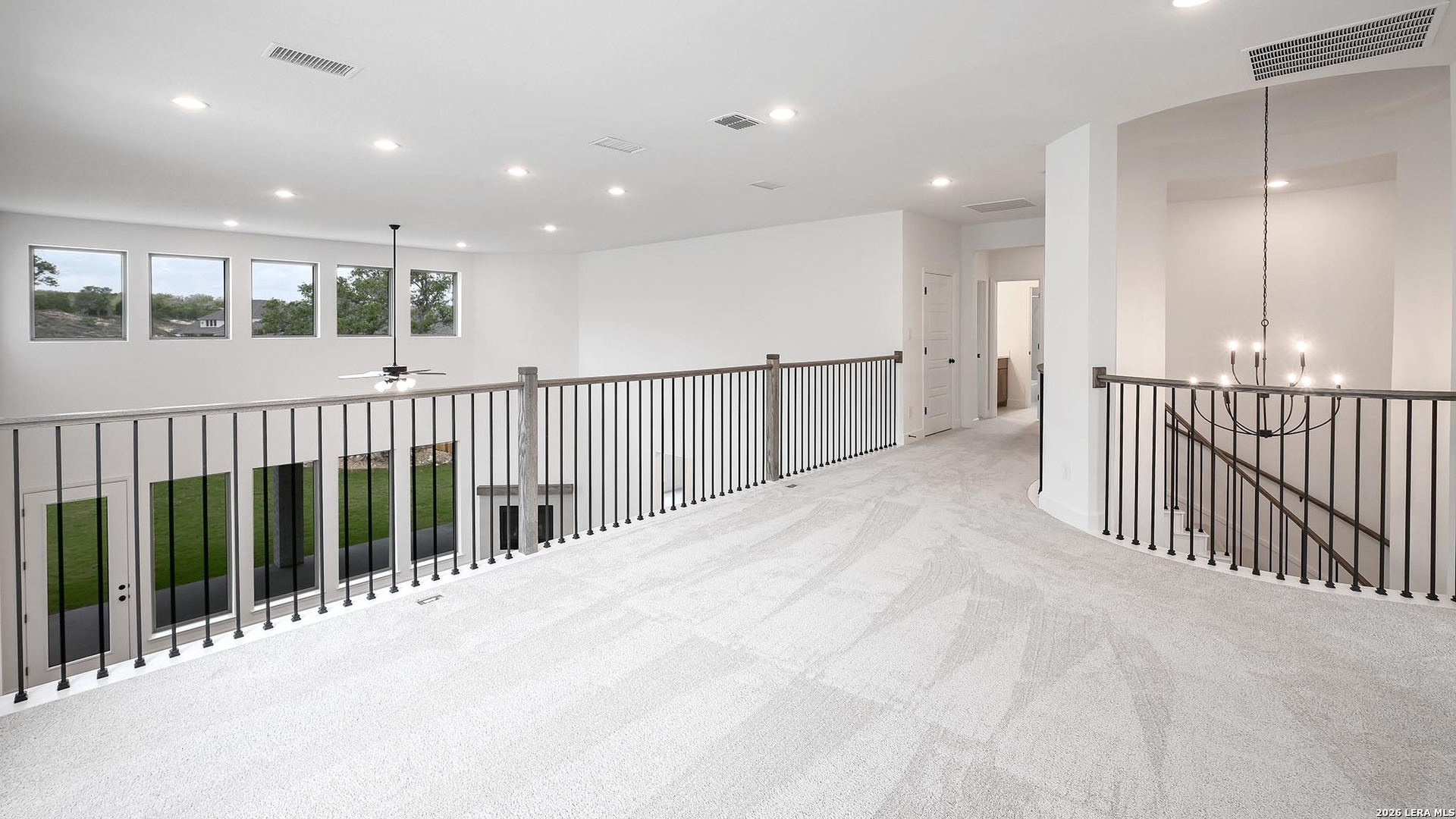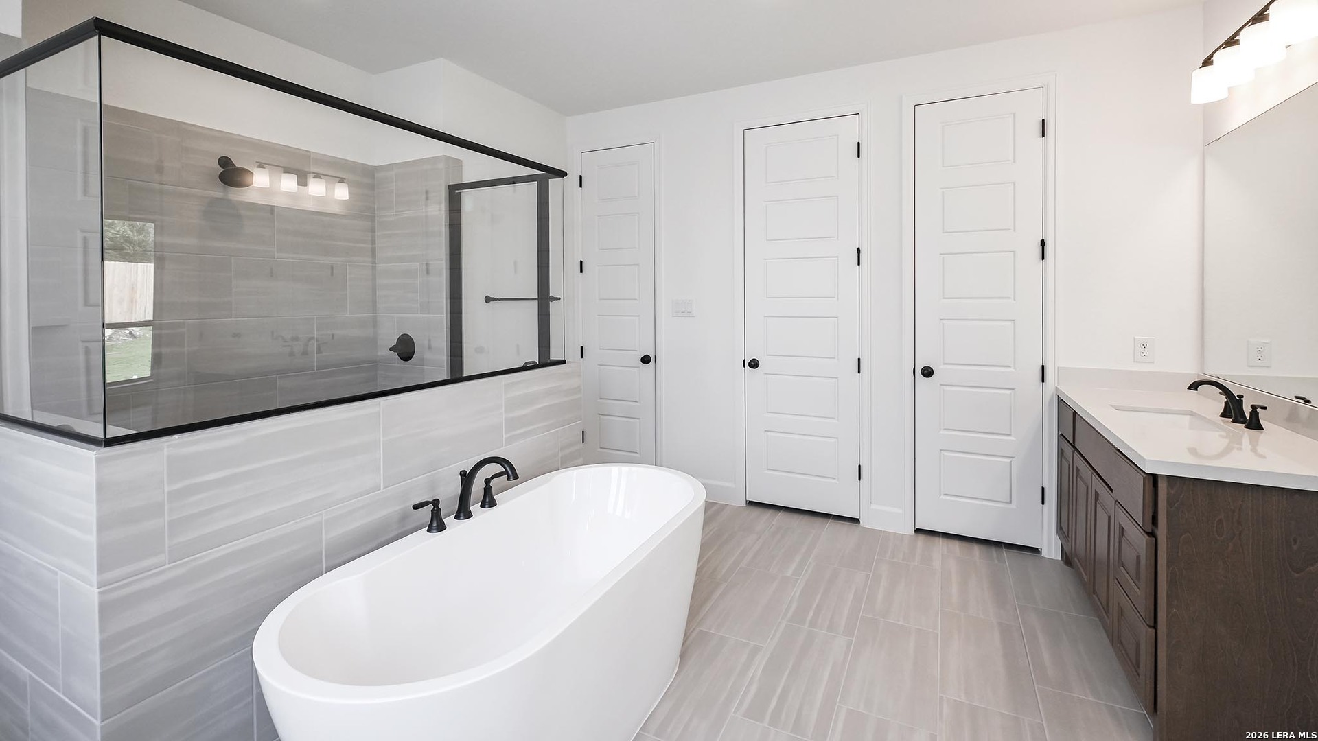 This spacious design features a two-story rotunda entry. Home office with French doors across from curved staircase. Open kitchen offers corner walk-in pantry, 5-burner gas cooktop, generous counter space and inviting island with built-in seating space. Two-story dining area opens to two-story family room with a wood mantel fireplace and wall of windows. First-floor primary suite includes bedroom with 13-foot ceiling and wall of windows. Primary bath includes dual vanities, freestanding tub, separate glass-enclosed shower and two large walk-in closets, one with access to utility room. First-floor guest suite. A game room, media room with French doors and two secondary bedrooms are upstairs. Covered backyard patio. Three-car garage.