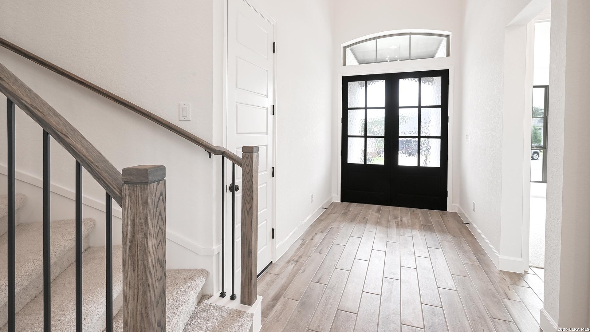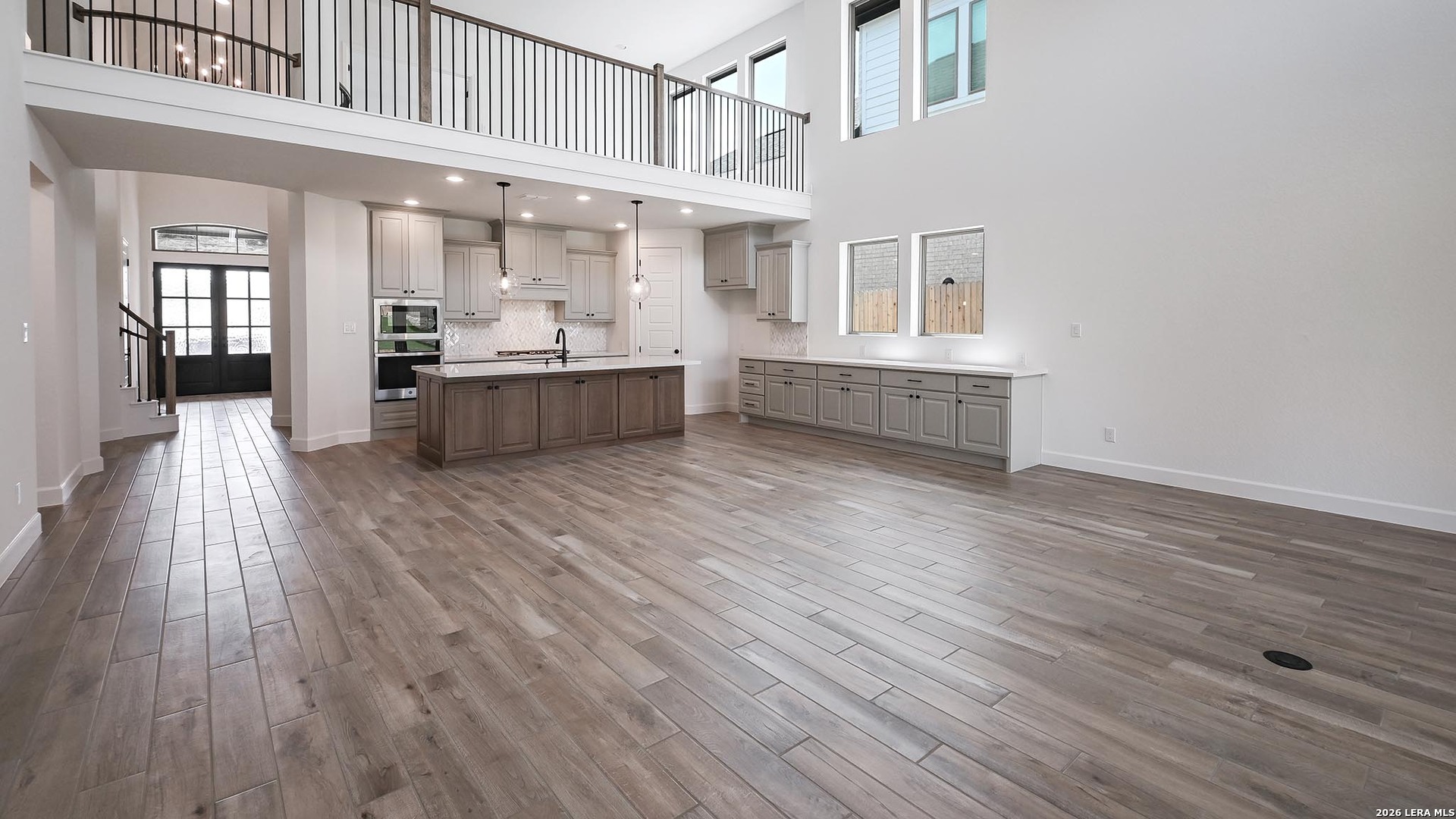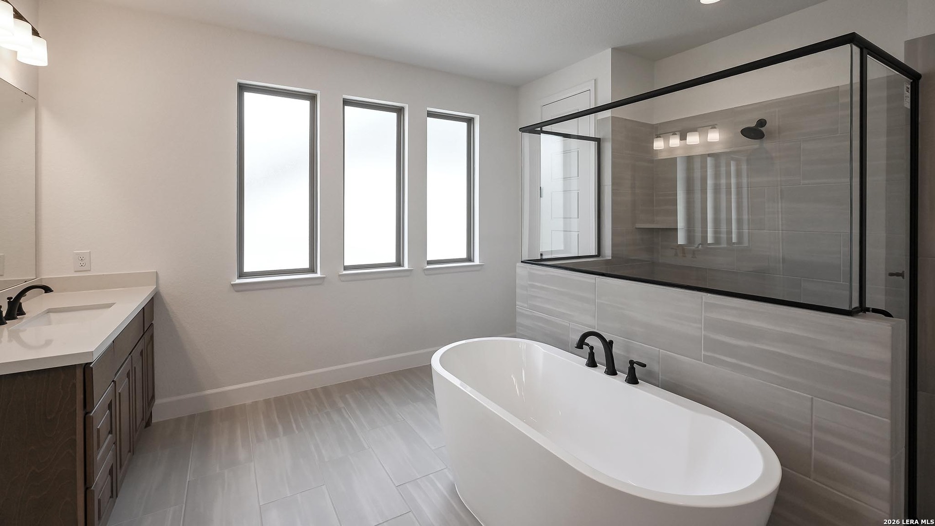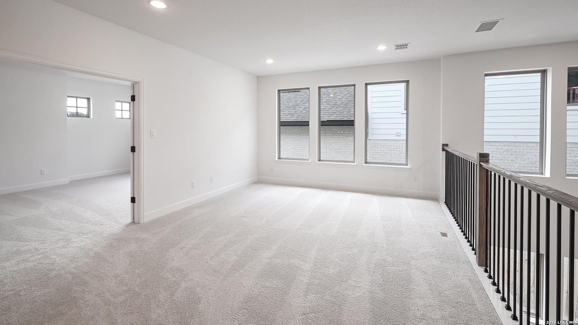 This spacious design features a two-story rotunda entry. Home office with French doors across from curved staircase. Open kitchen offers corner walk-in pantry, 5-burner gas cooktop, generous counter space and inviting island with built-in seating space. Two-story dining area opens to two-story family room with a wood mantel fireplace and wall of windows. First-floor primary suite includes bedroom with 13-foot ceiling and wall of windows. Primary bath includes dual vanities, freestanding tub, separate glass-enclosed shower and two large walk-in closets, one with access to utility room. First-floor guest suite. A game room, media room with French doors and two secondary bedrooms are upstairs. Covered backyard patio. Three-car garage.
