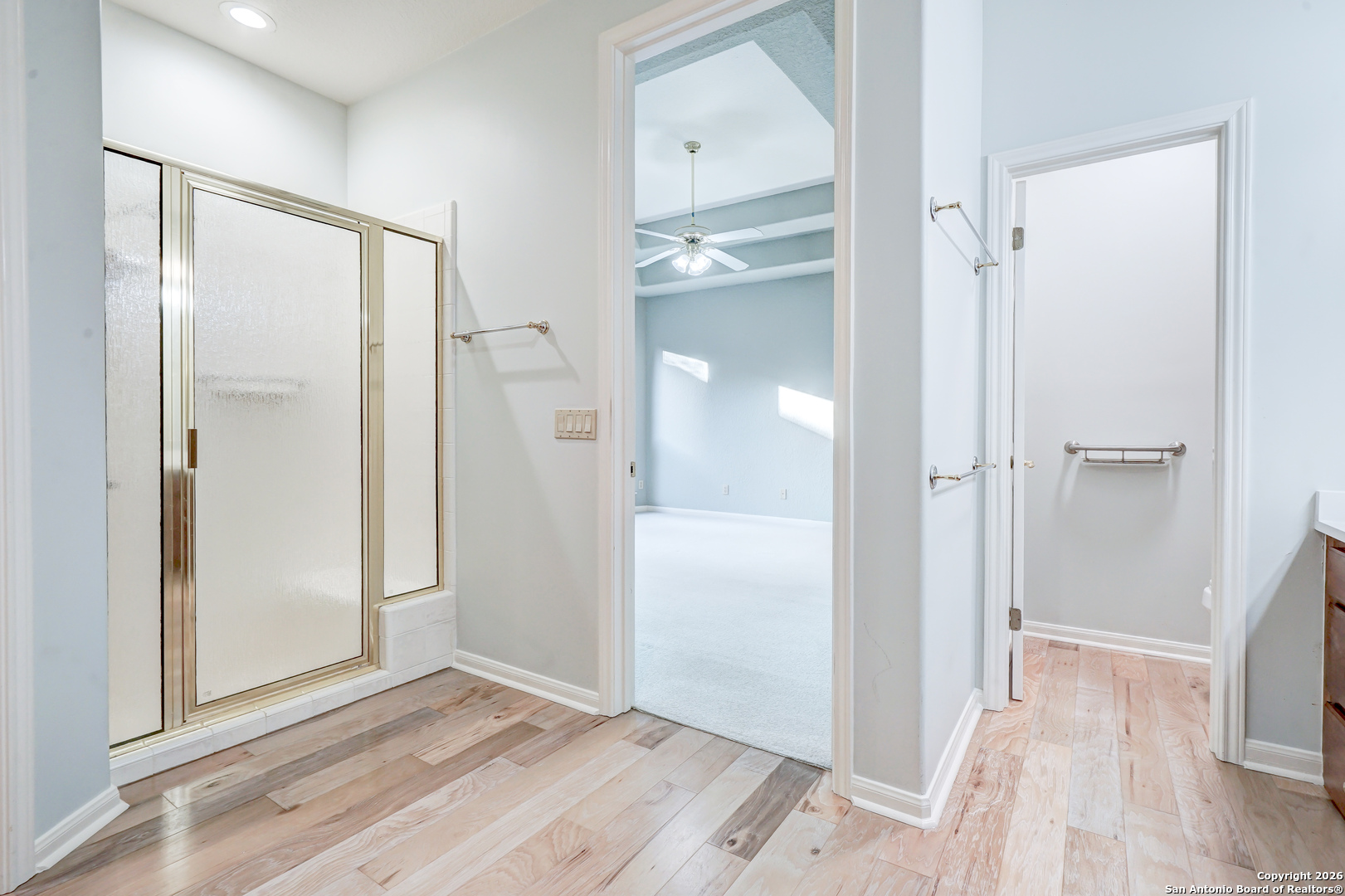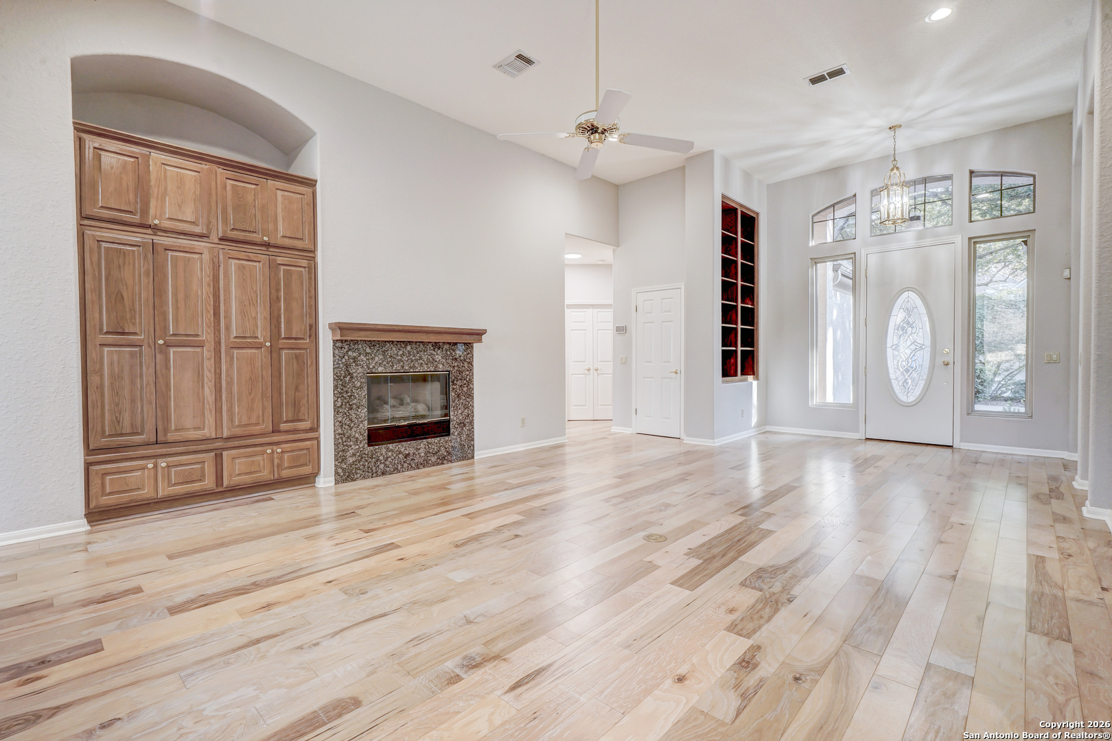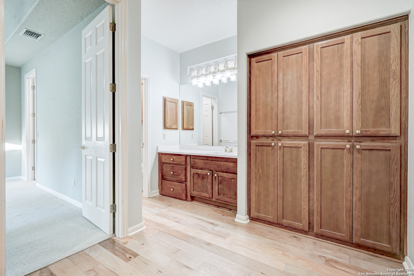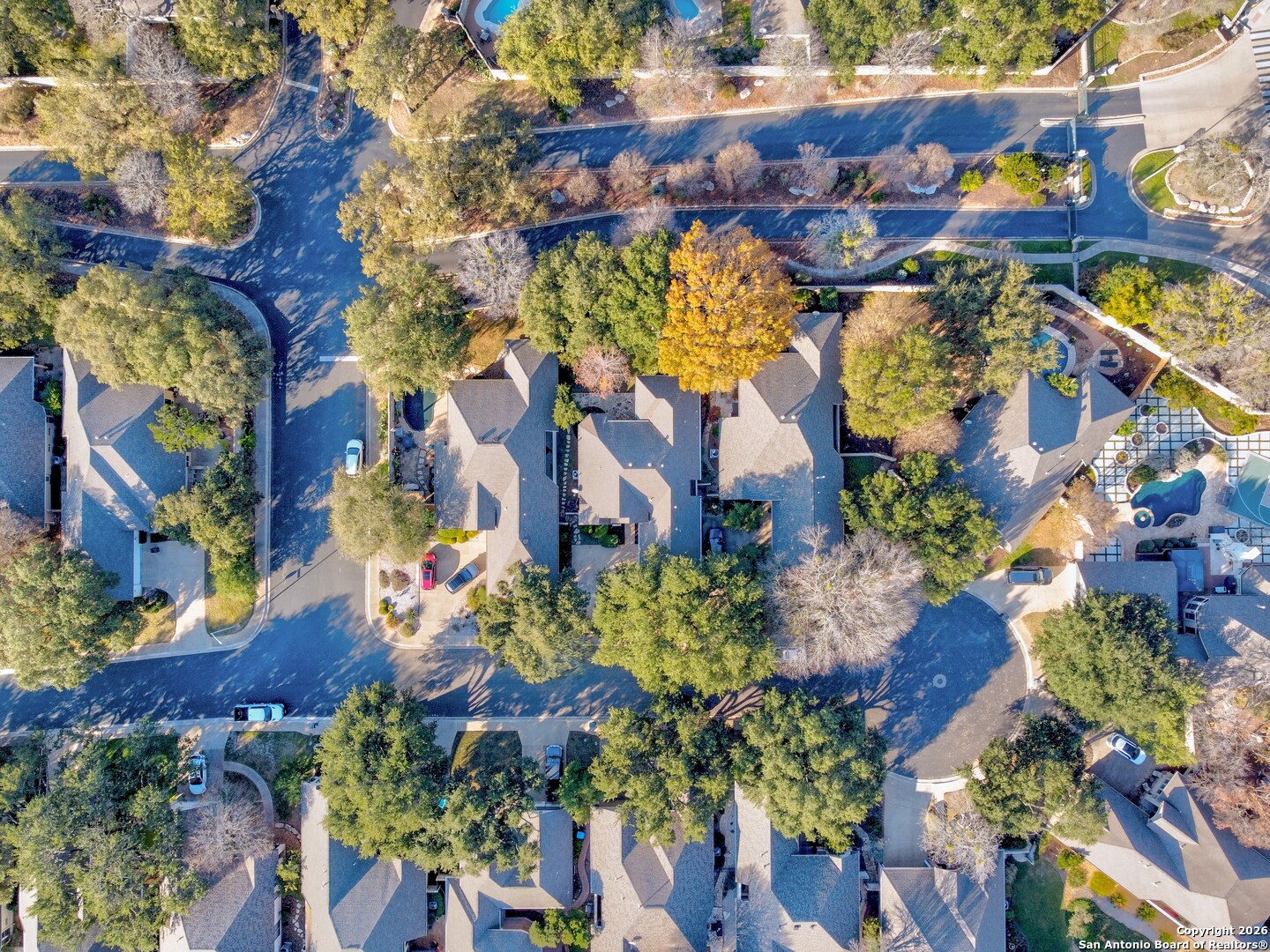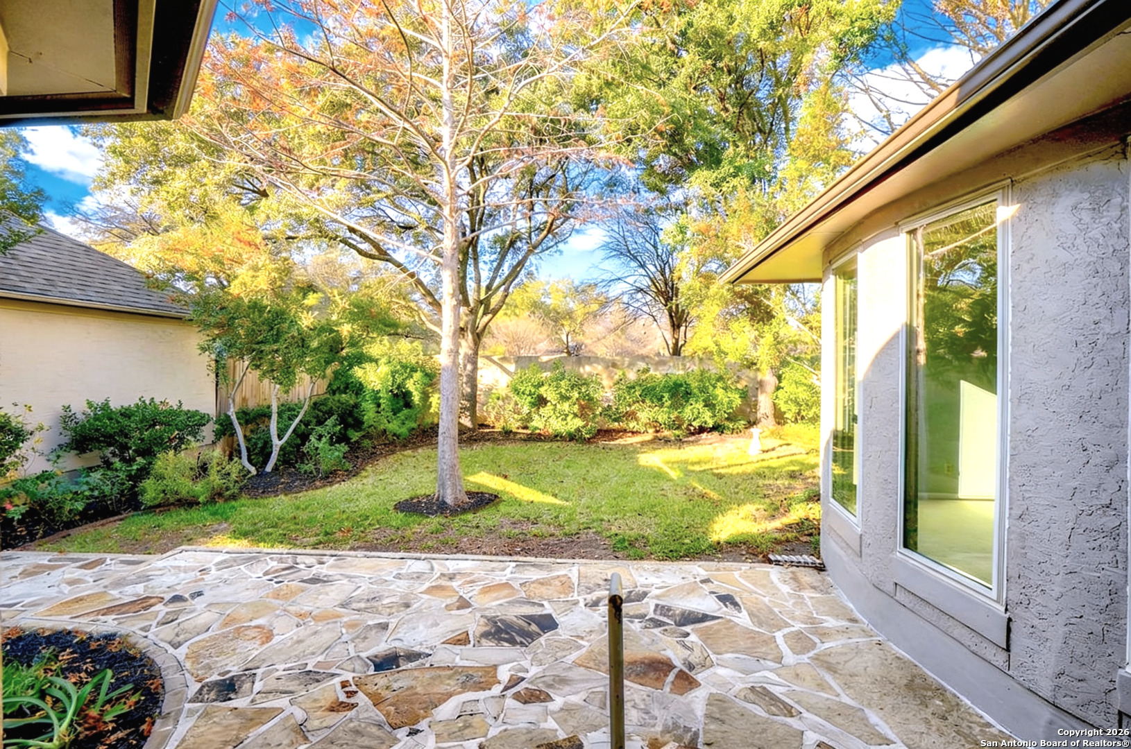 Prestigious Emerald Forest Gem. Experience refined elegance in this impeccably maintained single story home nestled within the exclusive, guard gated Emerald Forest community. Offering 1,948 sq ft of thoughtfully curated living space, this residence blends sophistication, comfort, and timeless design. Step inside to soaring ceilings, abundant natural light, and a seamless flow enhanced by luxury wood vinyl flooring throughout the main areas. High end wool carpeting adds warmth to each bedroom and the expansive private office, which features a custom built-in desk and shelving; an ideal retreat for work or study. The home's auxiliary kitchen showcases granite countertops, built in oven, cooktop and generous storage; perfect for entertaining or additional prep space. A tranquil flagstone patio opens to a parklike backyard shaded by mature trees-an exceptional setting for outdoor dining, relaxation, or gatherings. Residents of Emerald Forest enjoy exclusive access to premier amenities, including a sparkling community pool, tennis courts, a basketball court, and scenic nature trails that wind through the neighborhood's lush, wooded landscape. It's a true retreat within the city. With 3 spacious bedrooms, 2 well appointed baths, and a layout designed for both comfort and style, this home is truly move-in ready. Located in one of San Antonio's most sought after areas, residents enjoy quick access to Loop 1604, premier shopping, dining, and entertainment. A rare opportunity to own a beautifully maintained home in a prestigious community. Luxury, privacy, comfort and convenience await.