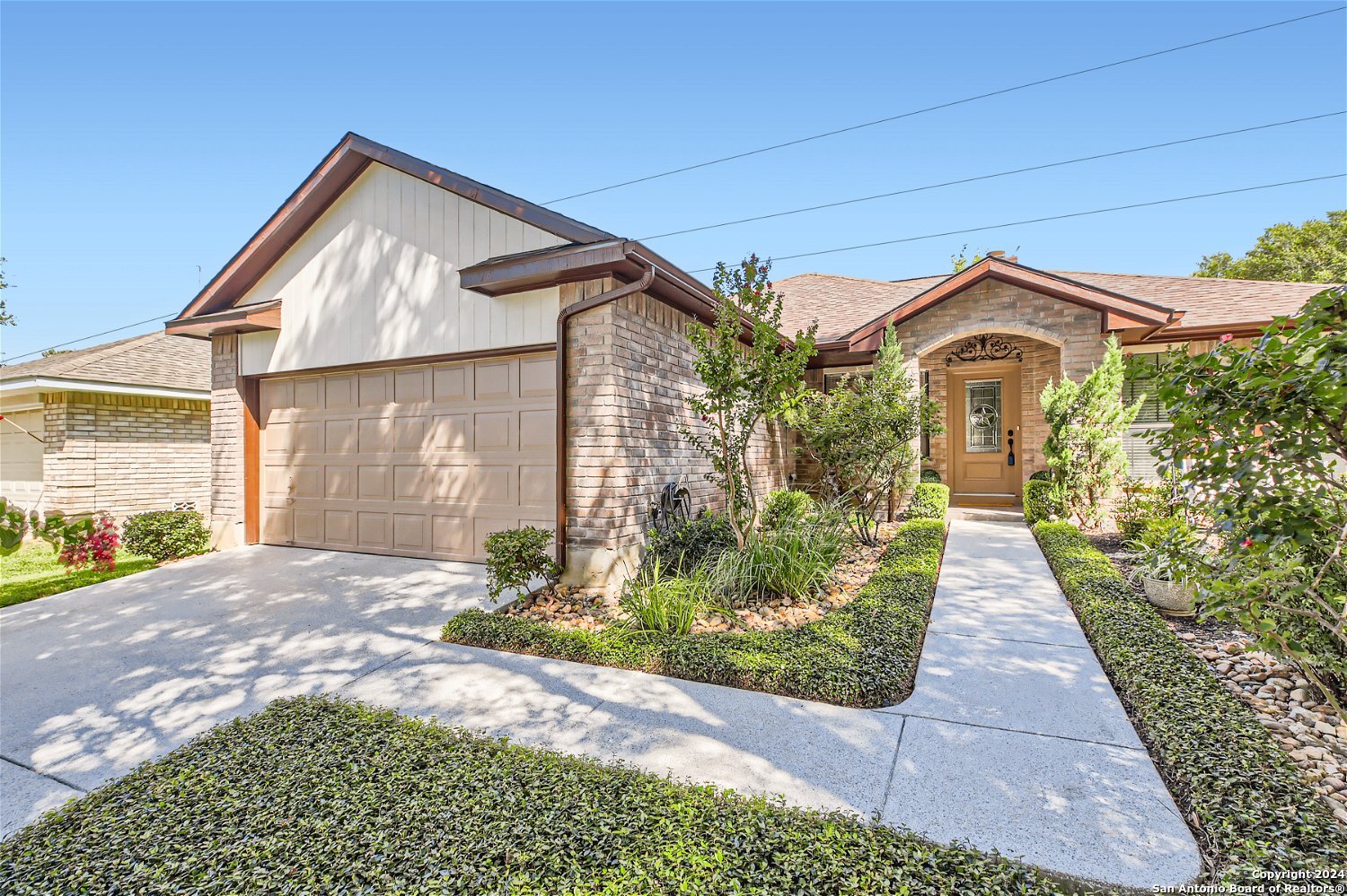 Fabulous turn key MOVE IN READY single story in 55+ GATED community with spacious design that includes two living areas, formal dining, updated kitchen, three bedrooms and two baths with impeccable landscaping and a driveway, sidewalk and garage sealed by Southwest Exteriors to the tune of $9000. The primary suite is so roomy with a double vanity, separate tub and shower and 16 foot long closet with two doors on either end. The living room is stunning with brick wood burning fireplace and plenty of room for large gatherings and multiple furniture arrangements. Plus the Florida room with picture windows makes for a great TV room, exercise, sewing room or game room with access to the back where you have absolutely no neighbors behind. Enjoy granite counters in the kitchen, fresh white subway backsplash (6 months ago), white cabinetry, new outlet covers and new appliances including a 2023 dishwasher and 2024 oven and microwave! A 30 year shingle roof and tile floors in kitchen were both installed in 2023. Low E window glass was replaced throughout the home in the last two years. The carpeting is 2-3 yrs young. Everything has been done for you. The home backs to a former golf course for peaceful long range views and an open air country feel. The garage has room for 2 vehicles or a car and a golf cart which many residents use to ride to the 13,000 SF lodge to meet up with friends for game night, potluck, swimming, painting and other scheduled community activities. There are sturdy and attractive hand rails from the garage to the house and the home was painted last year. Access to the community is through a 24/7 guarded entry. HOA fees include lawn maintenance, fall leaf collection, irrigation repair, water for the lawn, 24 hour surveillance and even RV and boat storage! Conveniently located just off I-35 with easy access to the San Antonio Riverwalk, Fiesta Texas, the beautiful recreational rivers and quaint shops of New Braunfels and Gruene, the music scene in Austin and so close to Randolph Air Force and the Forum with shopping, dining, and recreational opportunities. It's all here - pools, water aerobics, fitness room, library, billiards, ballroom for Thanksgiving dinners, great friends and an easy Texas lifestyle.