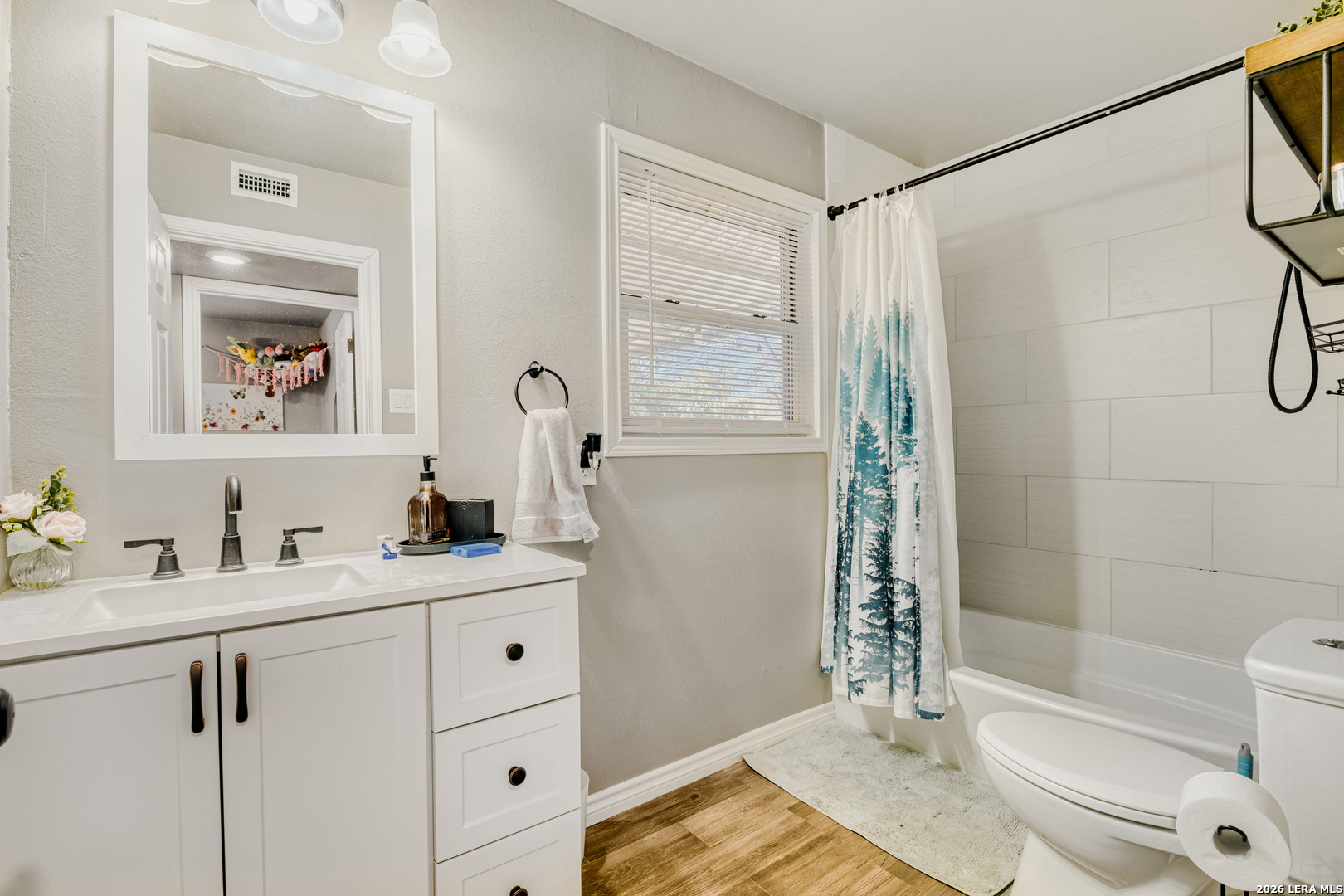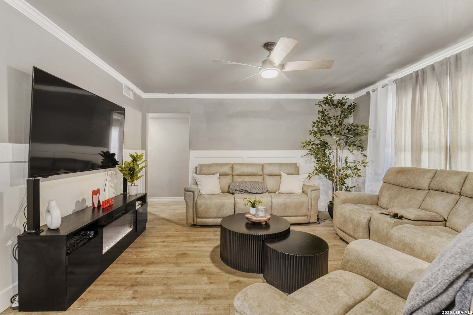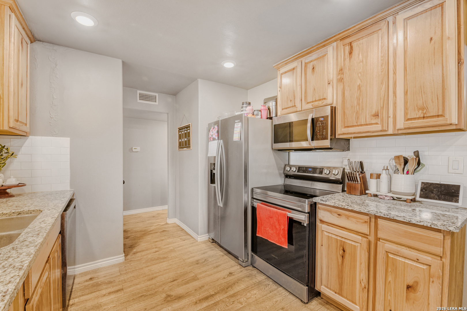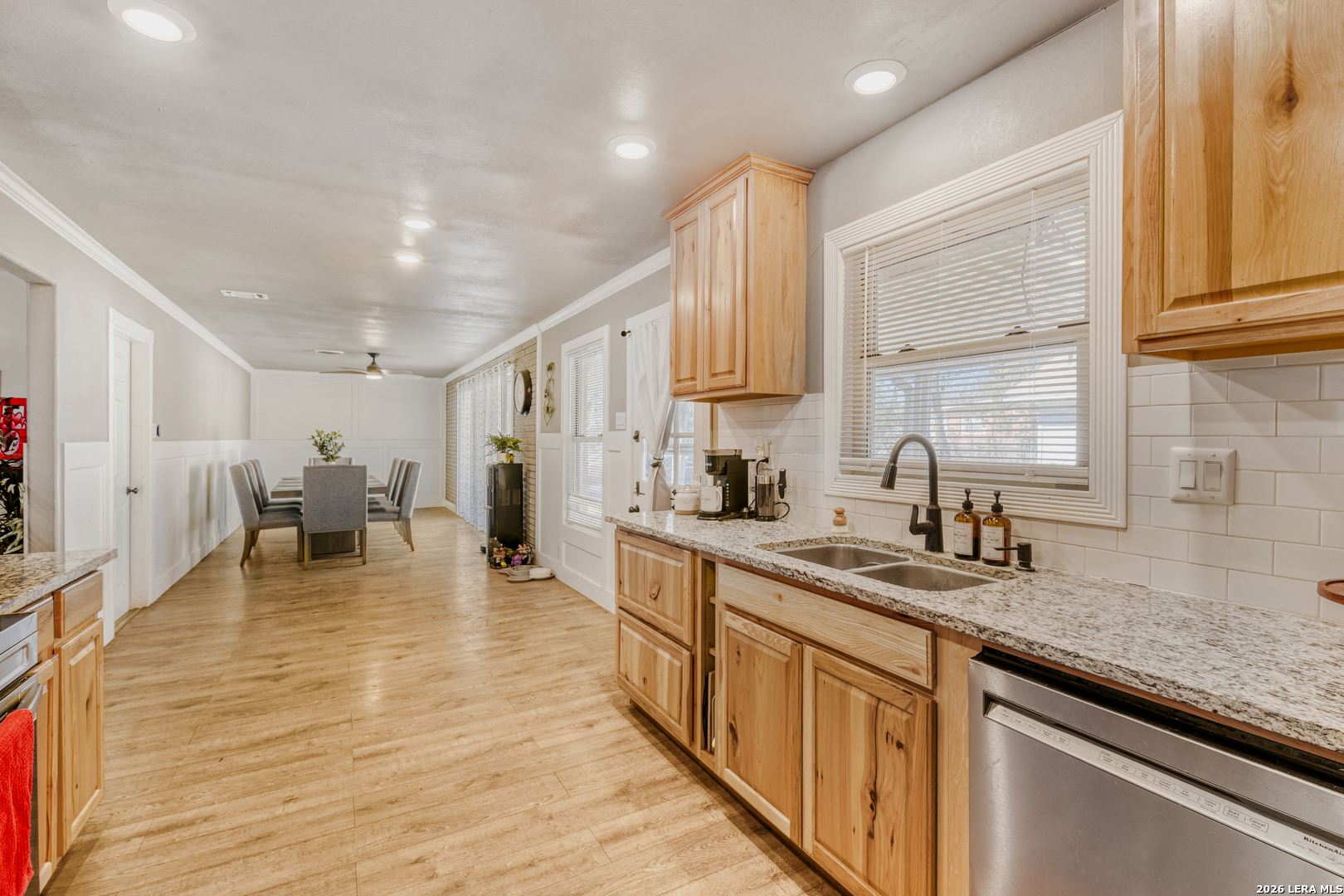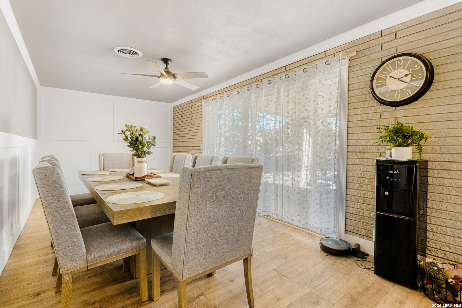 Welcome to this charming 3-bedroom, 2-bath, 2-car garage corner lot home in the desirable Ridgeview community, where style and comfort come together beautifully. The living room immediately impresses with elegant wainscoting on every wall and flows seamlessly into a tastefully updated kitchen featuring gleaming stainless steel appliances and an inviting open-concept design. Just beyond, the bright family room becomes a true focal point with its striking exposed brick wall, adding character and warmth. Trendy light fixtures highlight the home's airy color palette and clean lines, while durable vinyl plank flooring runs throughout for both style and easy maintenance. Spacious secondary bedrooms provide flexibility for guests, a home office, or hobbies, while the private primary suite offers a relaxing retreat. Step outside to a Texas-sized patio overlooking a generous backyard, ideal for entertaining, weekend barbecues, or quiet evenings outdoors. A large shed and workshop provide ample space for projects, storage, or creative pursuits. Conveniently located near abundant shopping and dining options, this home delivers the perfect blend of design, functionality, and location.